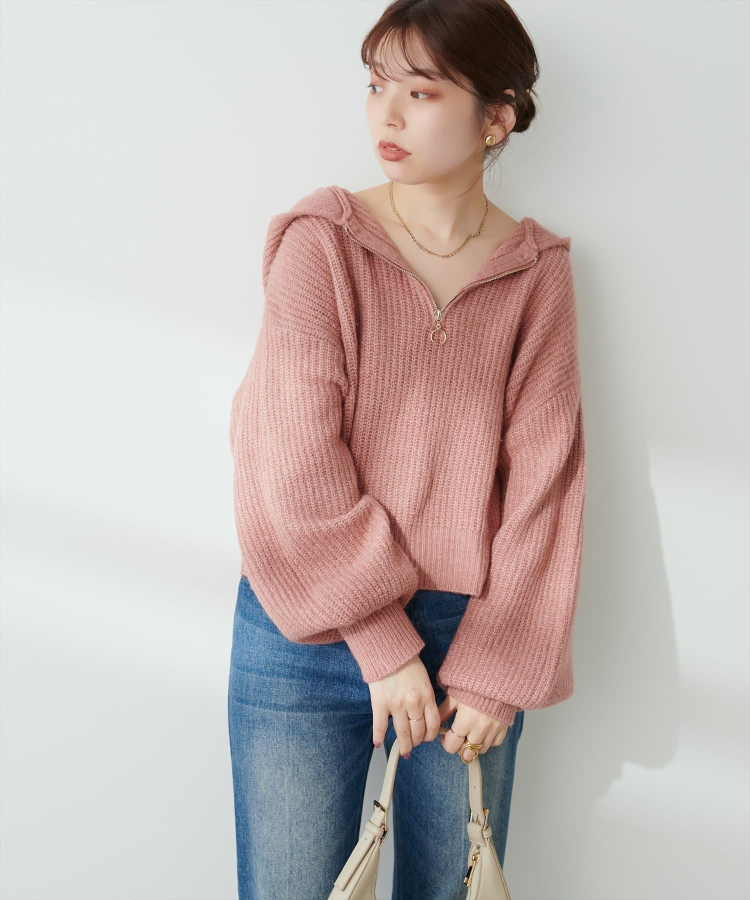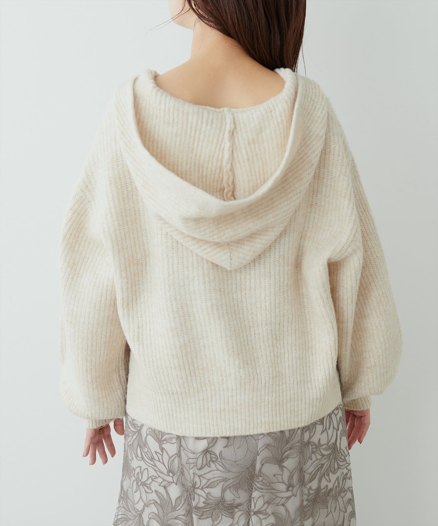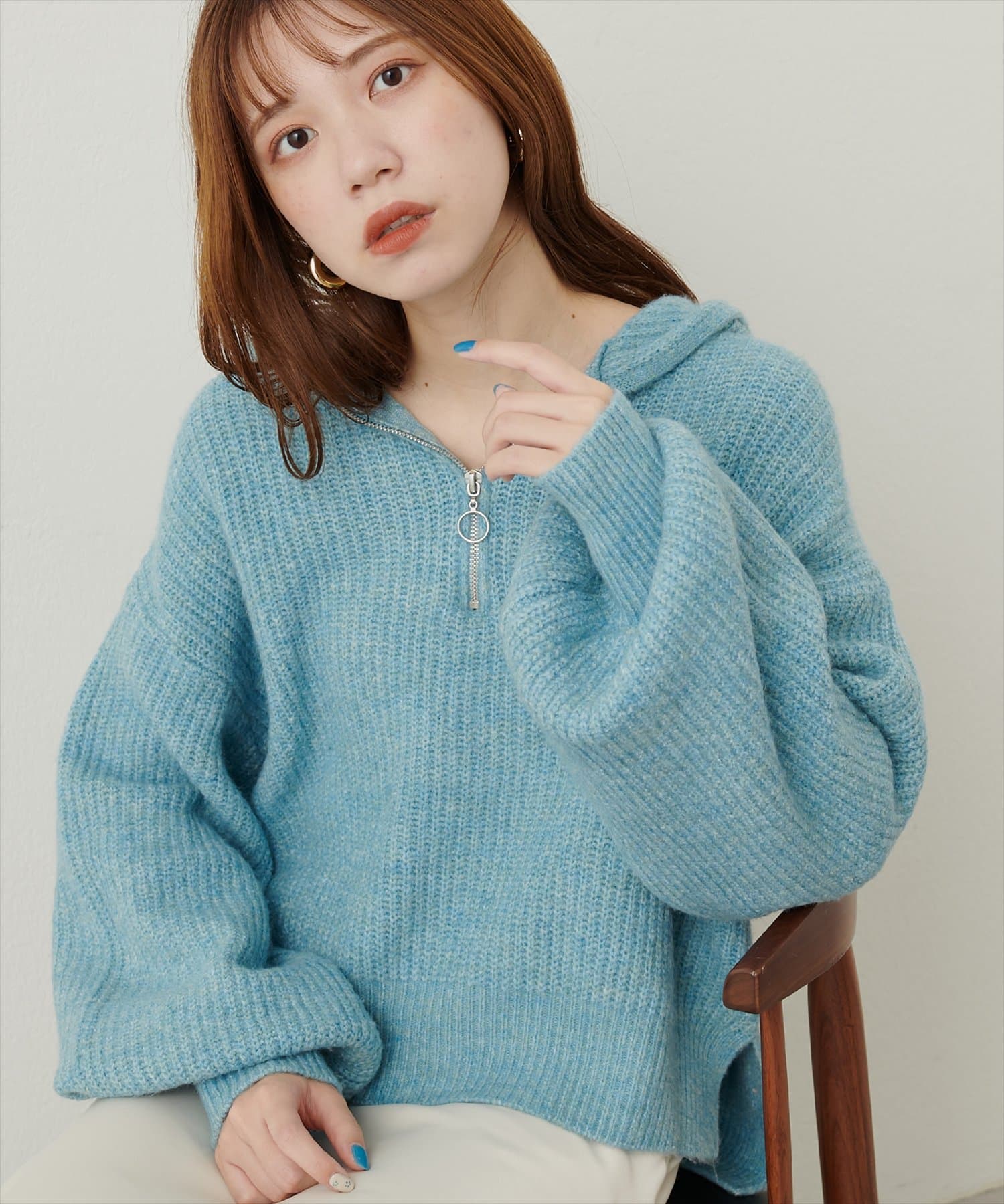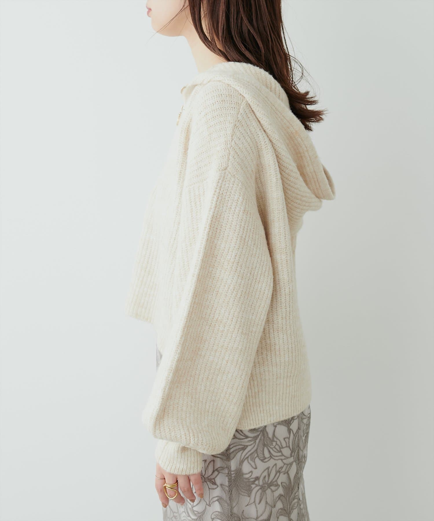 ゴールドのファスナーがポイントの、大人カジュアルなフード付きニット。