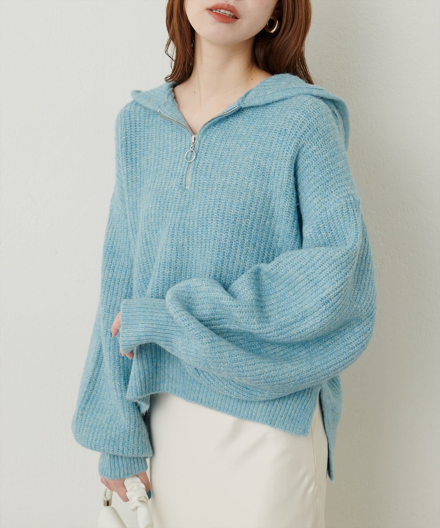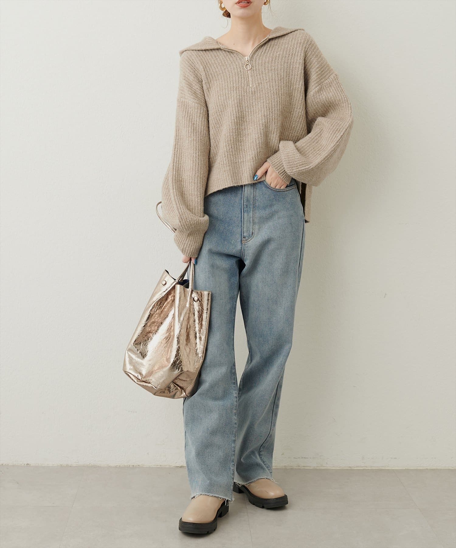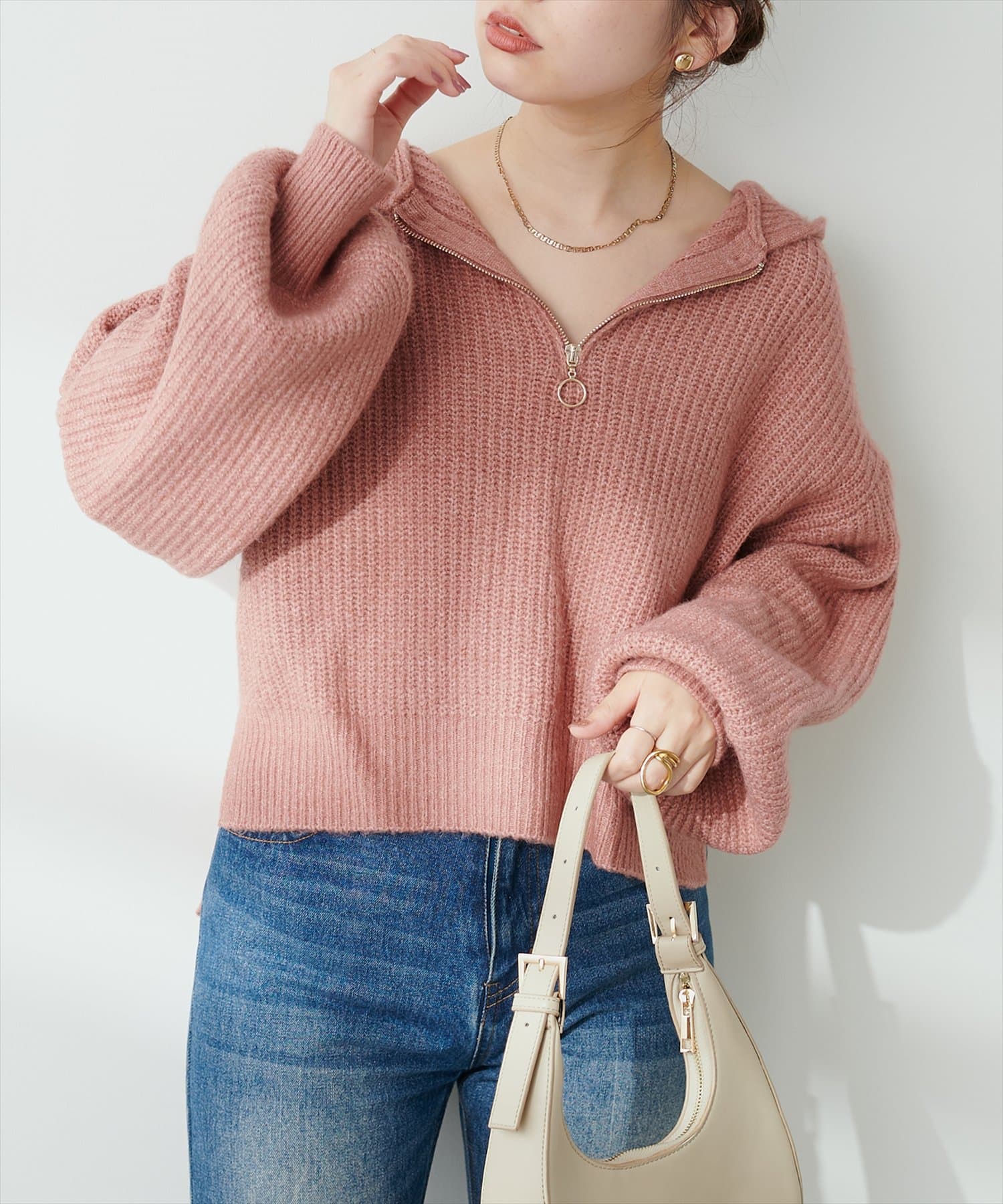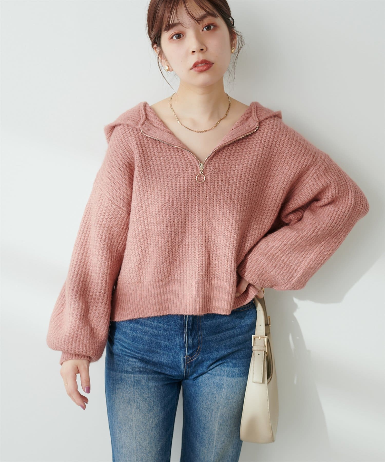 トレンドのハーフジップで気分によって様々な着こなしが楽しめます。