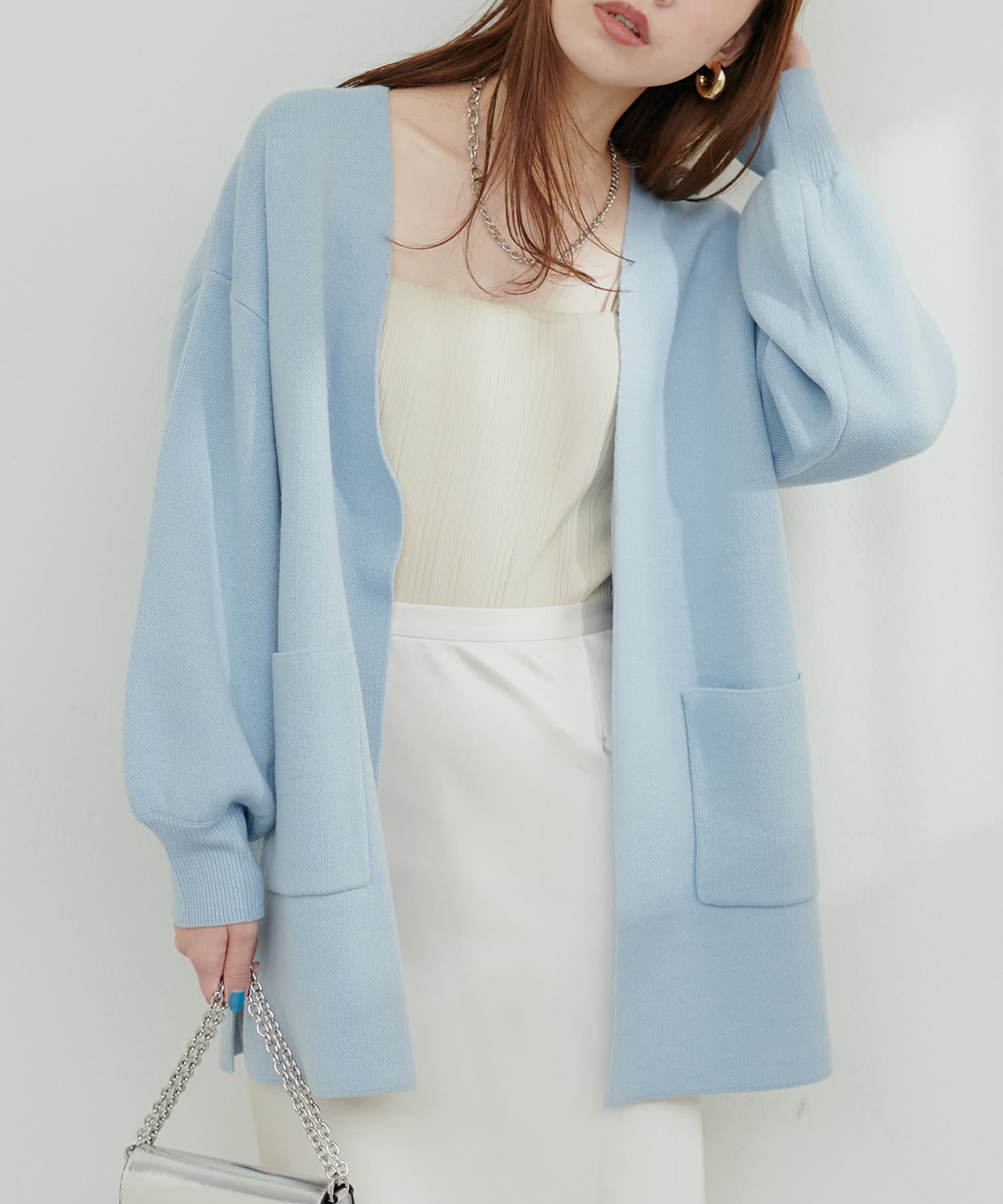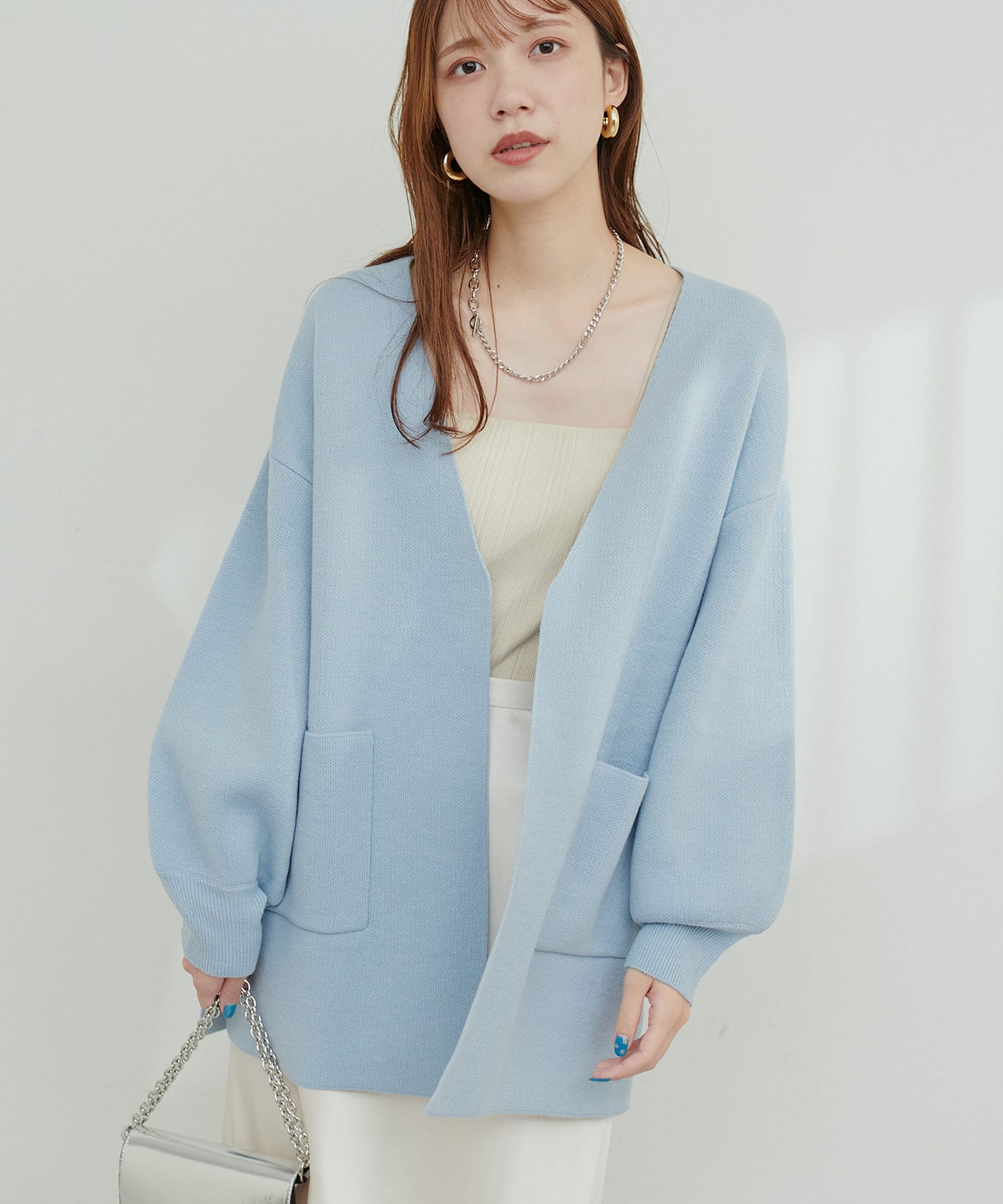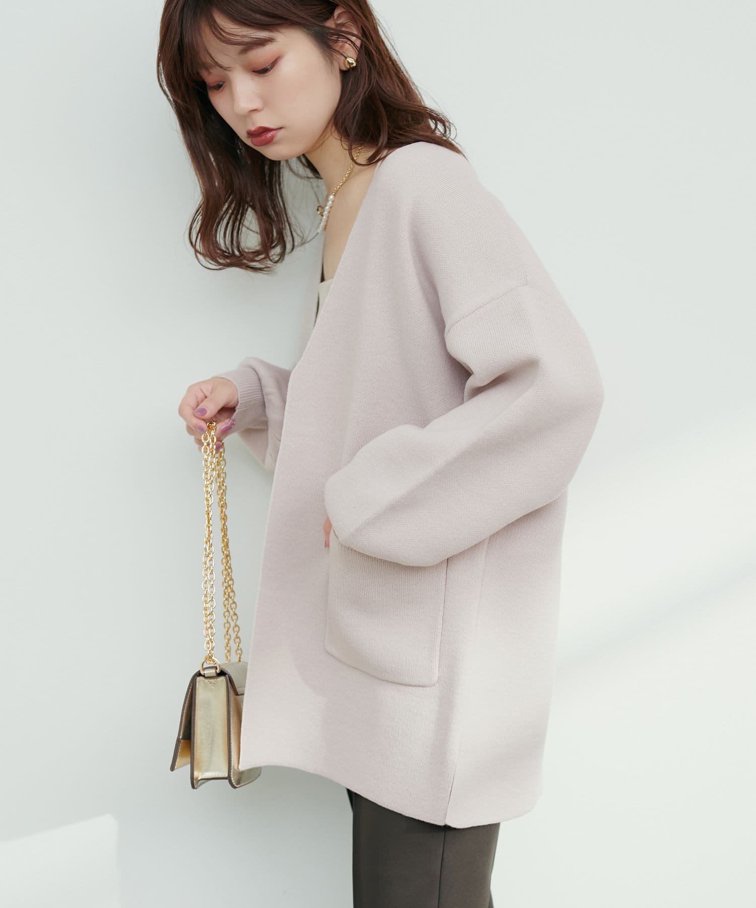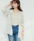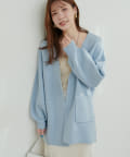 釦なしのすっきりとしたデザインでさっと羽織れるカーディガン。