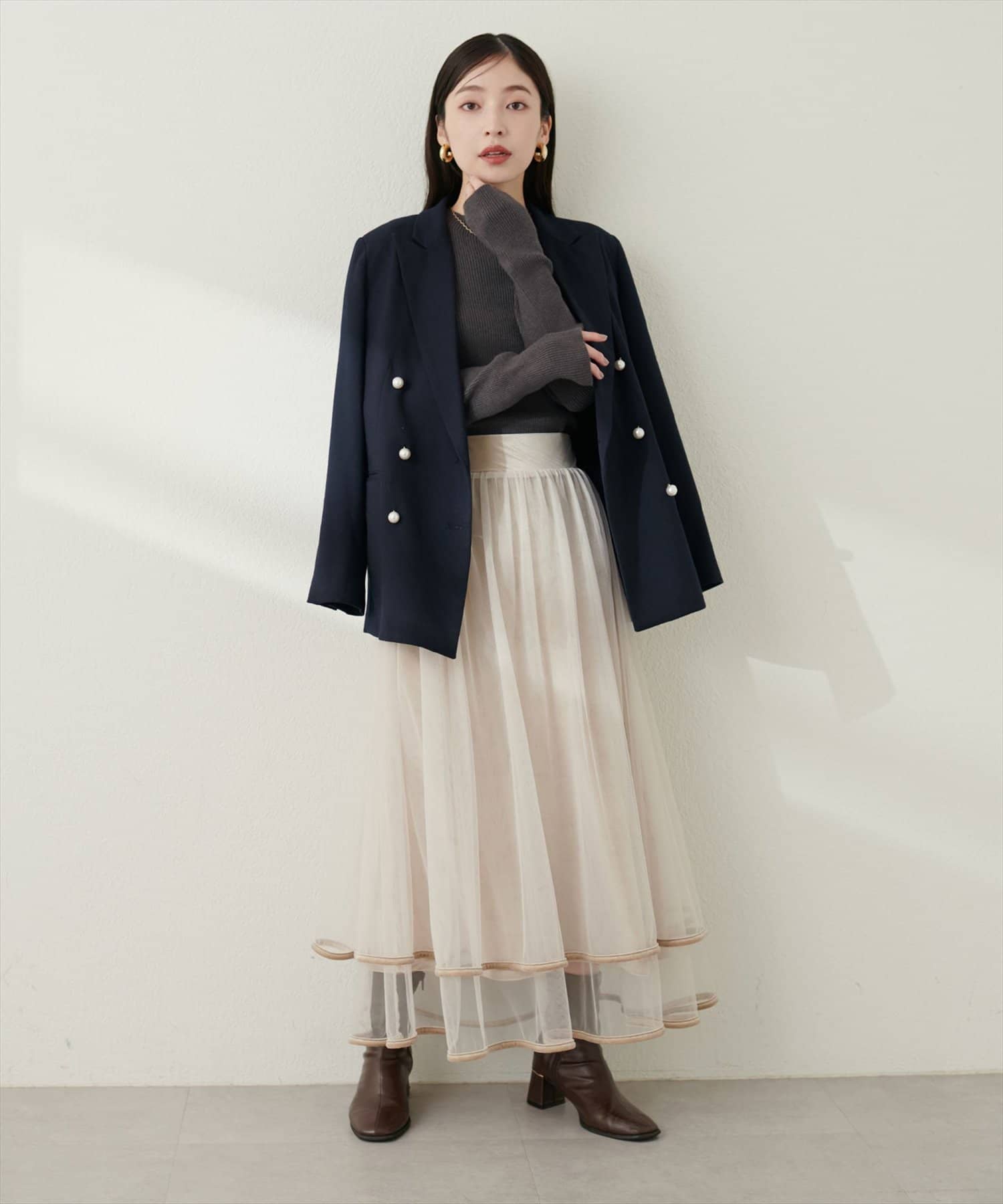 シーンを選ばず、ボトムもスカート、パンツどちらでも合わせられるので、