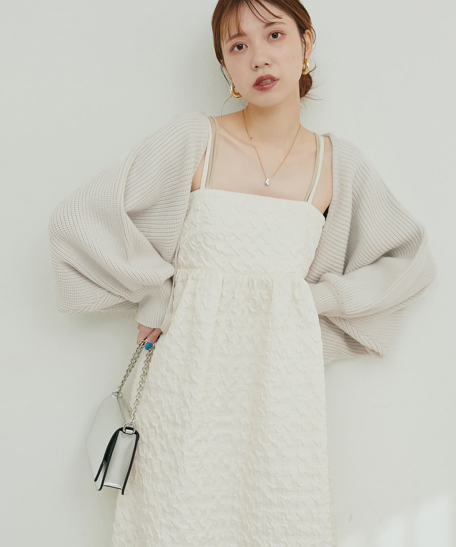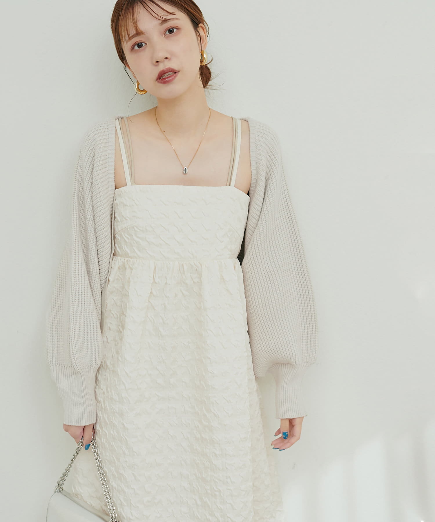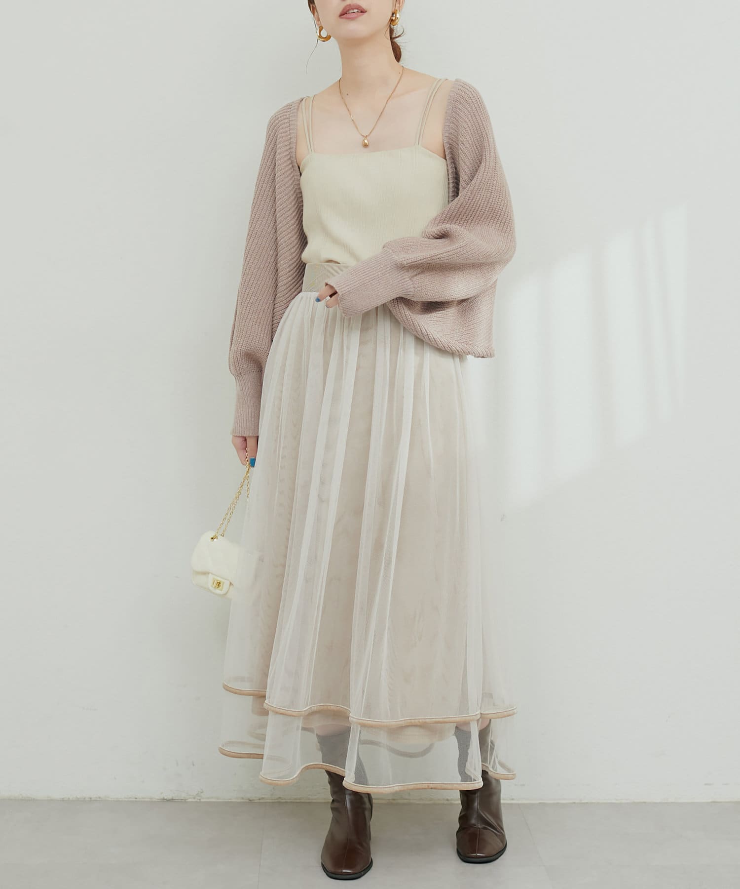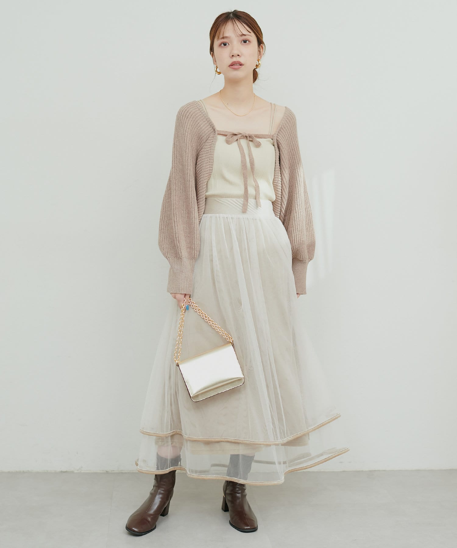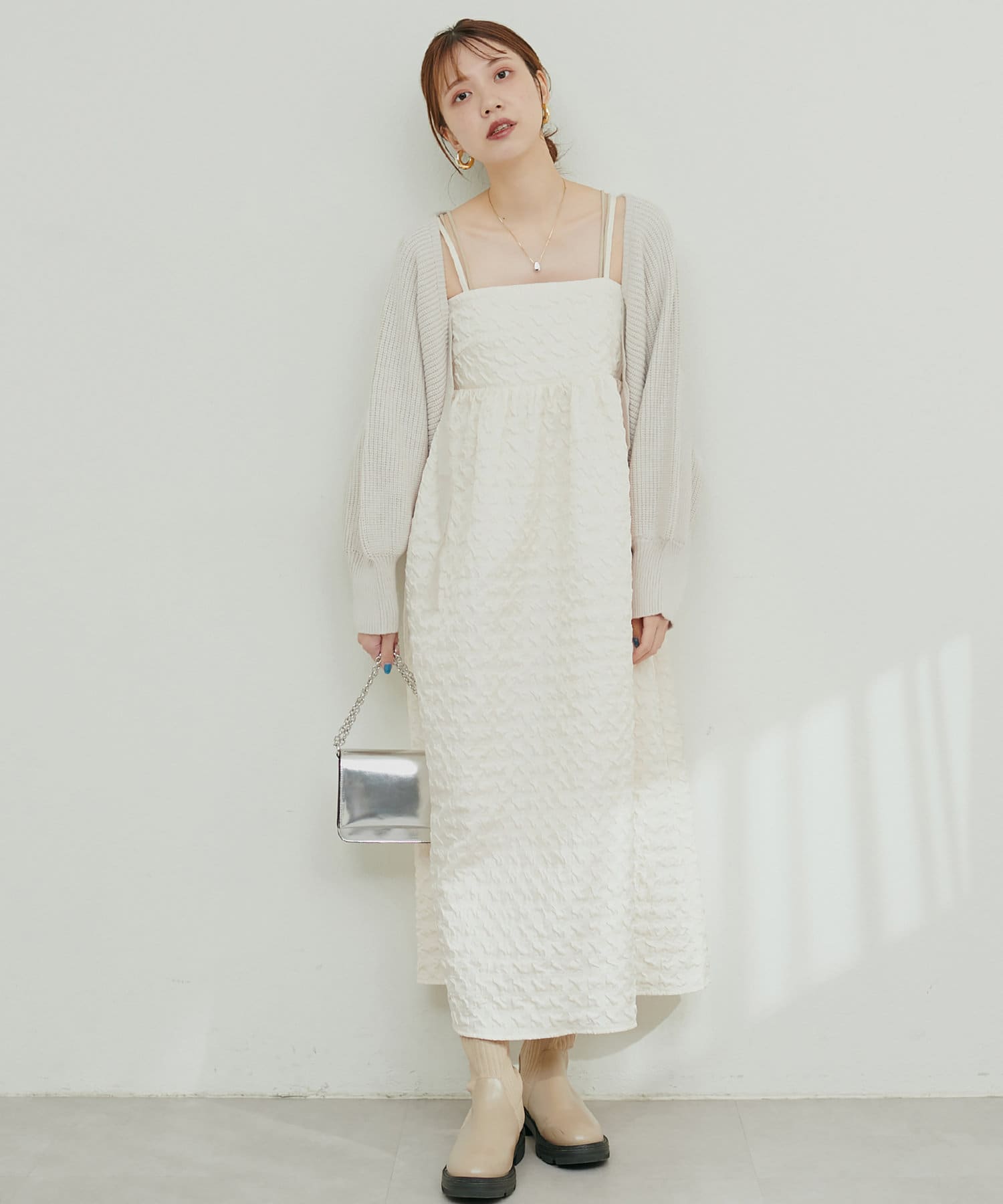 下にボリュームのあり布の面積が大きいキャミワンピースやサロペット合わせなど