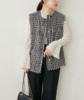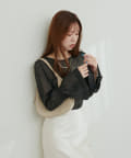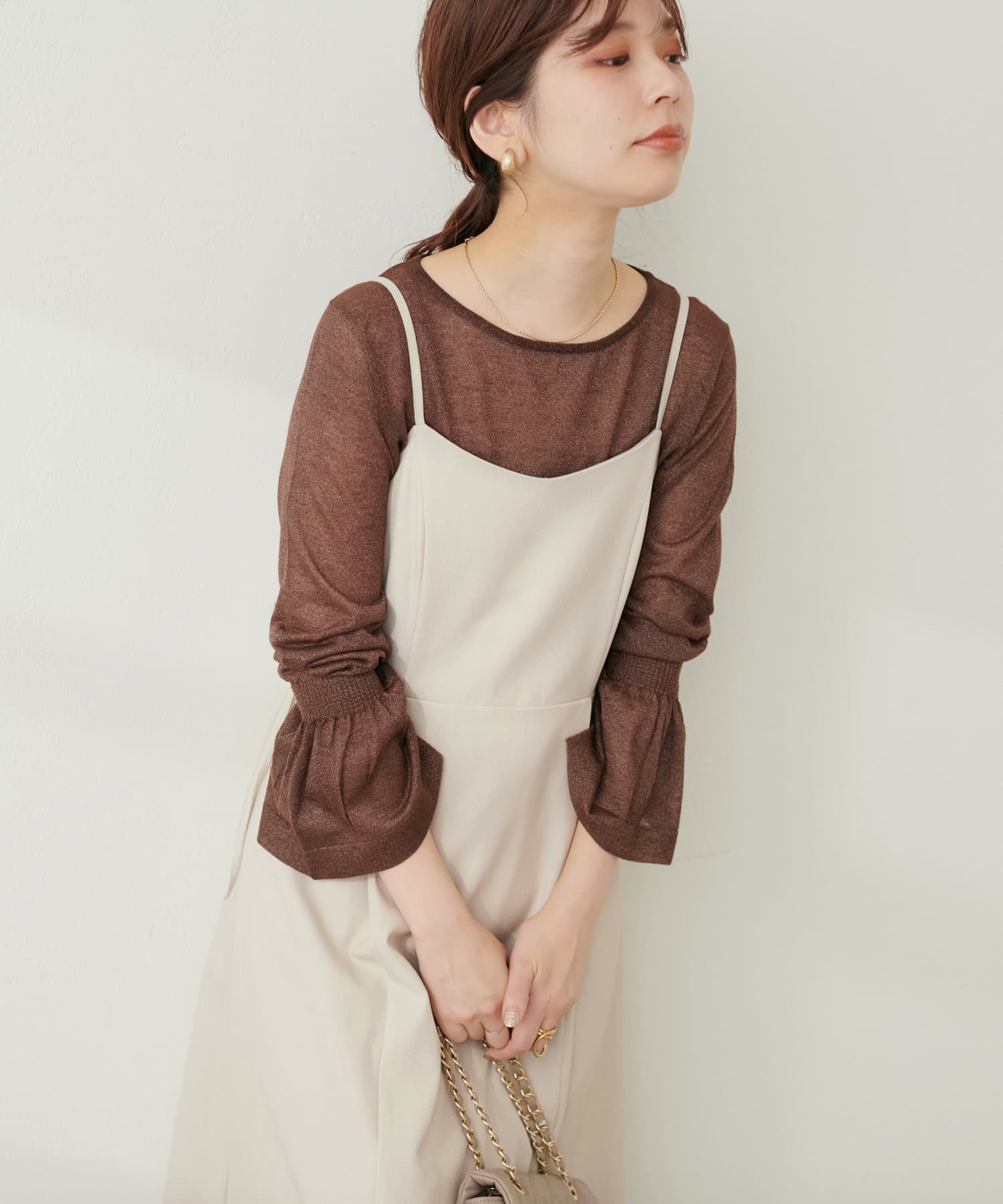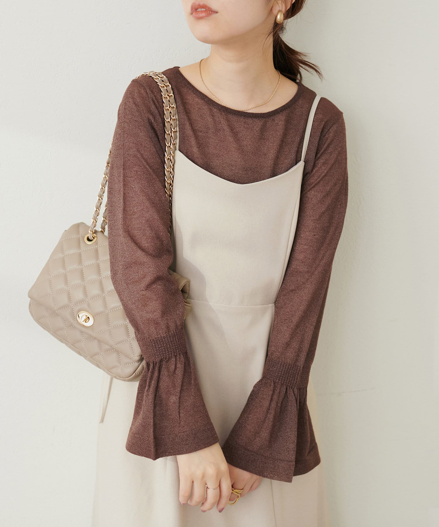 ラメ糸を使用した繊細に輝く素材感が、大人の華やかさを演出するニット。