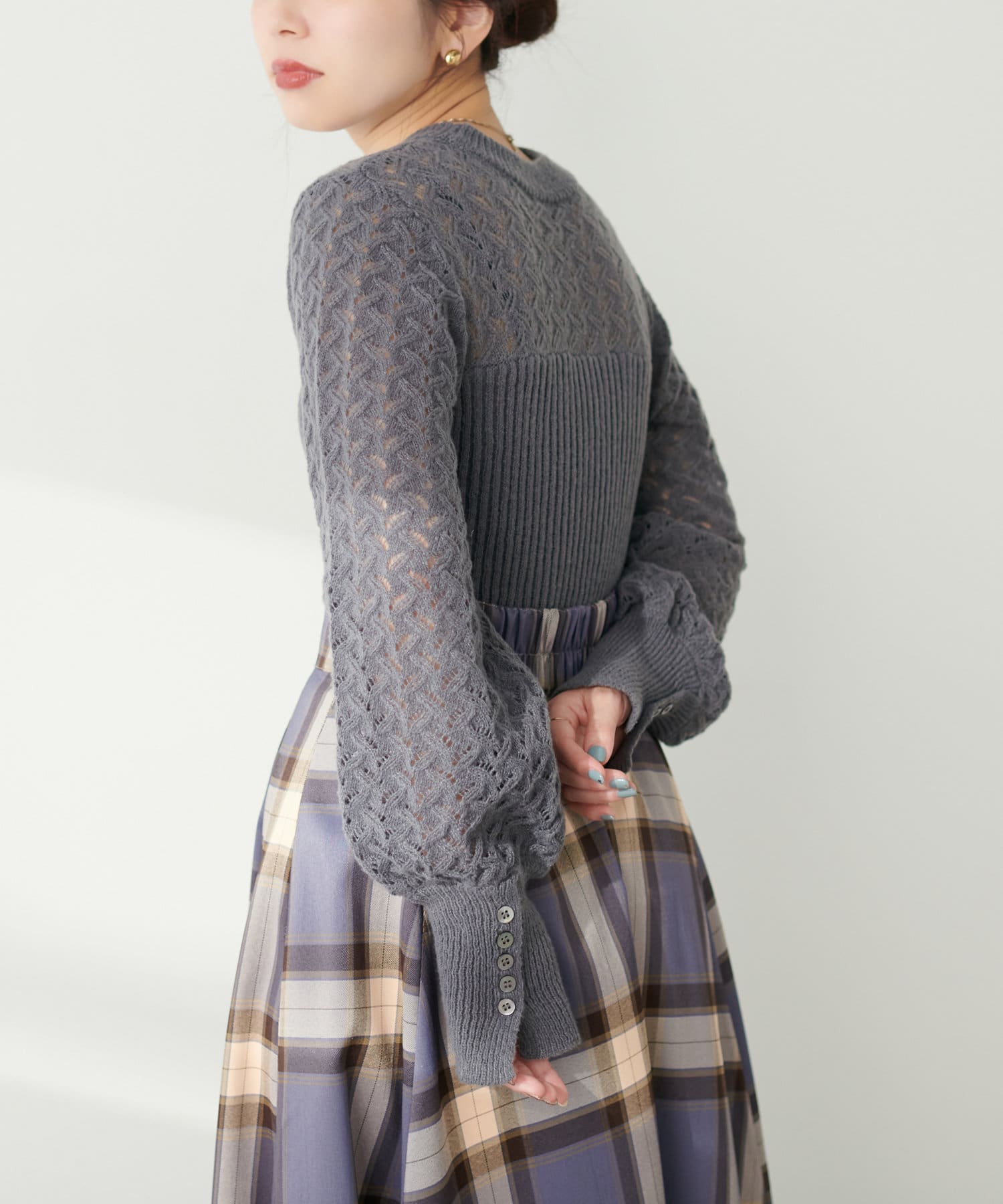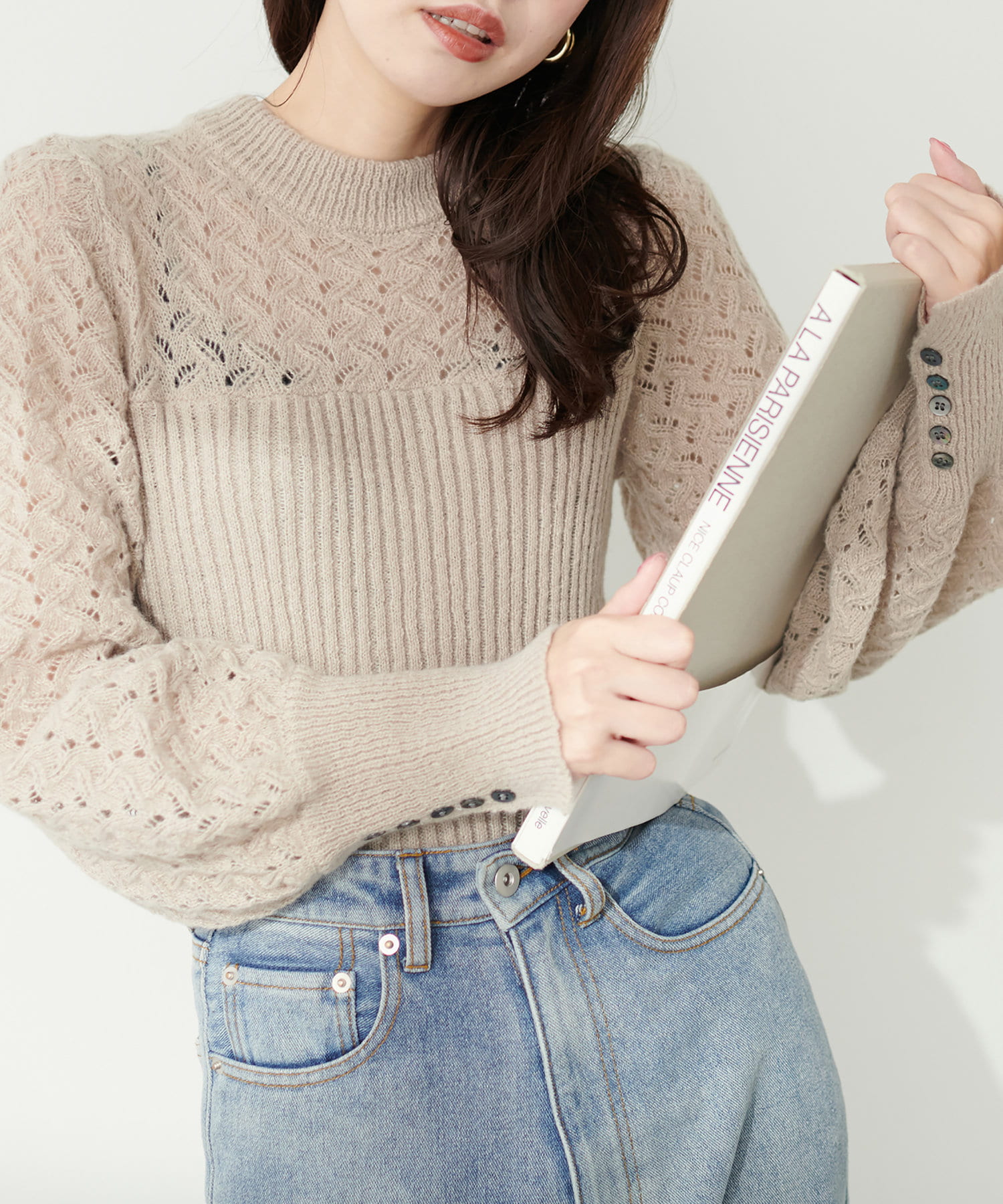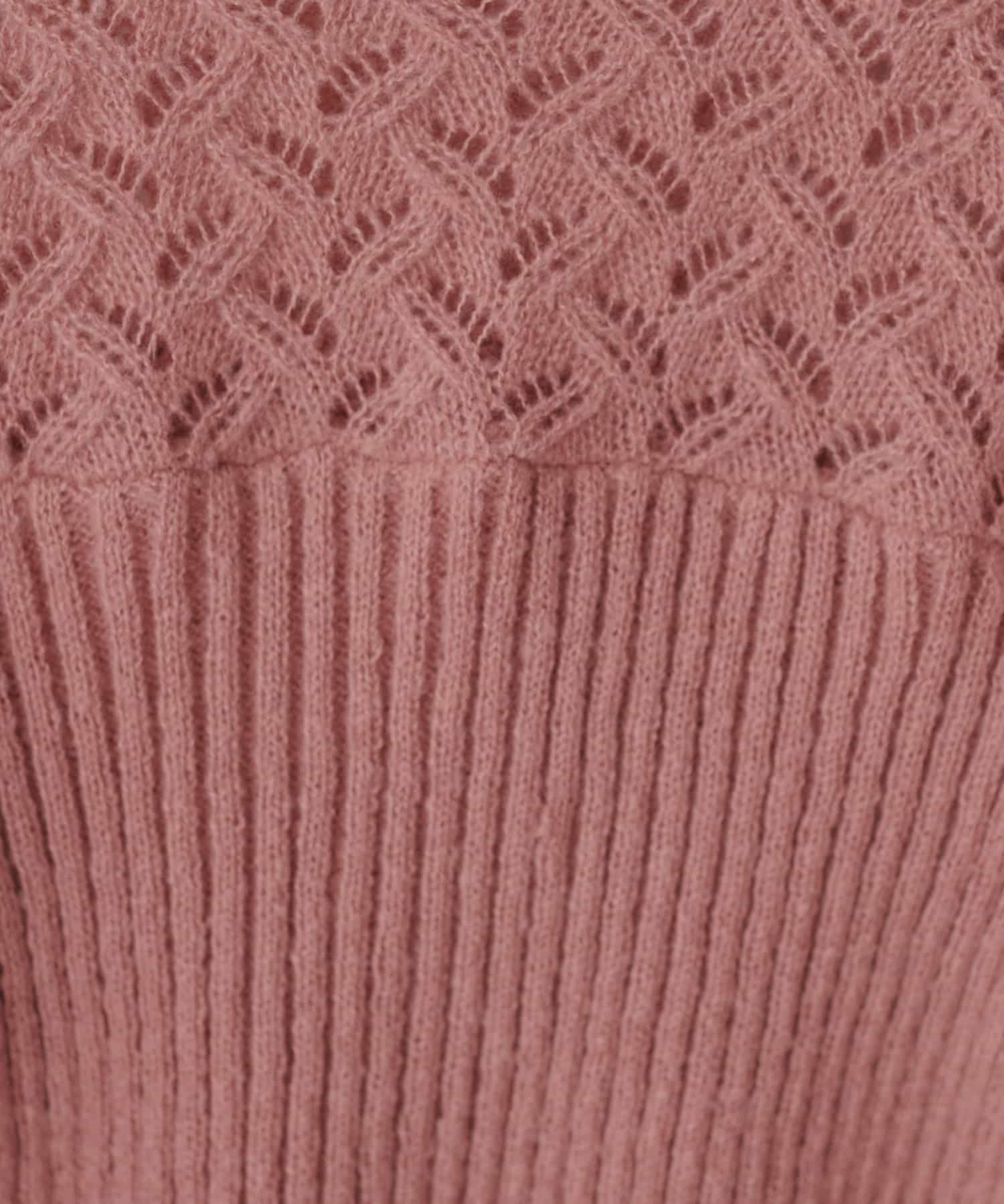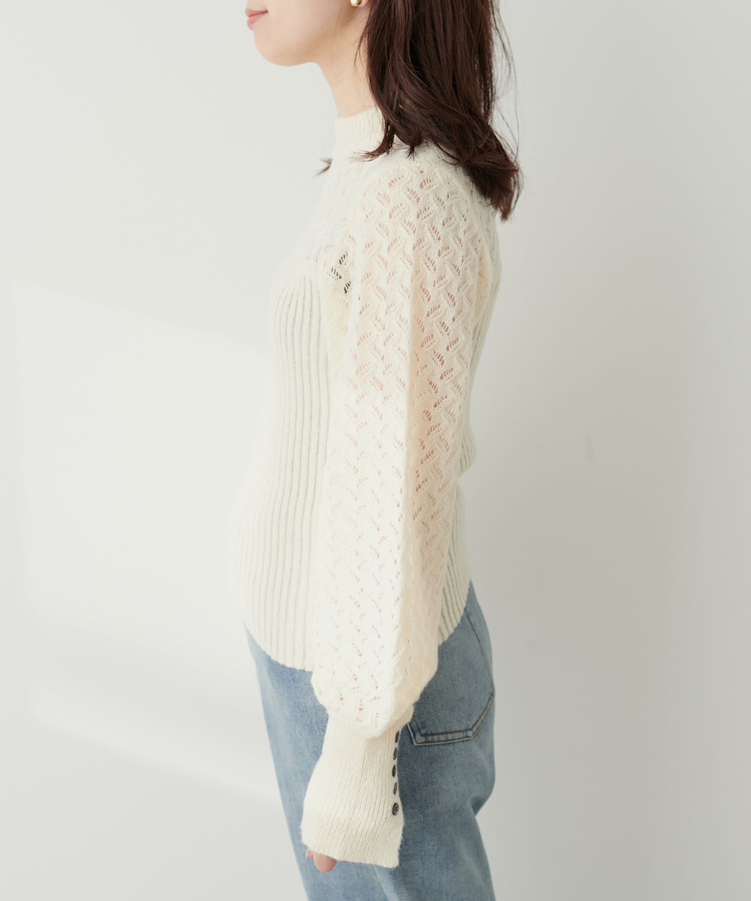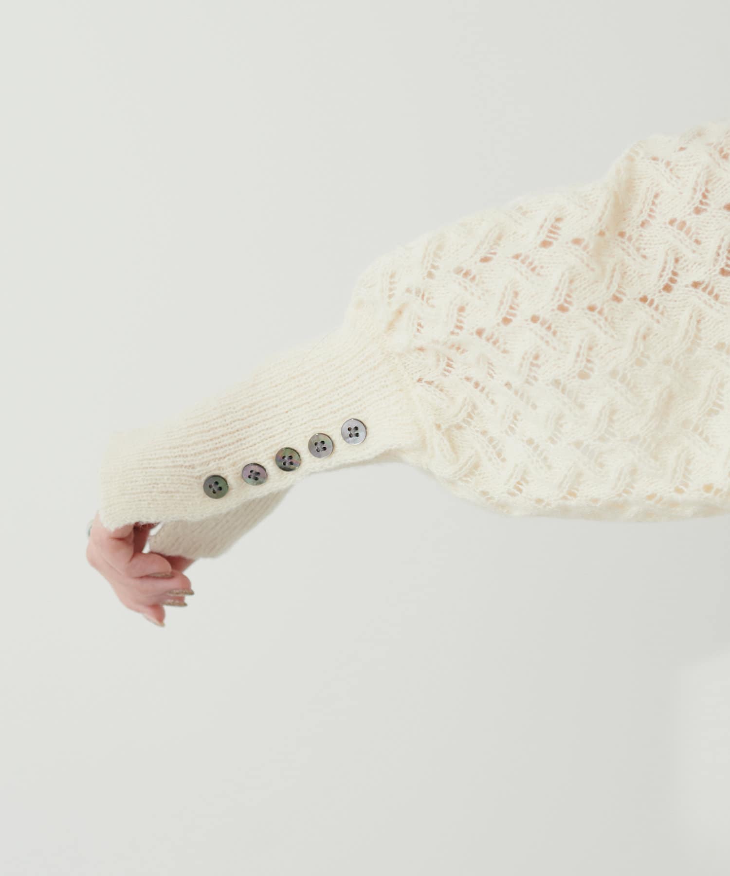 胸上から袖にかけては透かし編みでコーディネートに抜け感をプラスしてくれます。