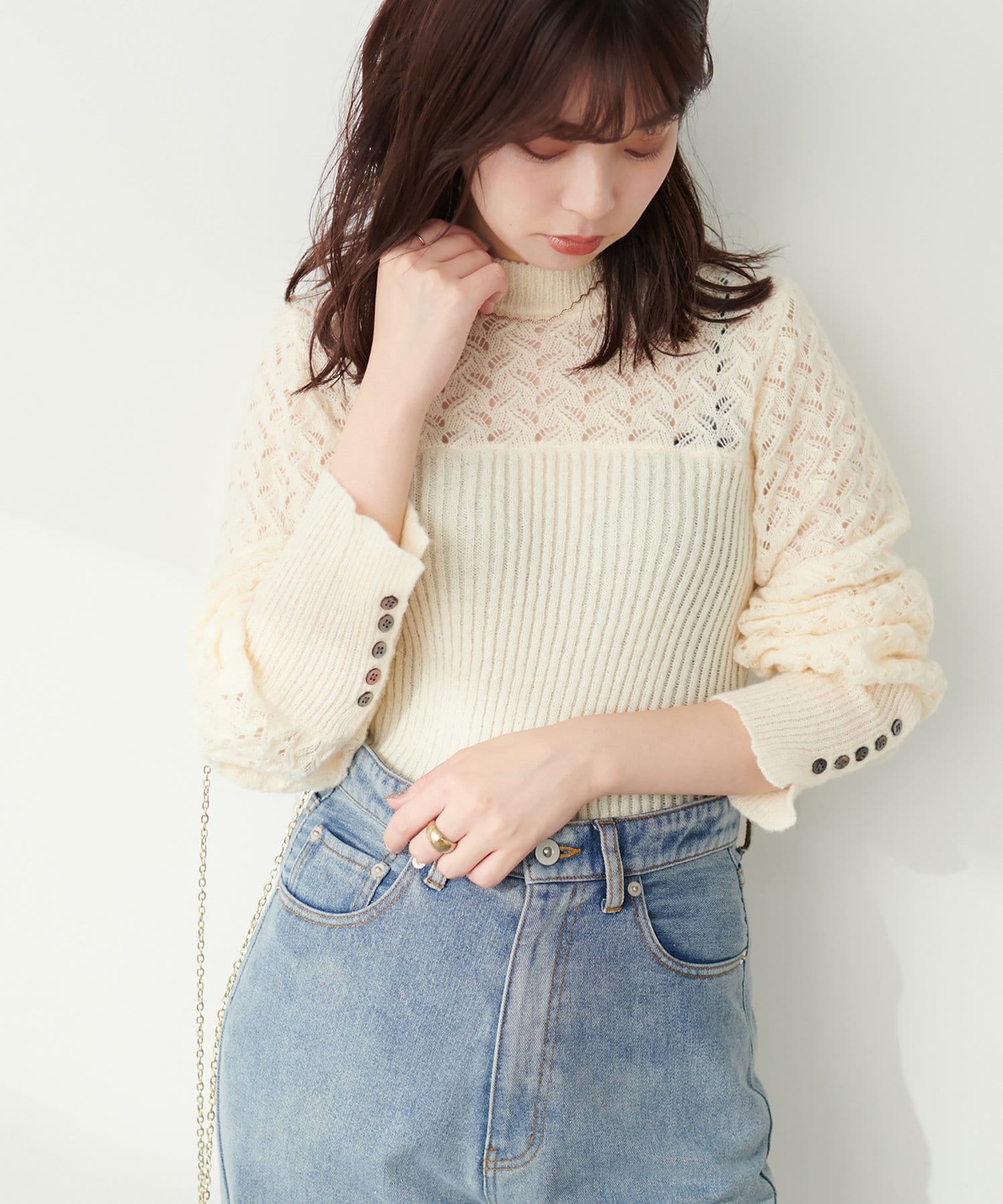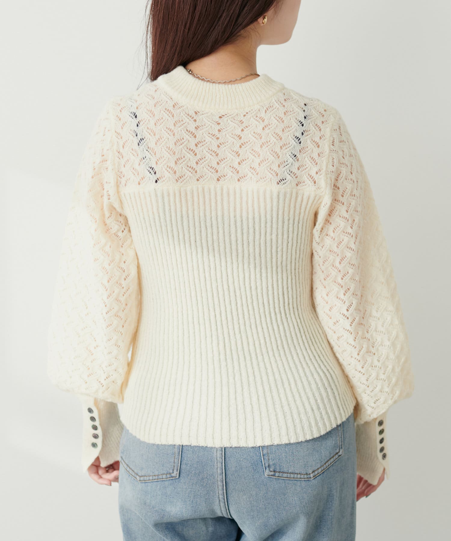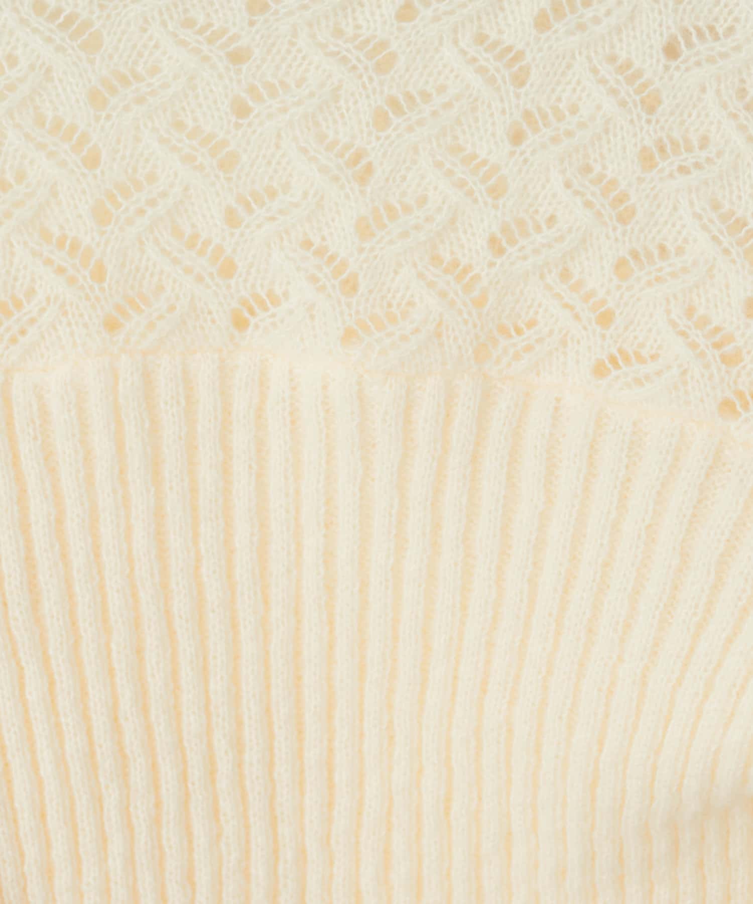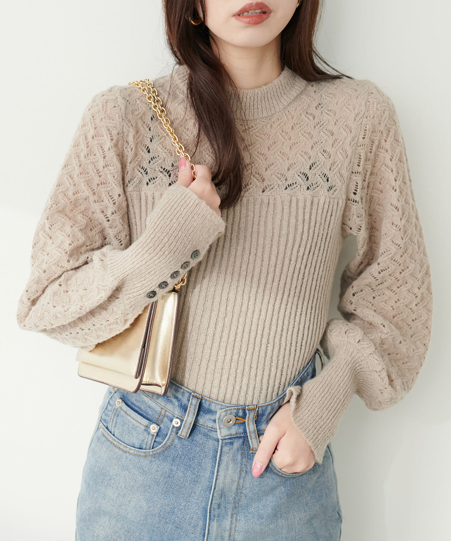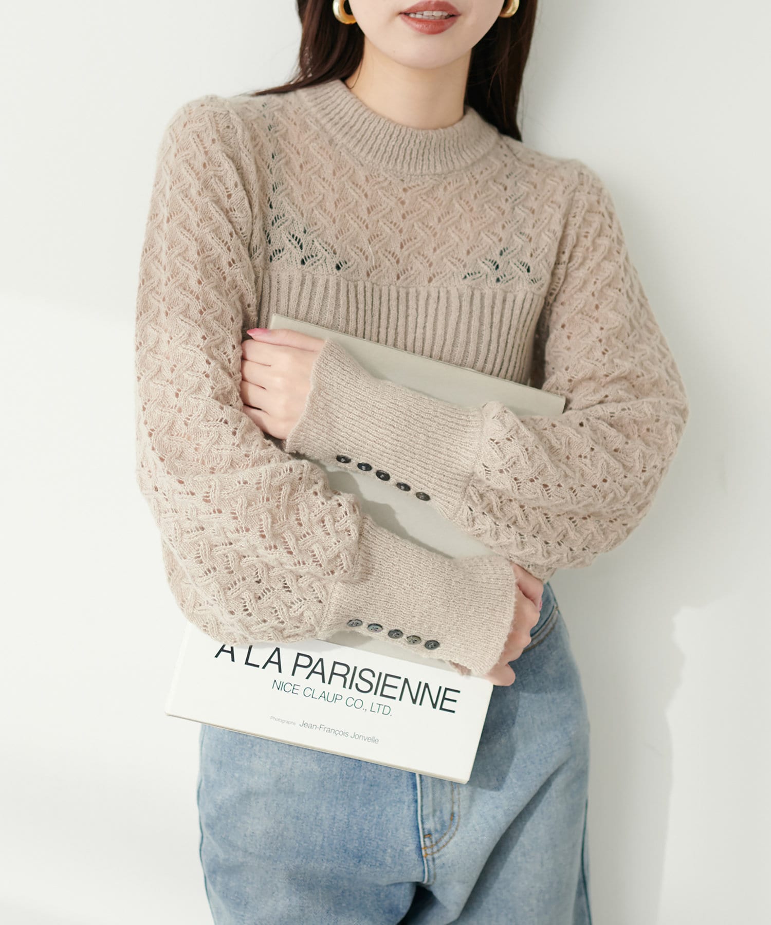 胸上から袖にかけては透かし編みでコーディネートに抜け感をプラスしてくれます。