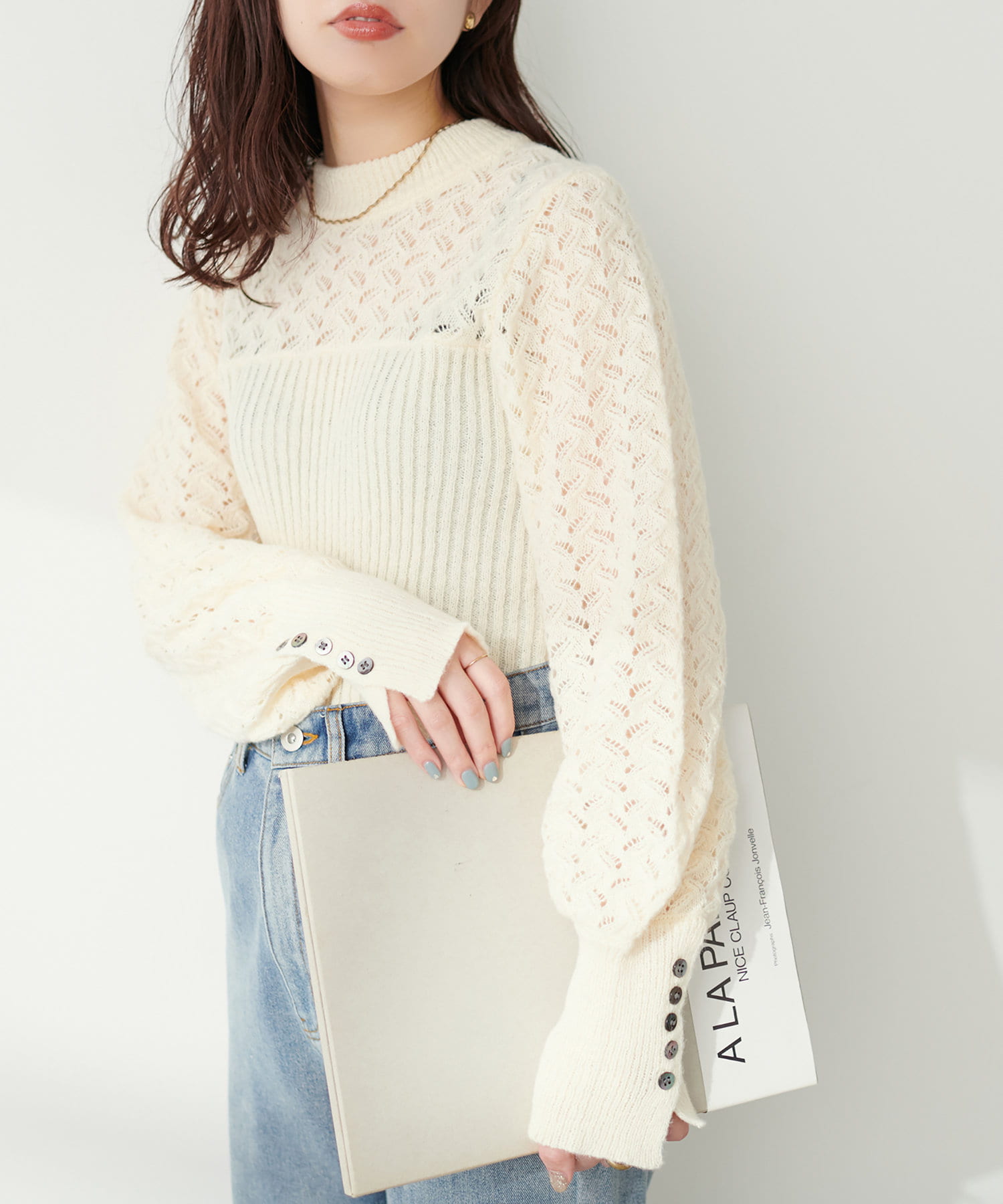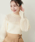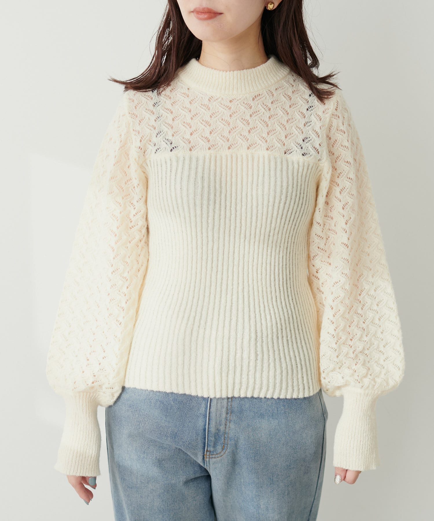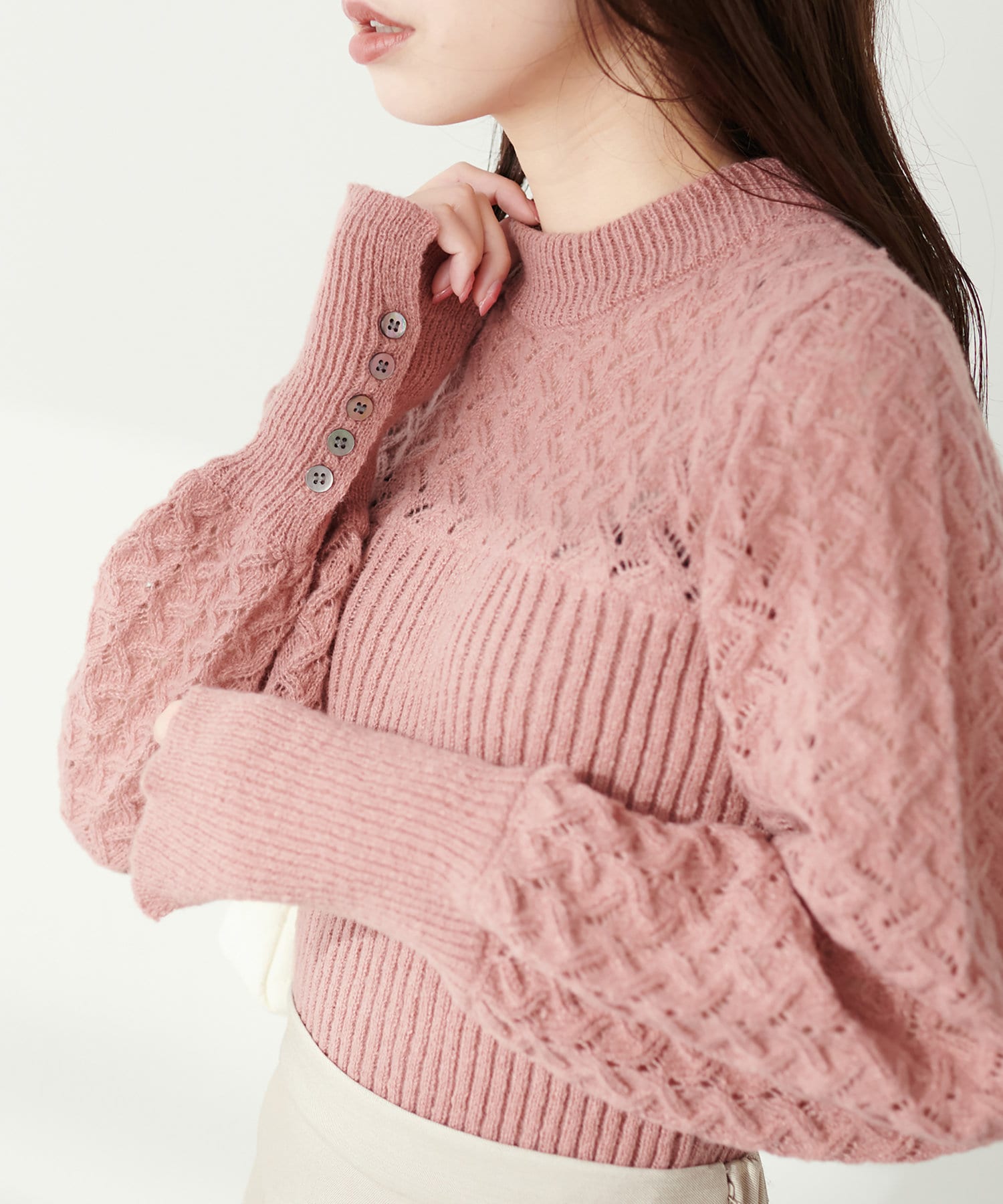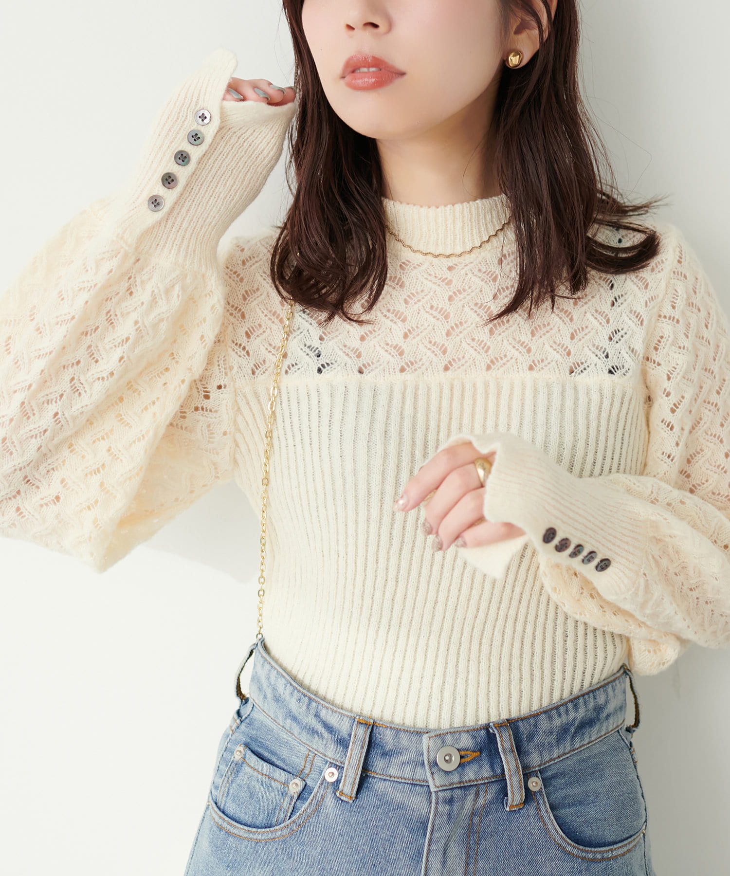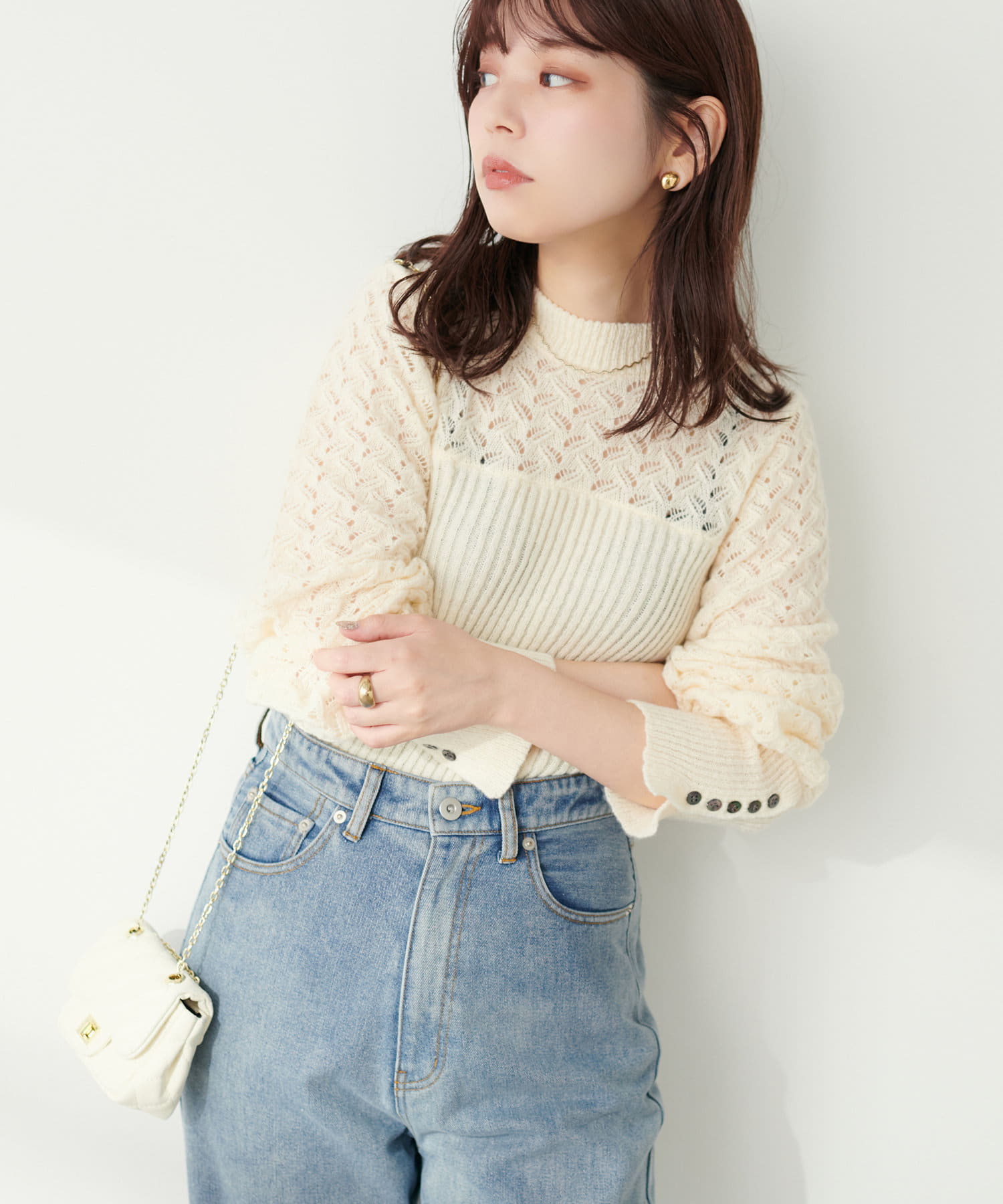 胸上から袖にかけては透かし編みでコーディネートに抜け感をプラスしてくれます。