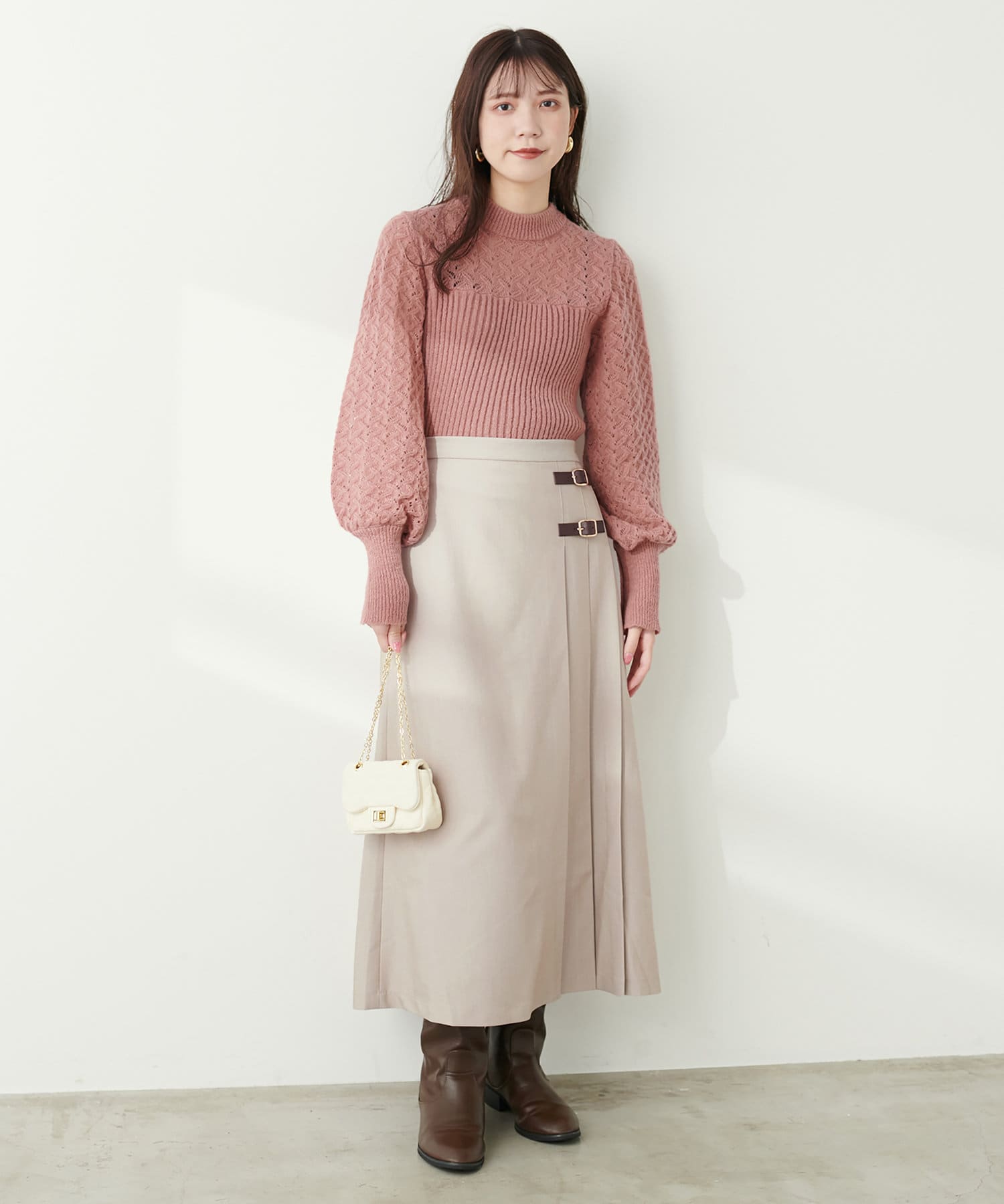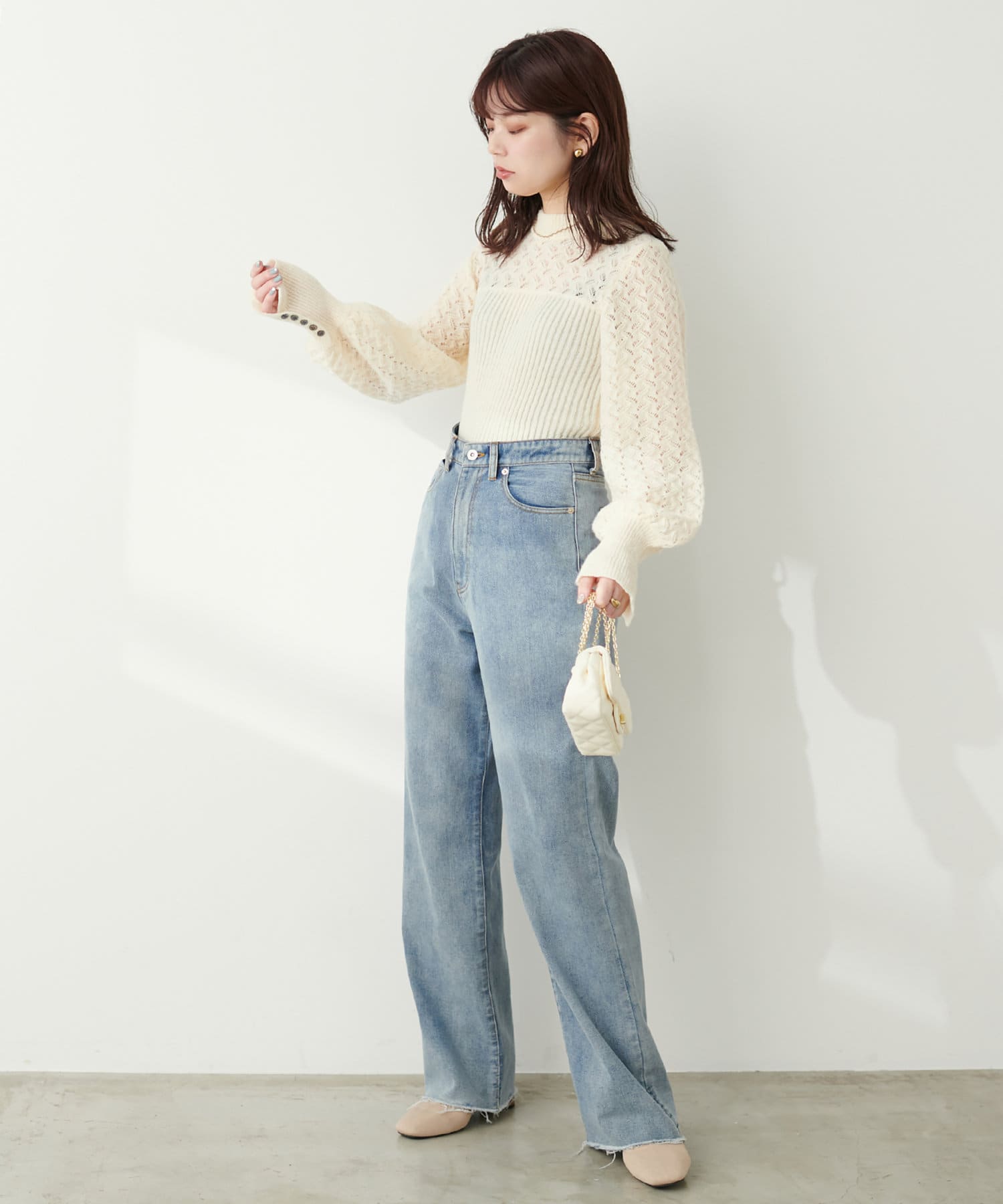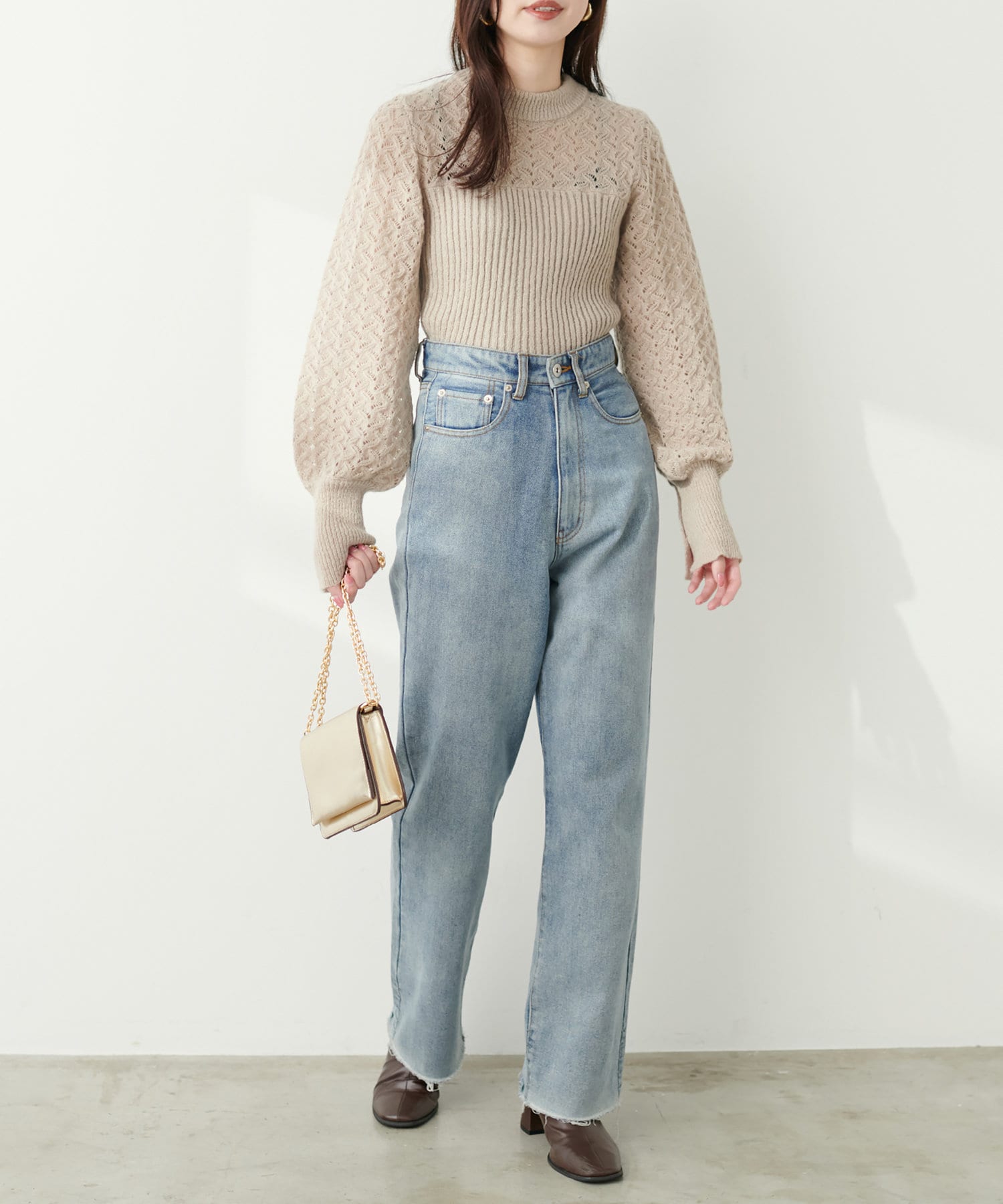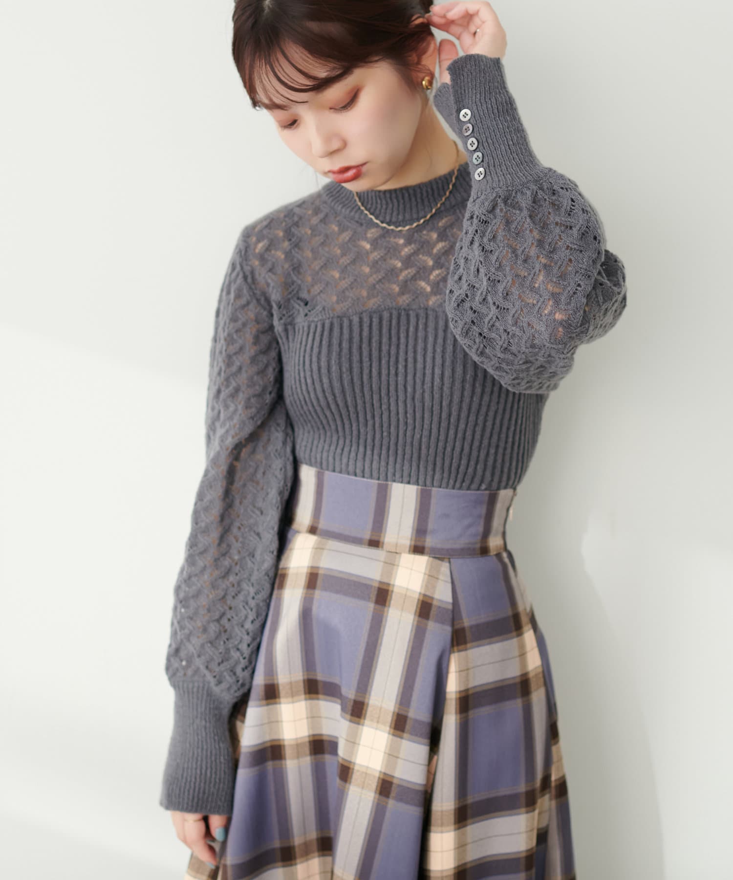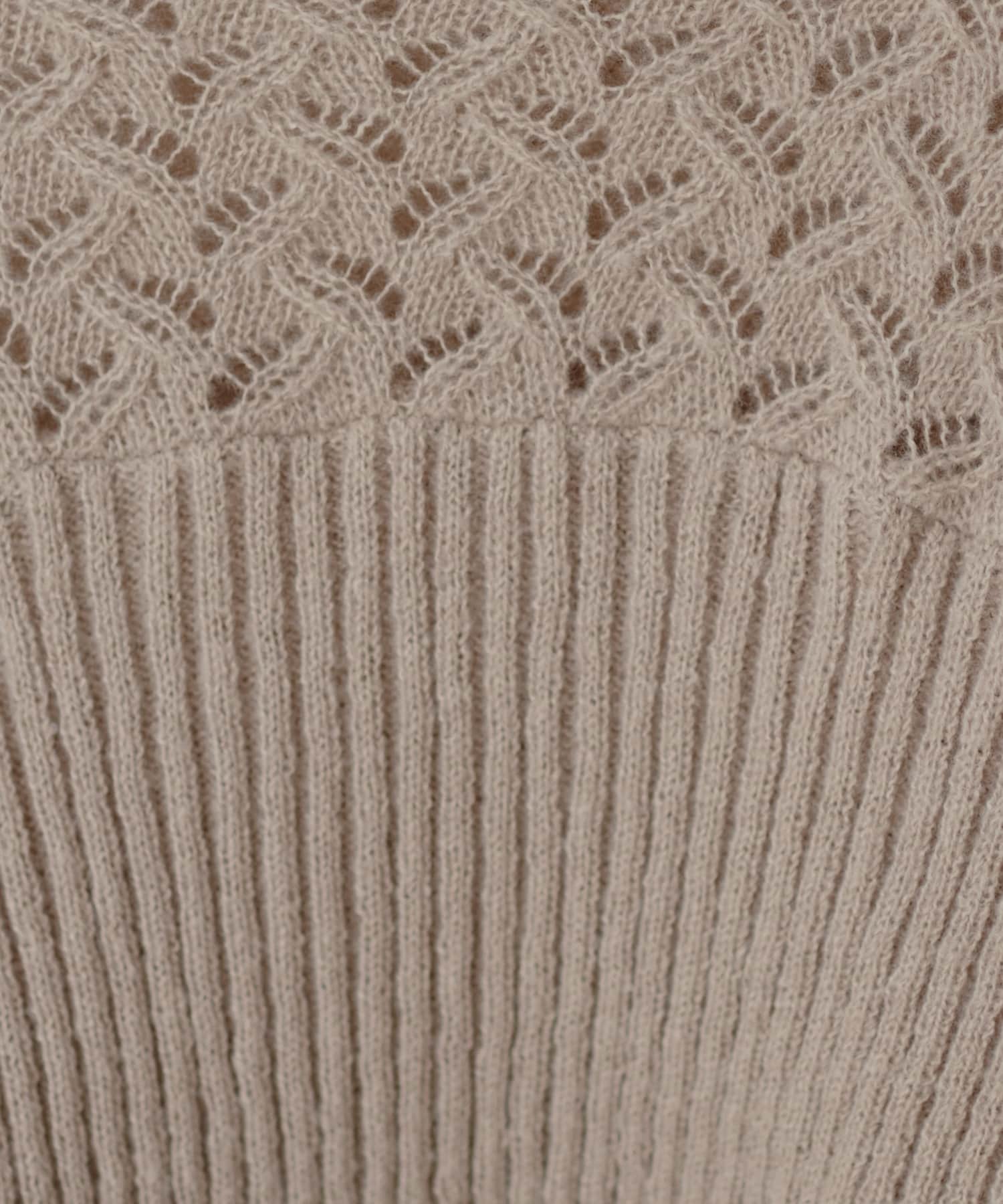 胸上から袖にかけては透かし編みでコーディネートに抜け感をプラスしてくれます。