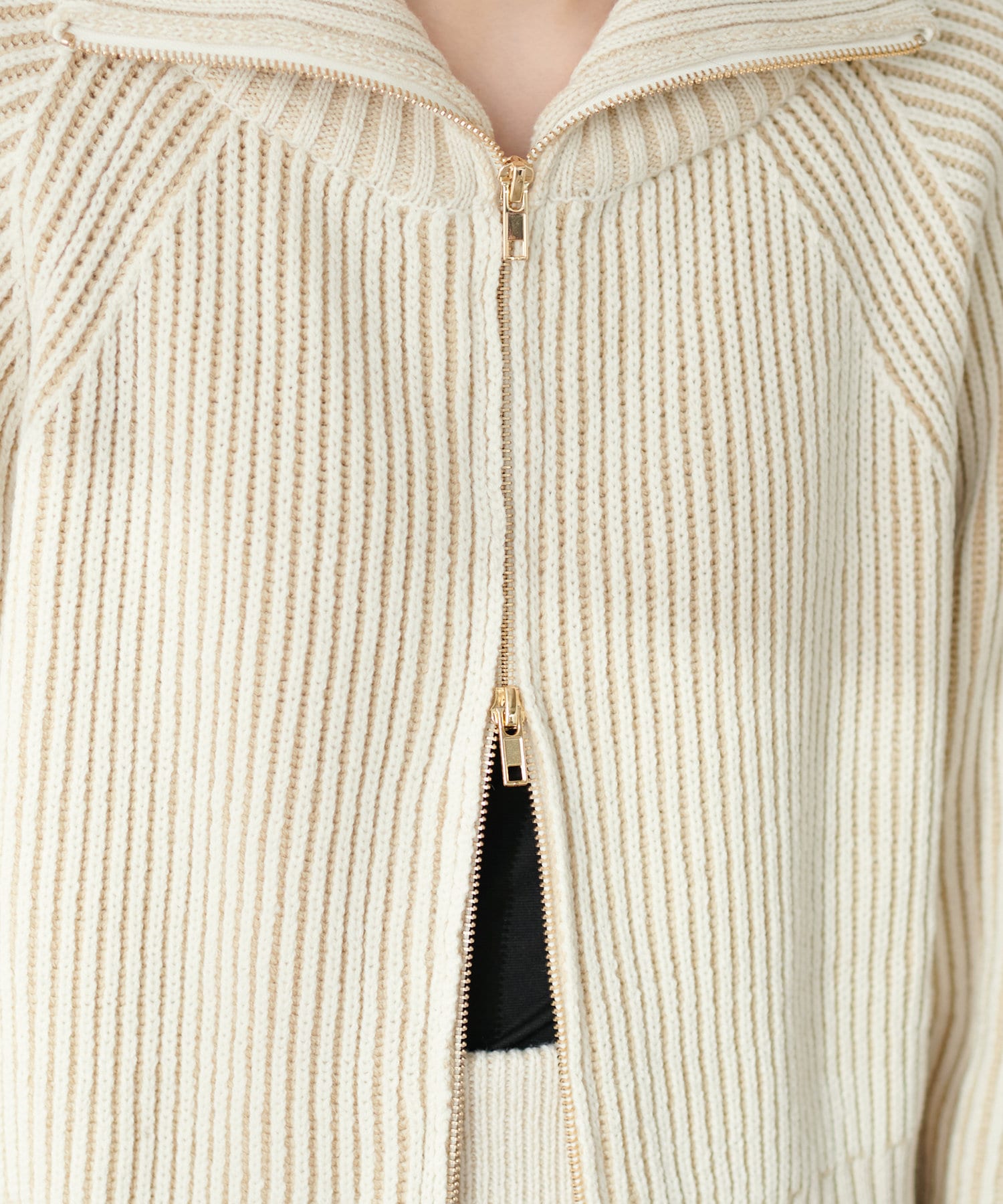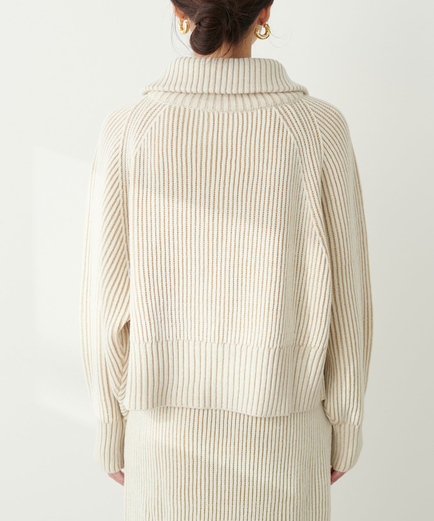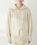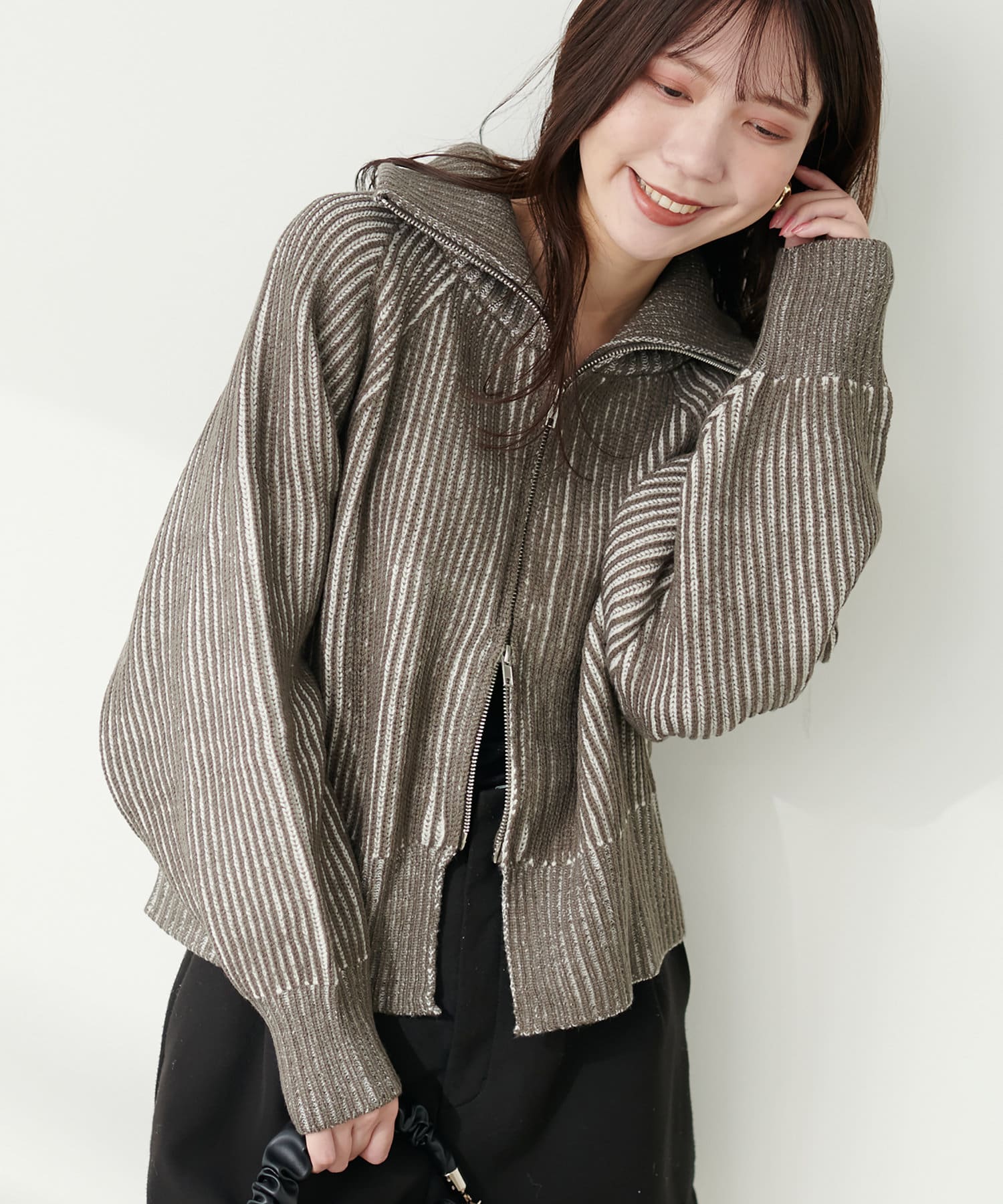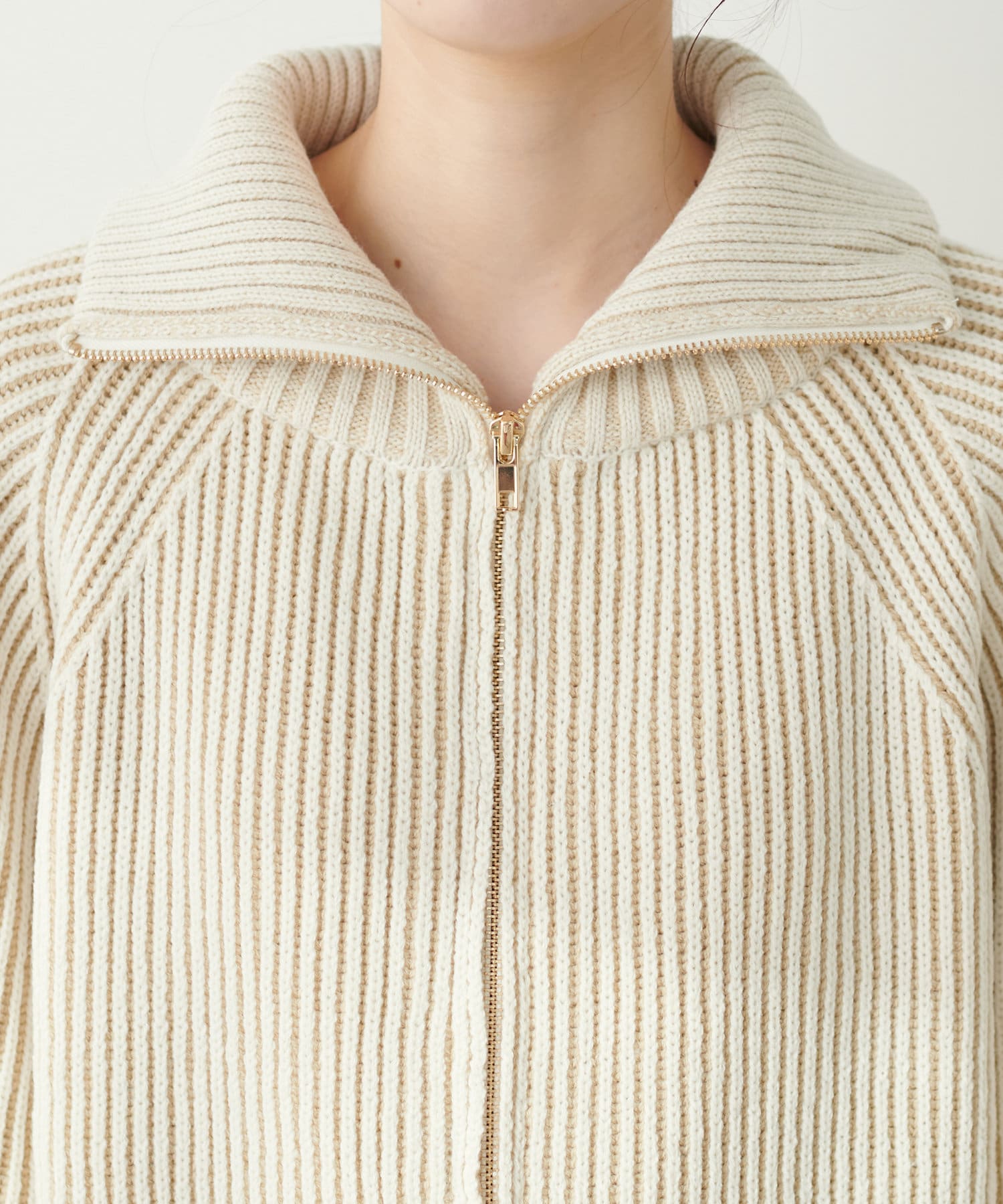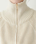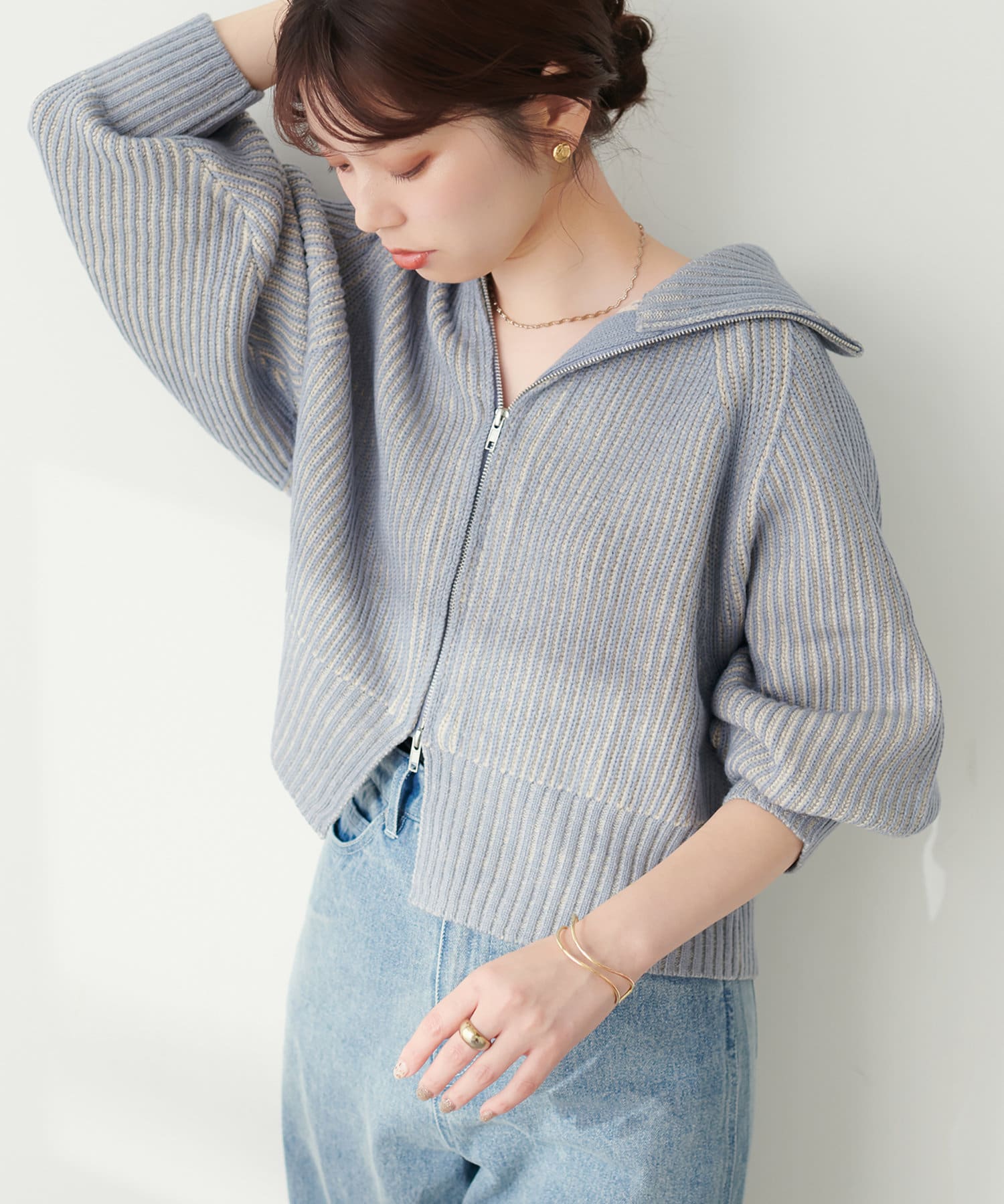 また、ジップを胸元まで下せば衿付きニットとしてもお楽しみ頂ける1枚。