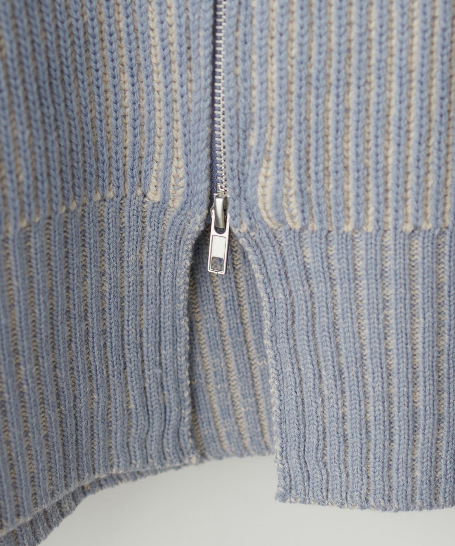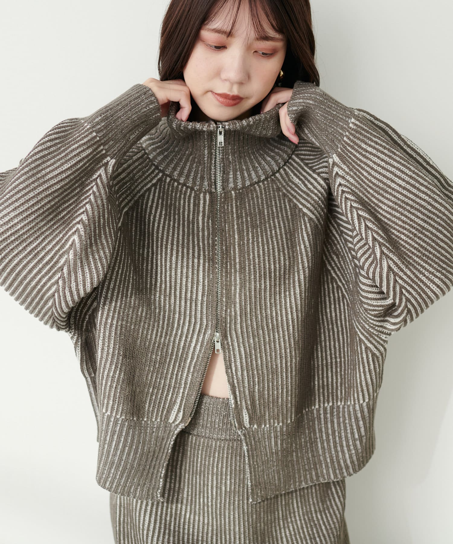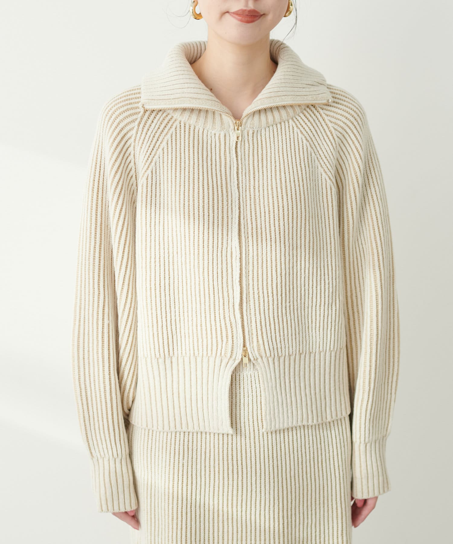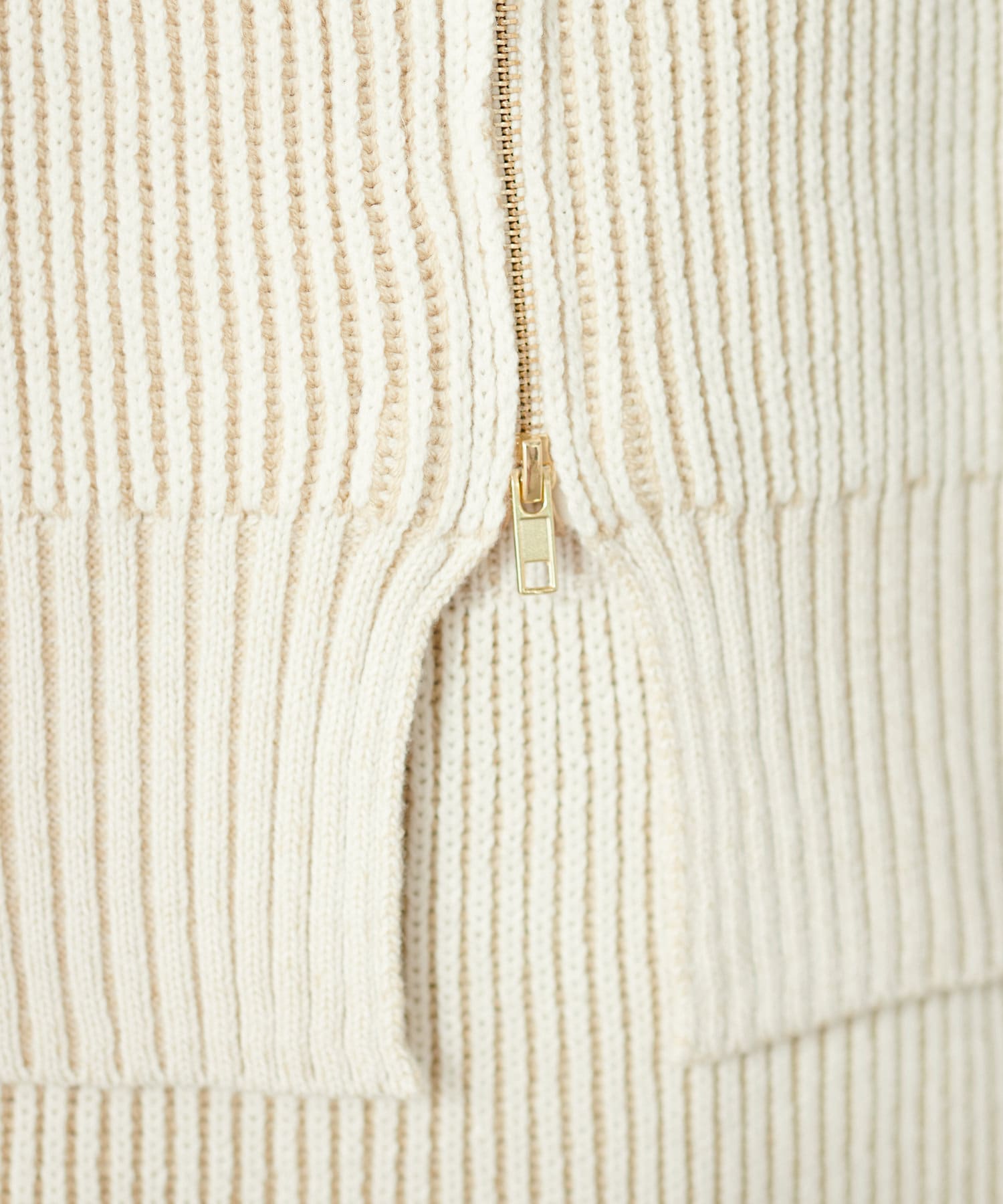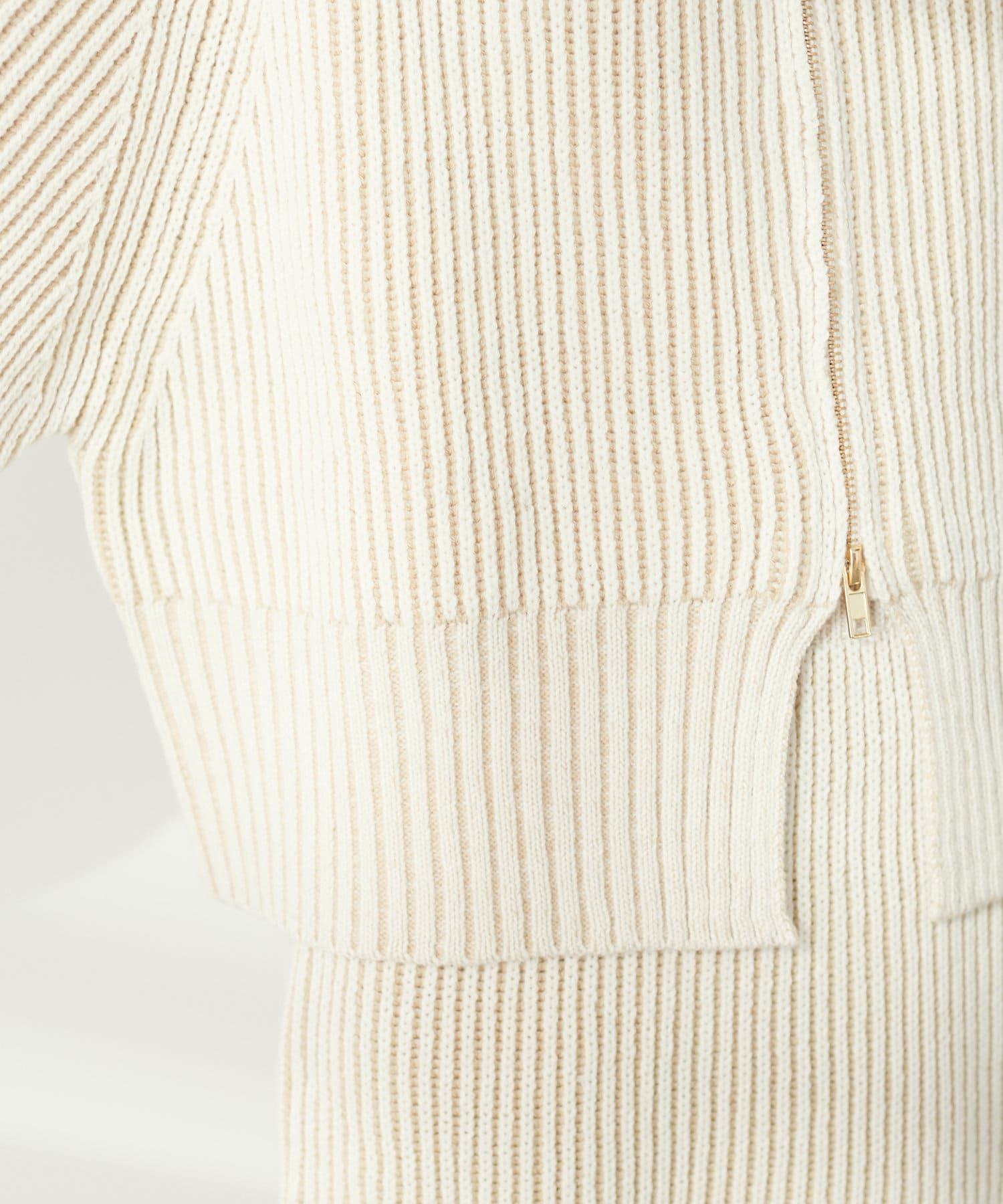 また、ジップを胸元まで下せば衿付きニットとしてもお楽しみ頂ける1枚。