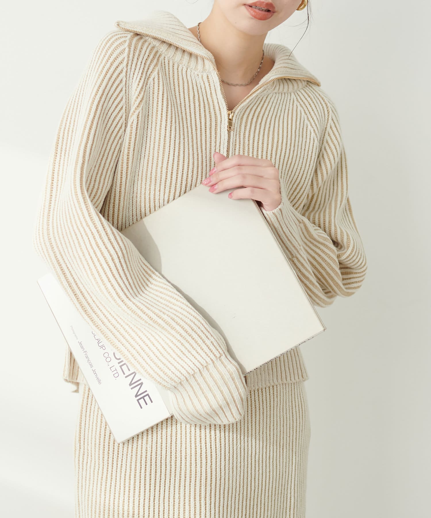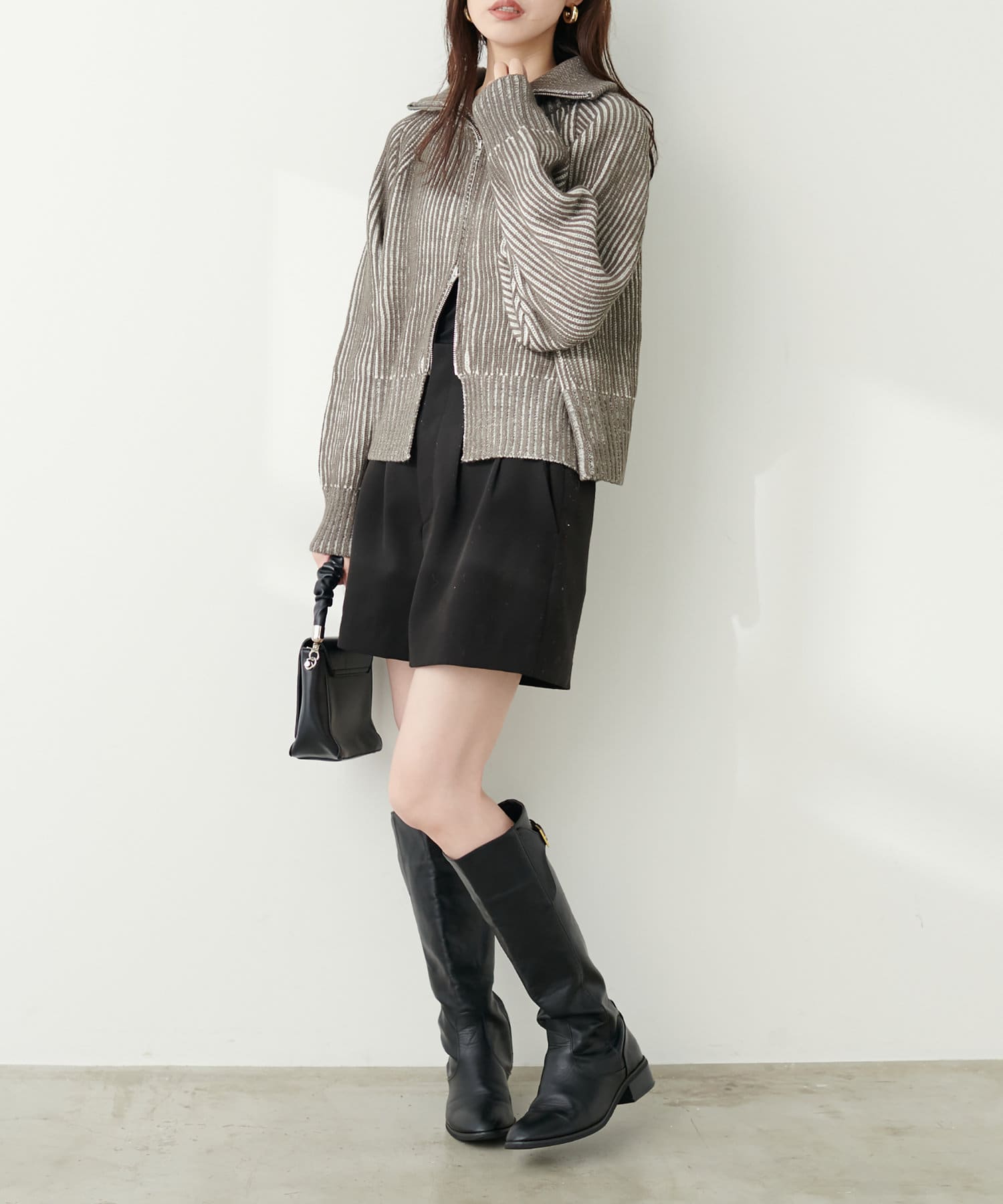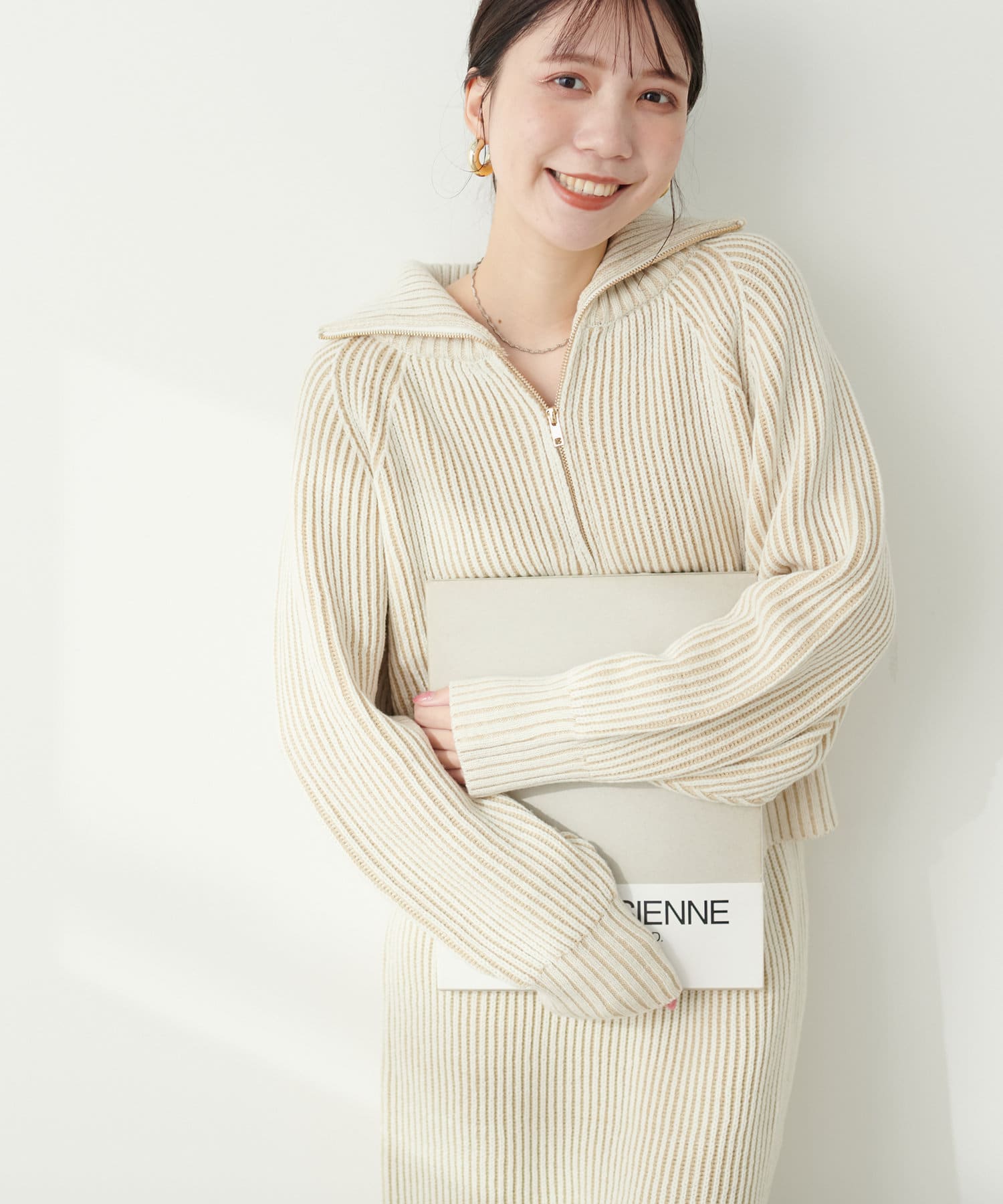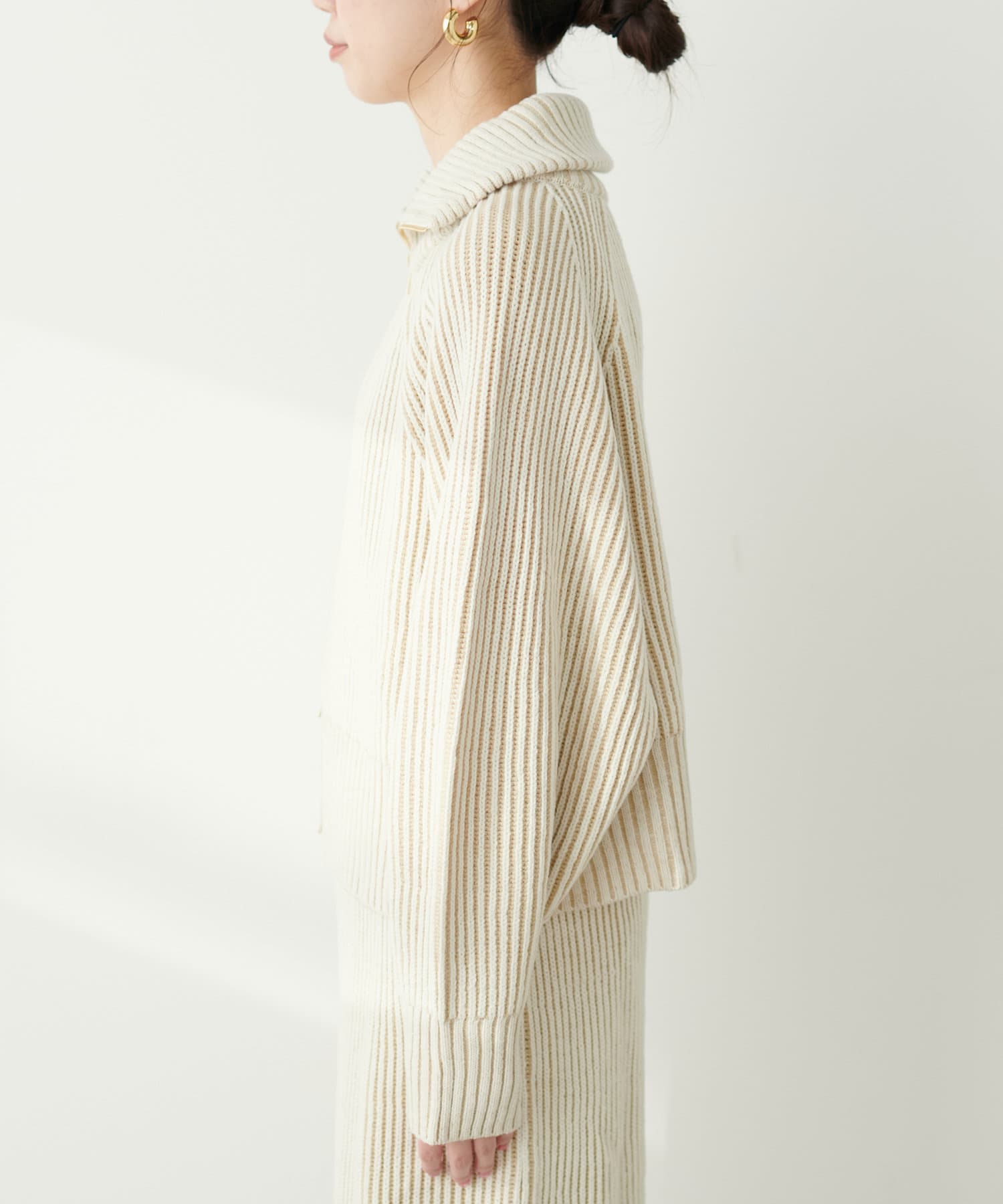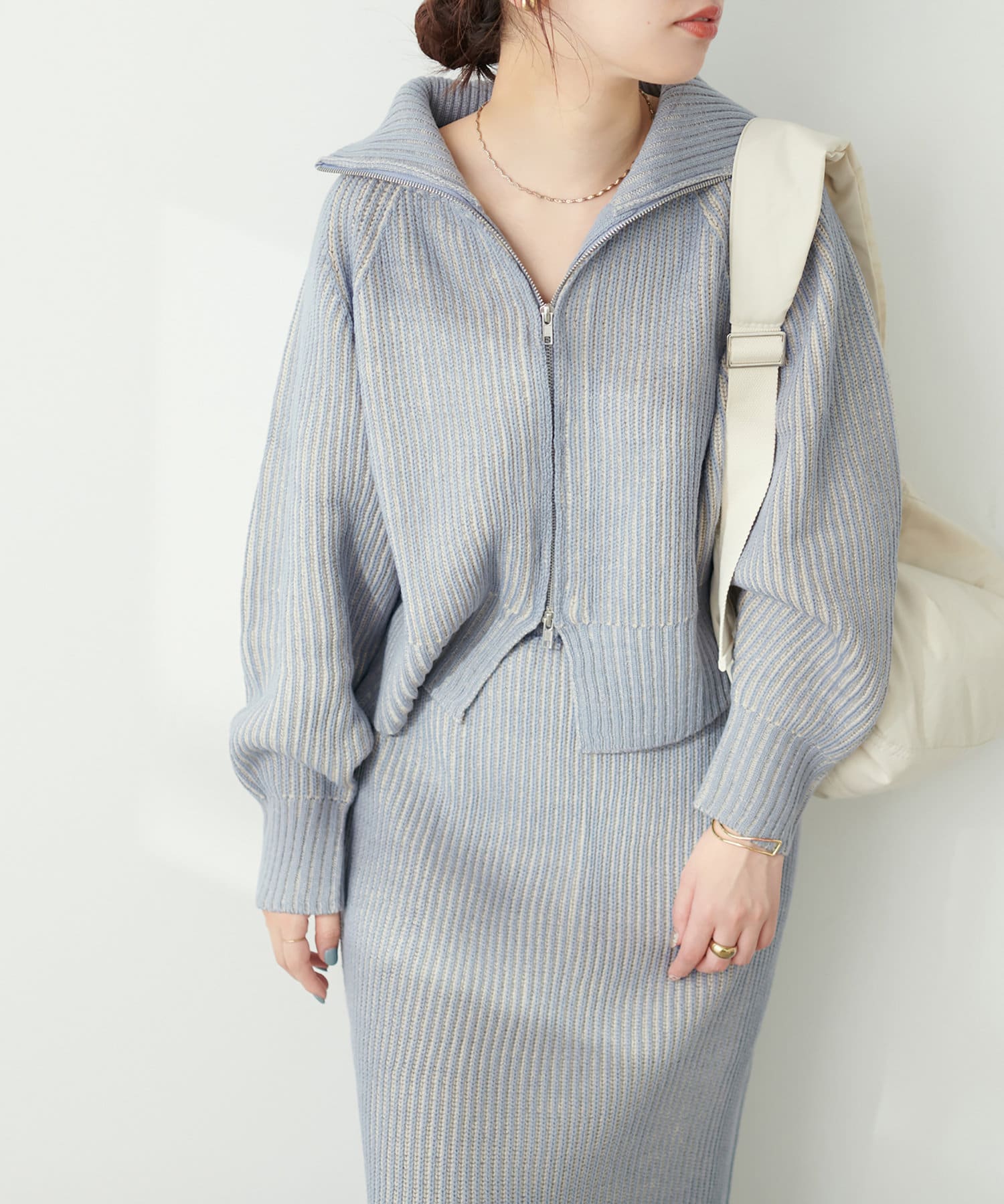 また、ジップを胸元まで下せば衿付きニットとしてもお楽しみ頂ける1枚。