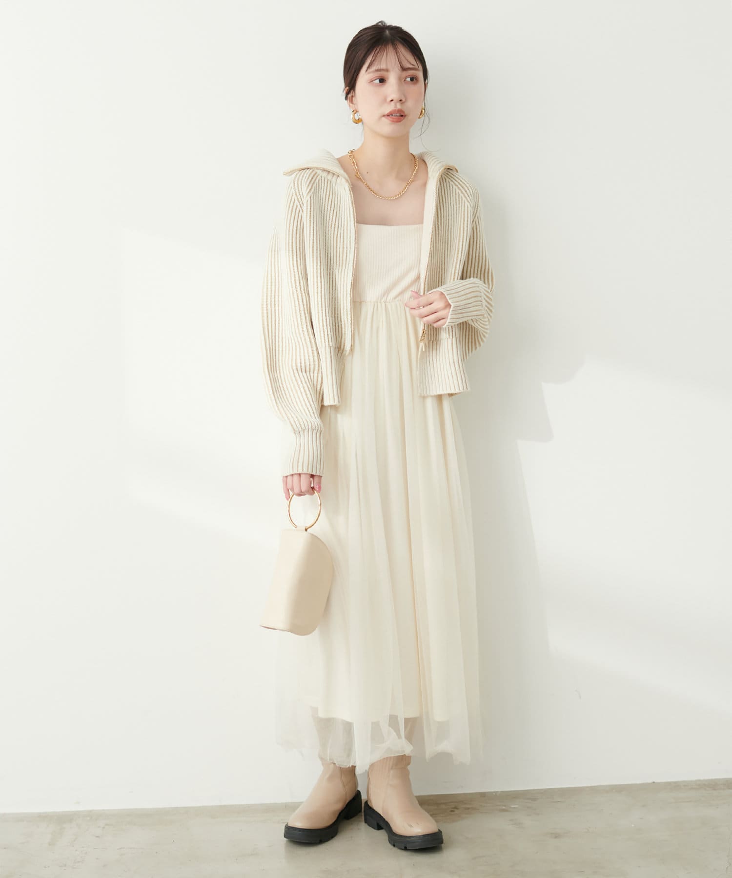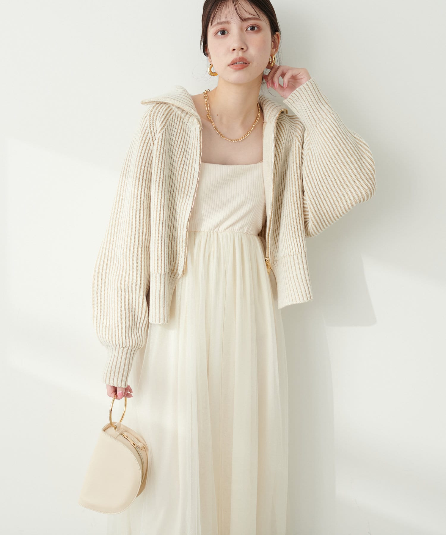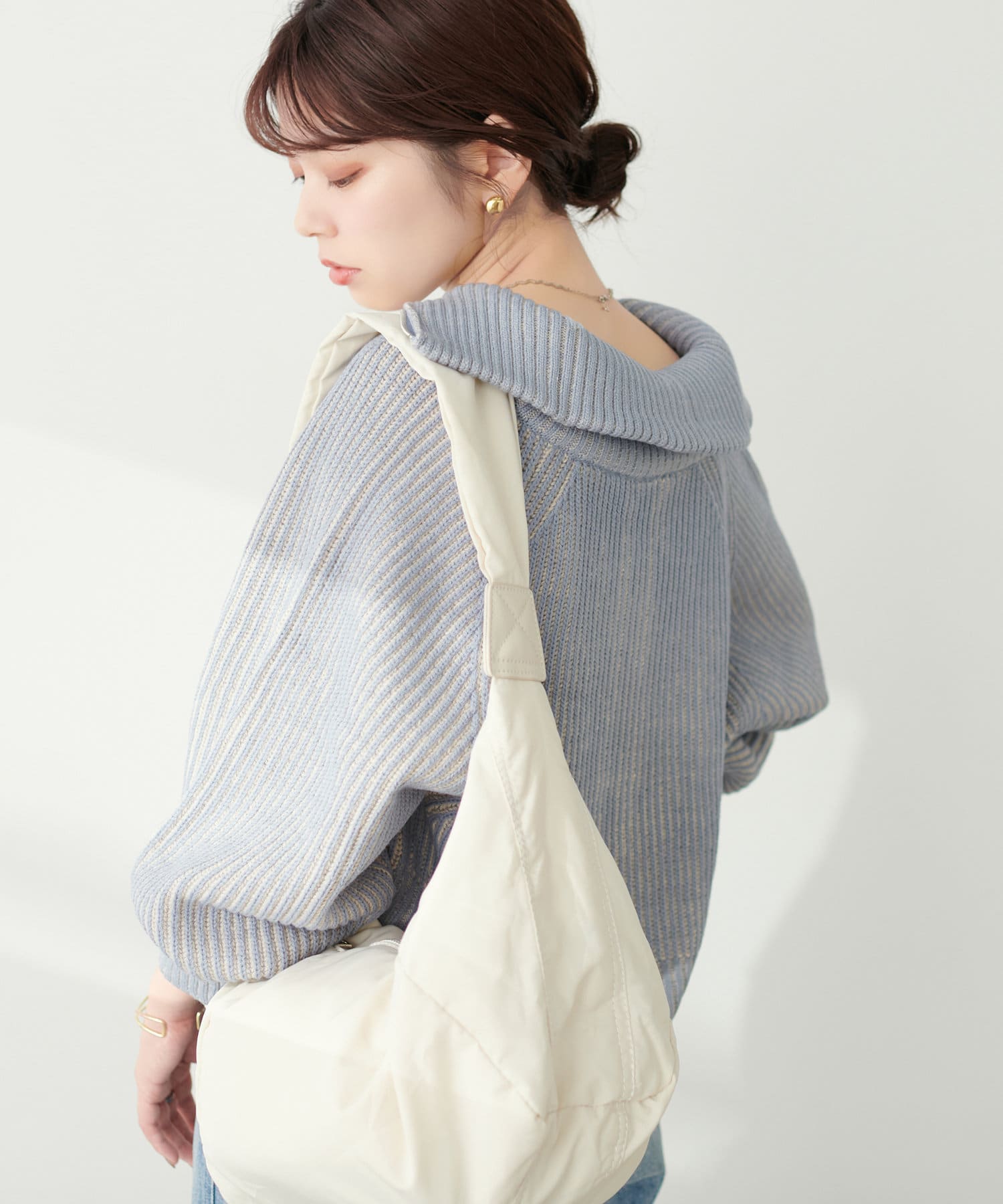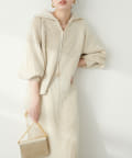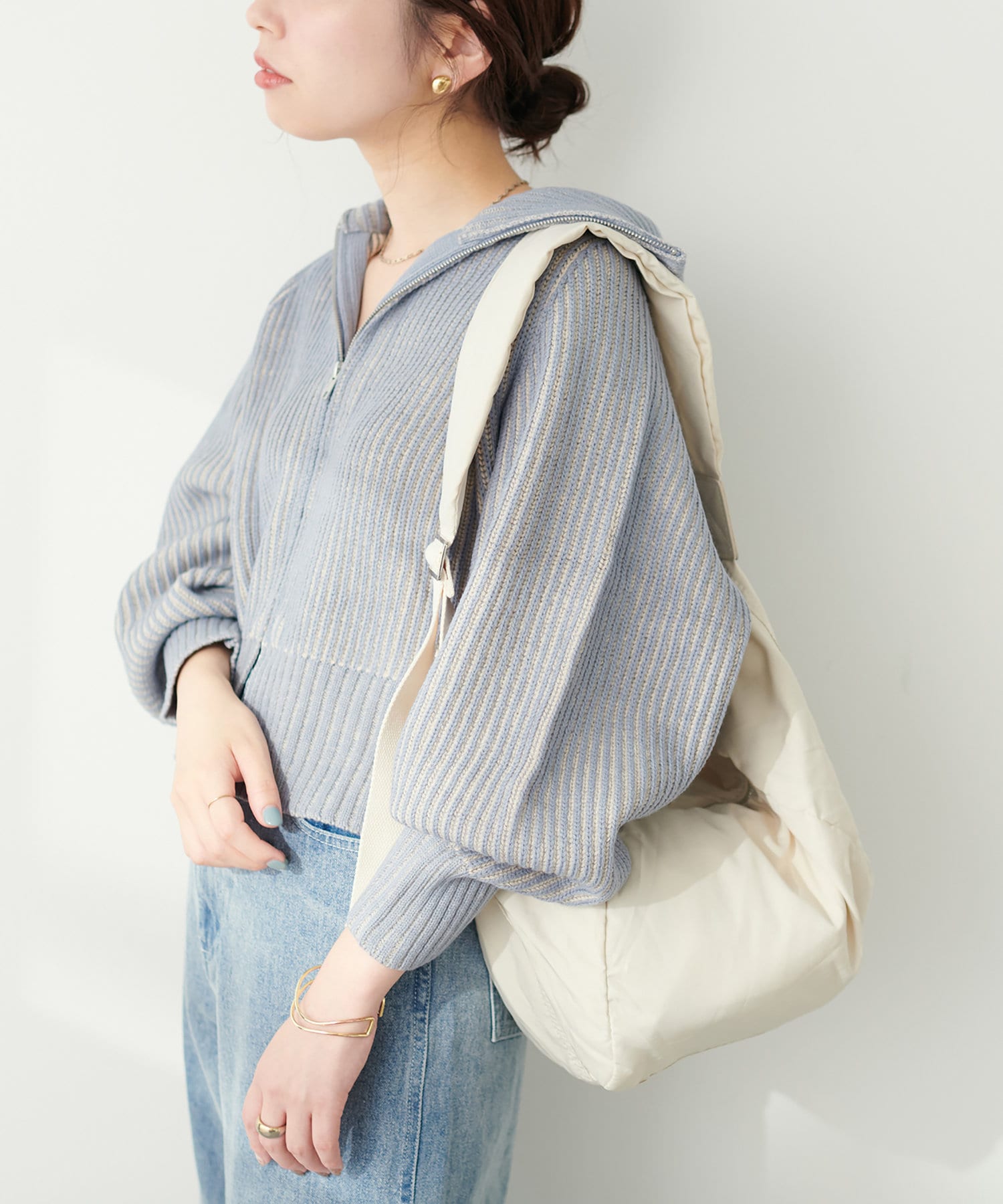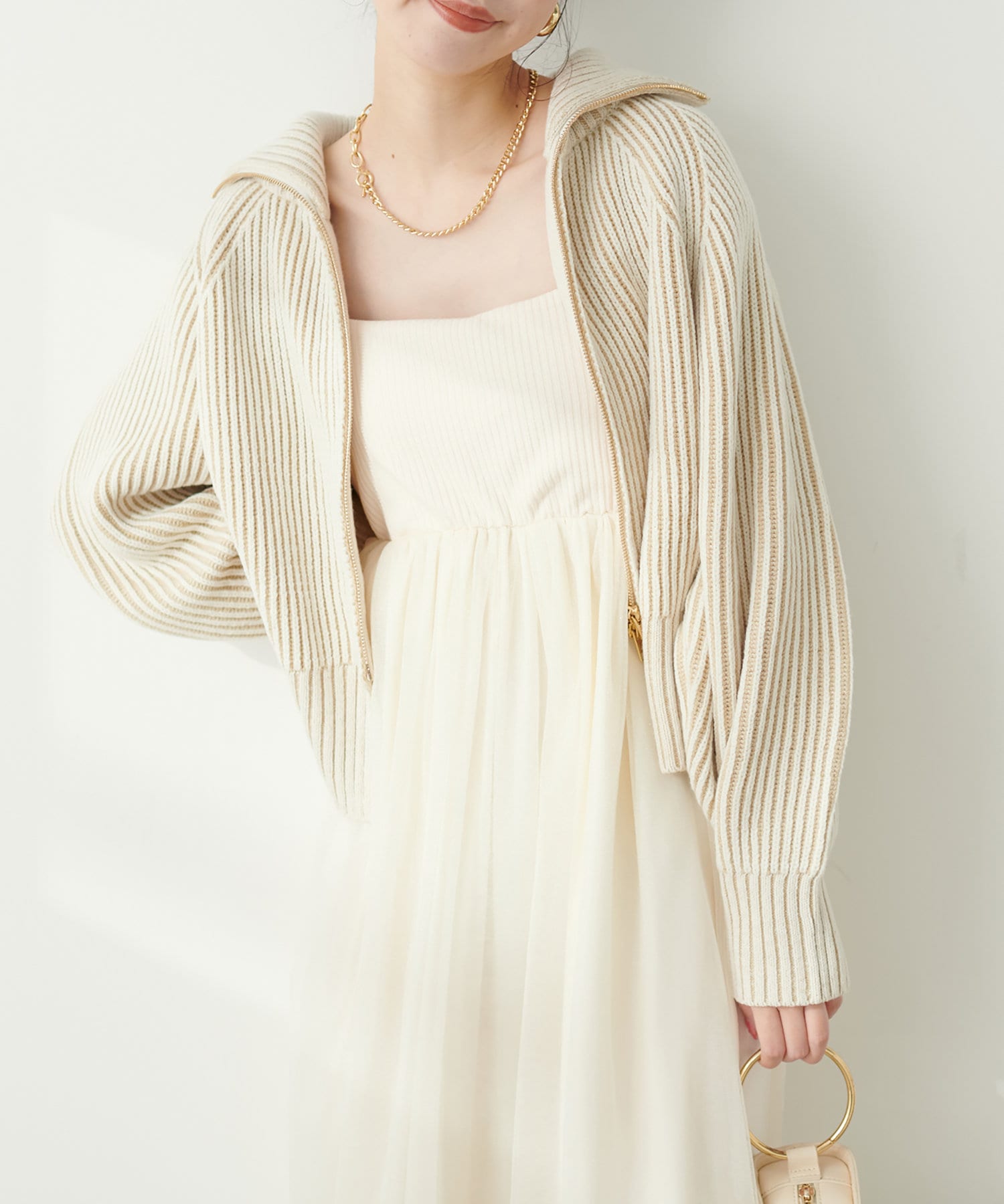 また、ジップを胸元まで下せば衿付きニットとしてもお楽しみ頂ける1枚。