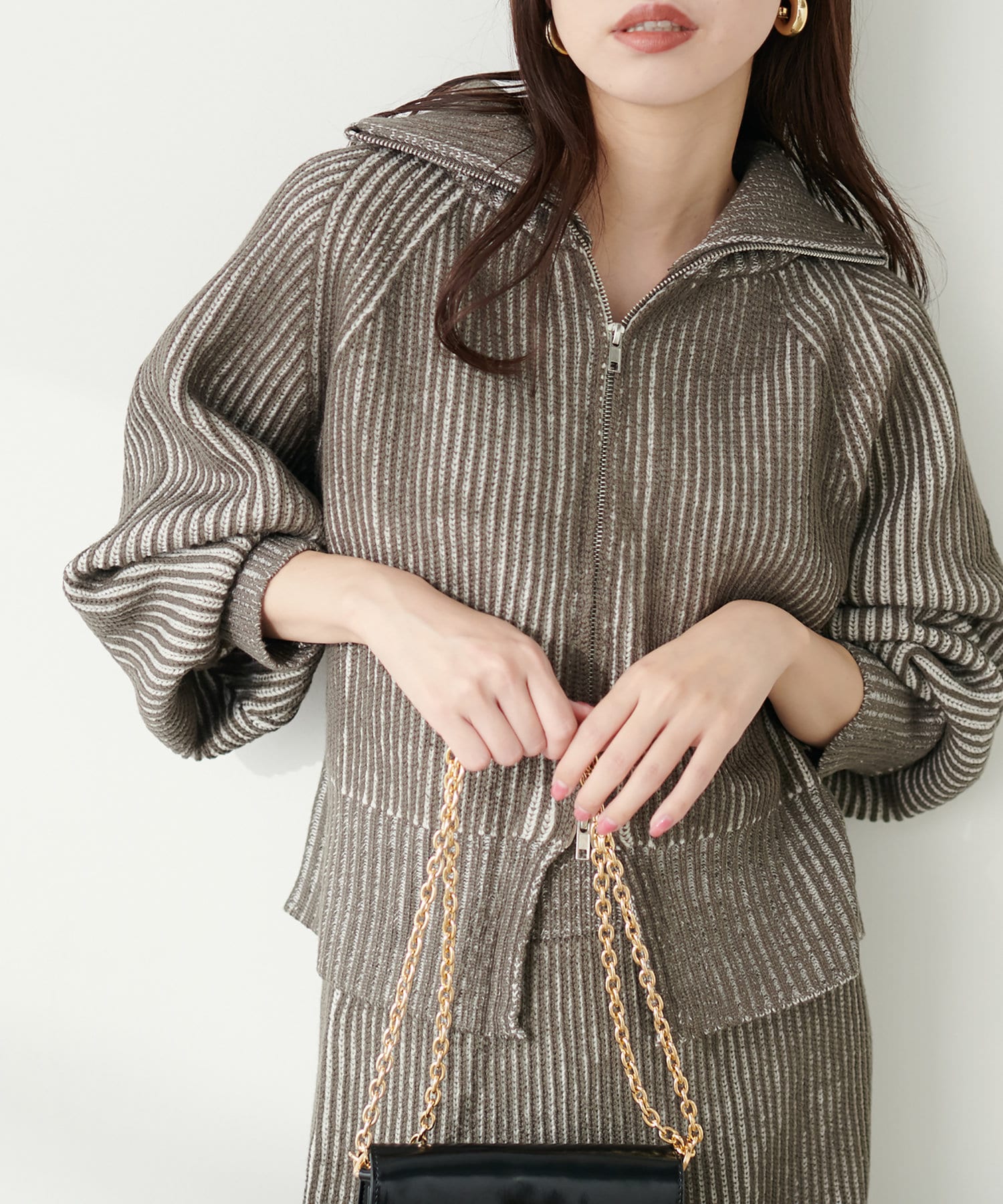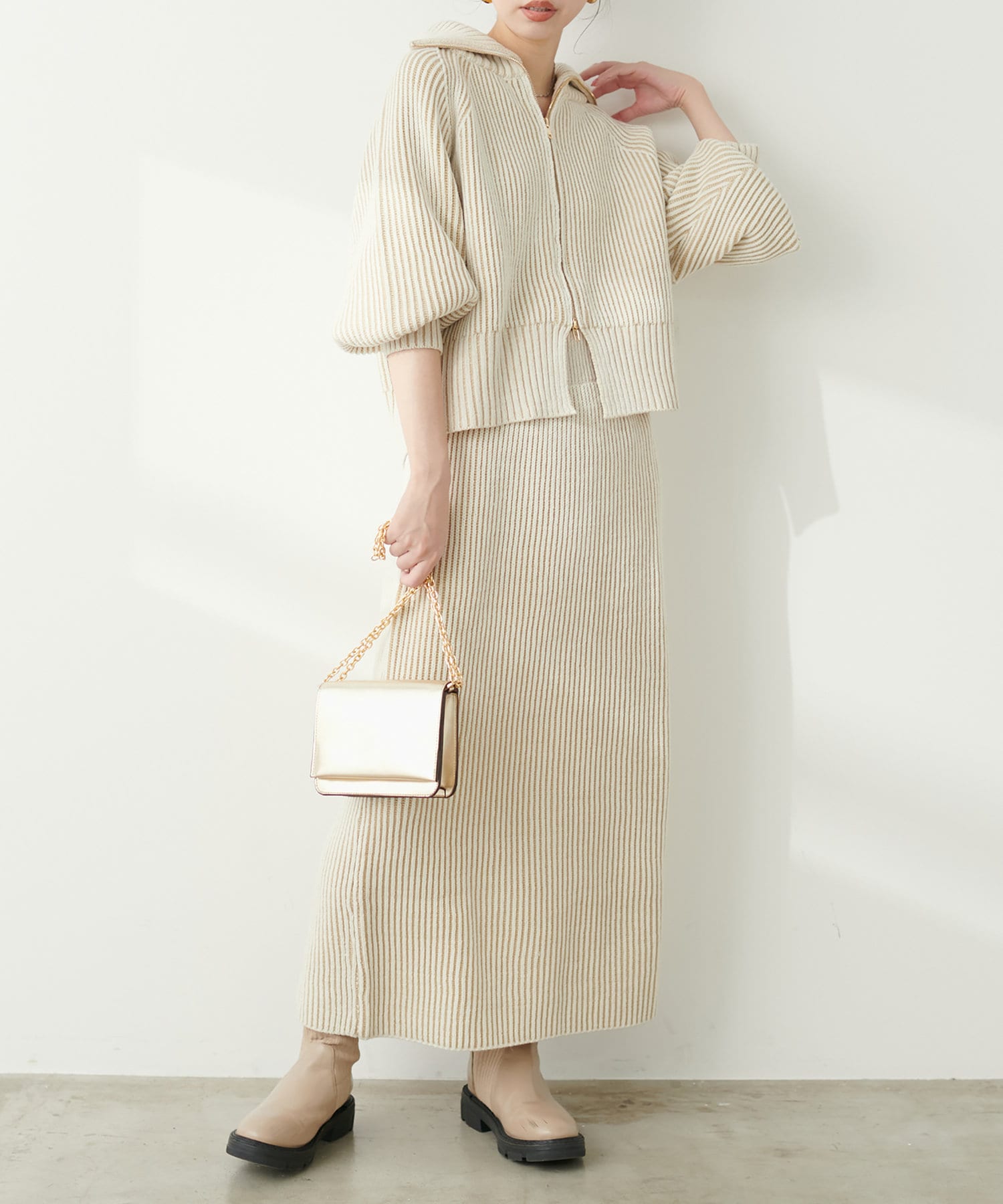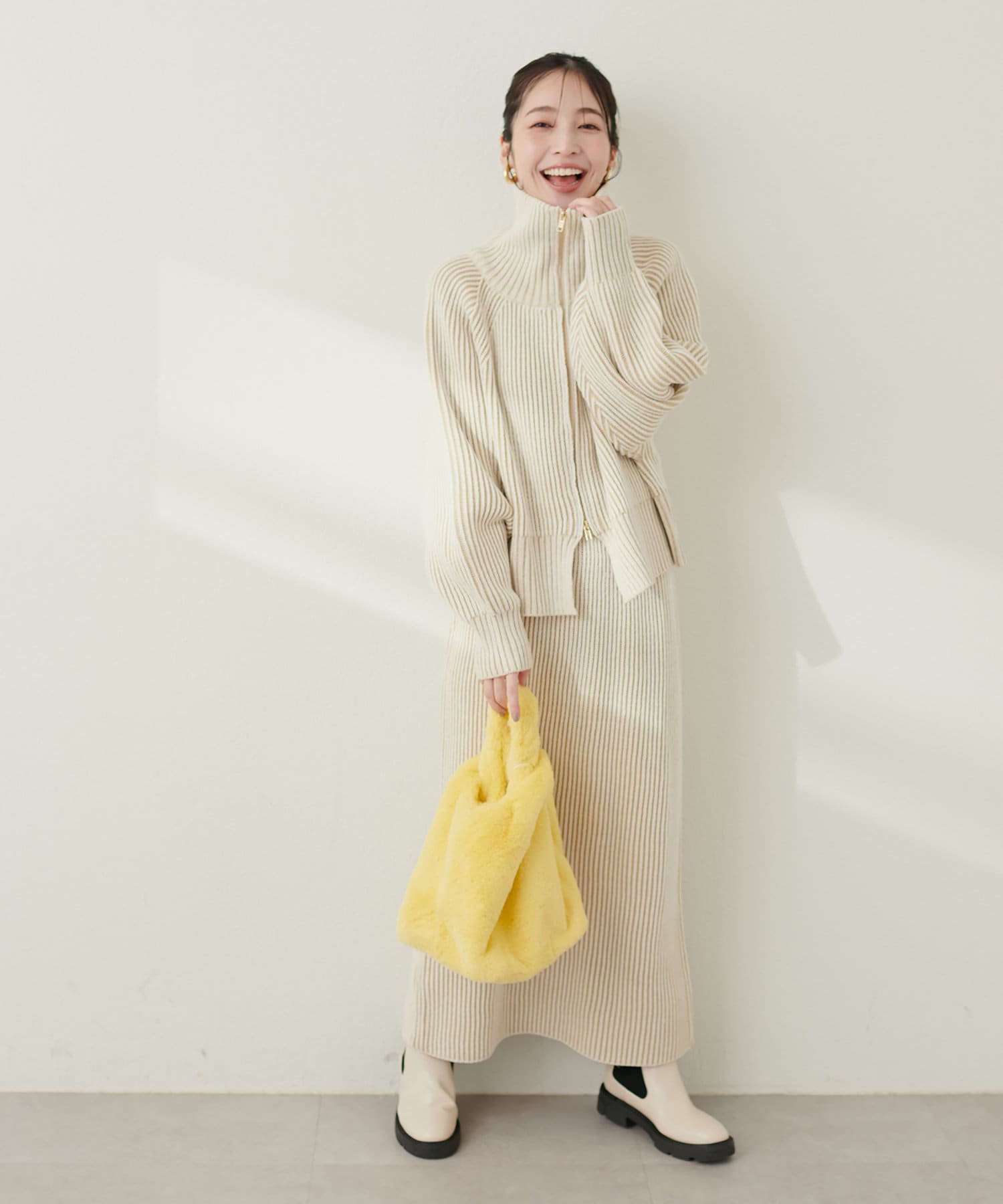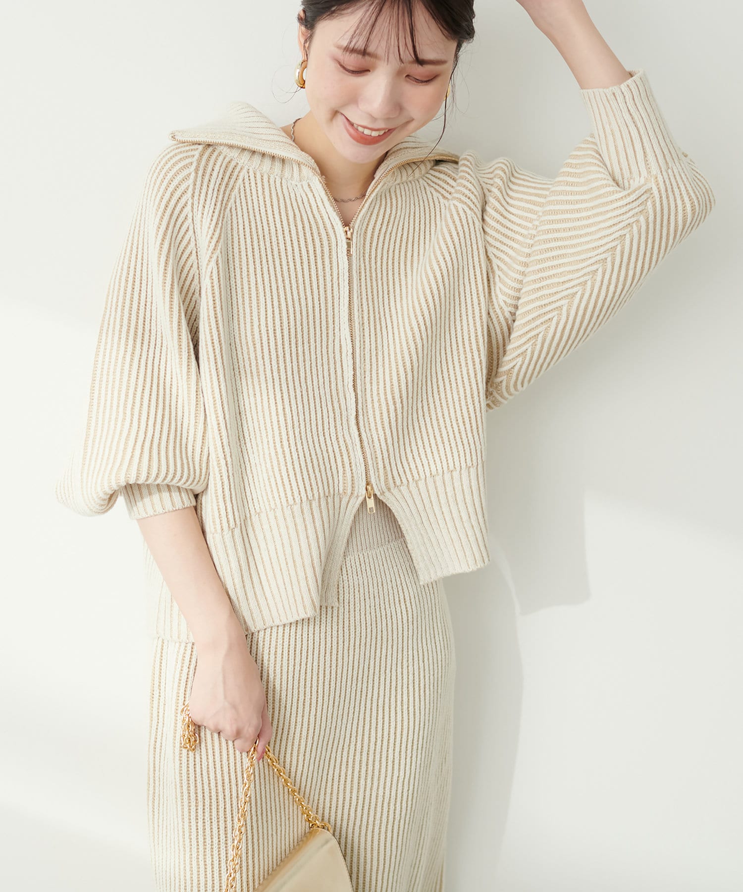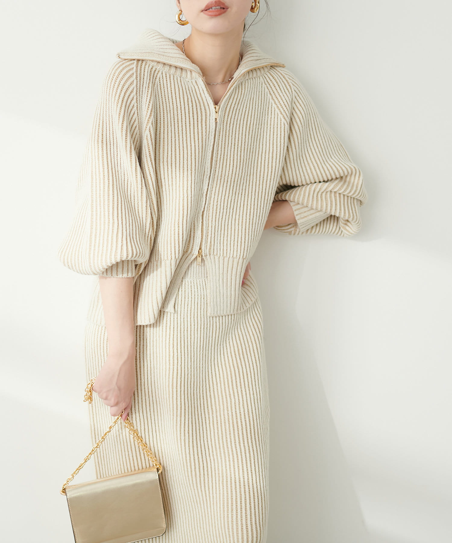 シリーズの両畦ストライプタイトスカートと合わせてセットアップでお召し頂くと、トレンド感のある大人可愛いコーディネートに。