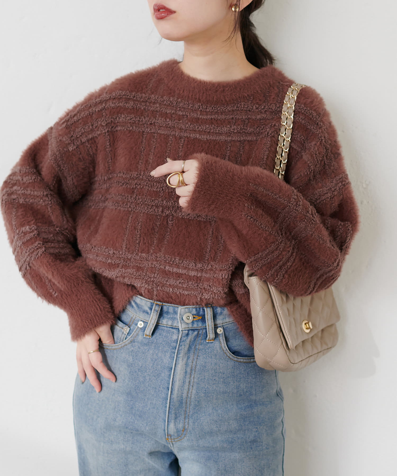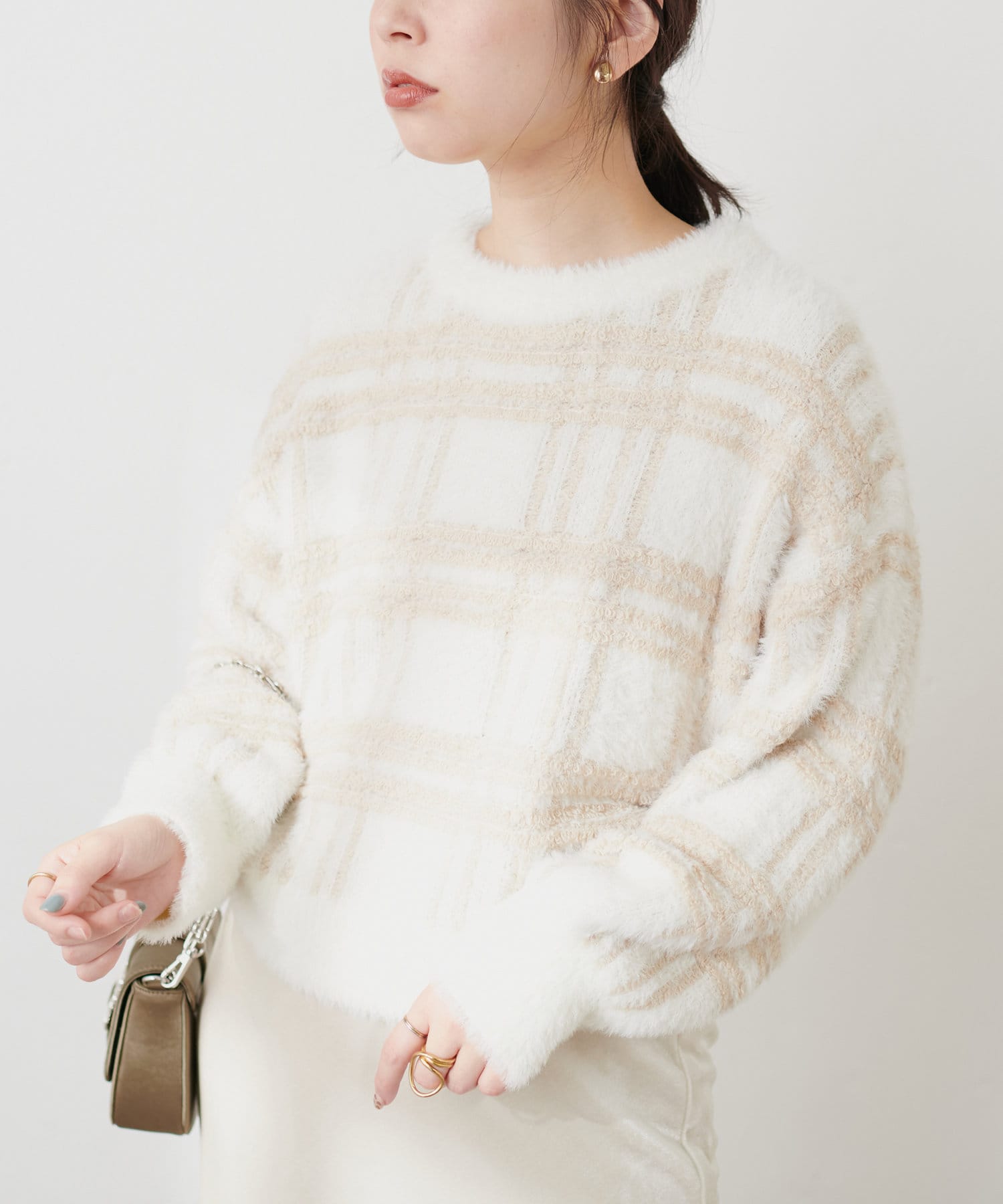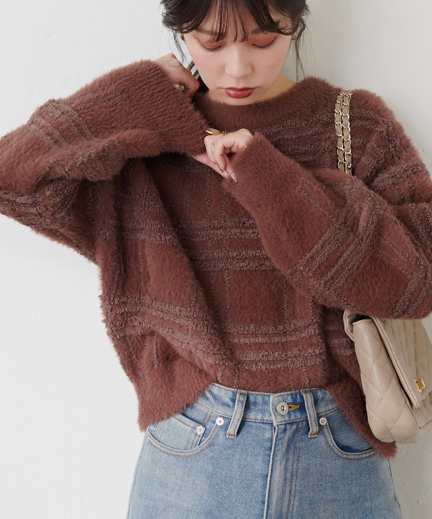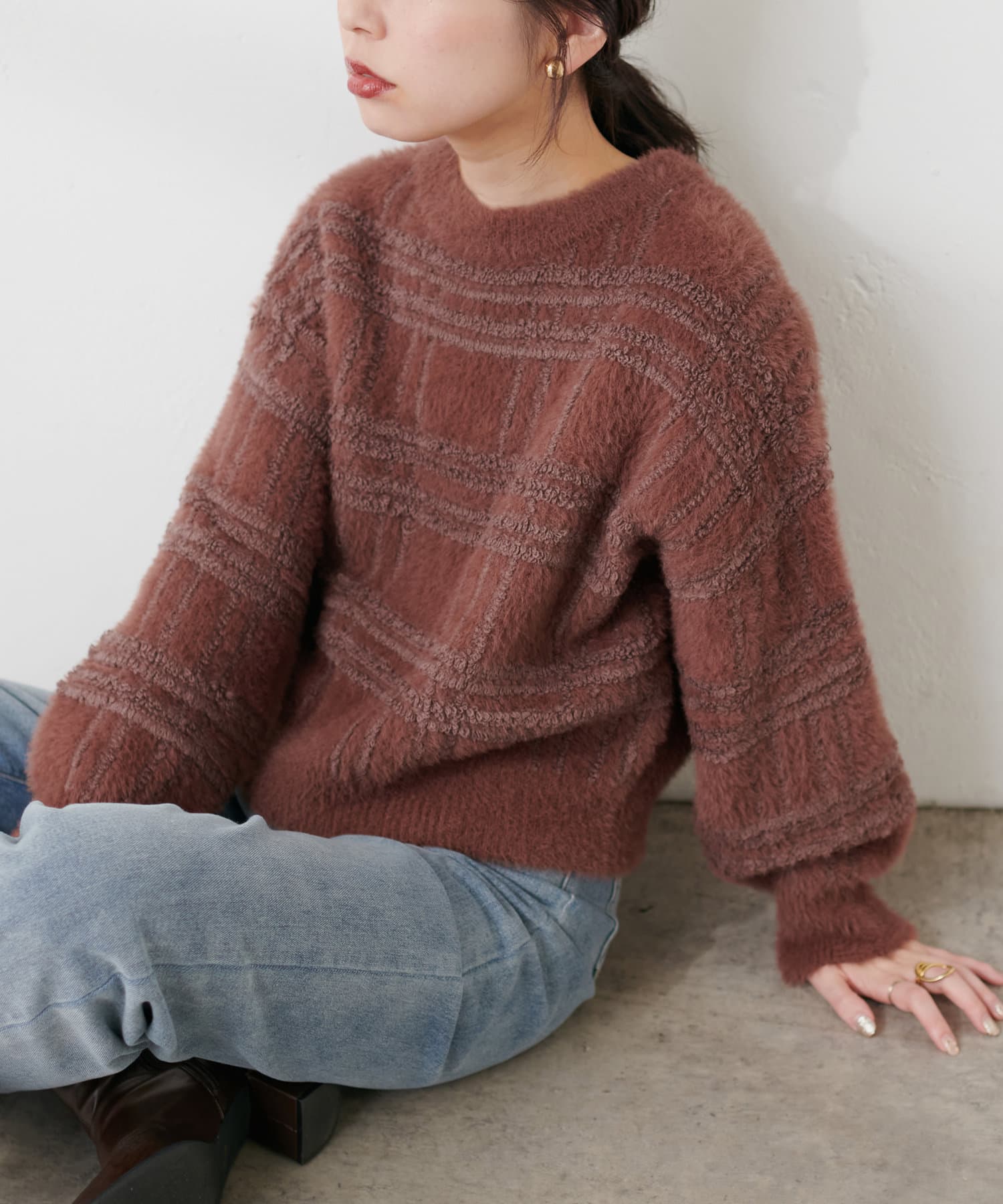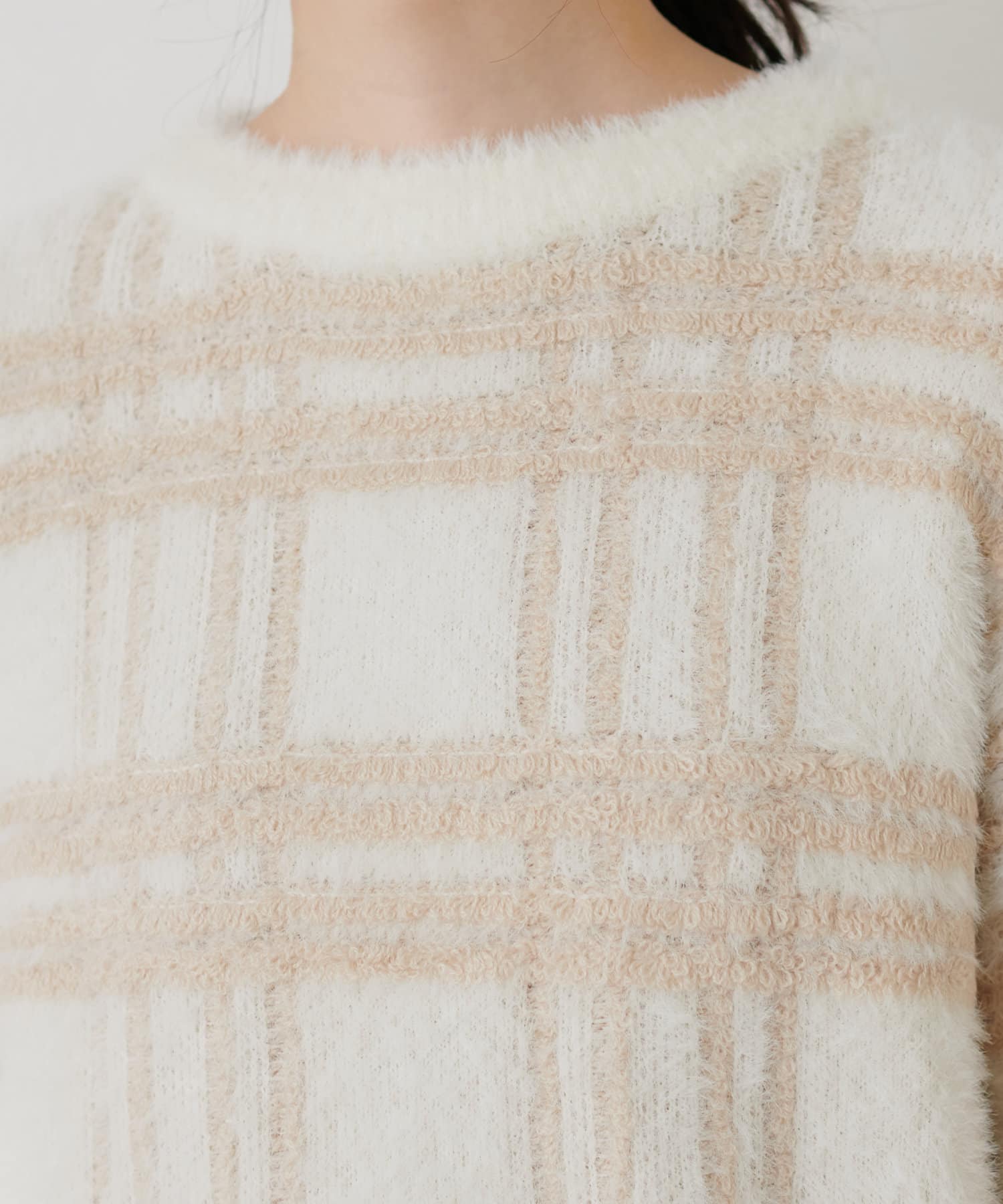 ふわっとした柔らかな起毛のフェザーニットに、ループ状に編んでフリンジ見えするラインチェックが目を惹く1枚。