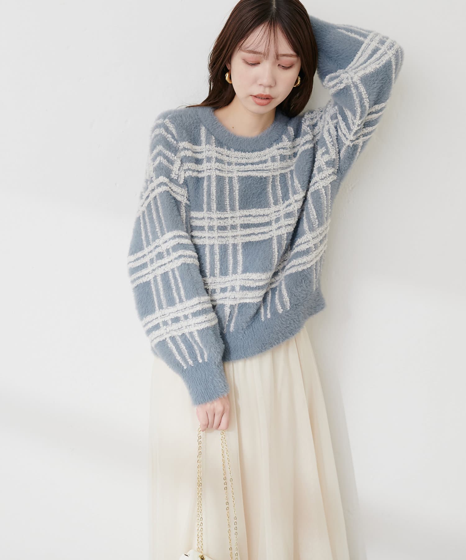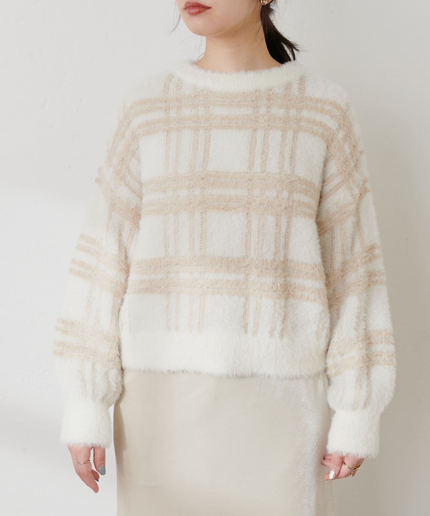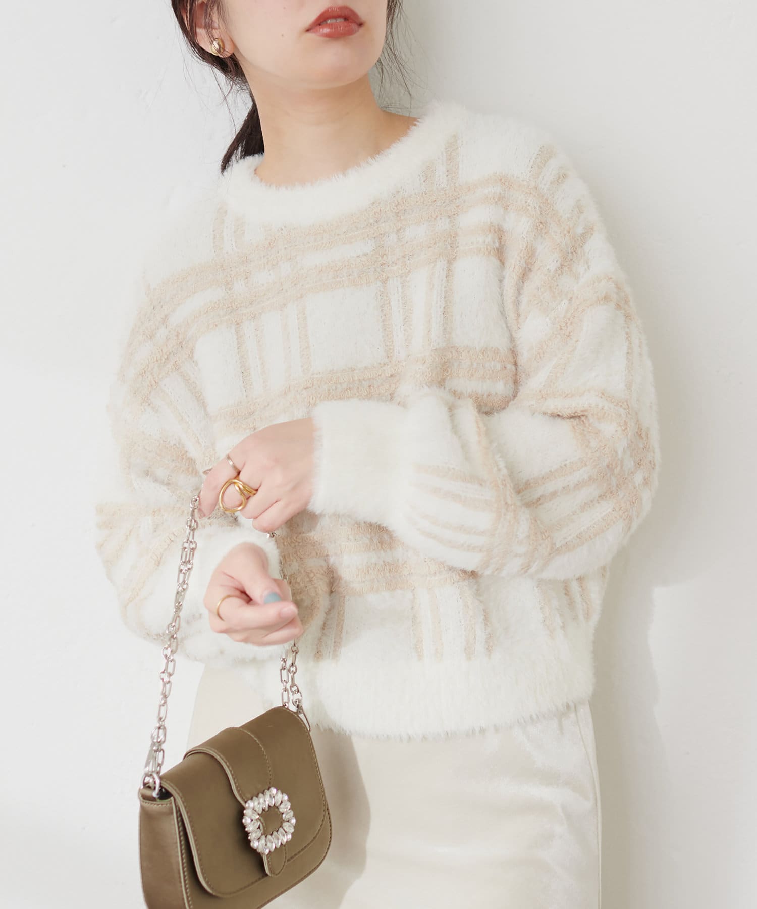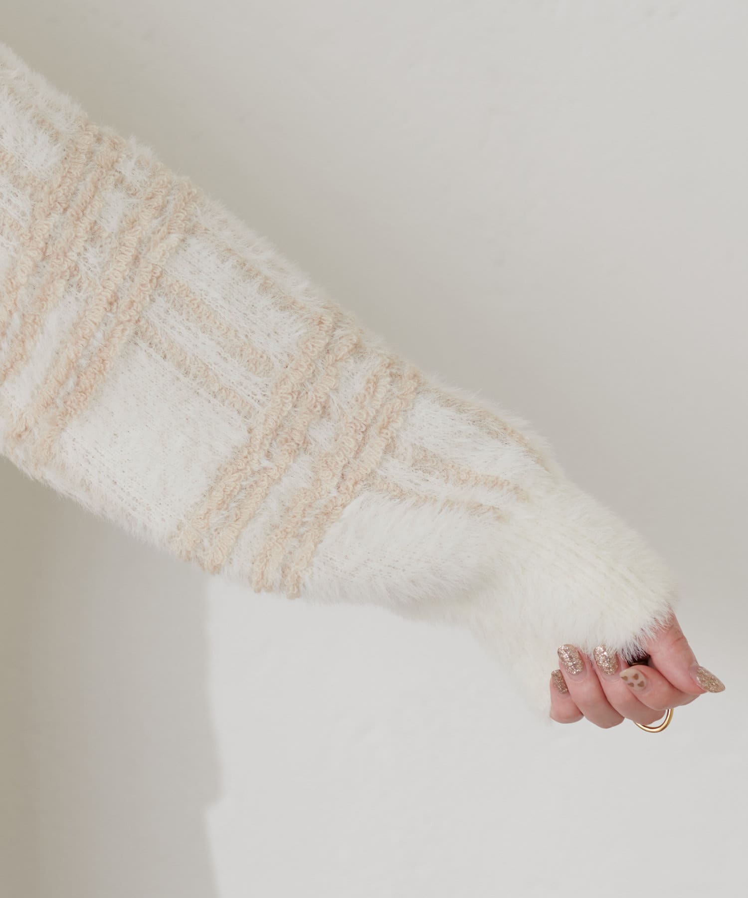 ふわっとした柔らかな起毛のフェザーニットに、ループ状に編んでフリンジ見えするラインチェックが目を惹く1枚。
