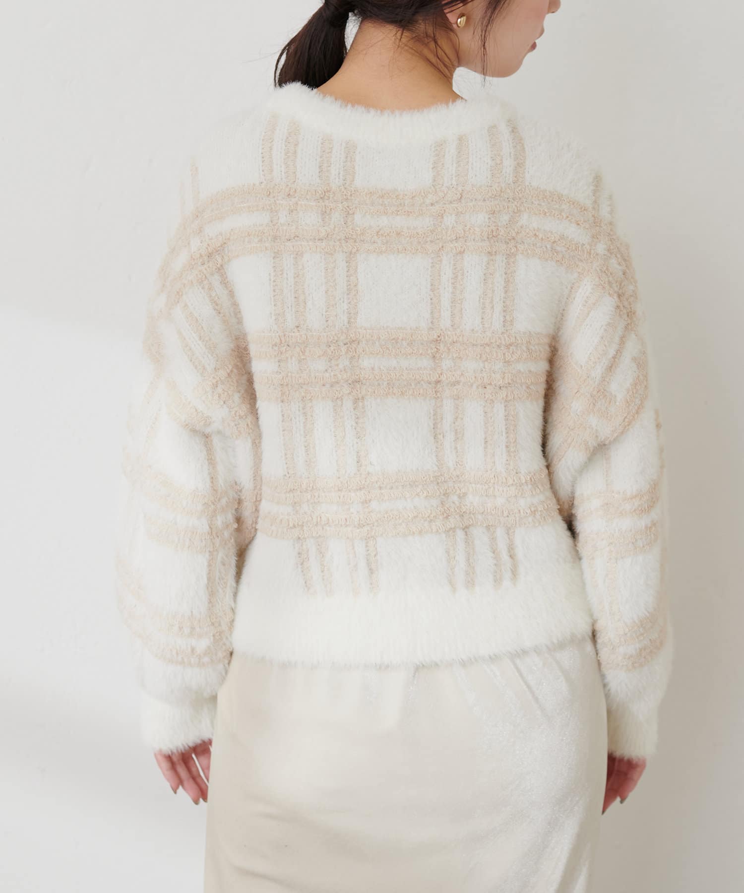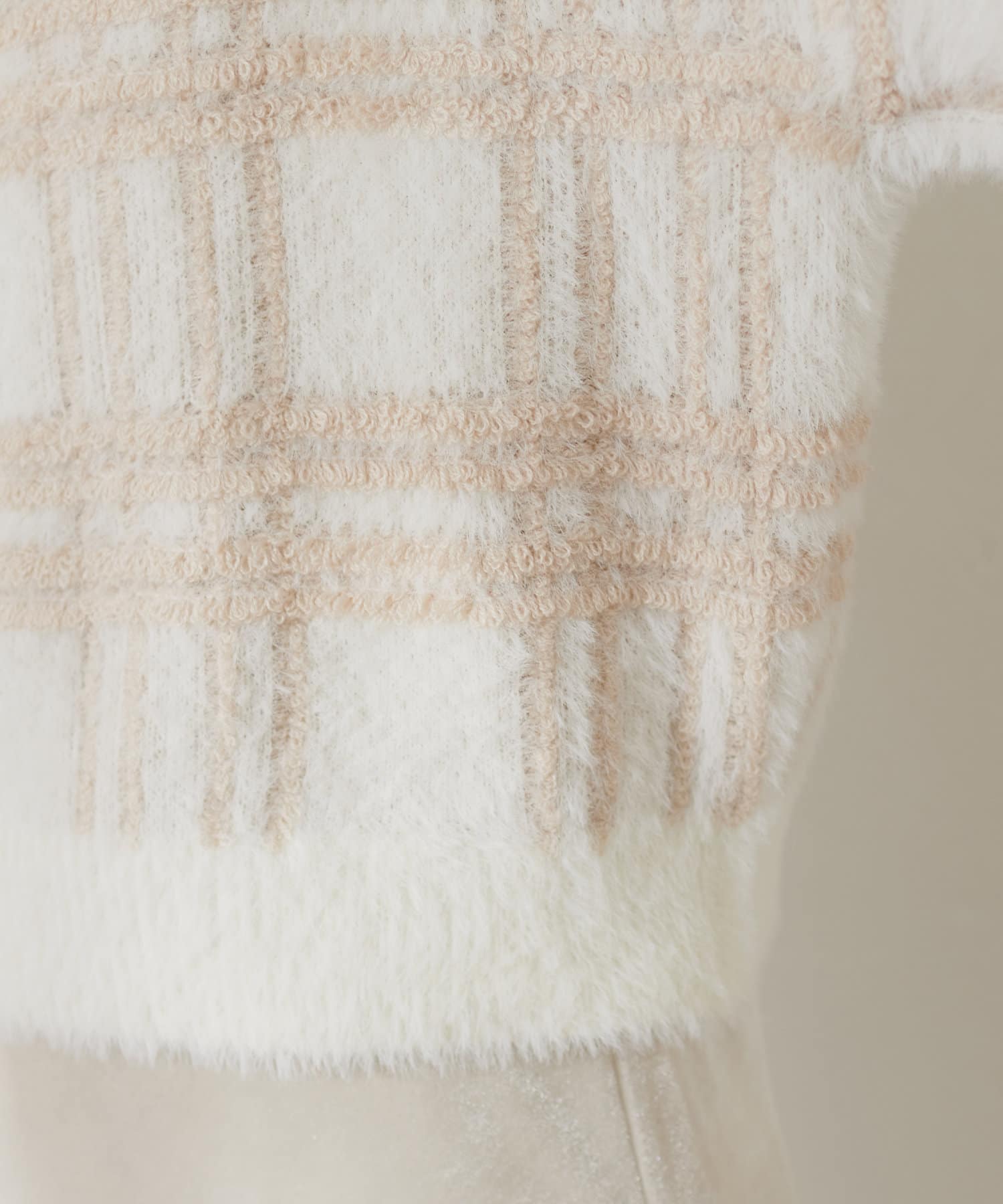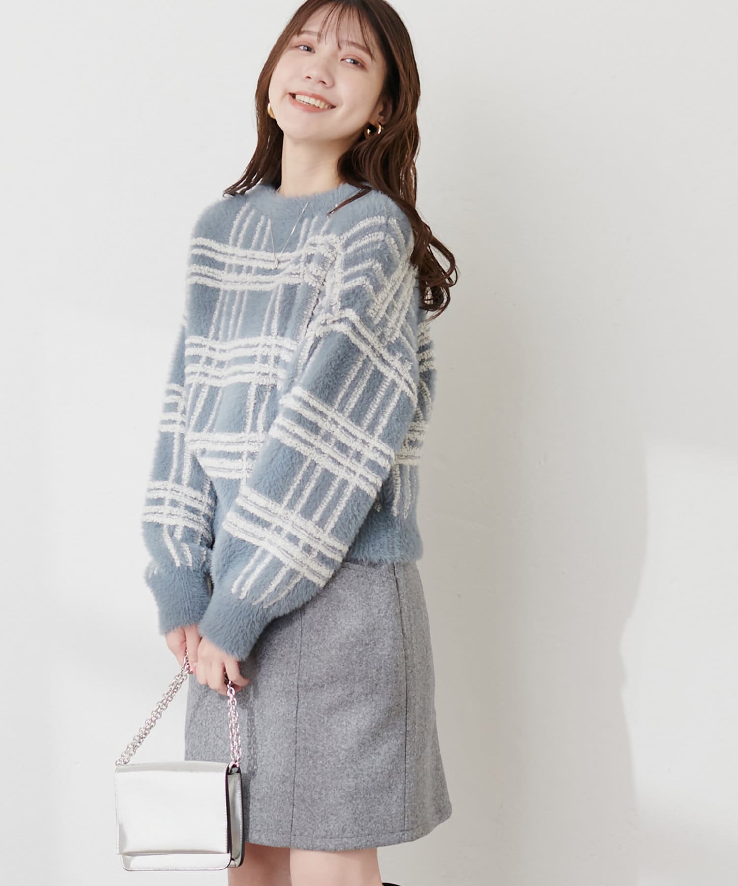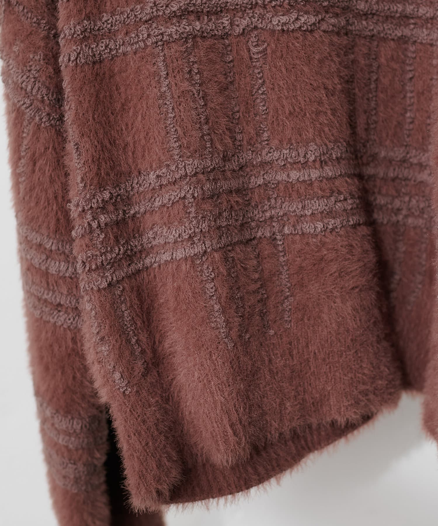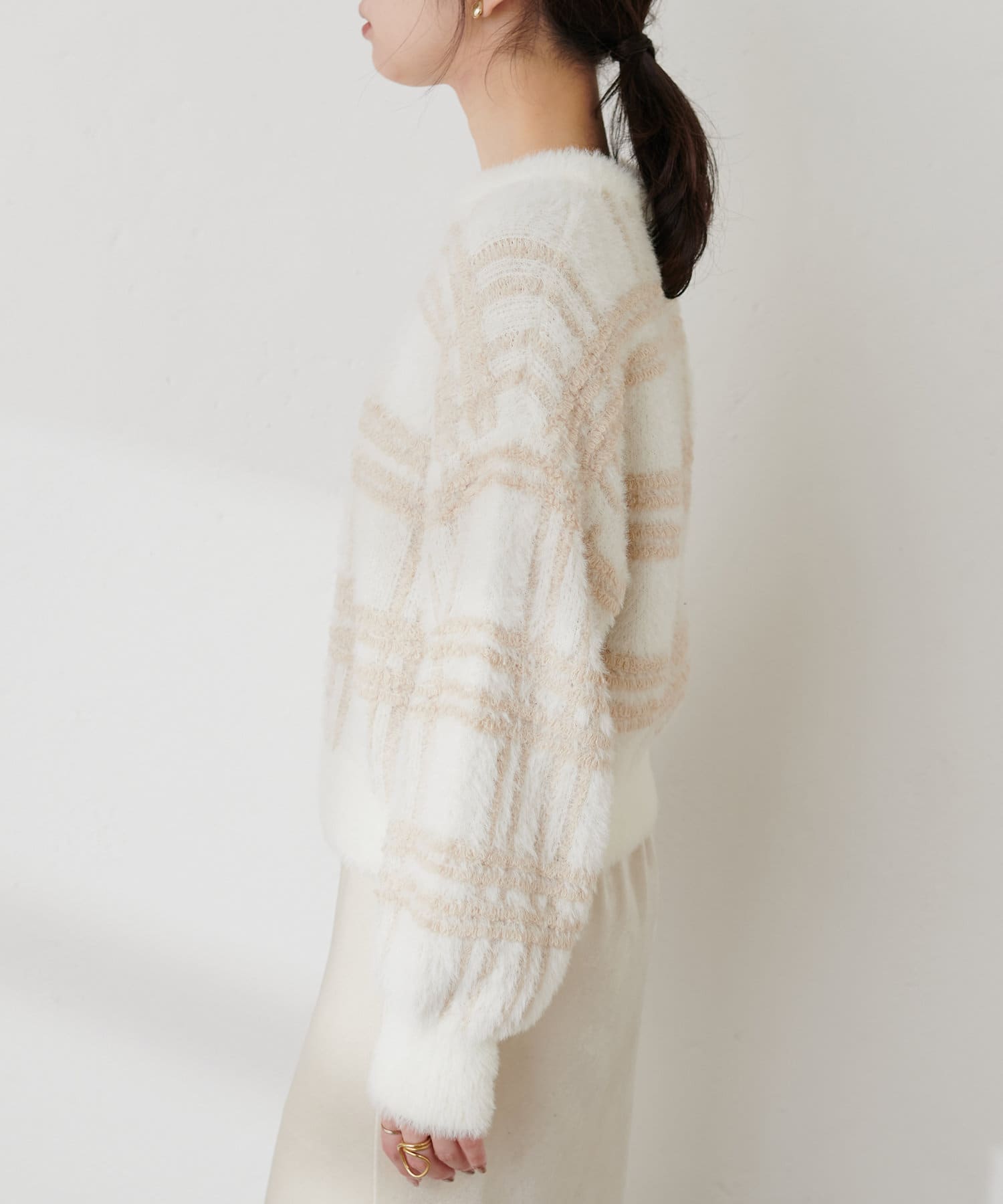 ふわっとした柔らかな起毛のフェザーニットに、ループ状に編んでフリンジ見えするラインチェックが目を惹く1枚。
