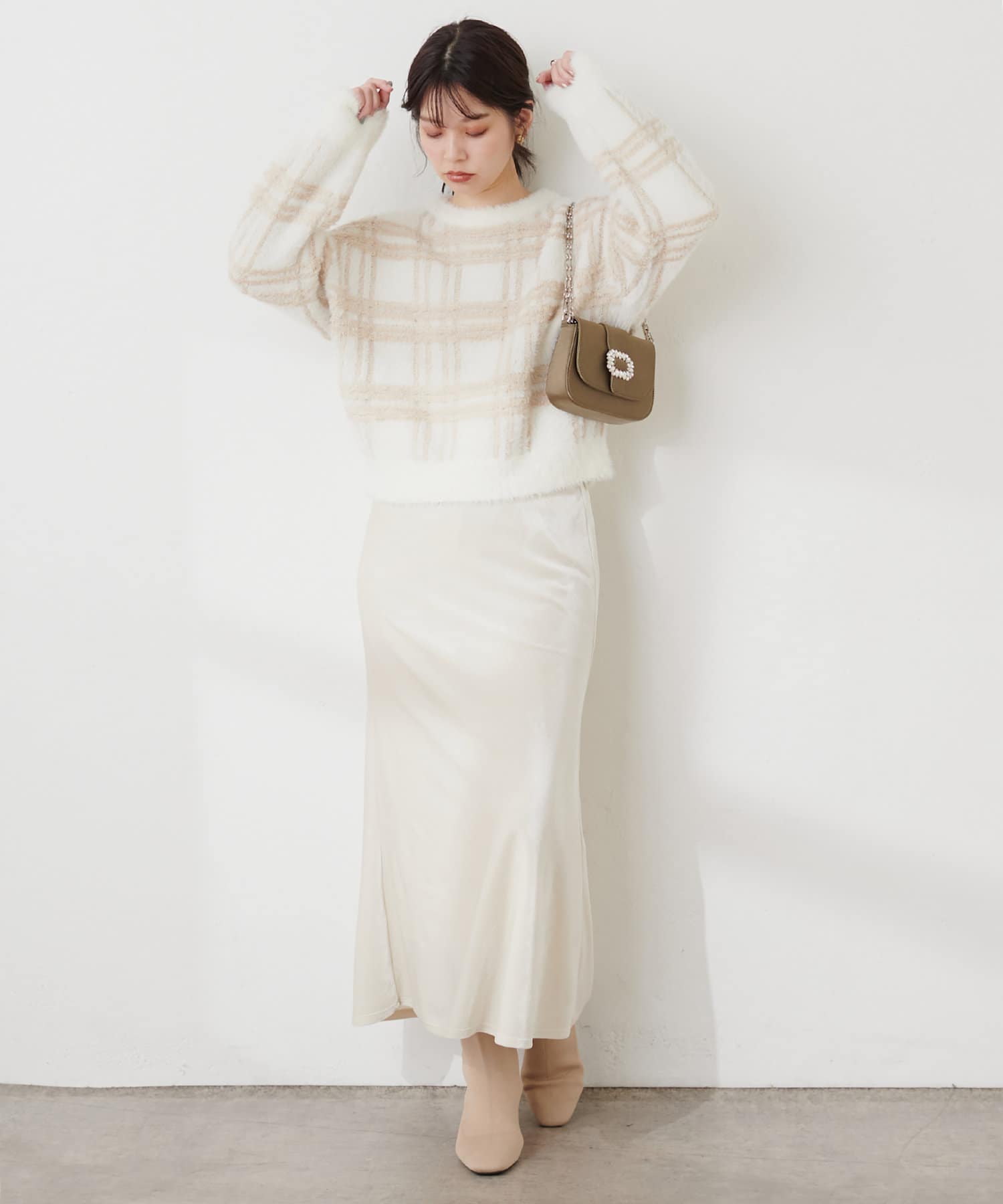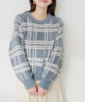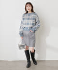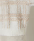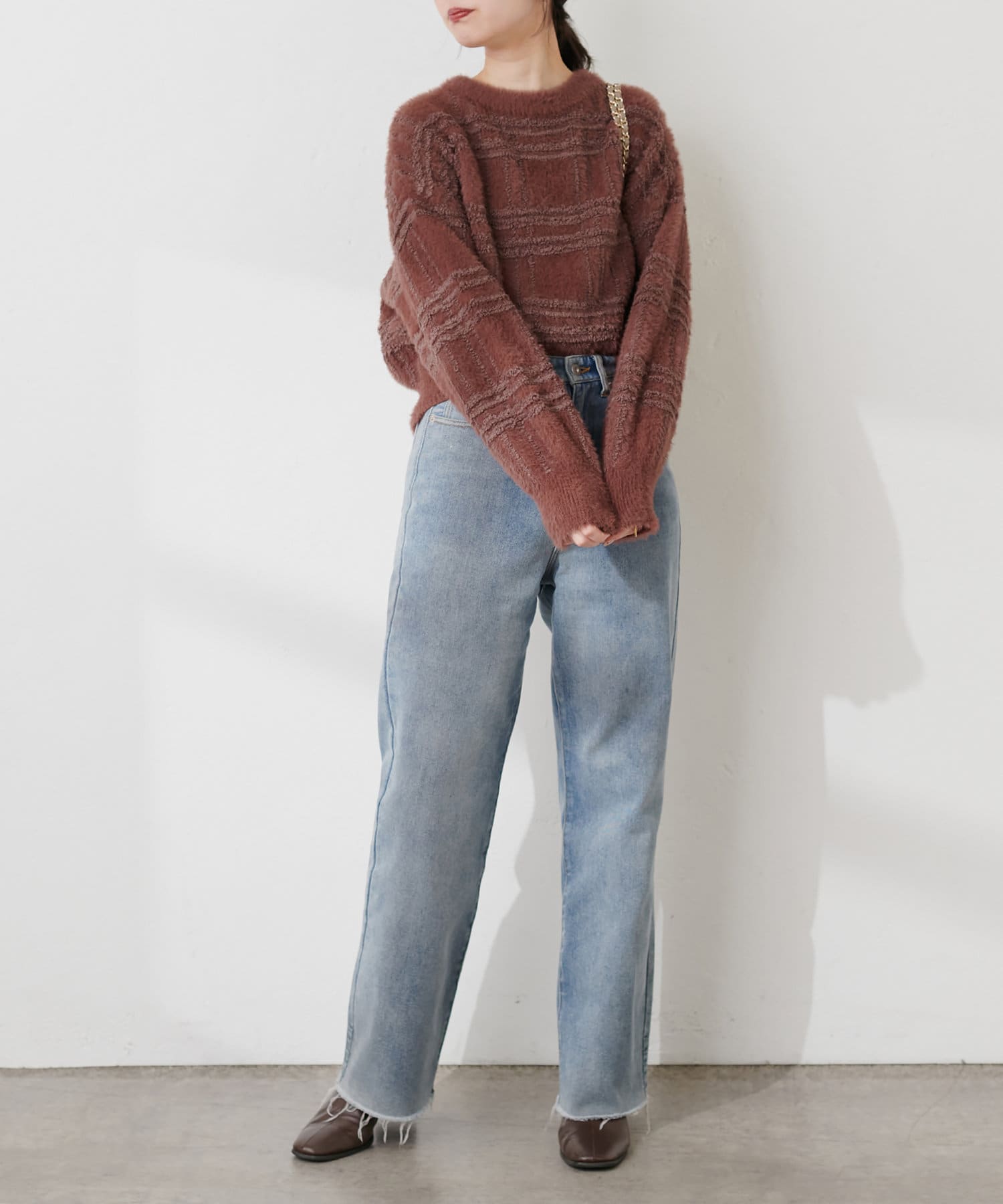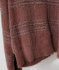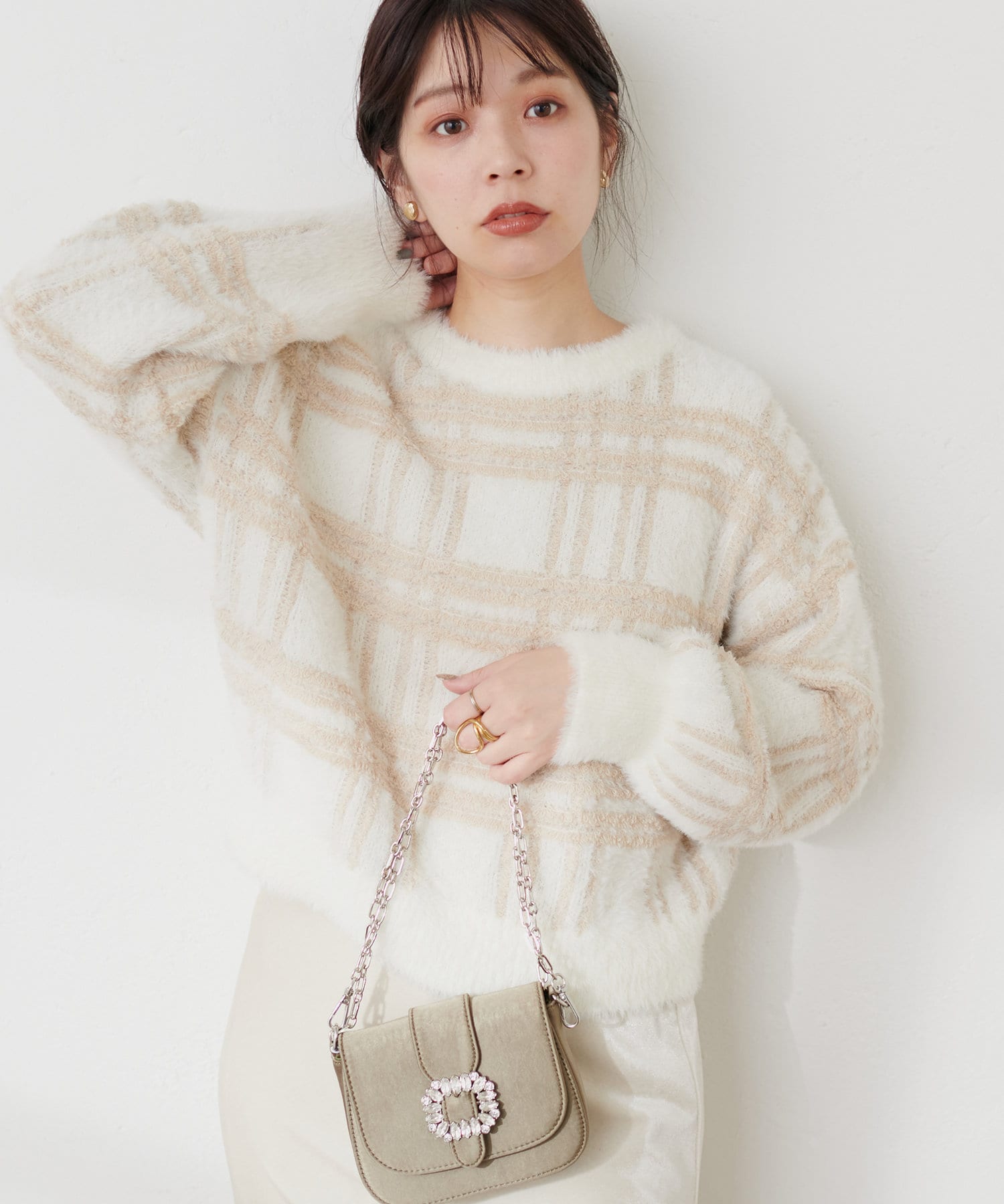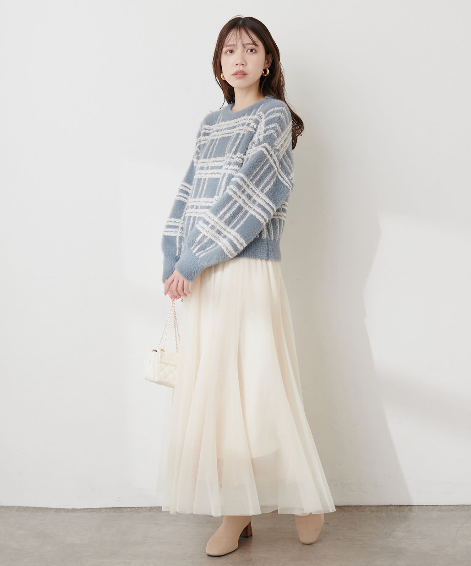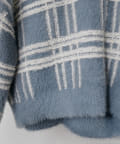 ふわっとした柔らかな起毛のフェザーニットに、ループ状に編んでフリンジ見えするラインチェックが目を惹く1枚。