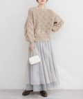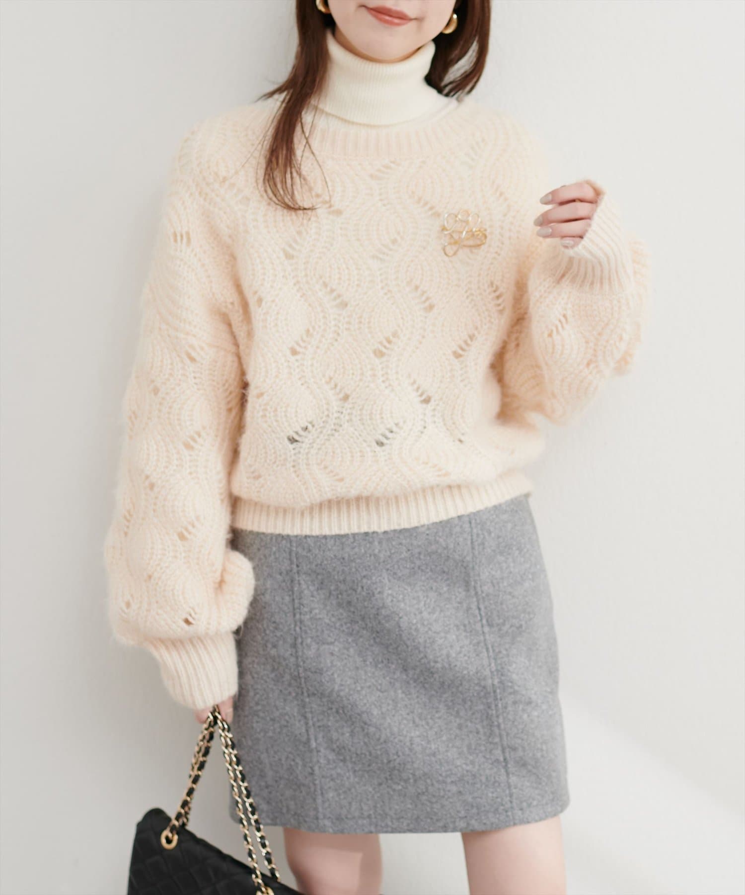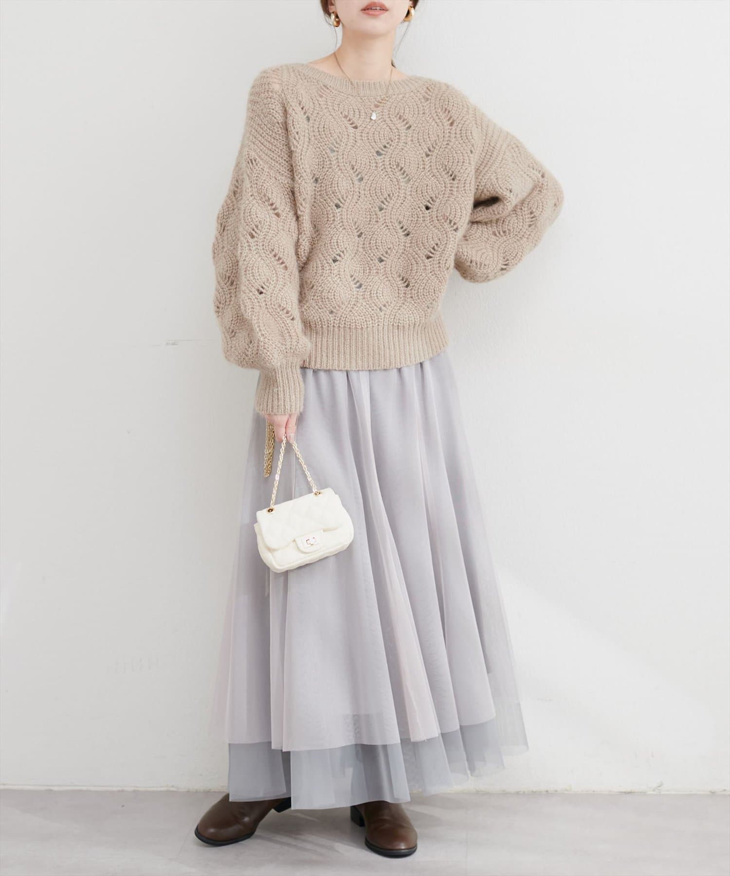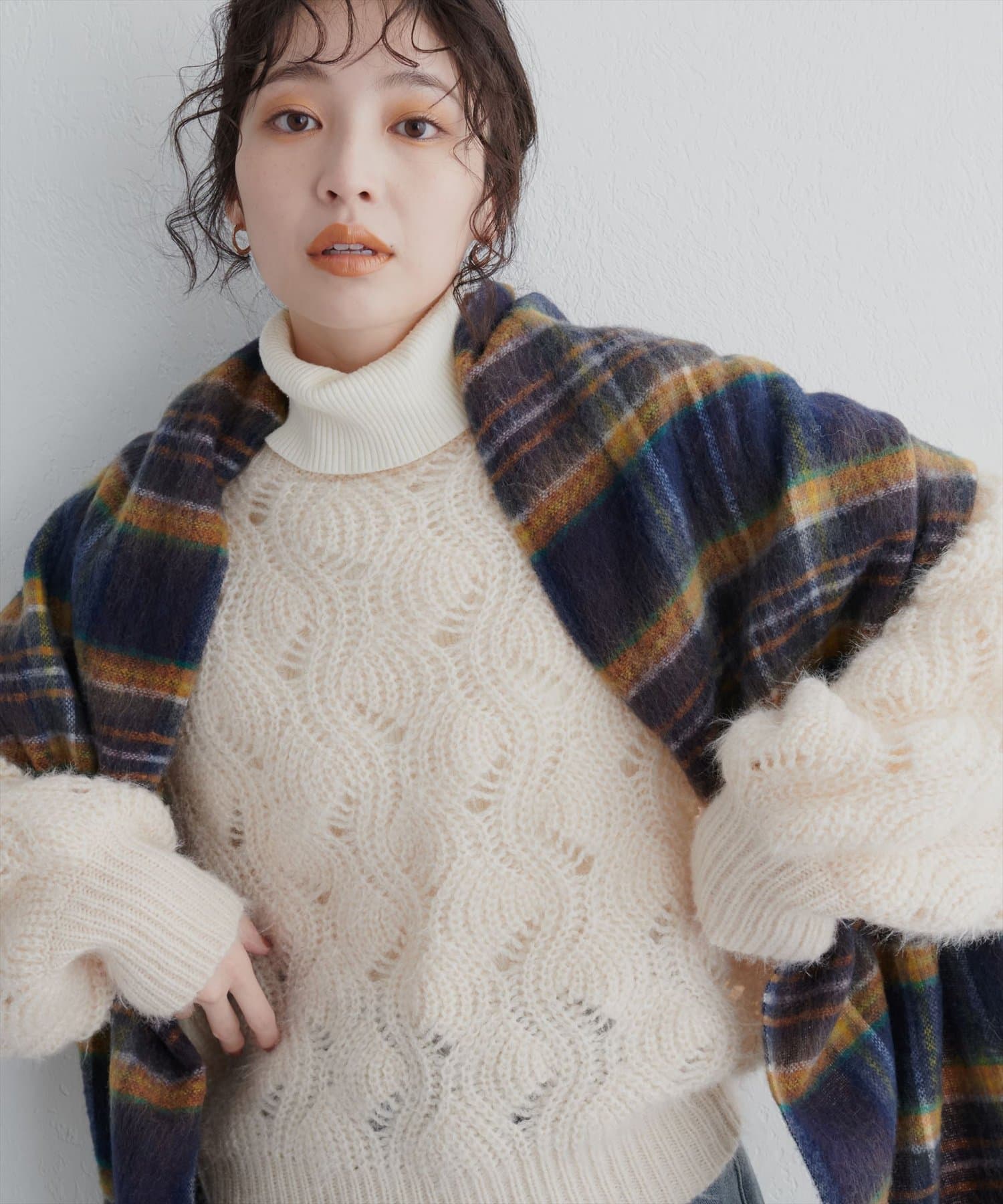 ケーブル柄で作る表情豊かな透かし編みが、冬のスタイリングに抜け感をプラス。