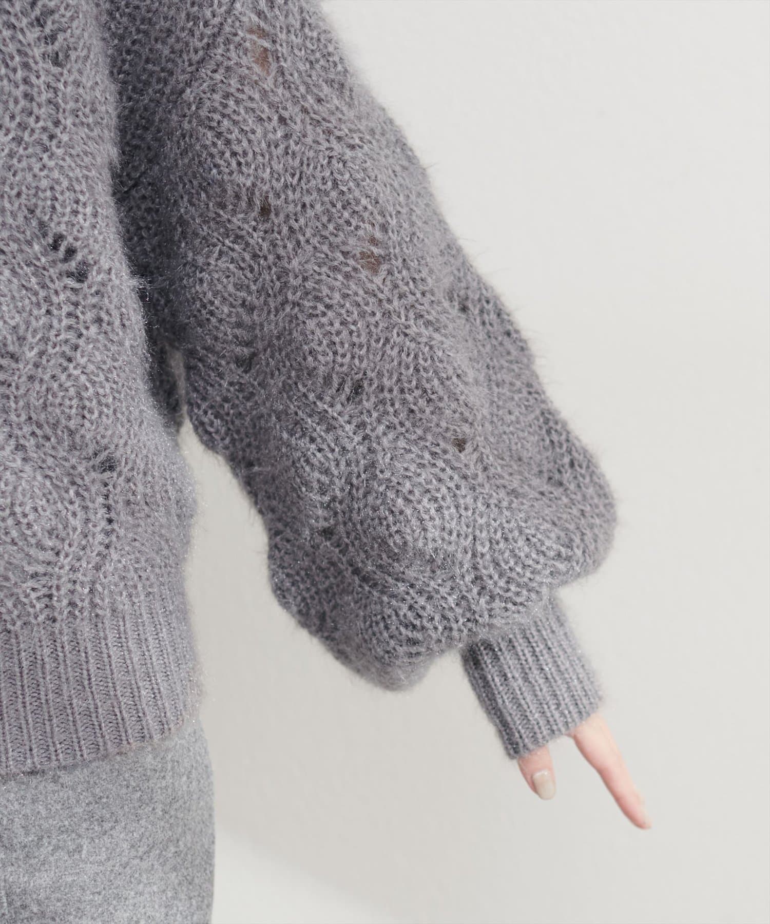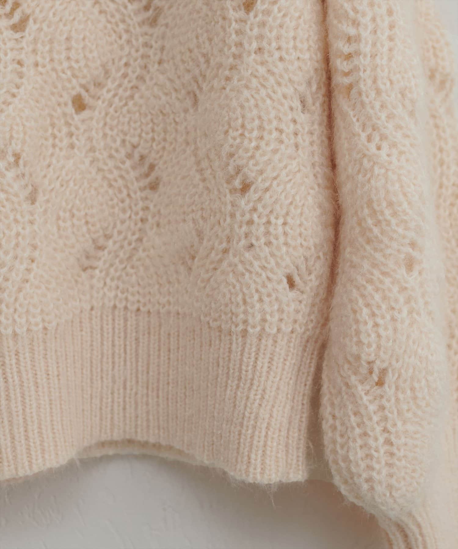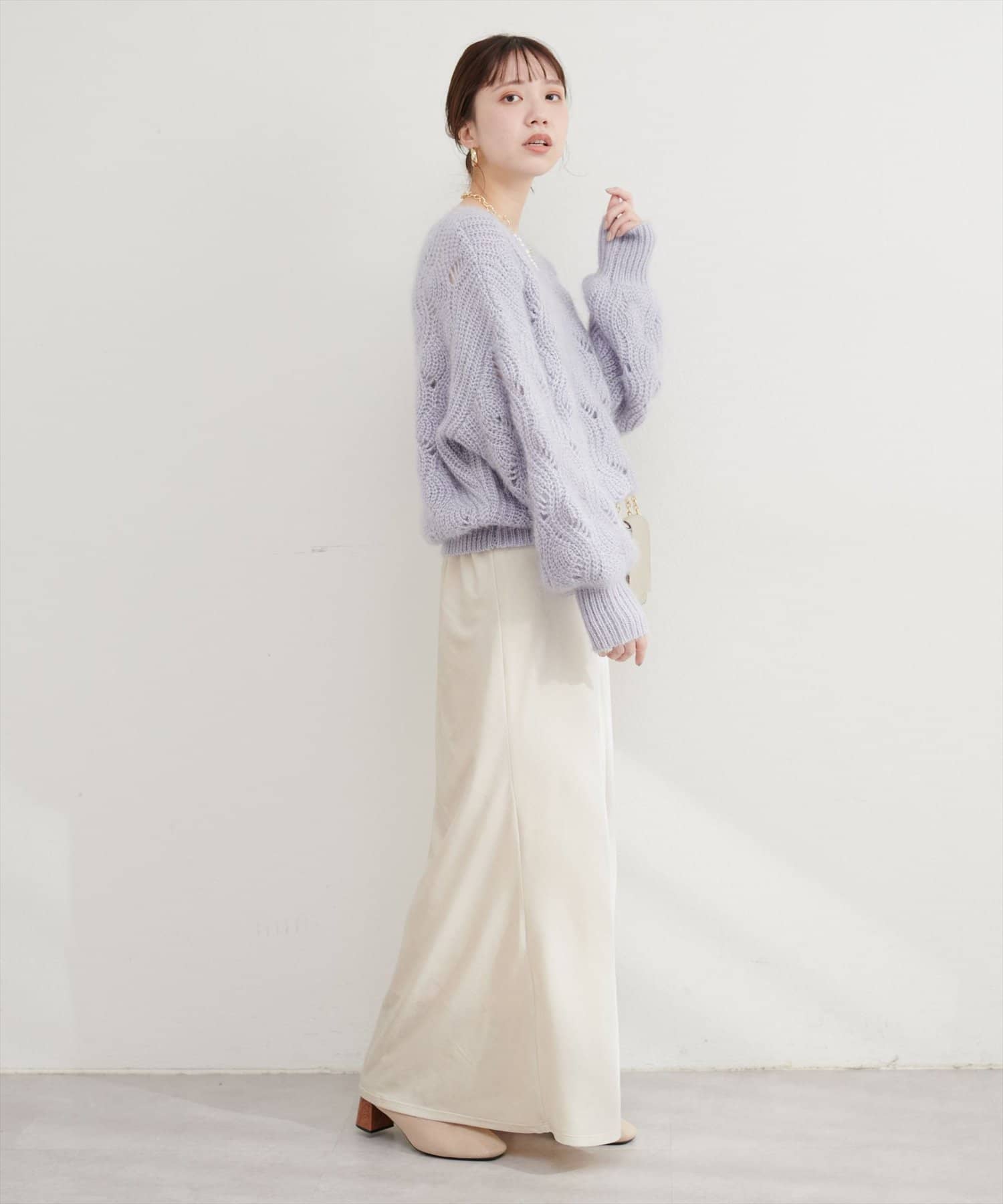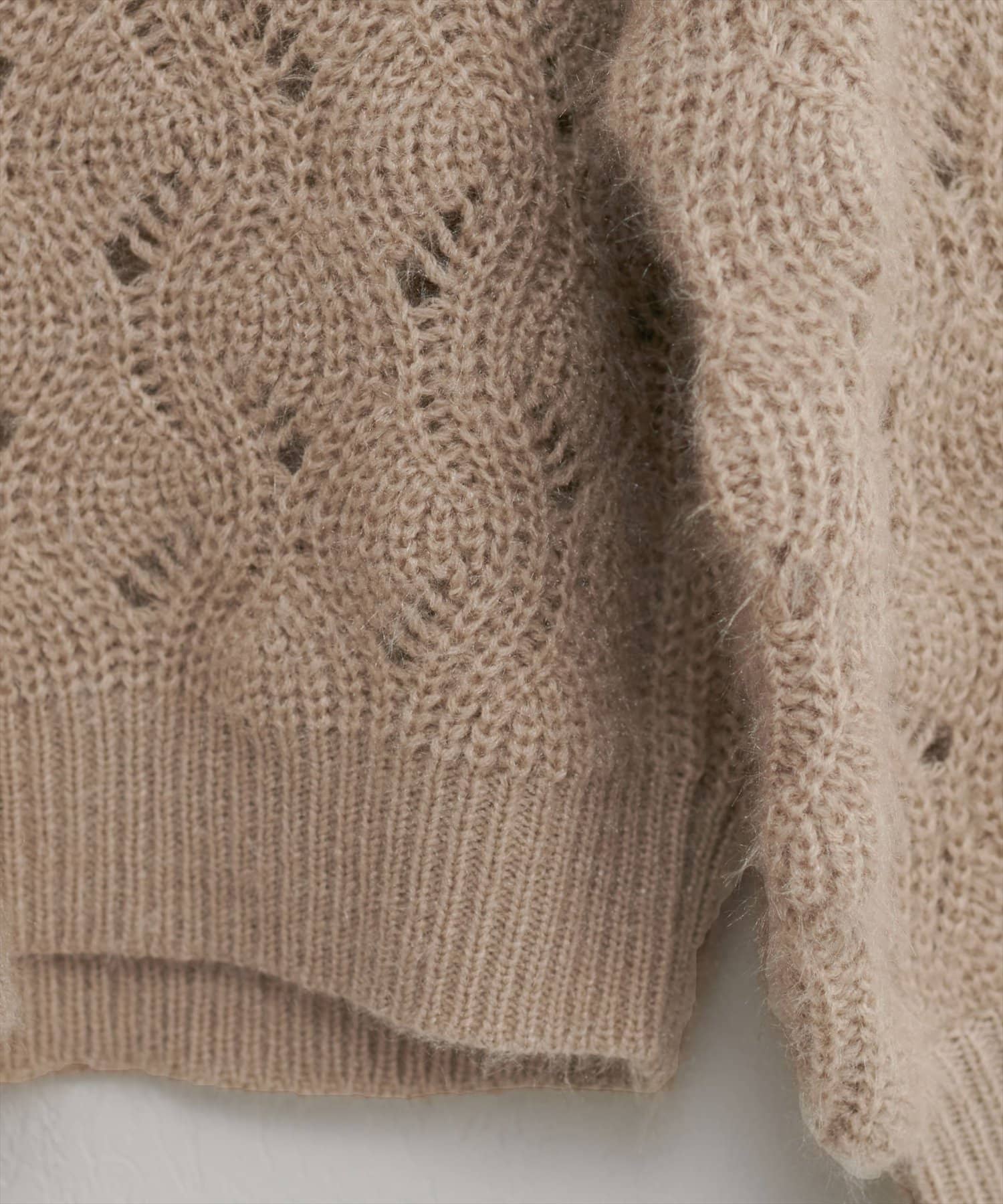大ぶりのケーブル柄と透かし編みのふわふわ感がシーズンムードを盛り上げ、冬のワードローブに欠かせない1着です。