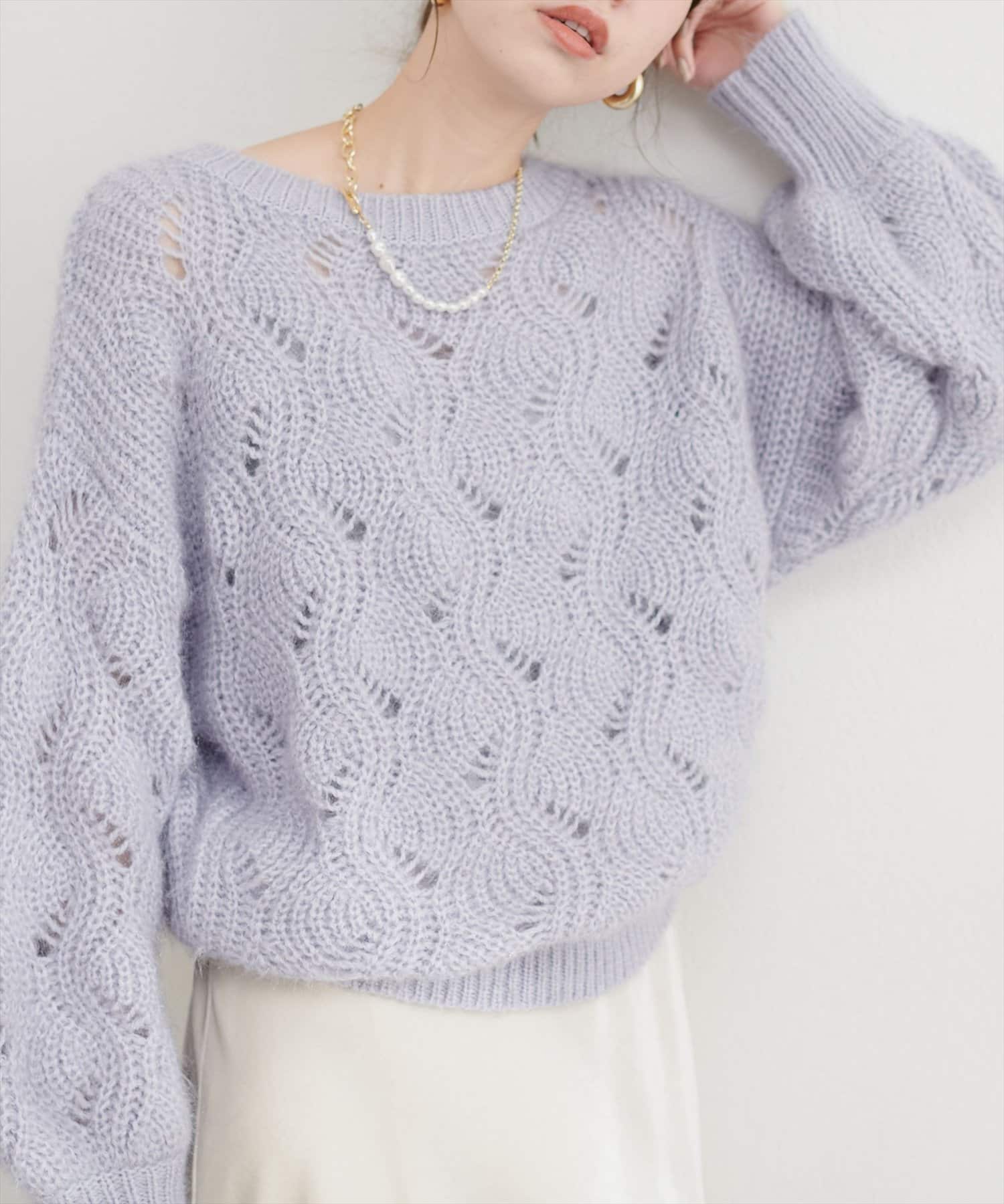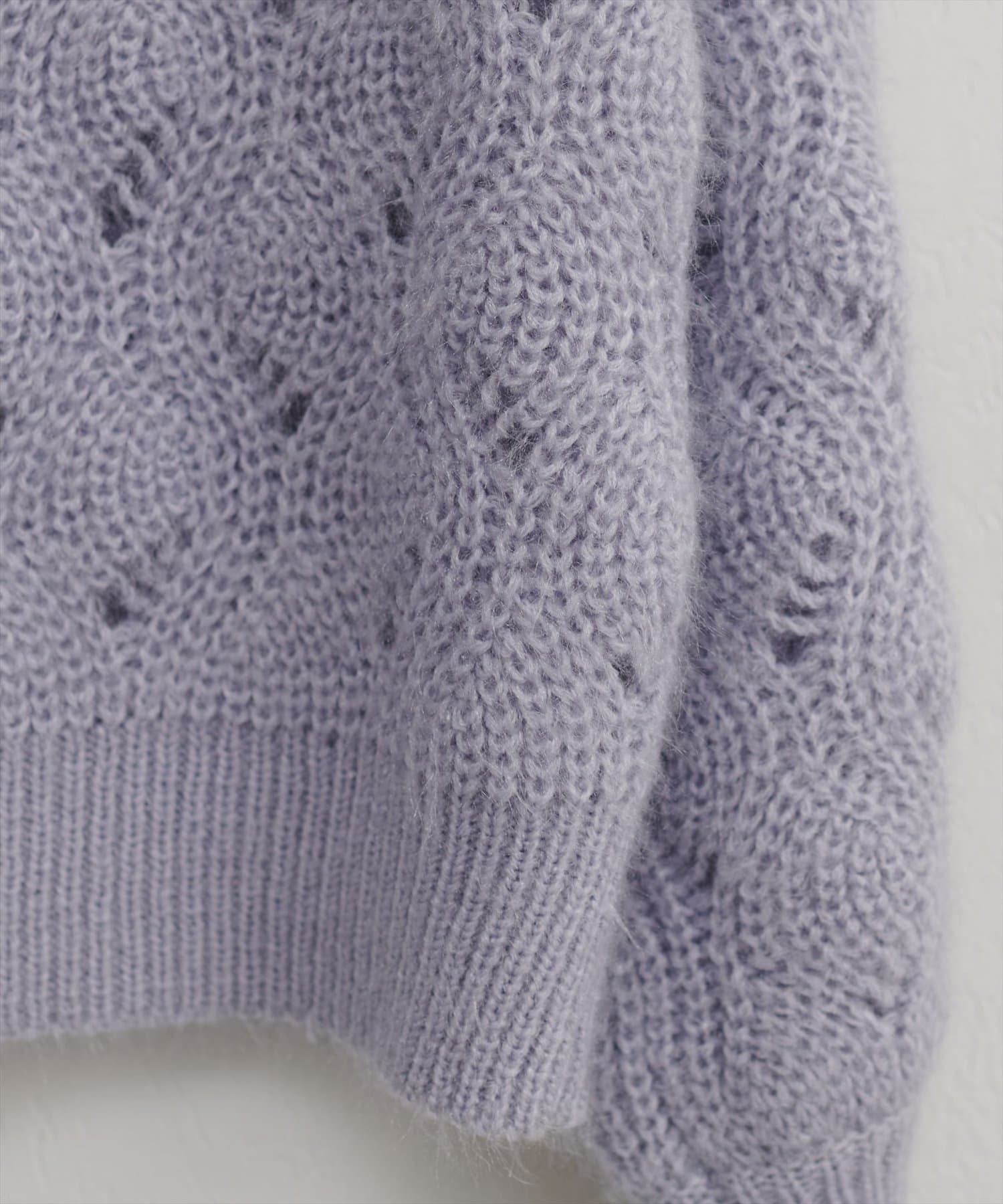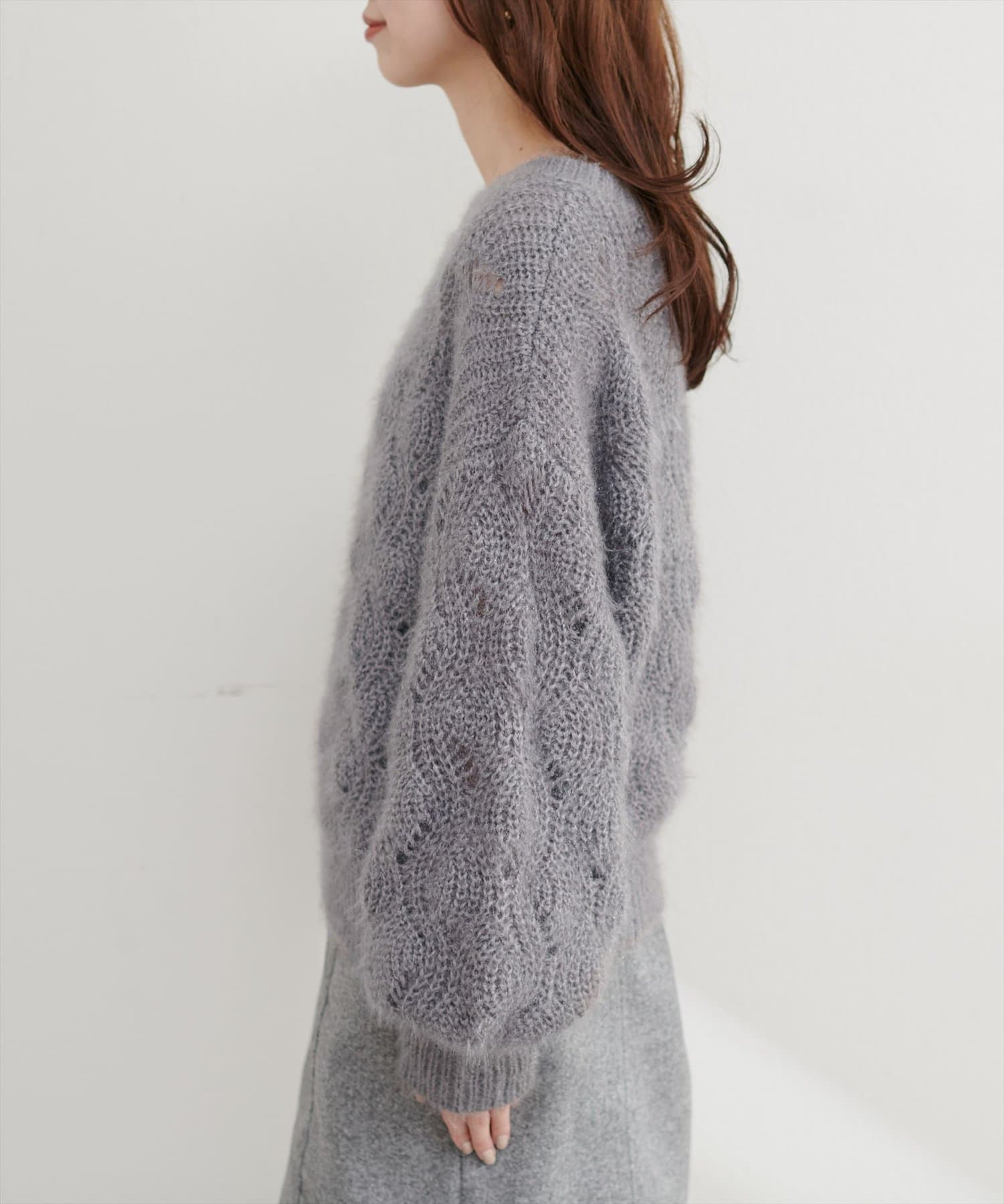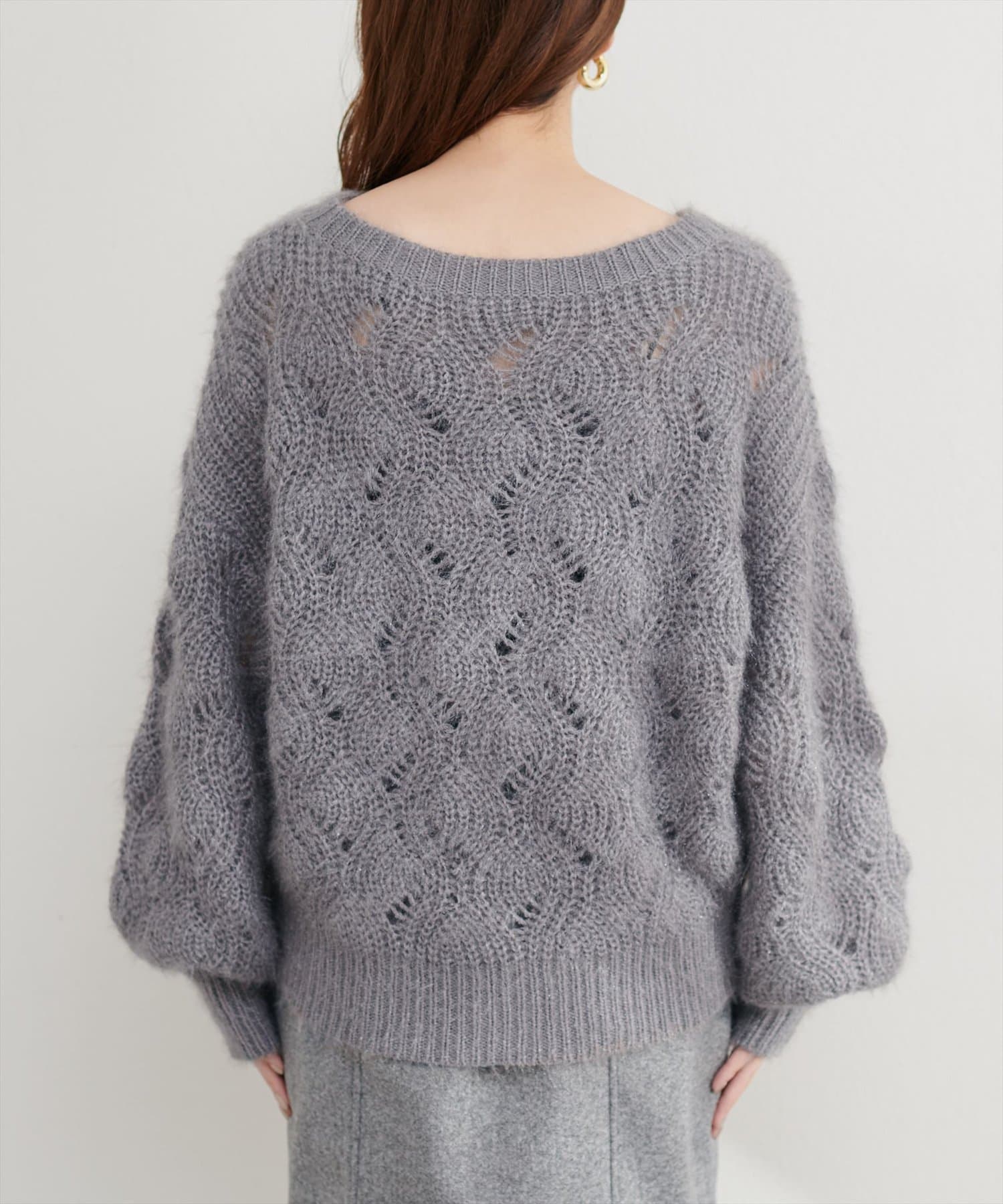 大ぶりのケーブル柄と透かし編みのふわふわ感がシーズンムードを盛り上げ、冬のワードローブに欠かせない1着です。