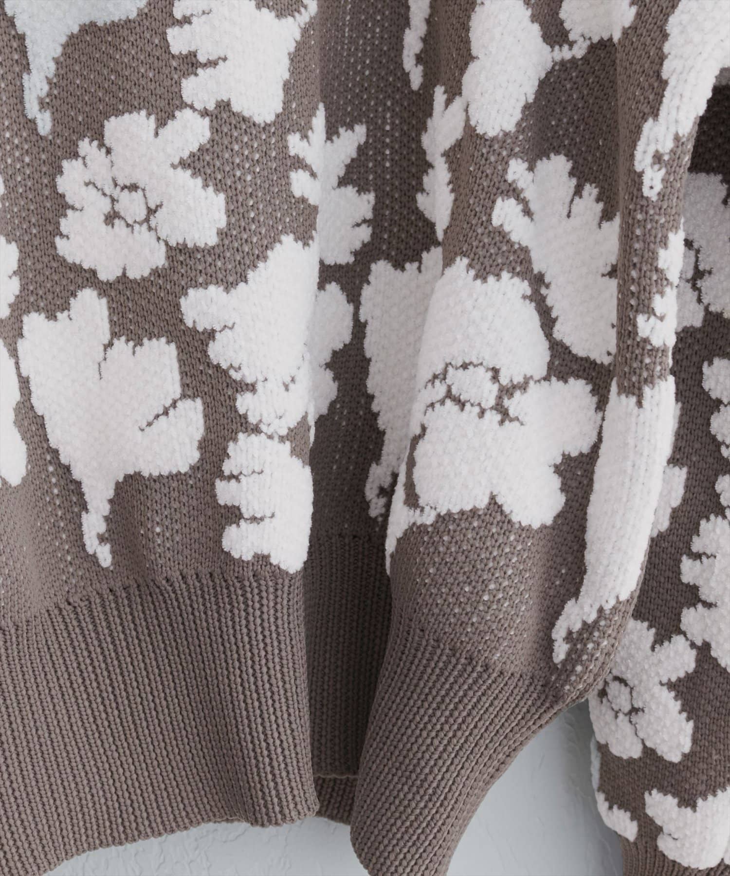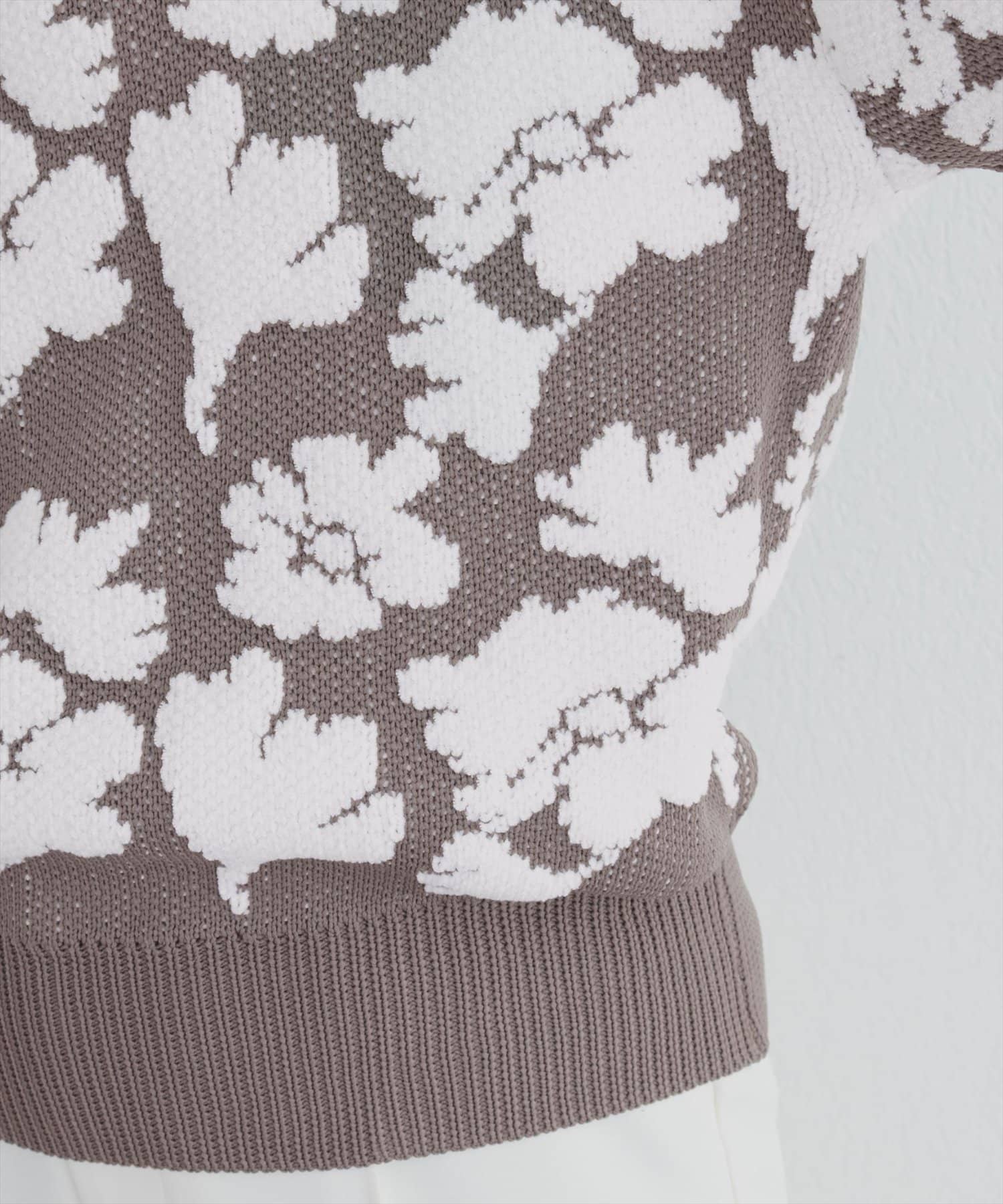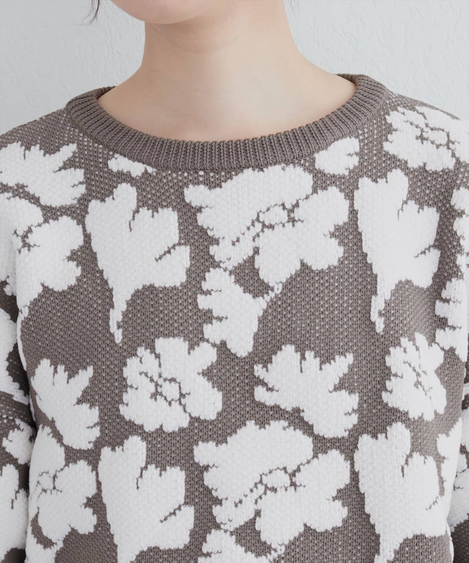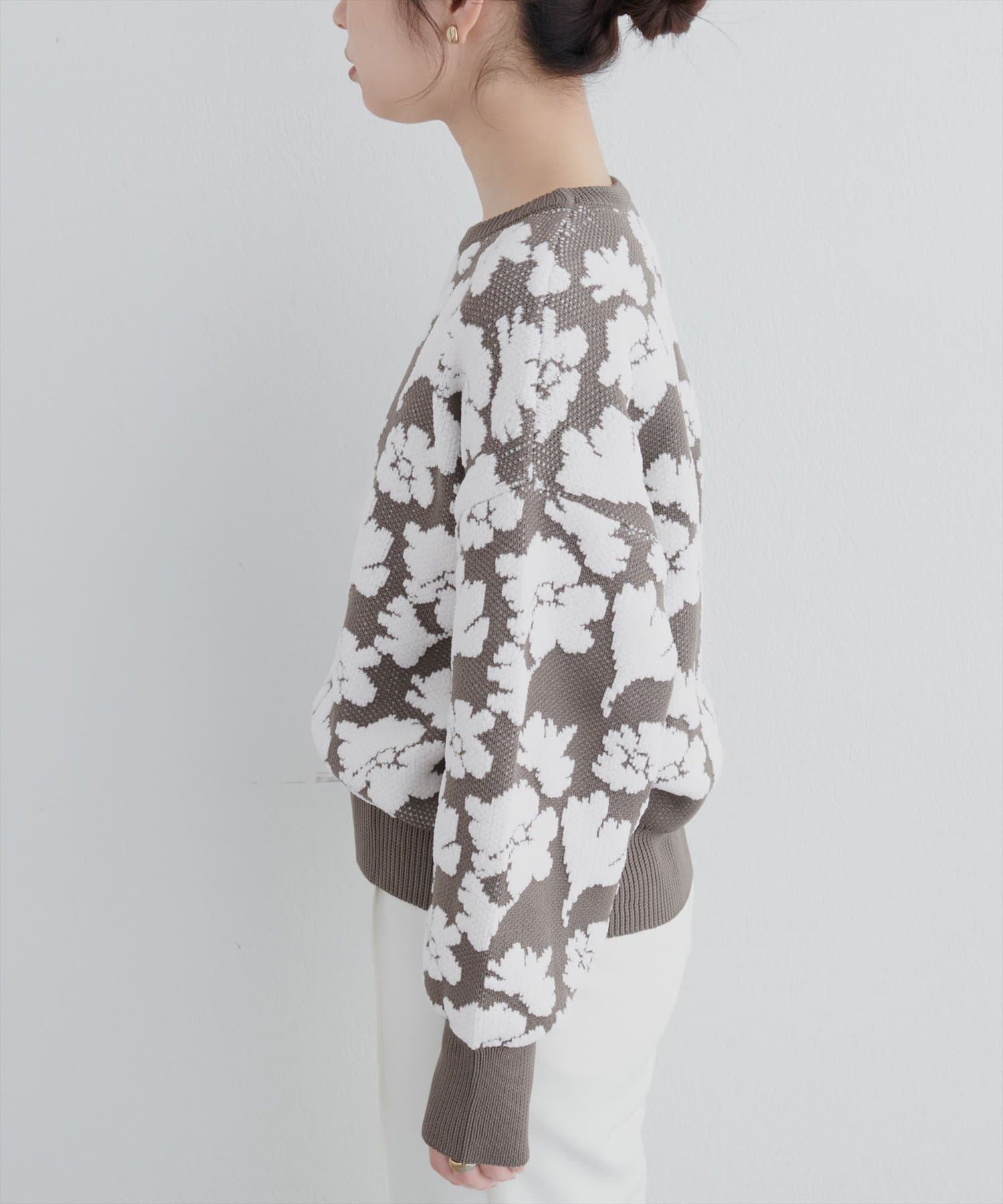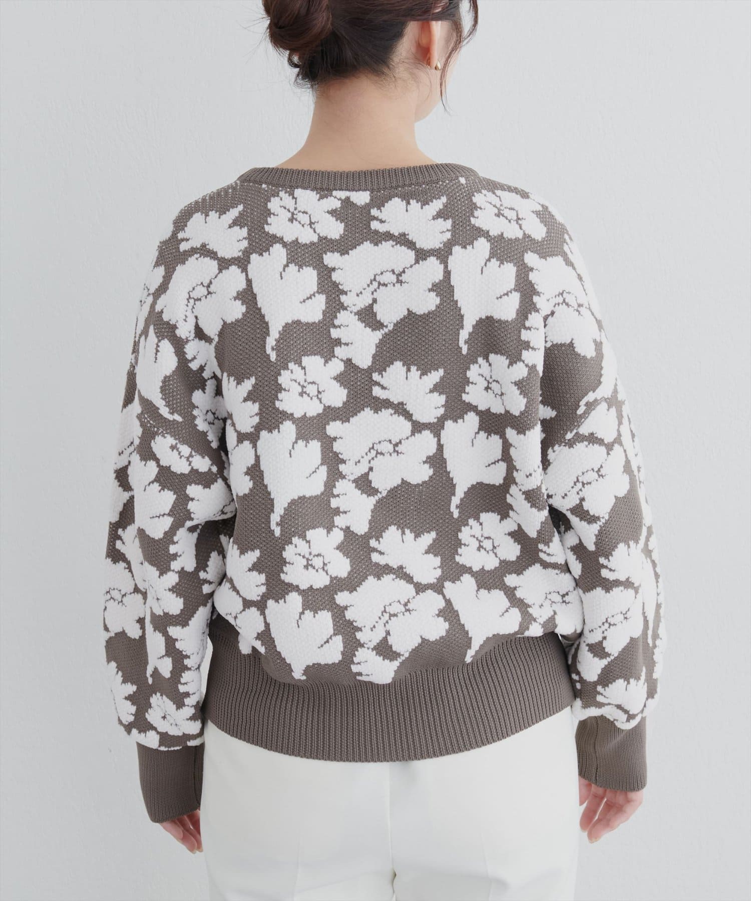 大きく散りばめられたフラワージャガードが目を惹き、他にはないデザインの1着。