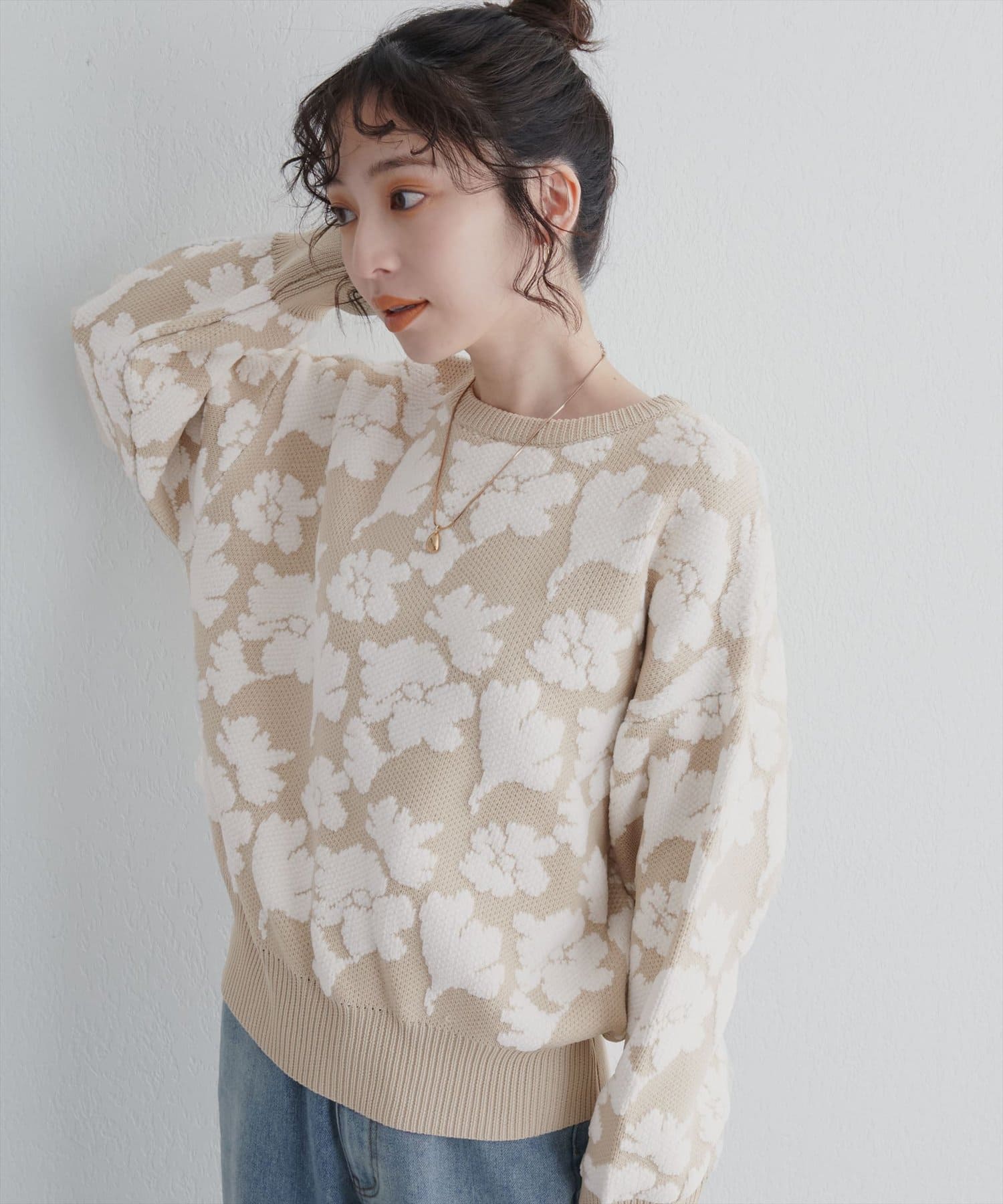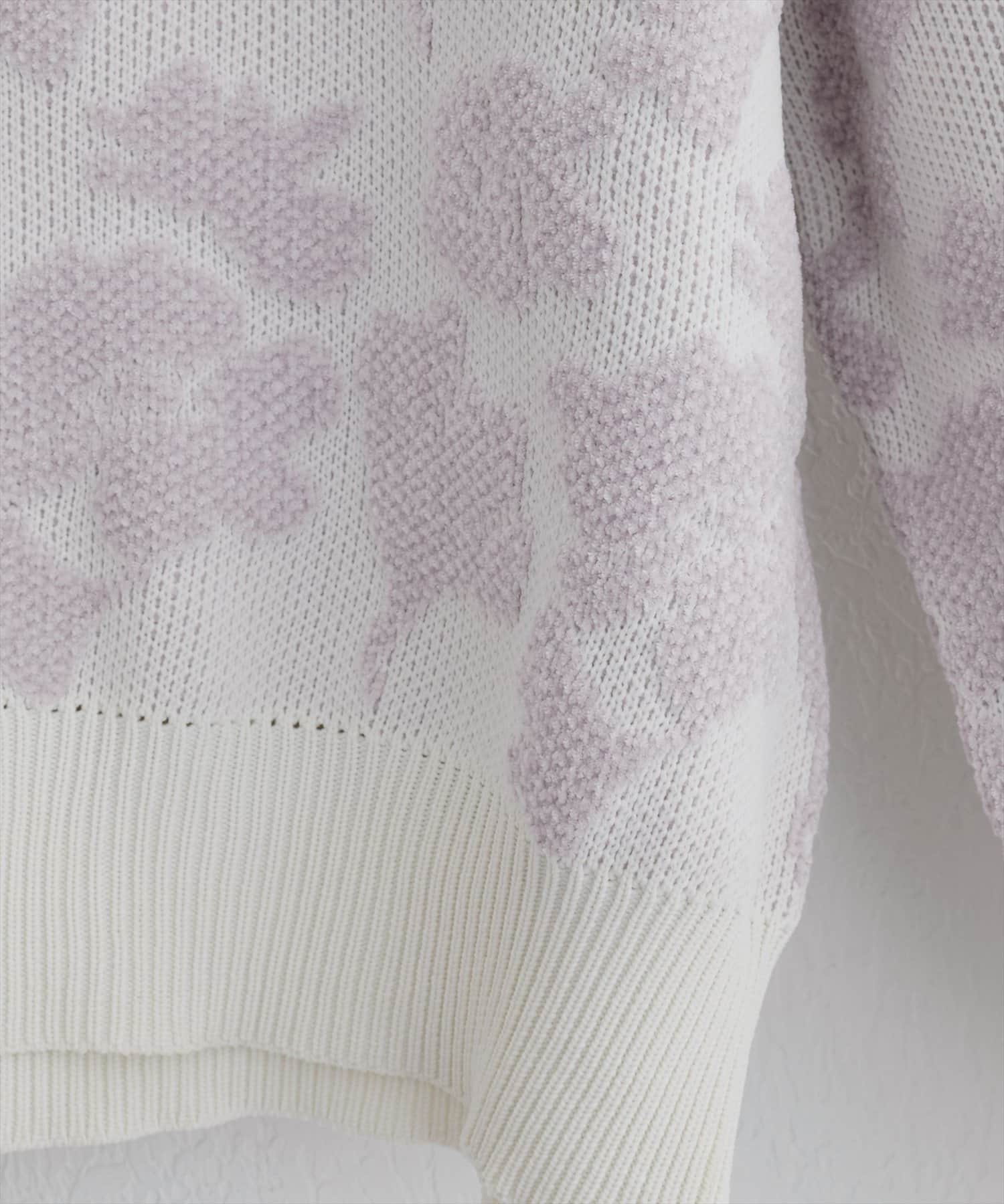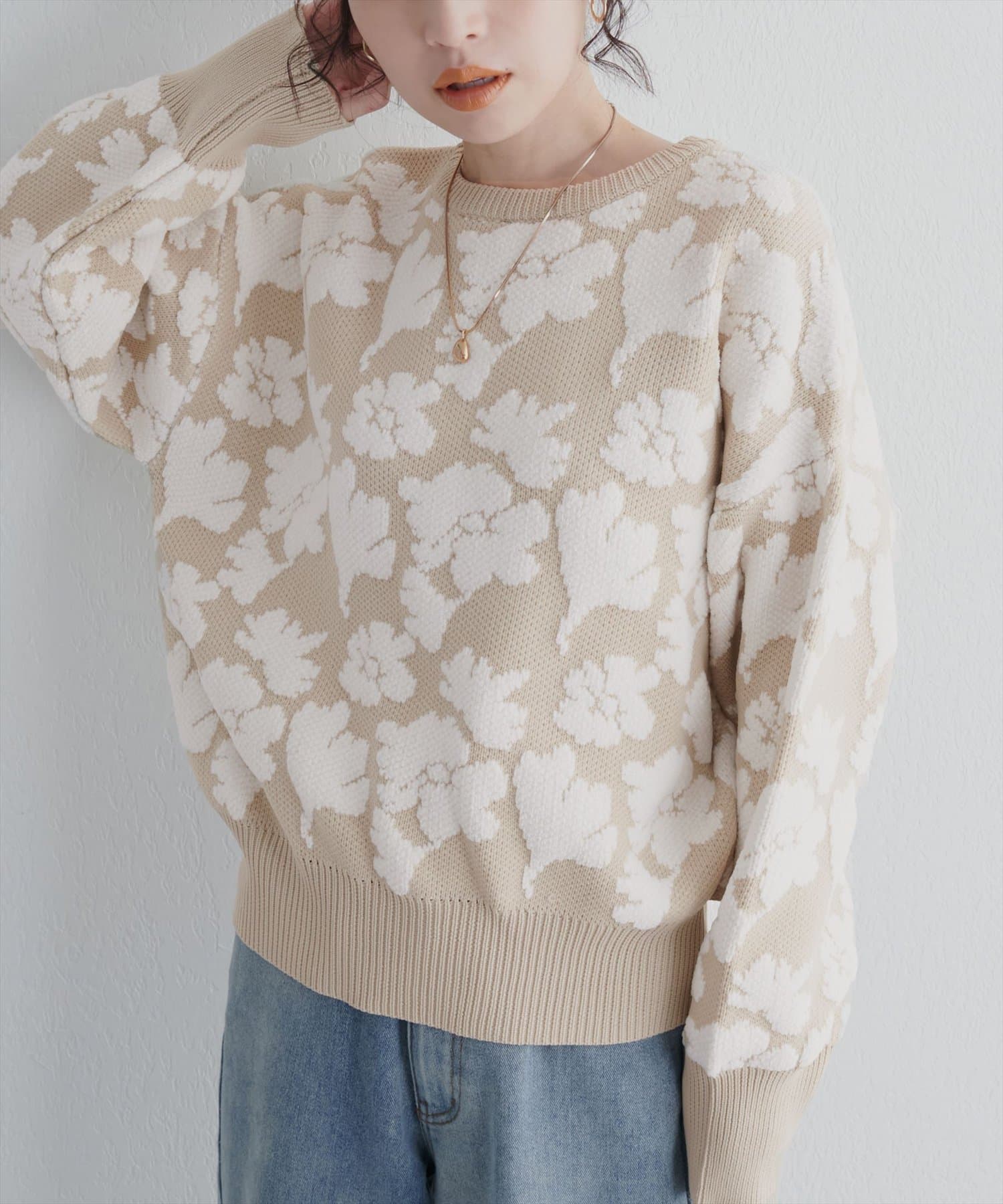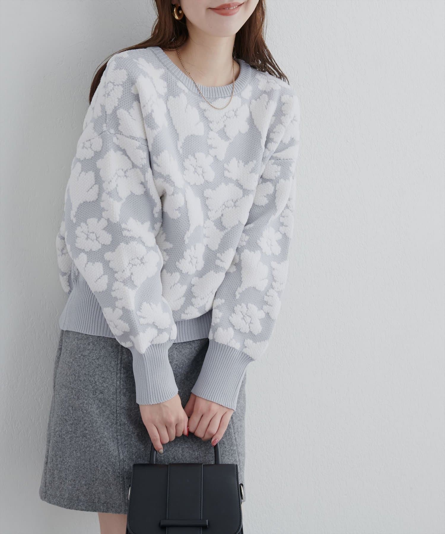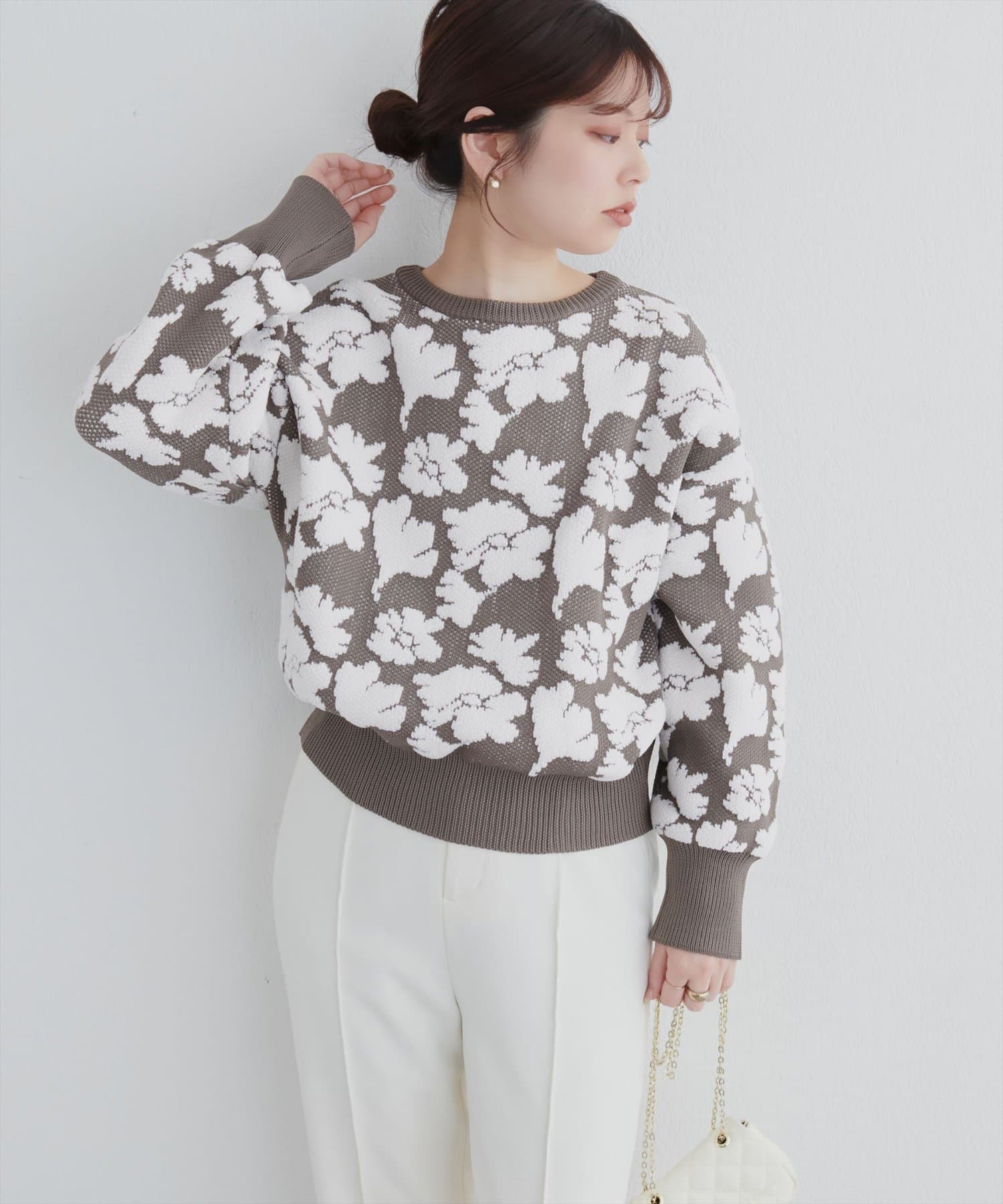 大きく散りばめられたフラワージャガードが目を惹き、他にはないデザインの1着。