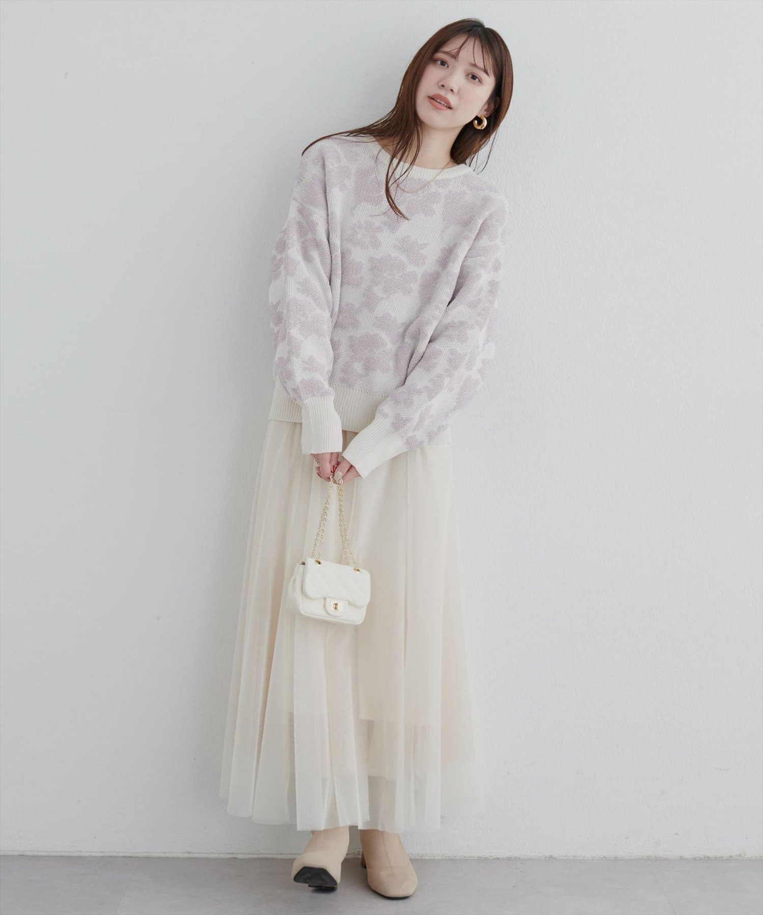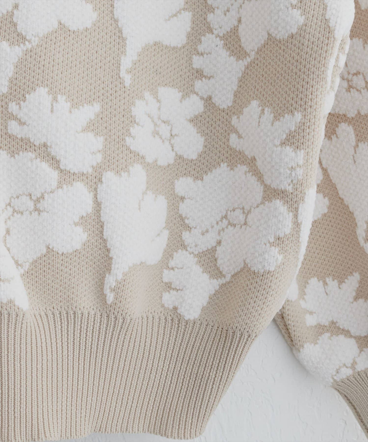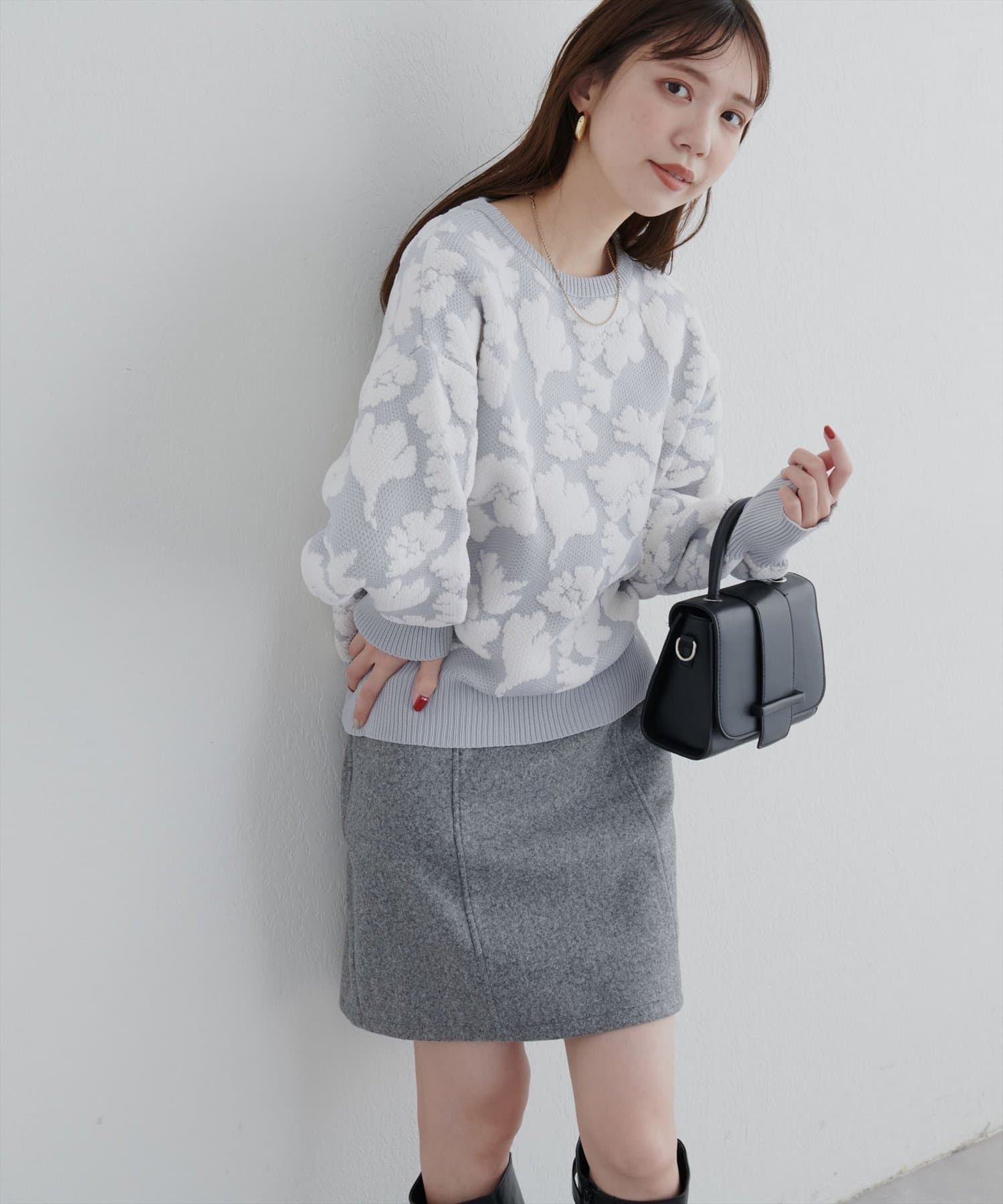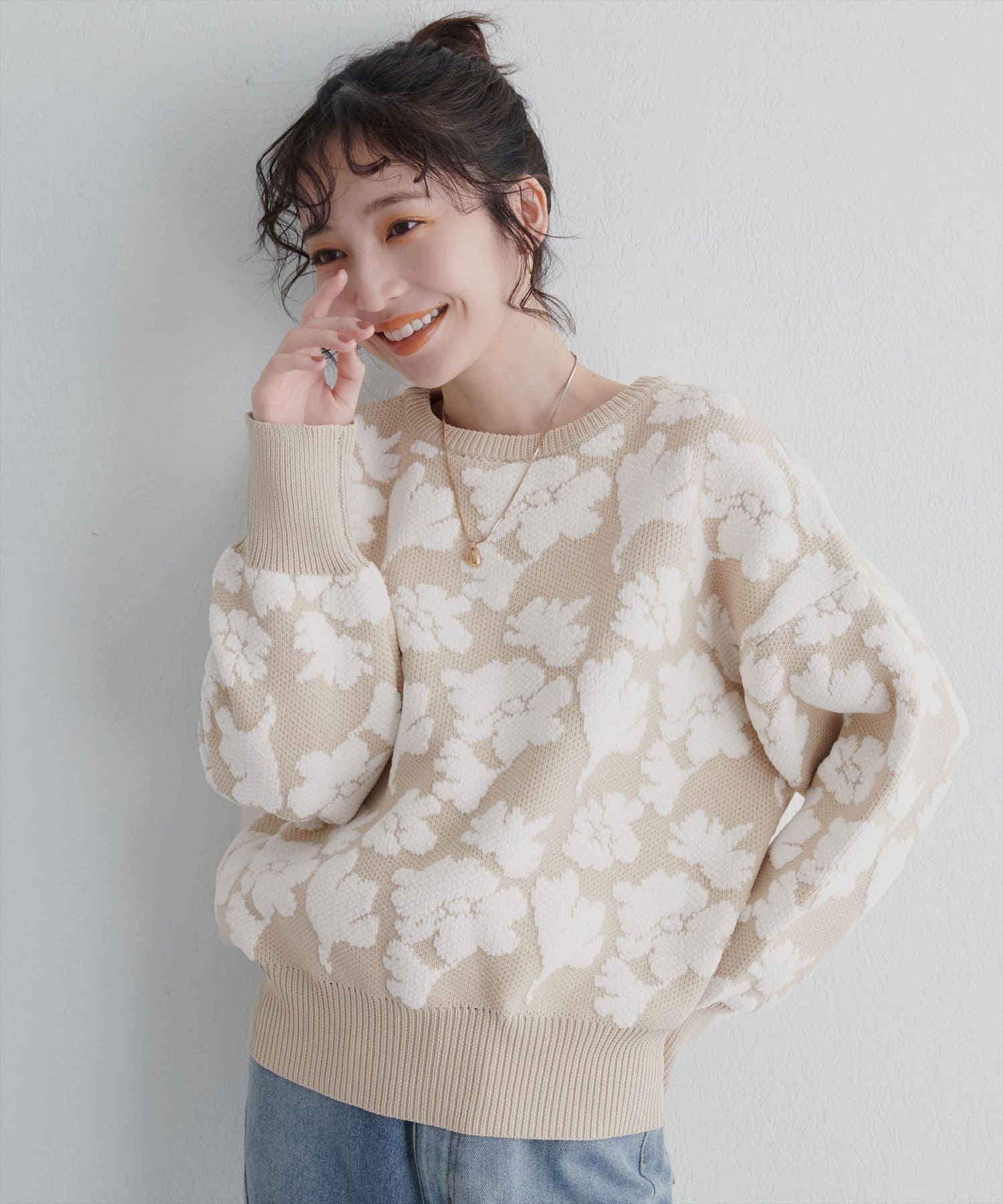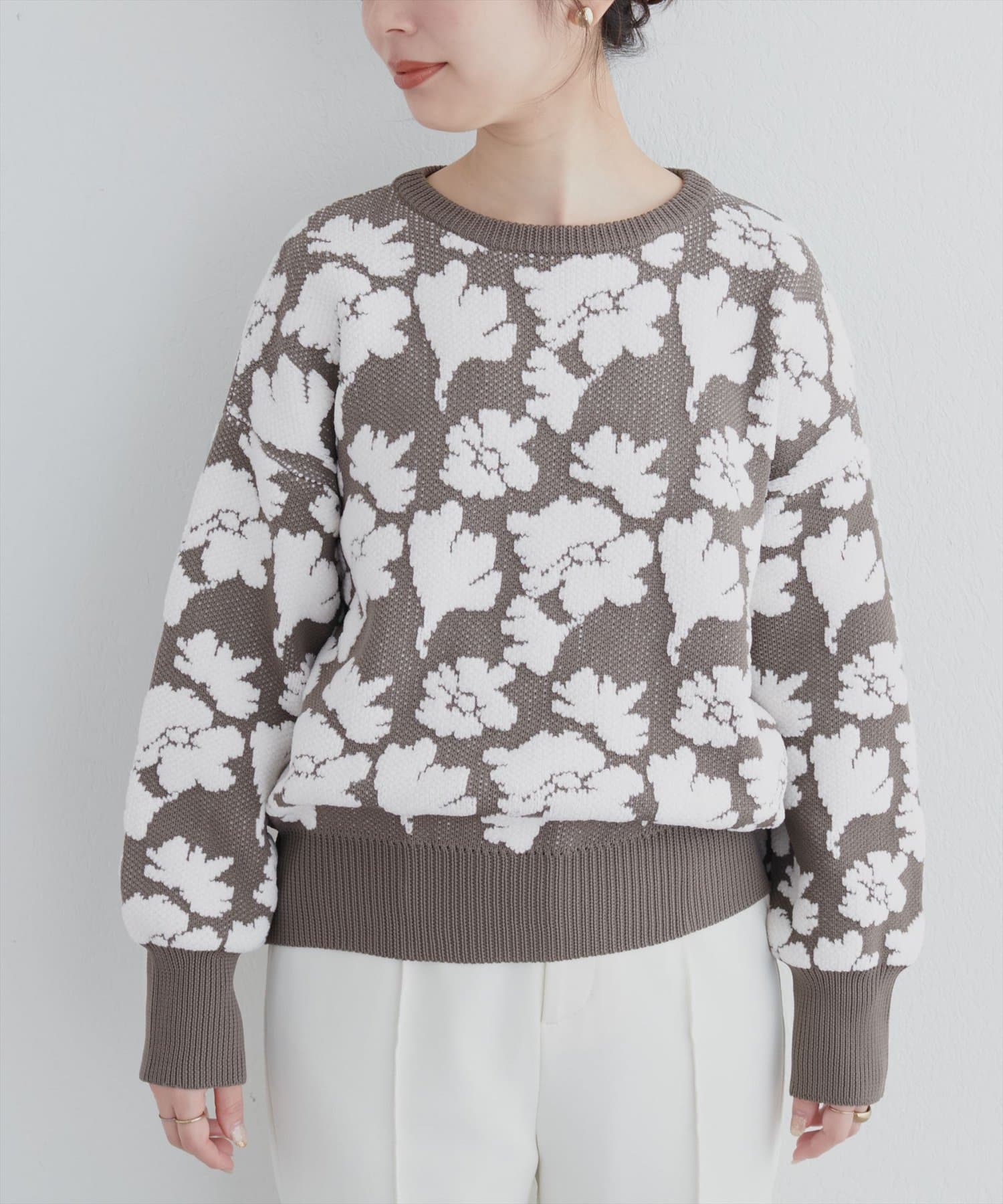 大きく散りばめられたフラワージャガードが目を惹き、他にはないデザインの1着。