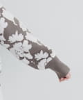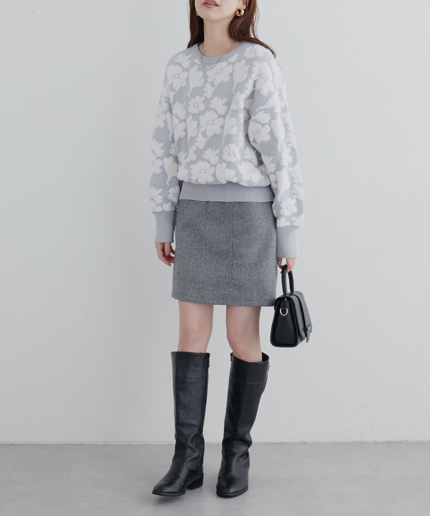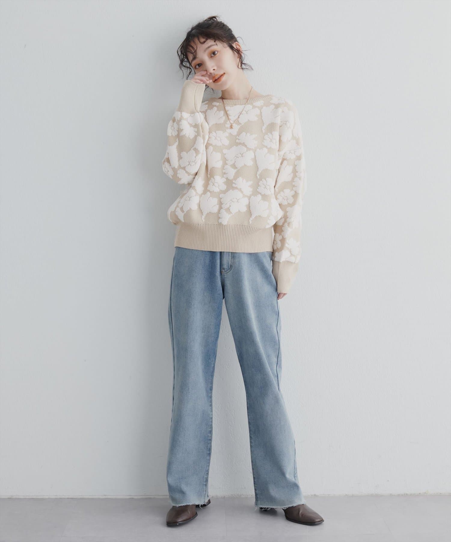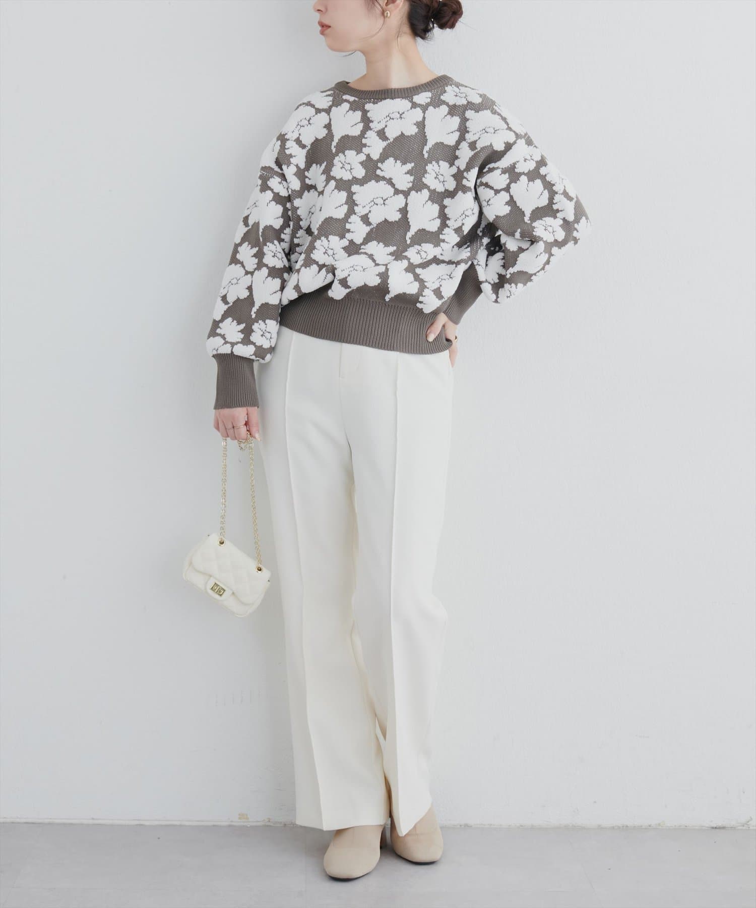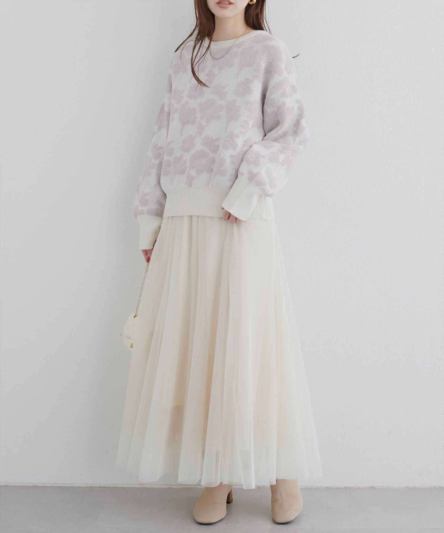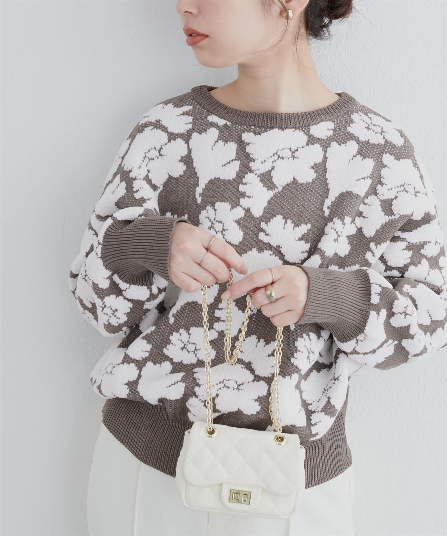大きく散りばめられたフラワージャガードが目を惹き、他にはないデザインの1着。
