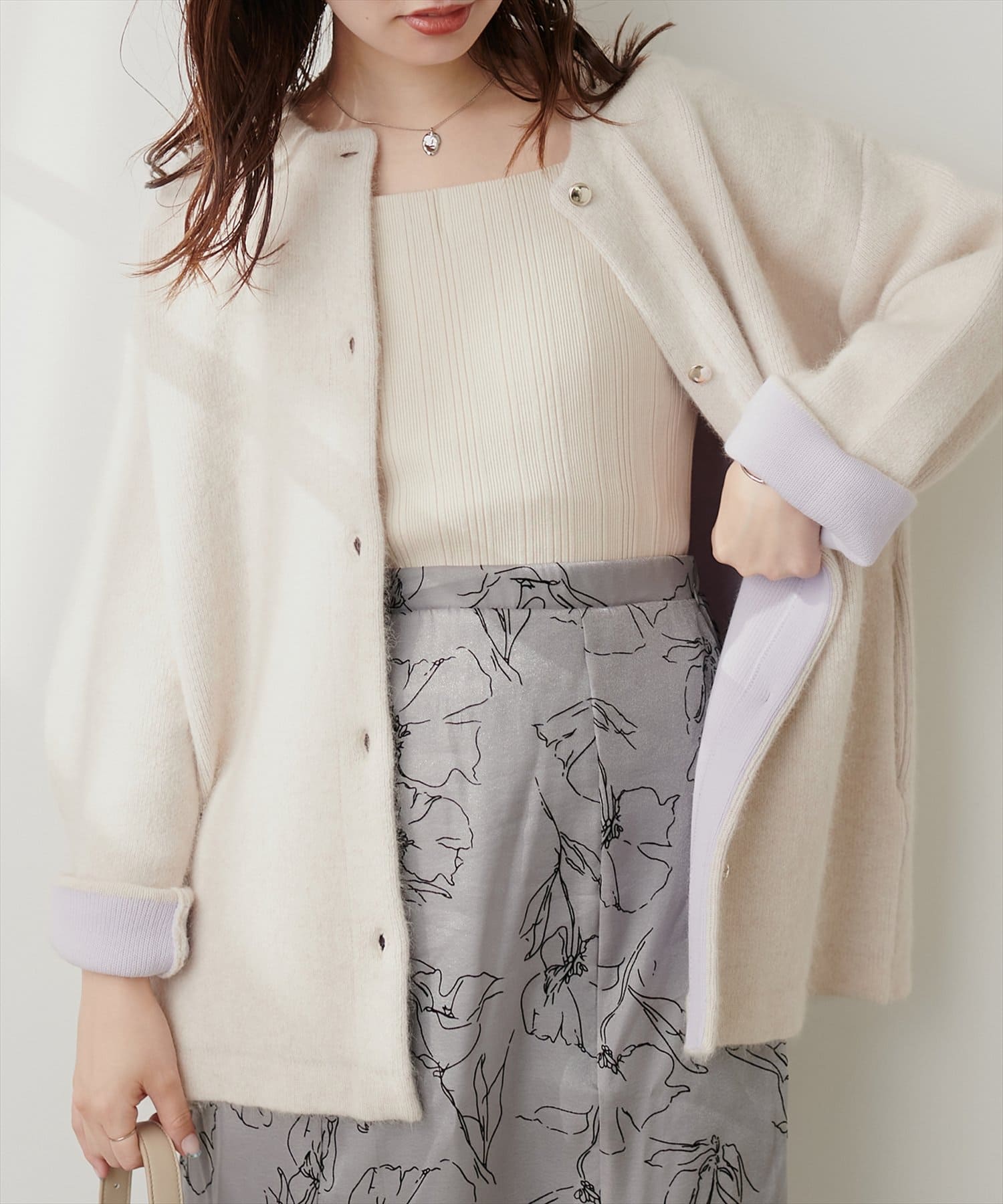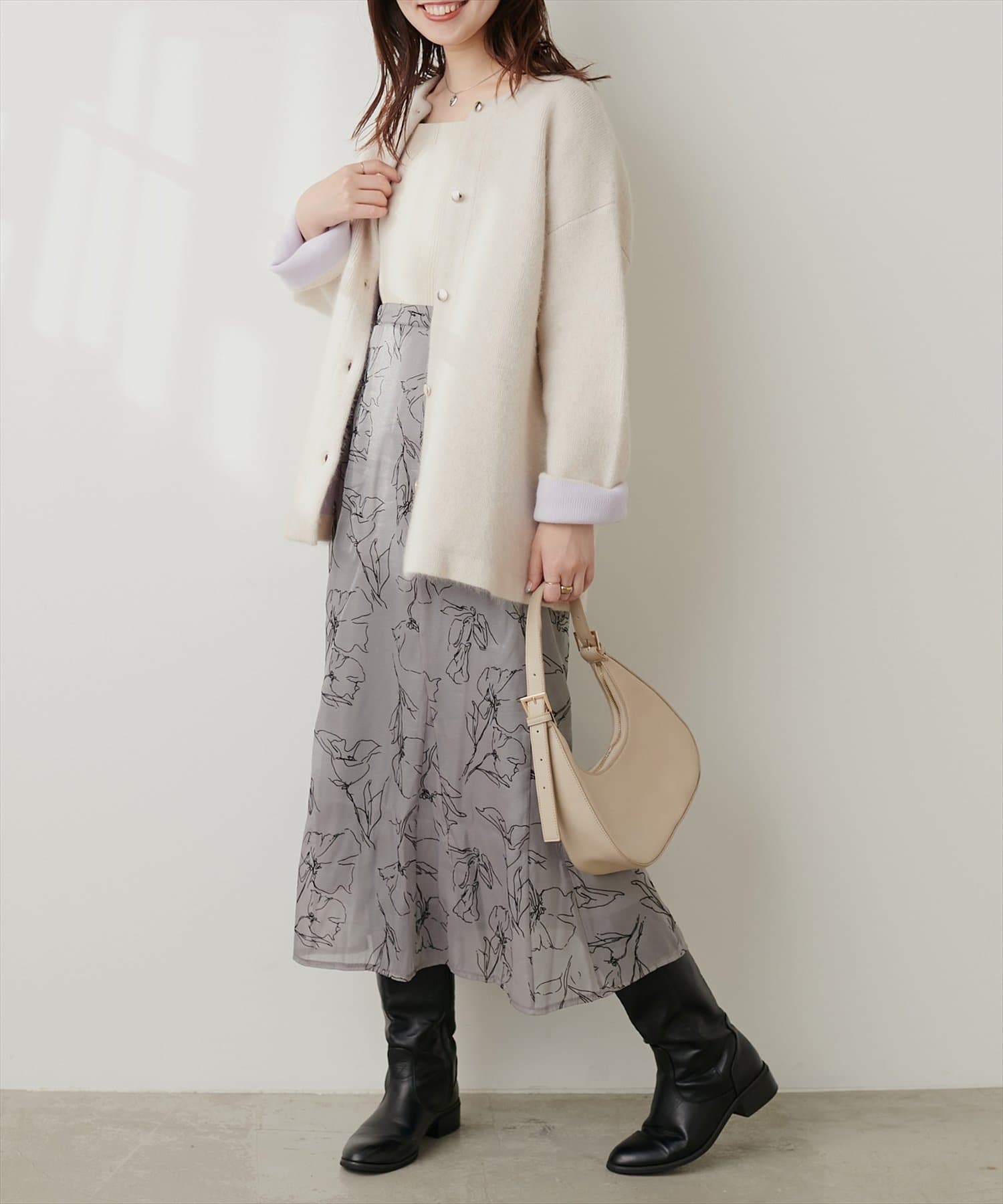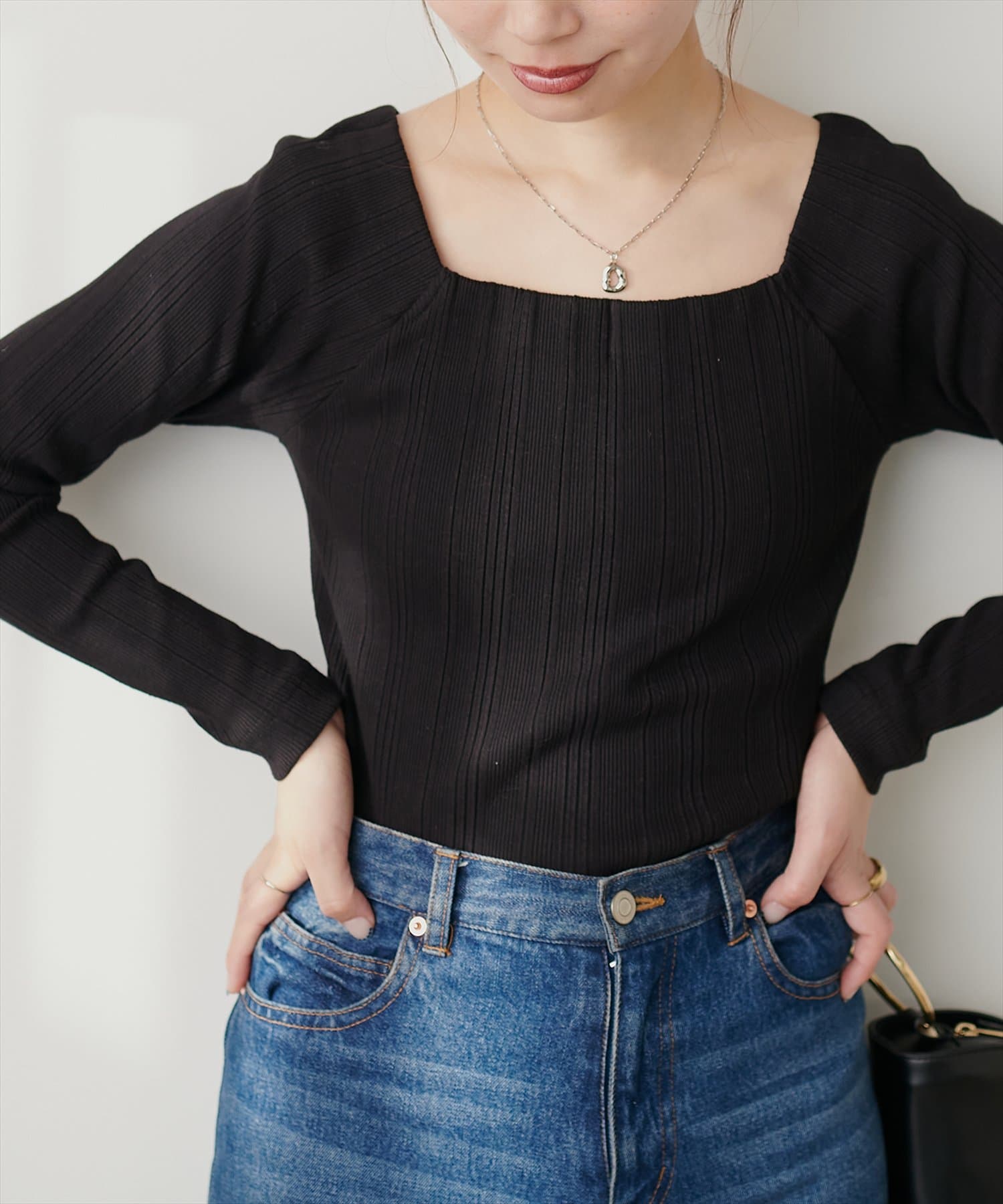 単色ですが模様のようにランダムな太さのリブが入っているので、ボシンプルなボトムでも決まります。