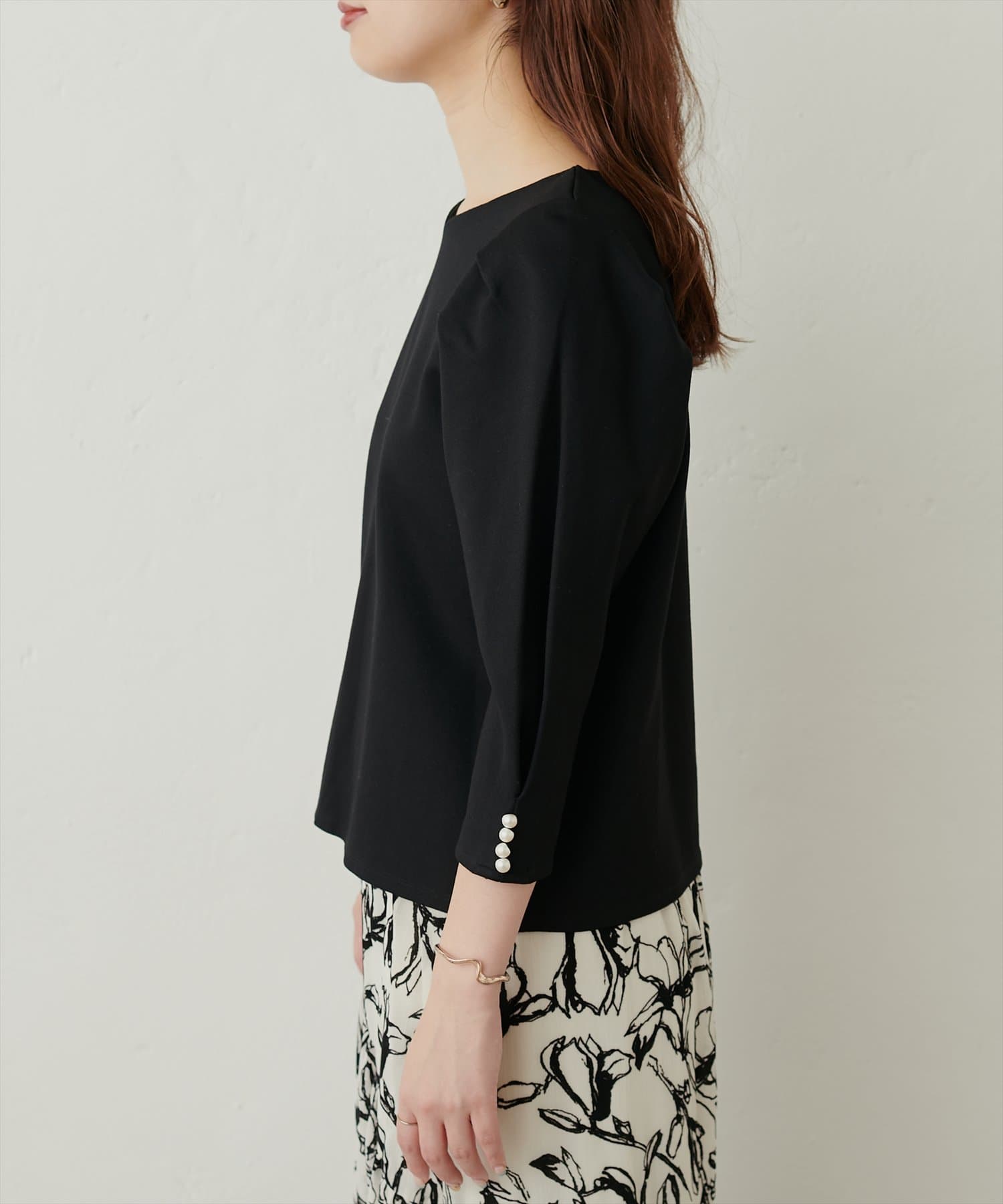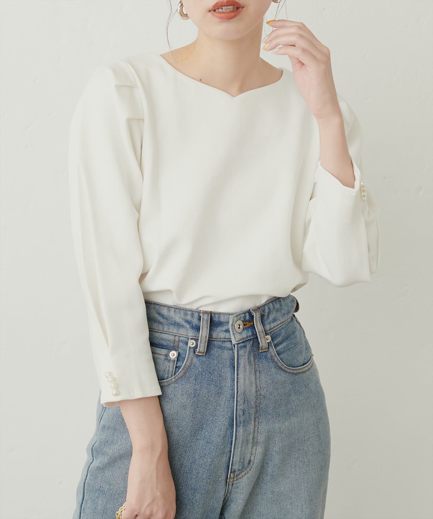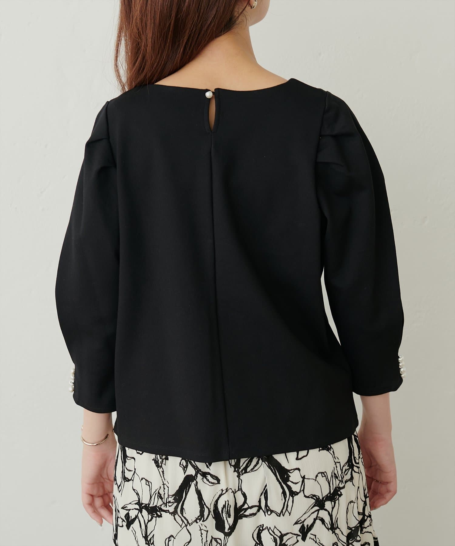 袖のタックデザインにさり気ないパール使いがポイントのきれいめプルオーバー。