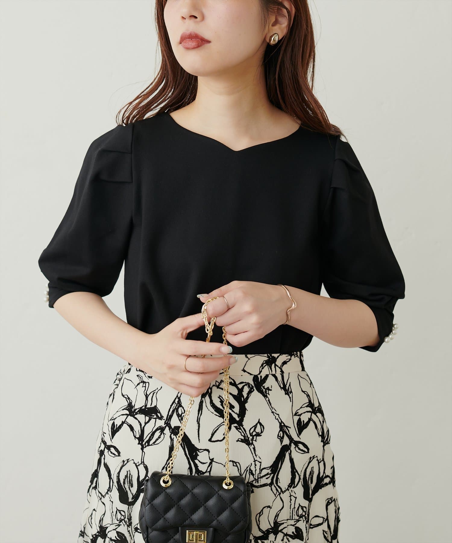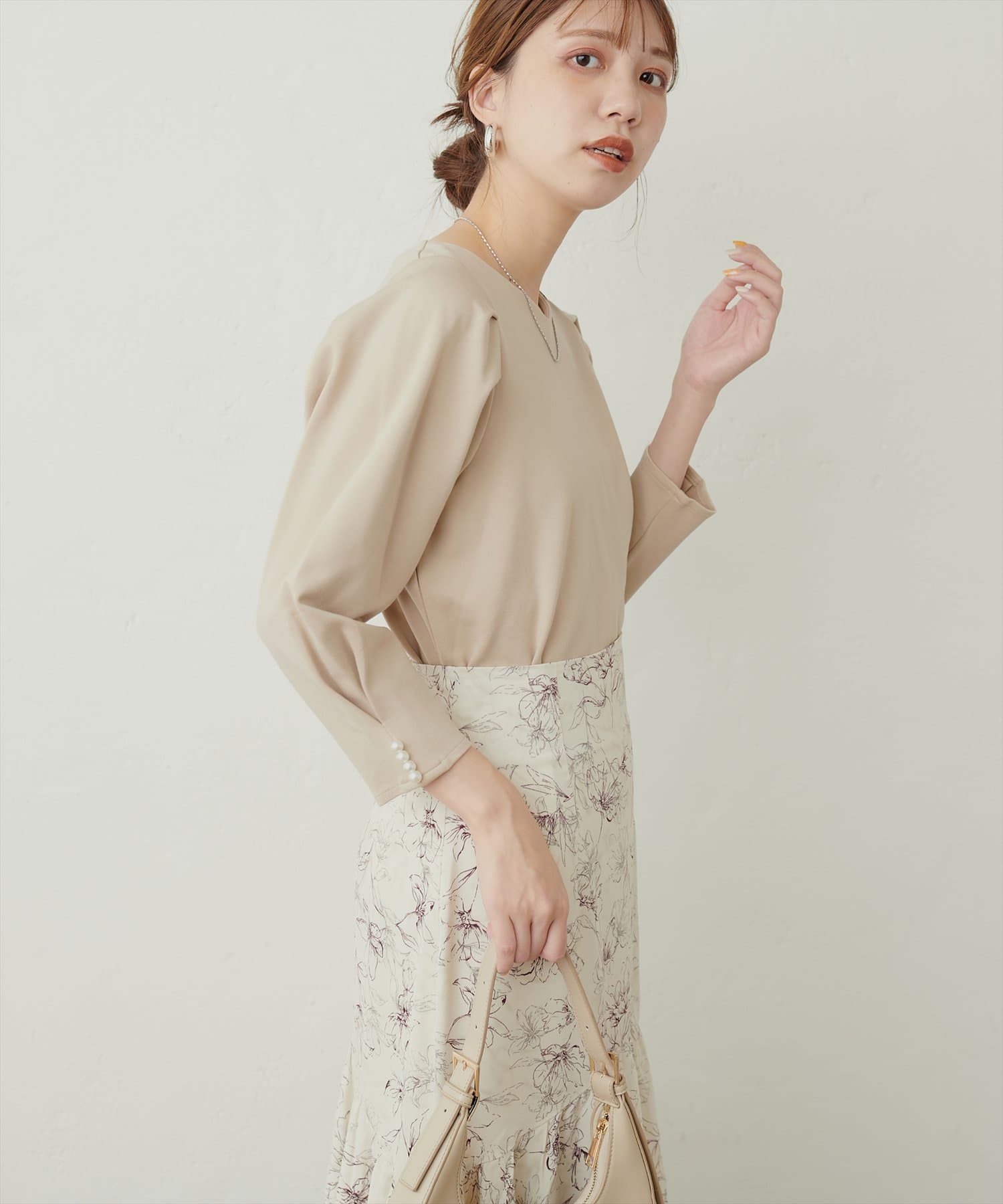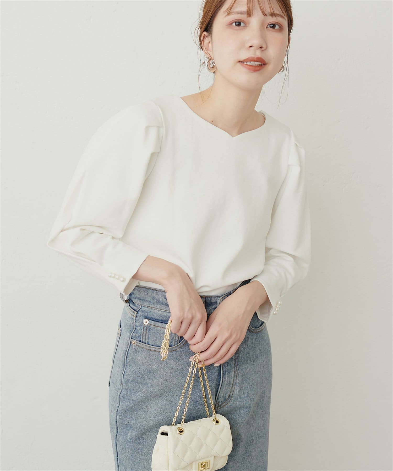 袖のタックデザインにさり気ないパール使いがポイントのきれいめプルオーバー。
