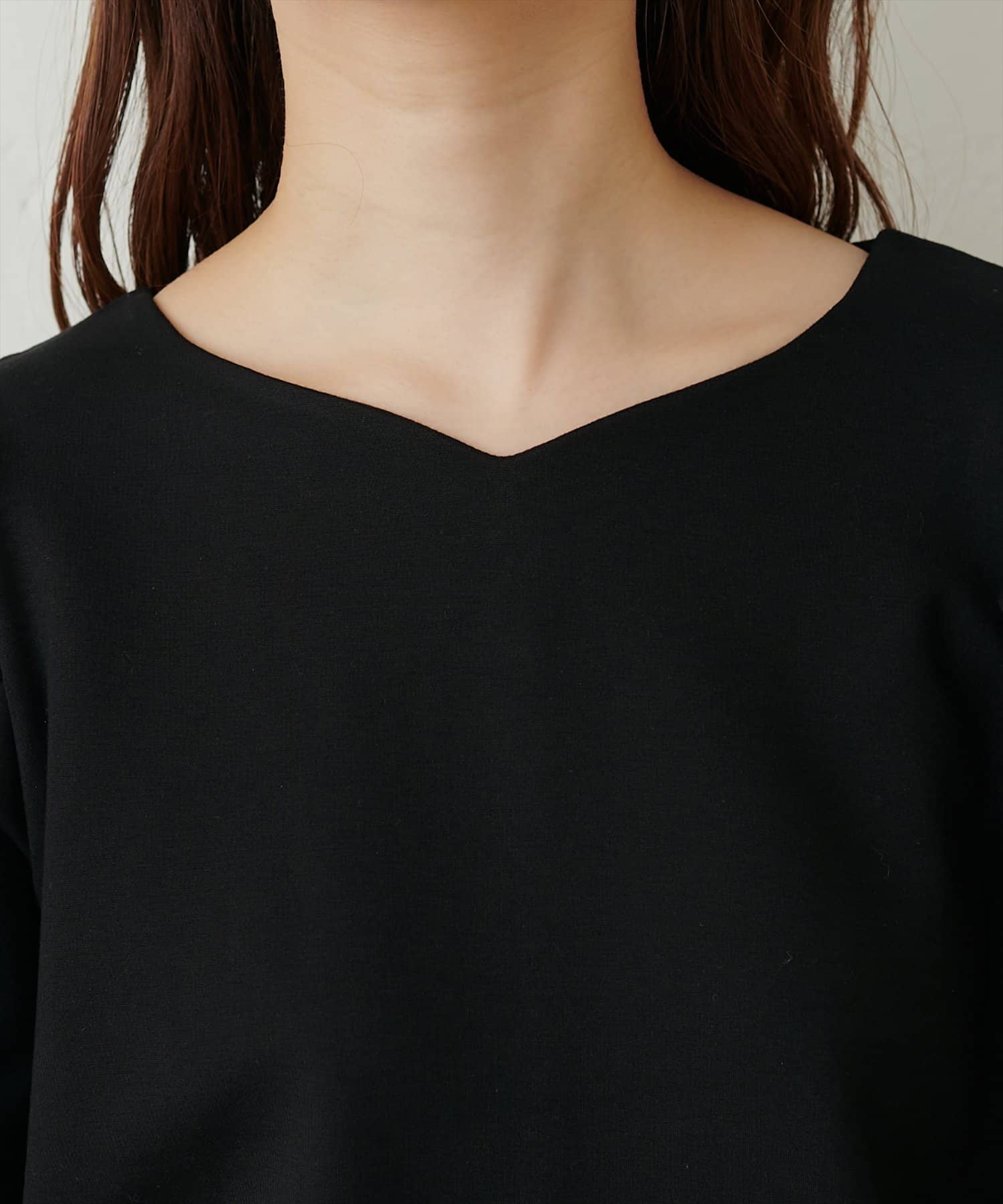 浅めのVネックでお顔周りをすっきりきれいに見せてくれます。
