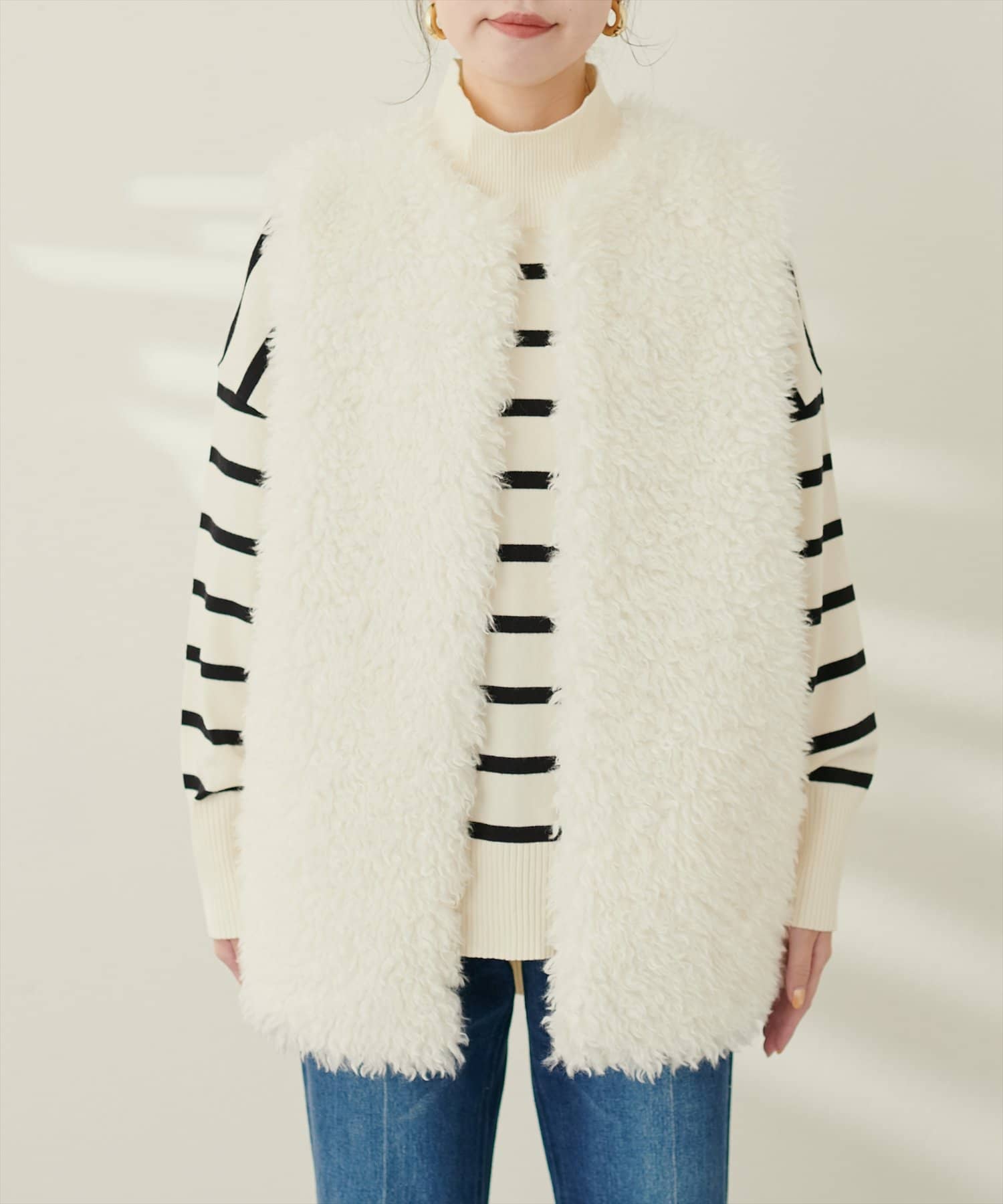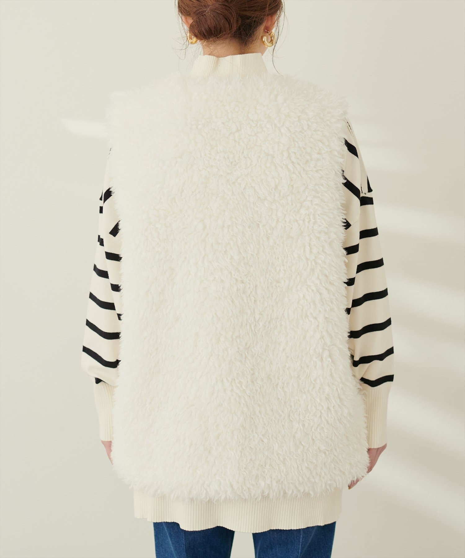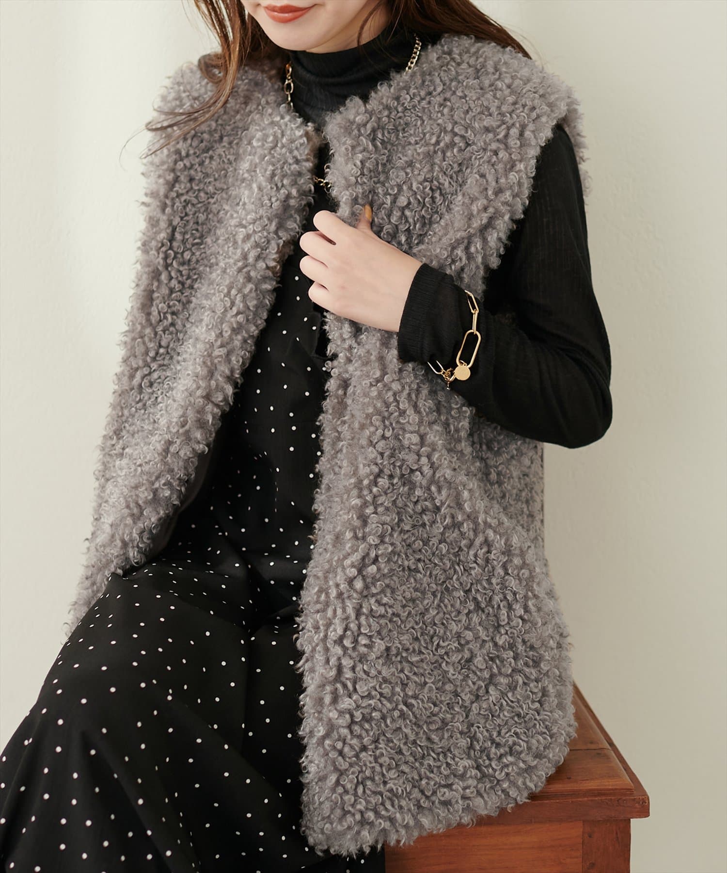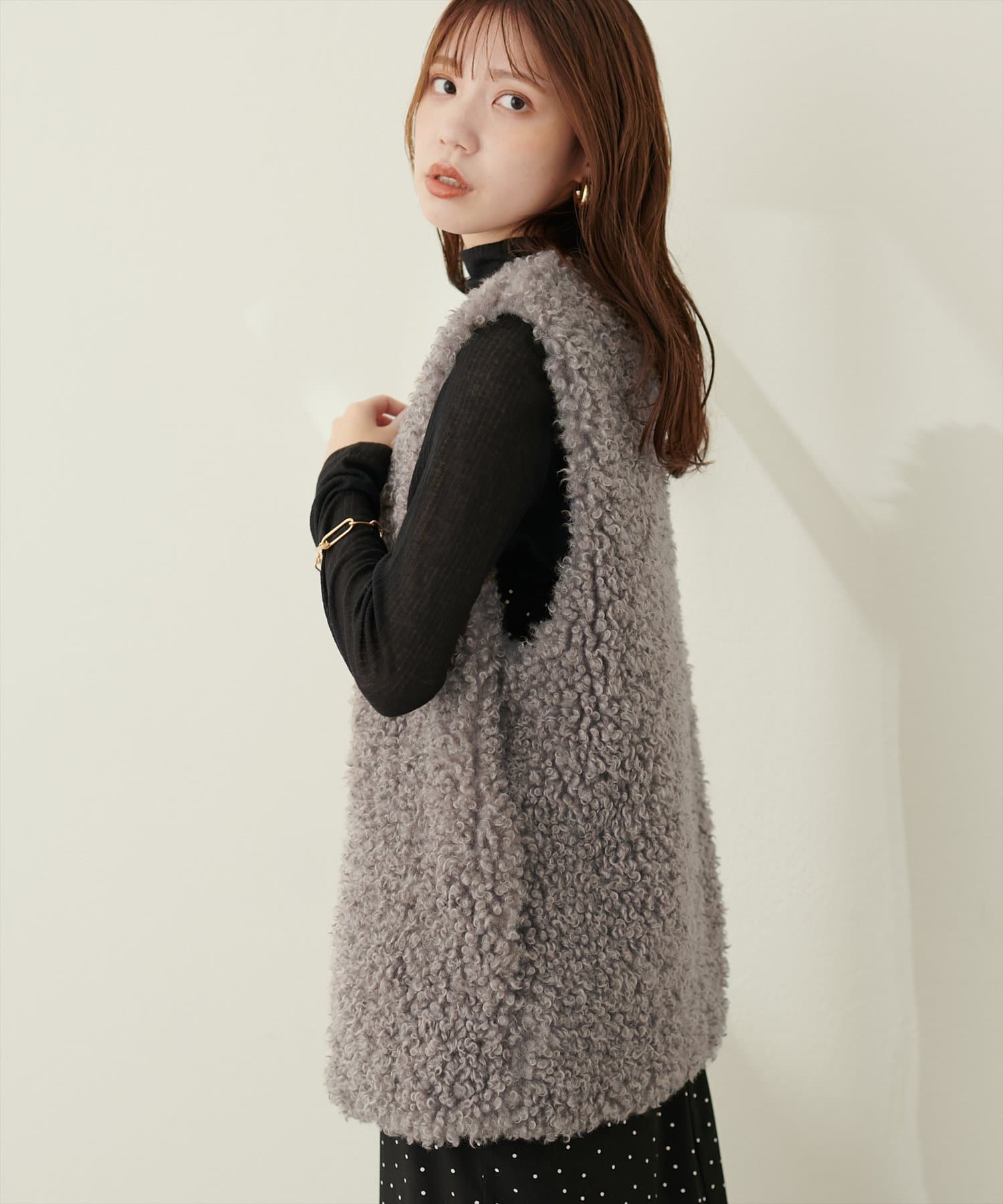 プードルのような柔らかな毛足のフェイクファーを仕様し、軽い着心地のベスト。