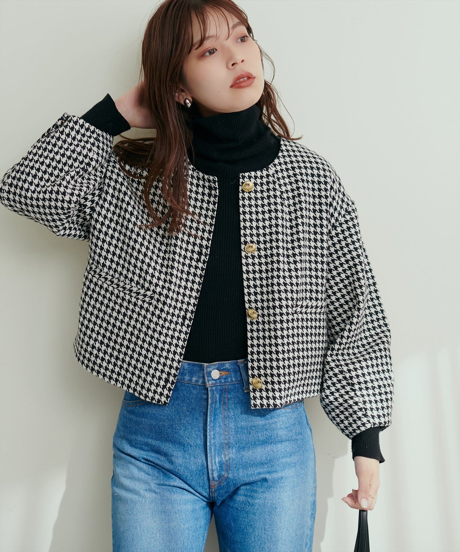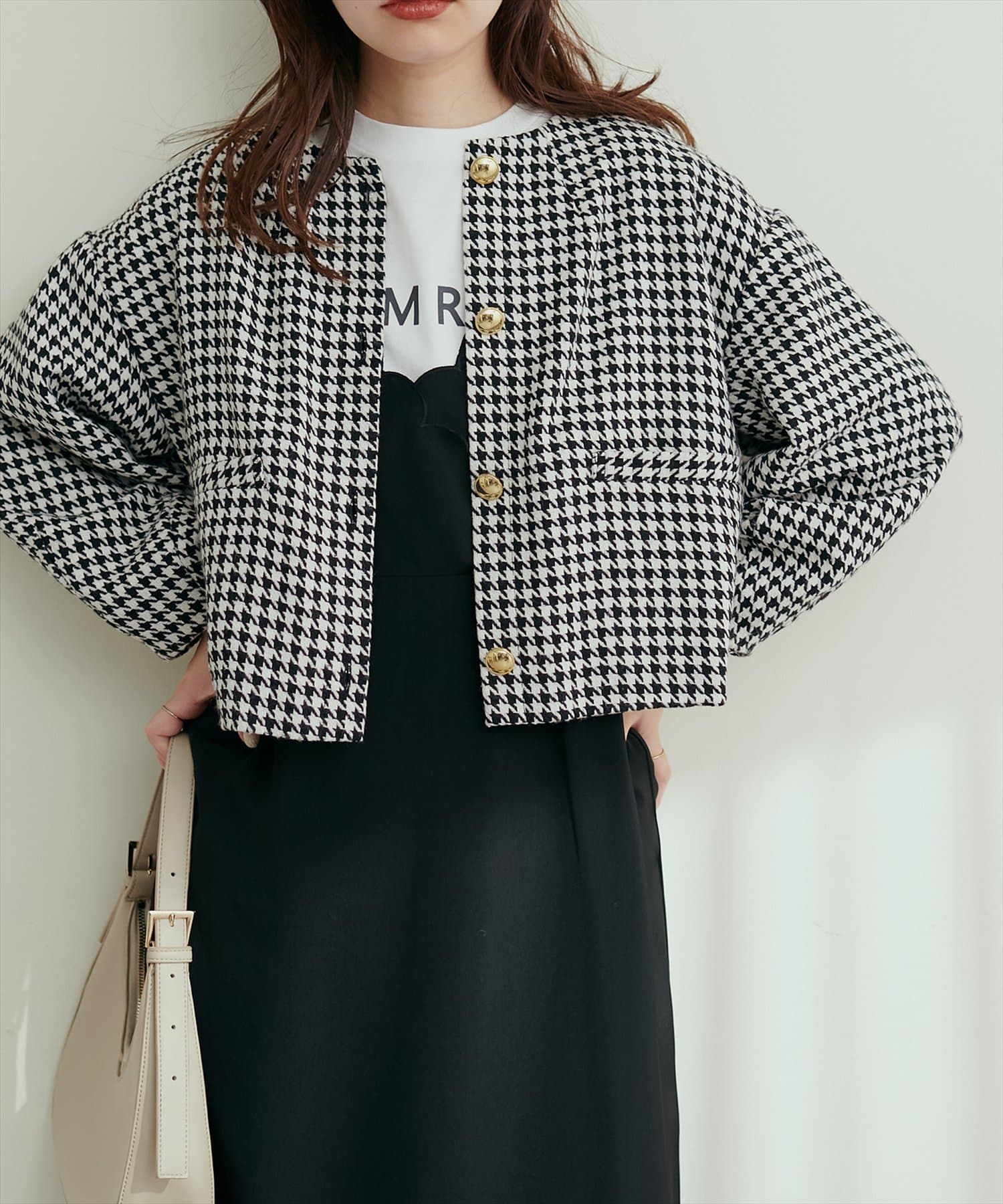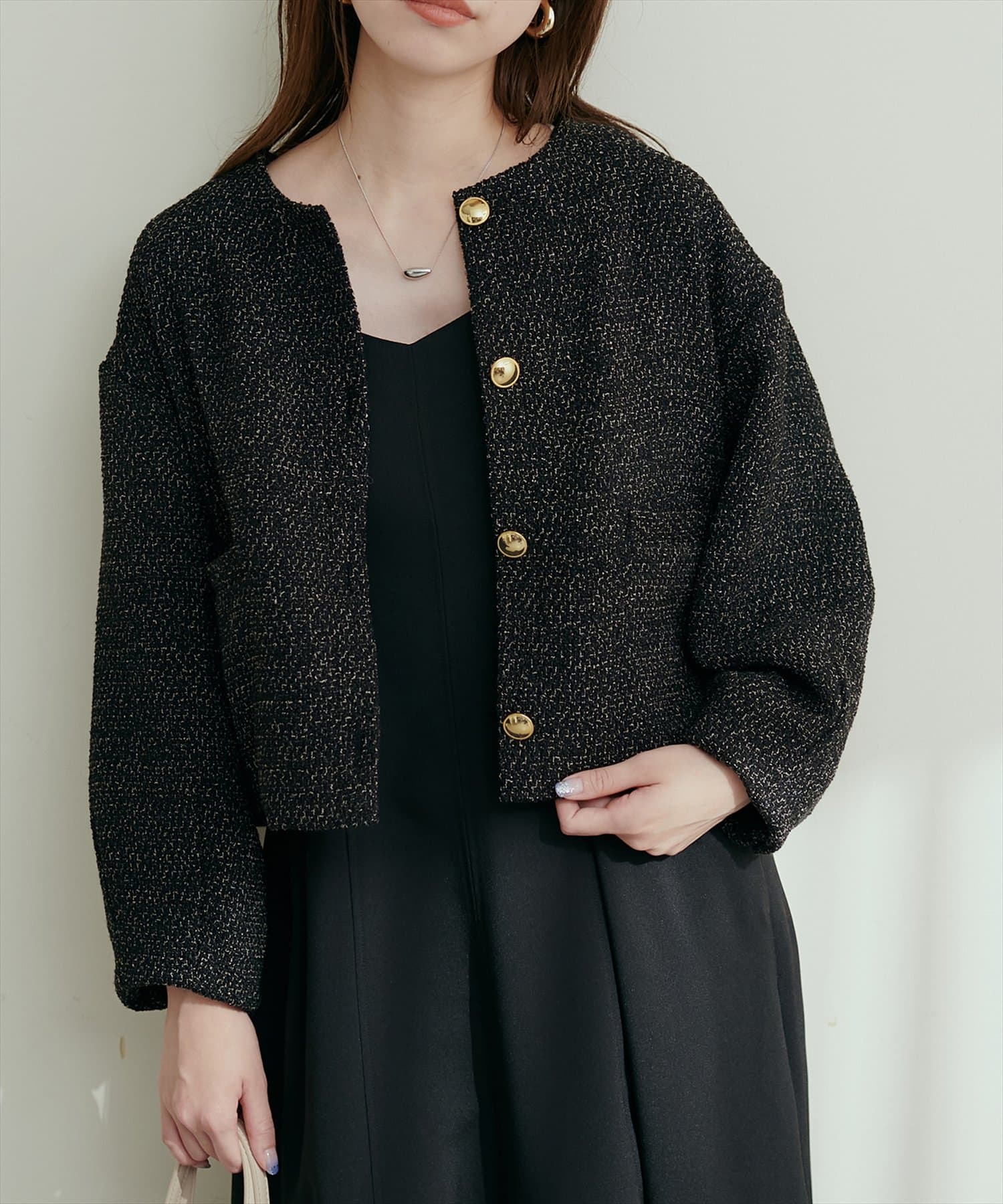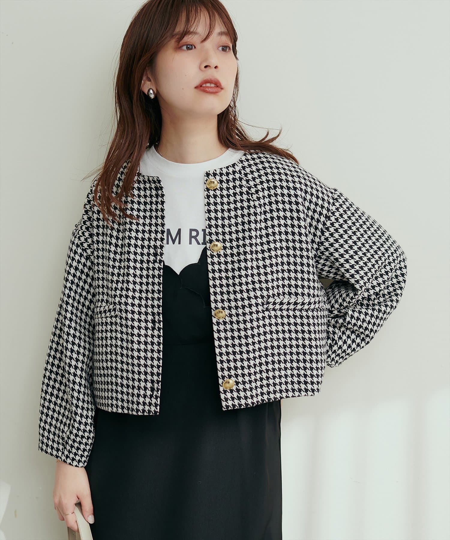 ノーカラーですっきり見えし、ショート丈でスタイルアップが叶う一枚です。
