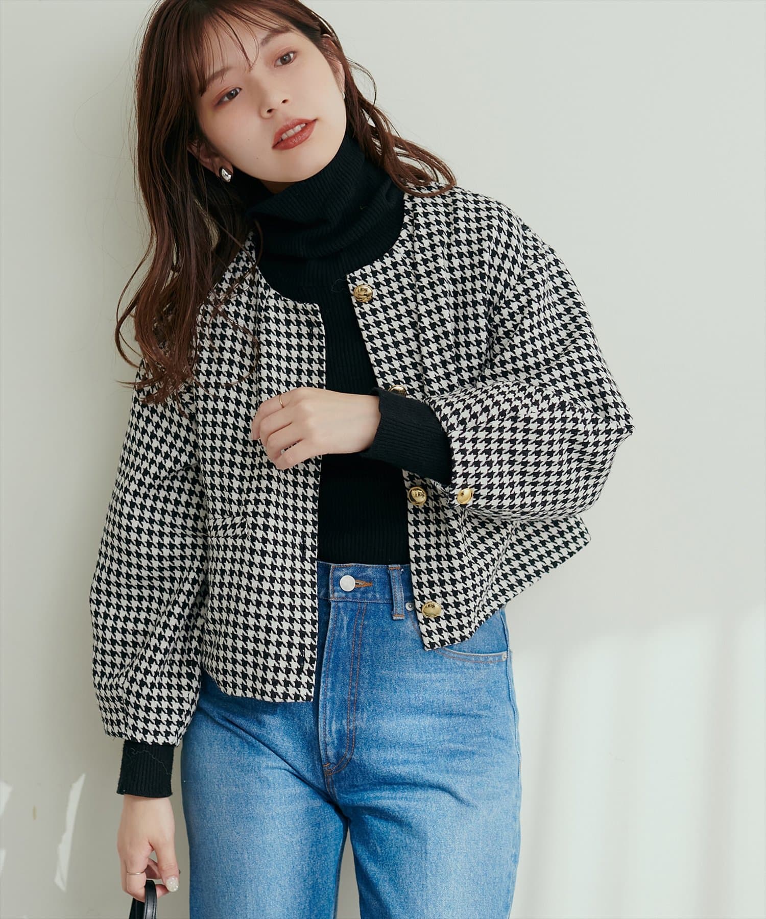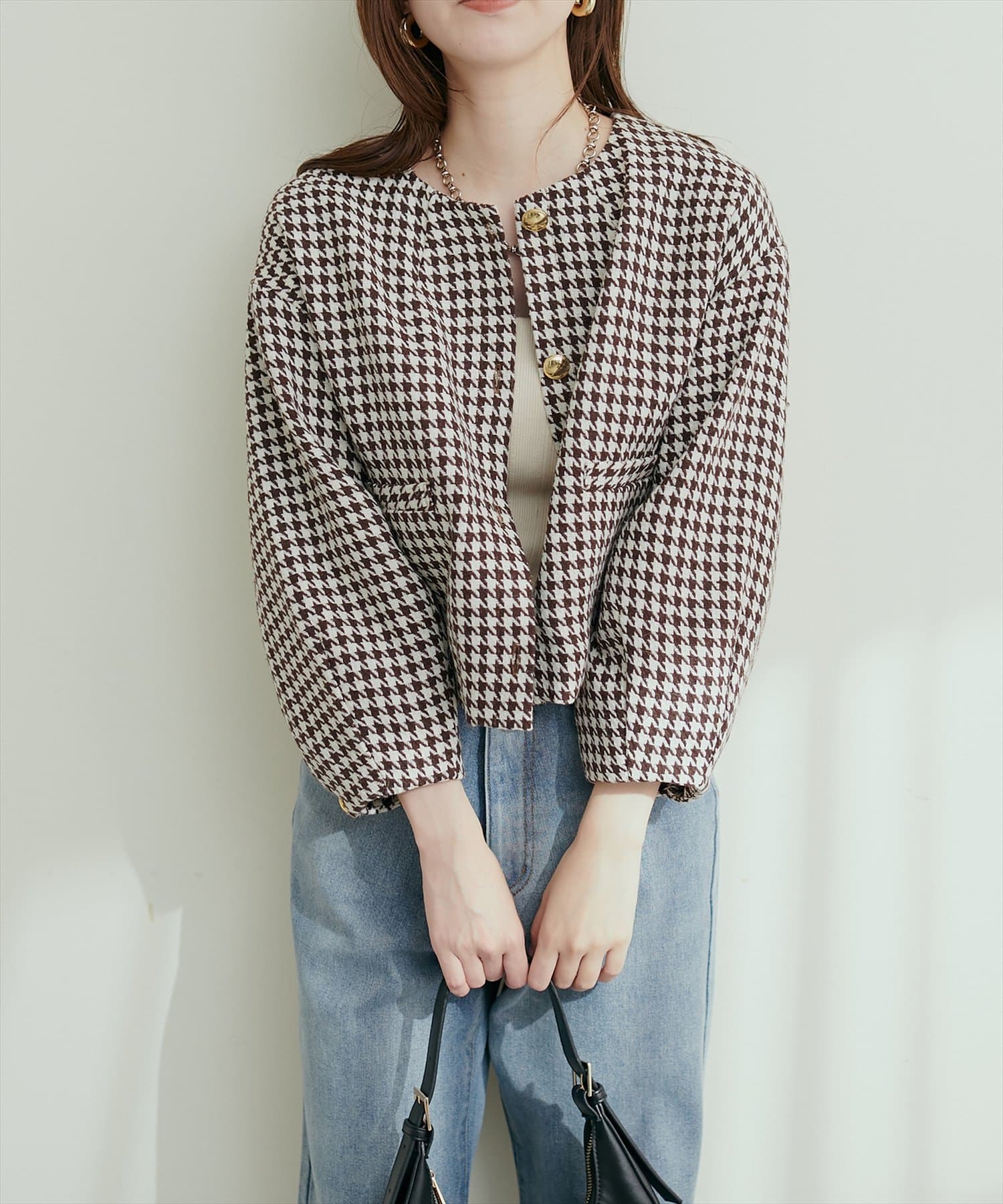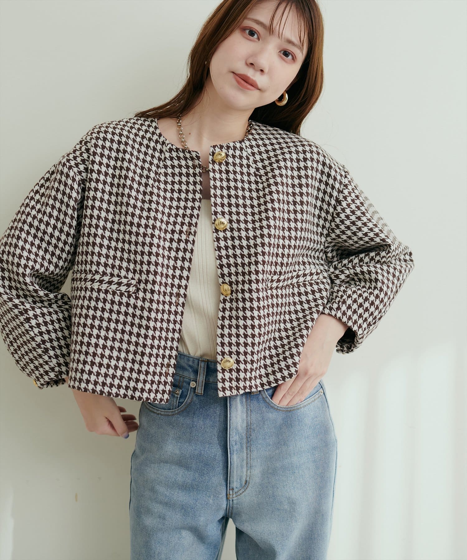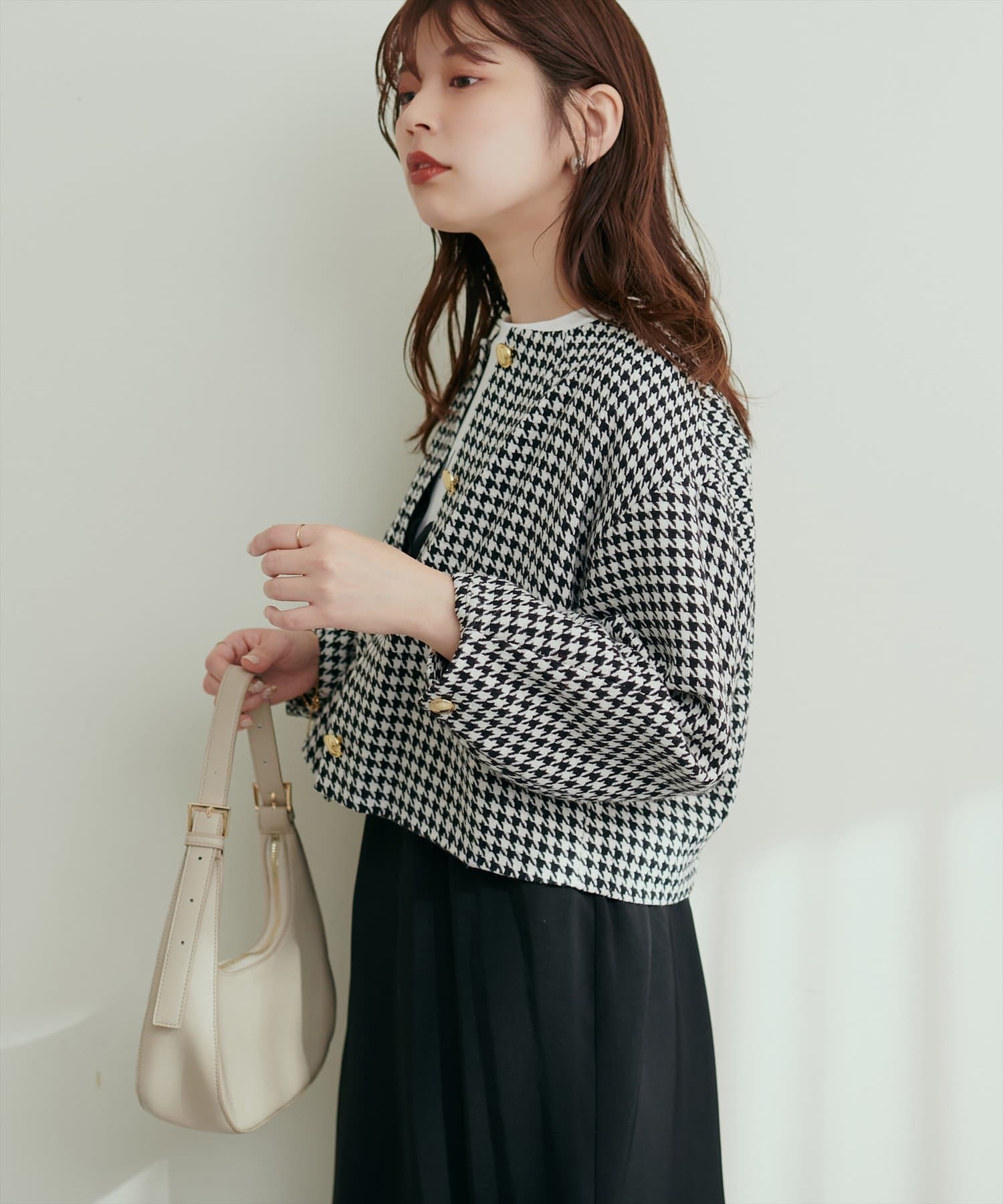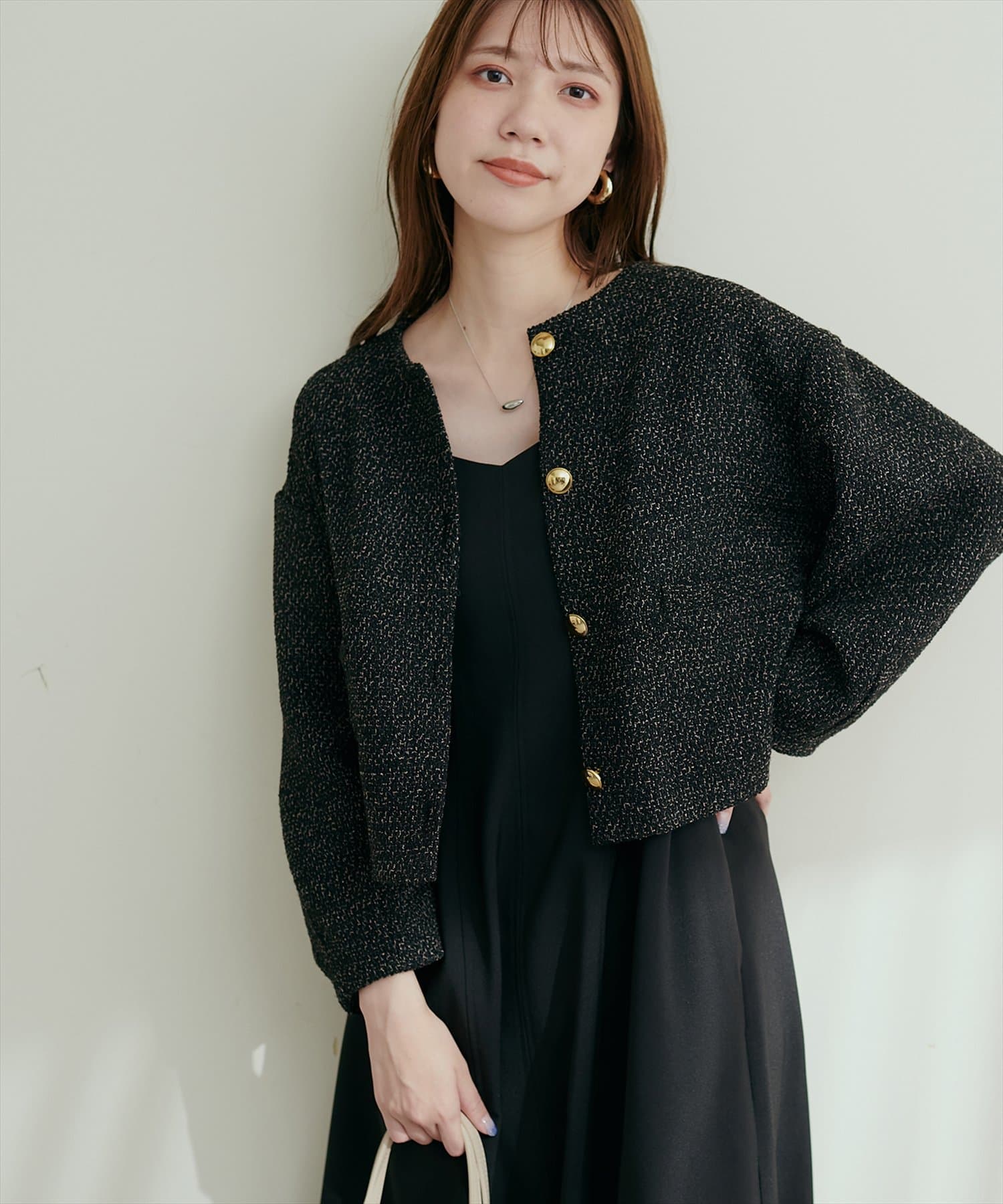 ノーカラーですっきり見えし、ショート丈でスタイルアップが叶う一枚です。