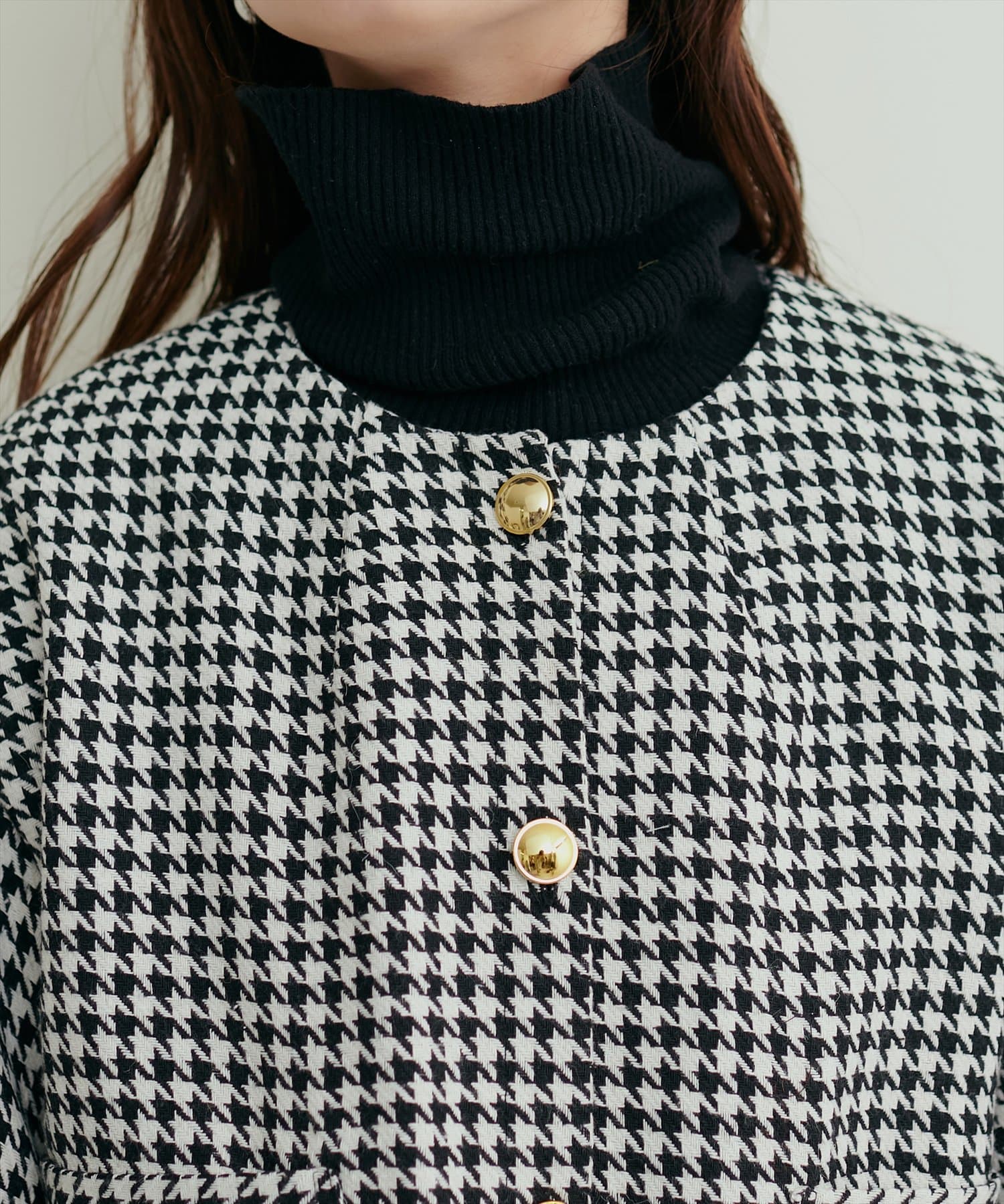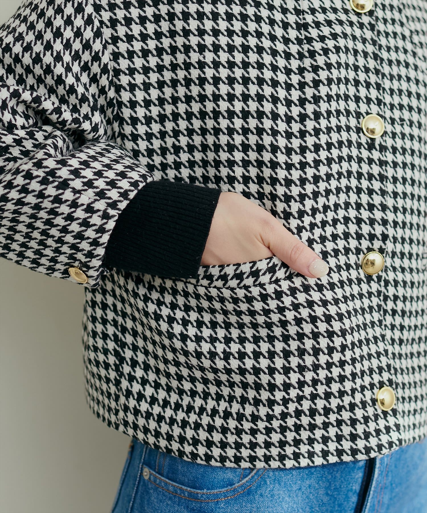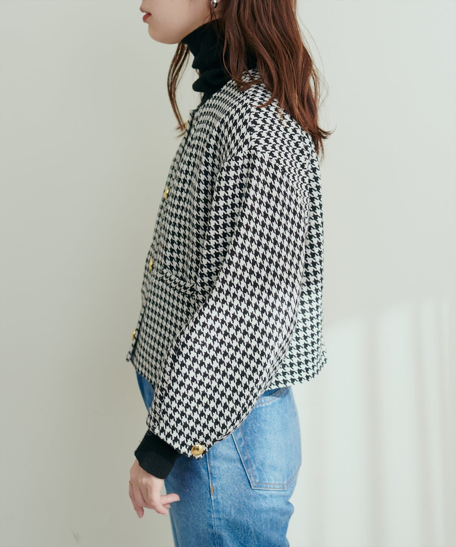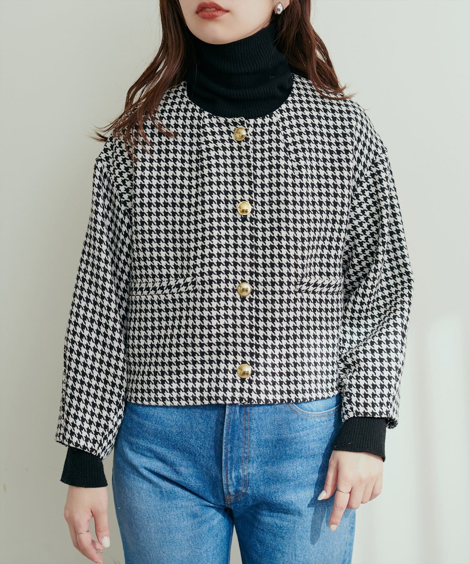 ノーカラーですっきり見えし、ショート丈でスタイルアップが叶う一枚です。