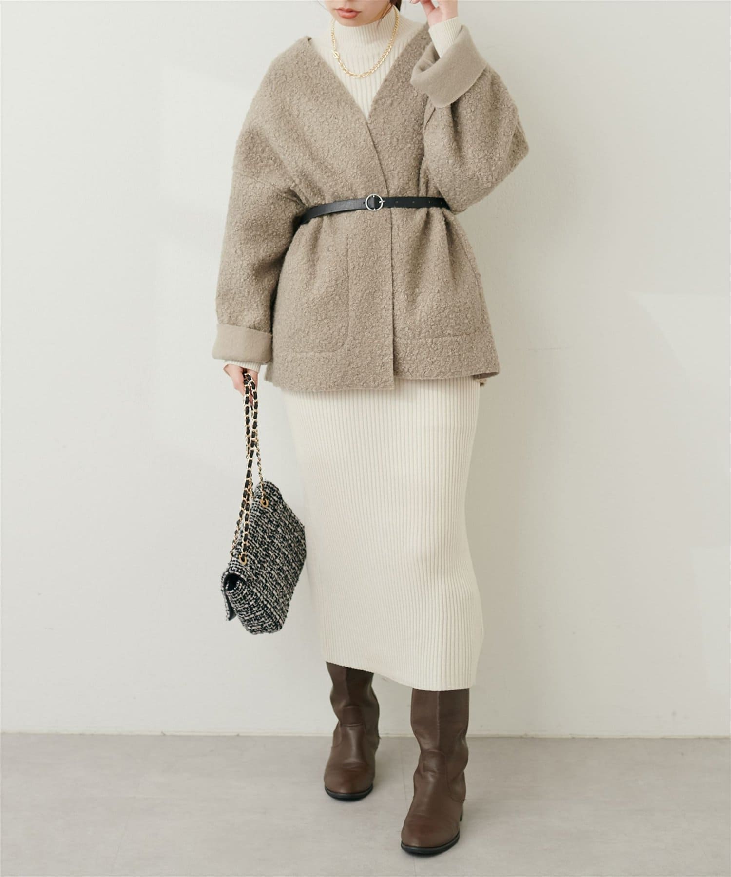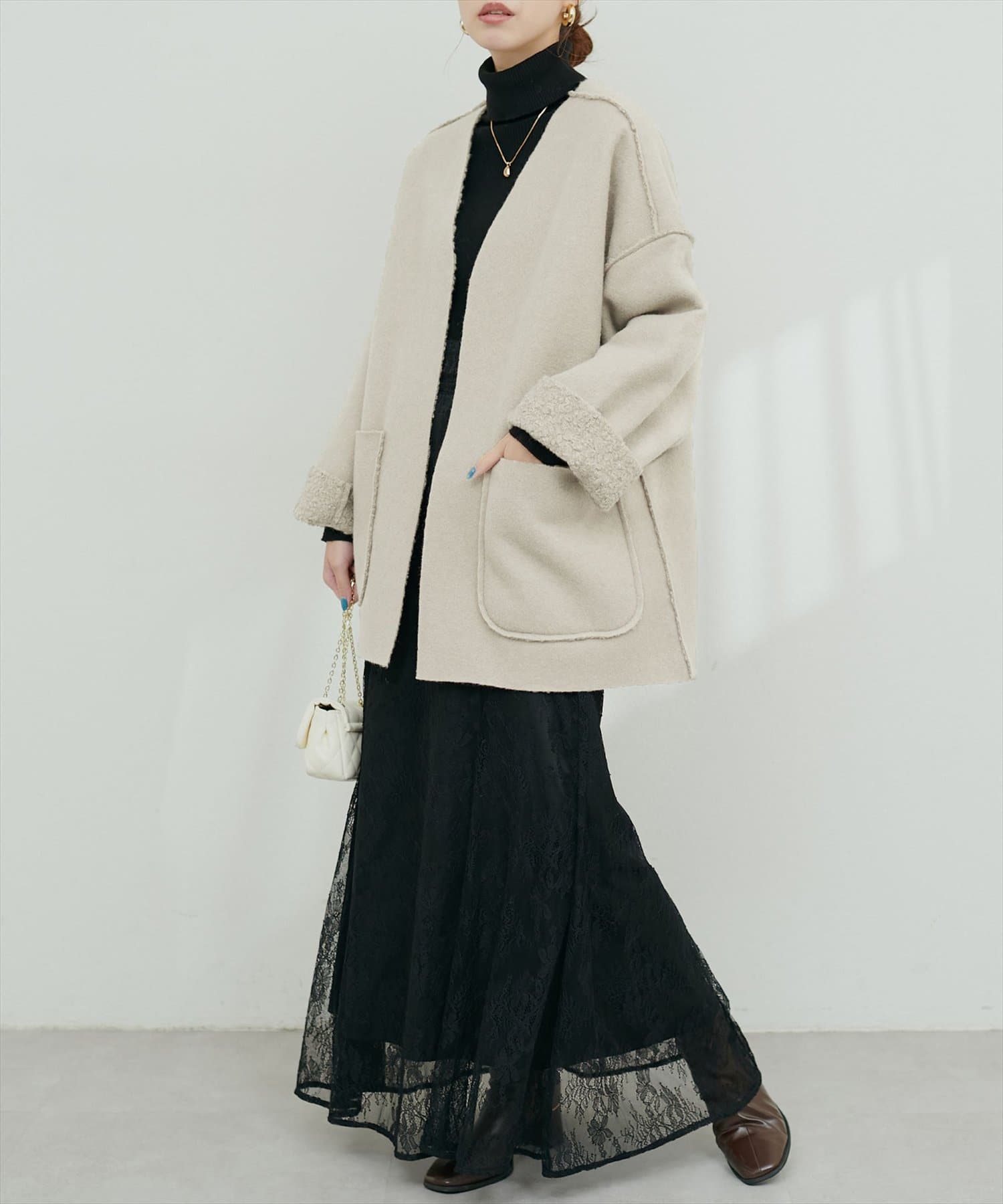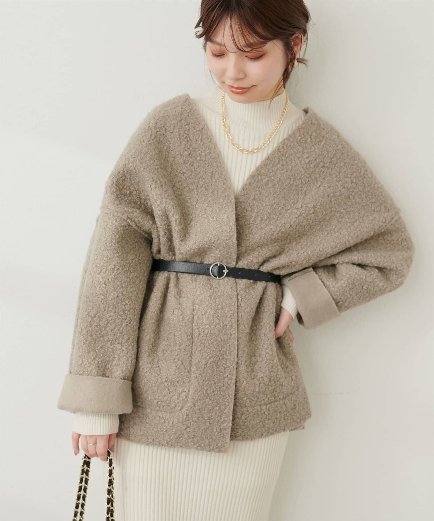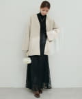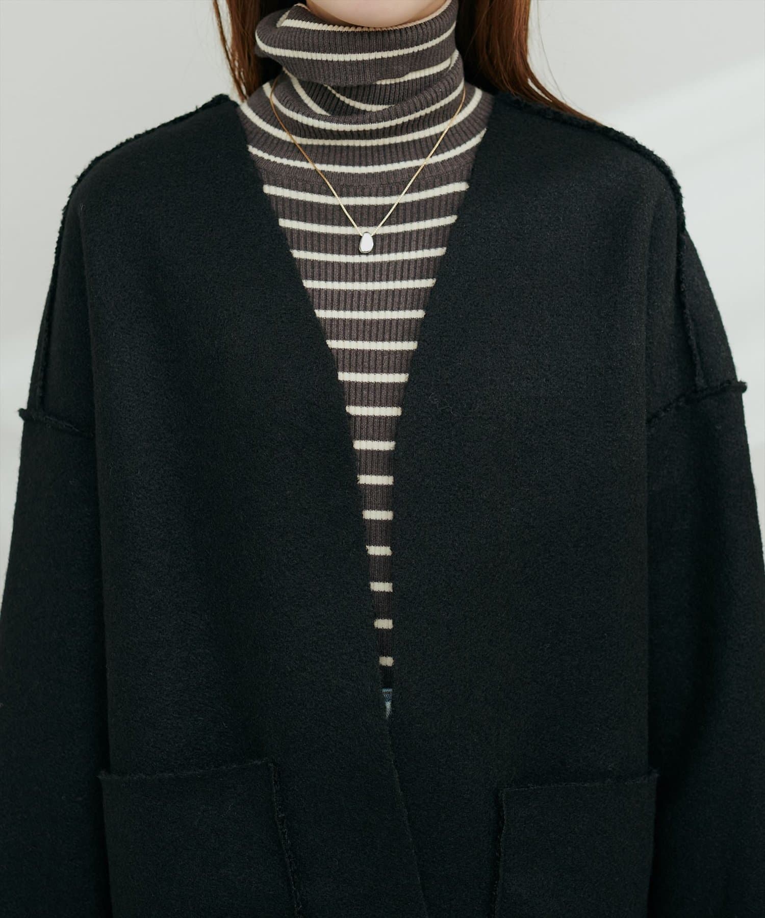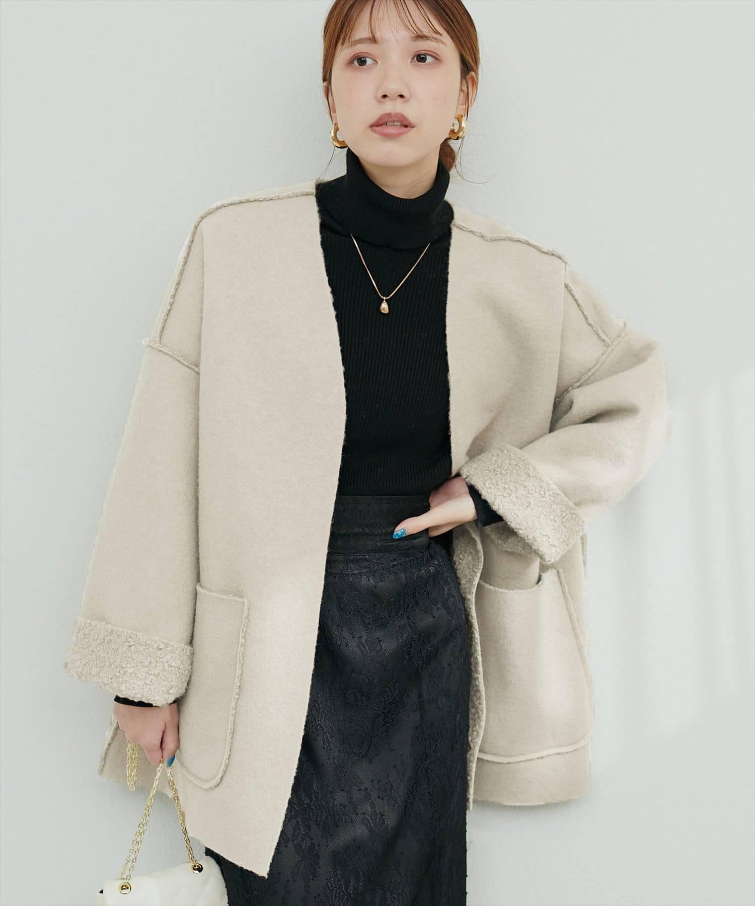 ノーカラーデザインなので、タートルネックニットやマフラーとの相性も抜群です。