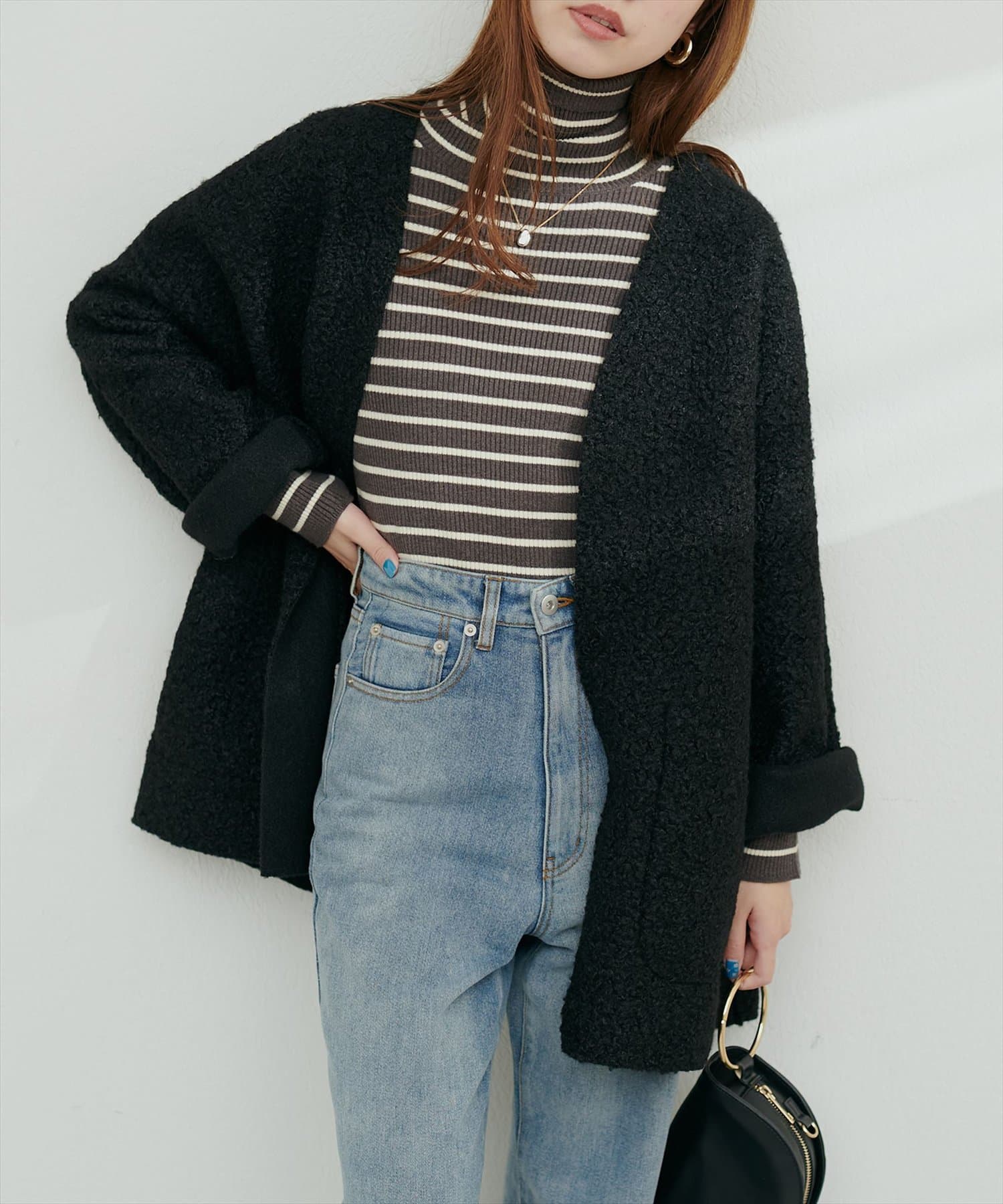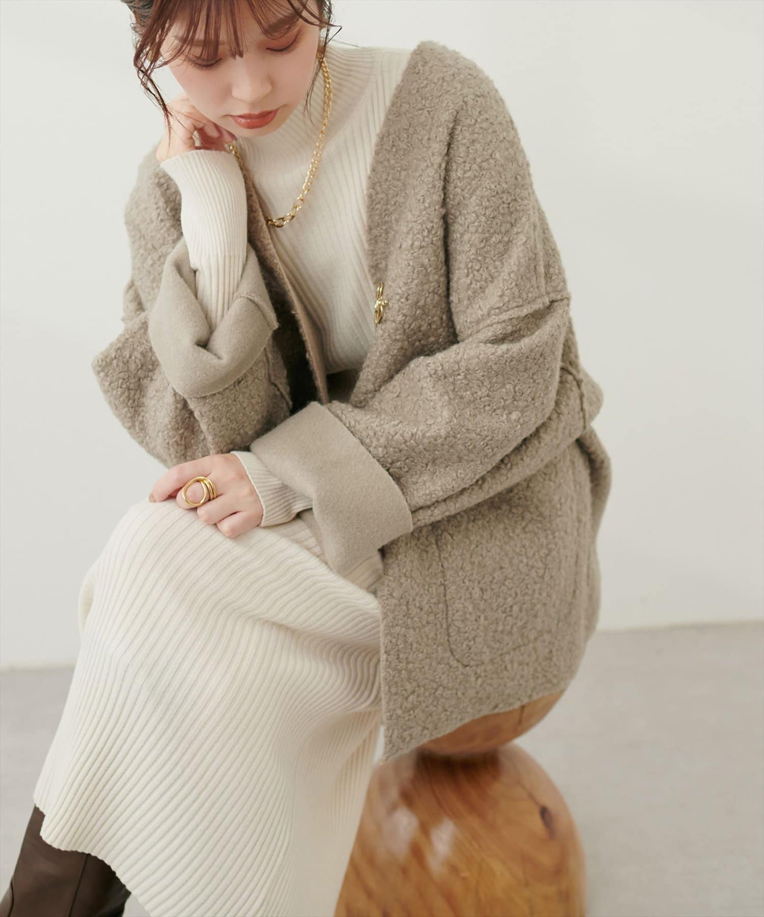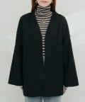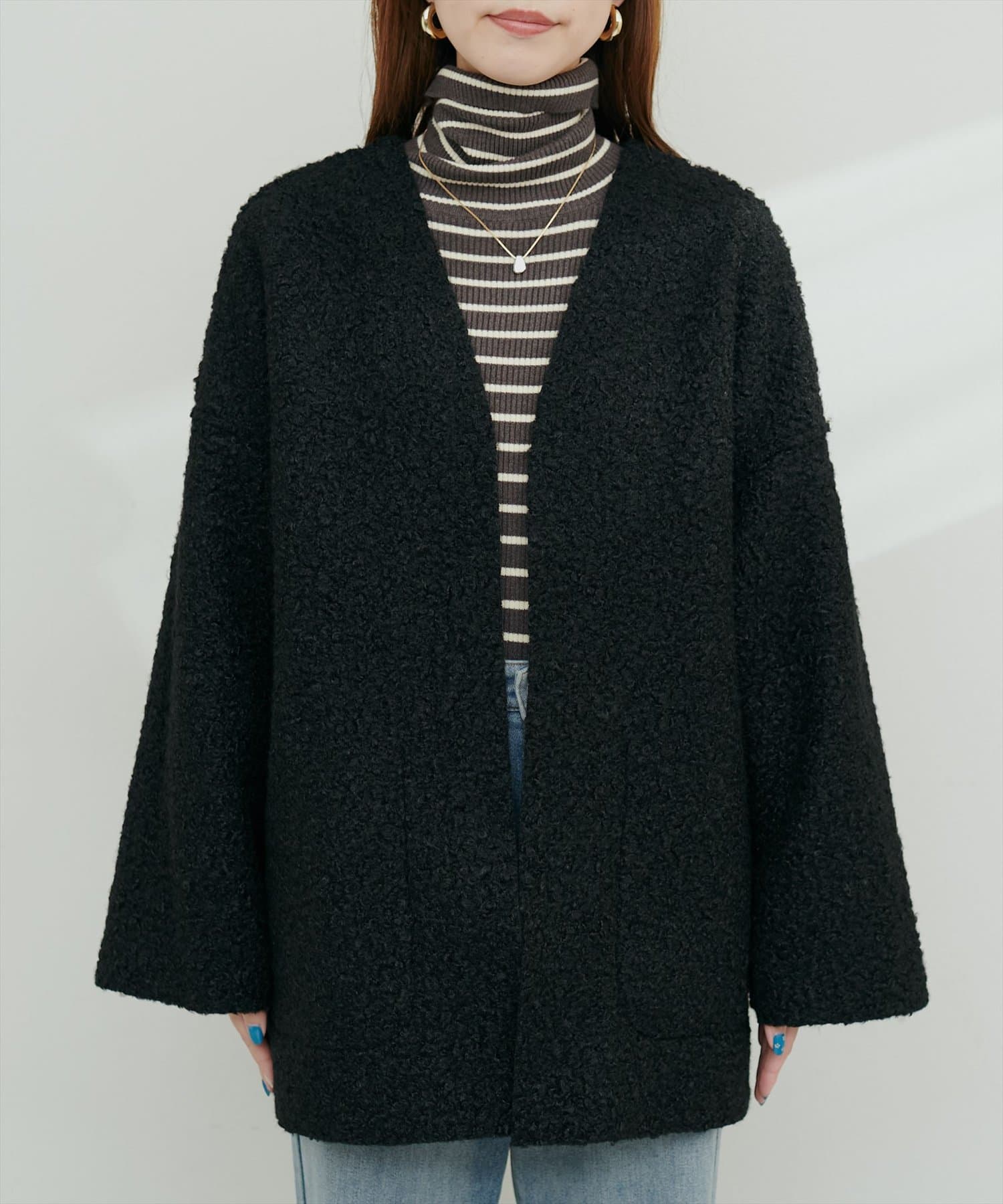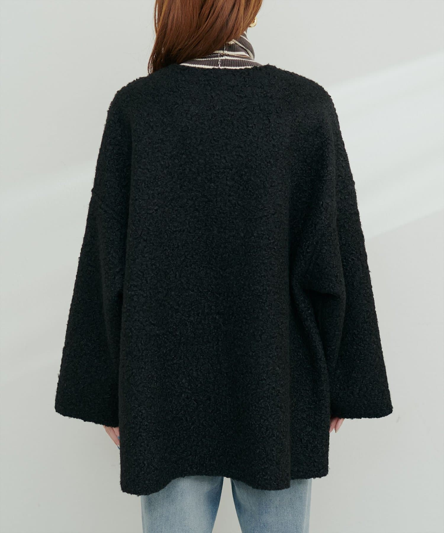 くるんとカールした表情豊かなフェイクリングウールのトッパーカーディガン。