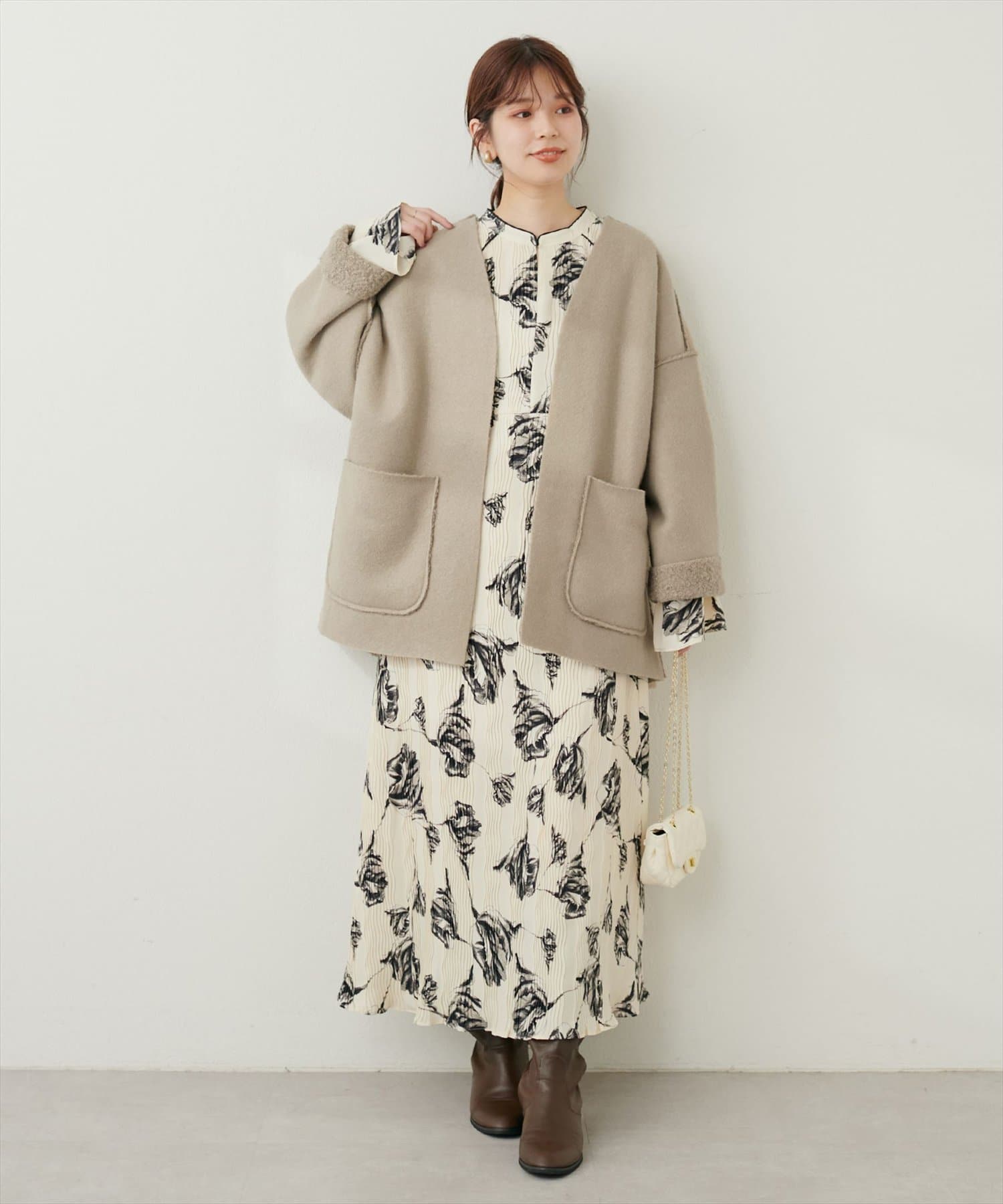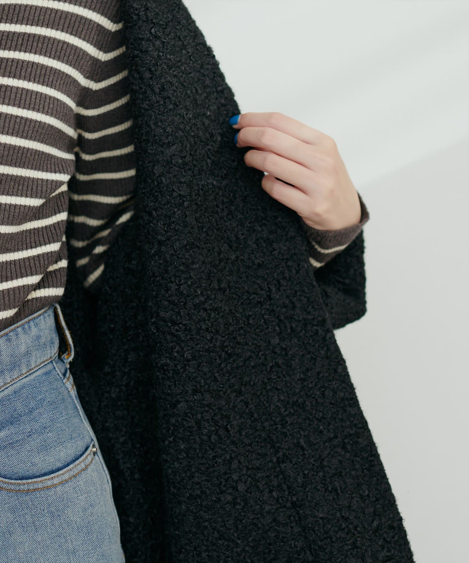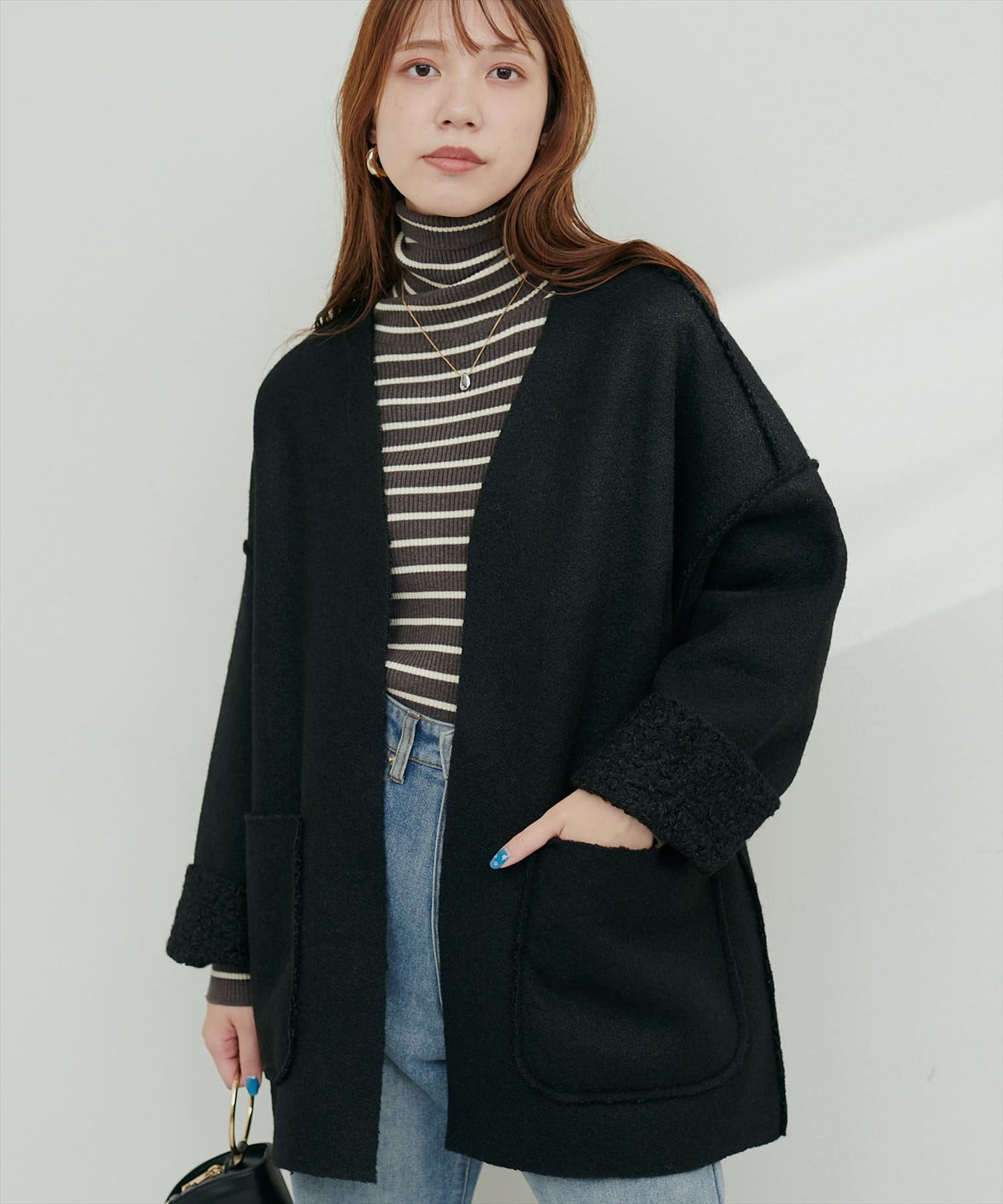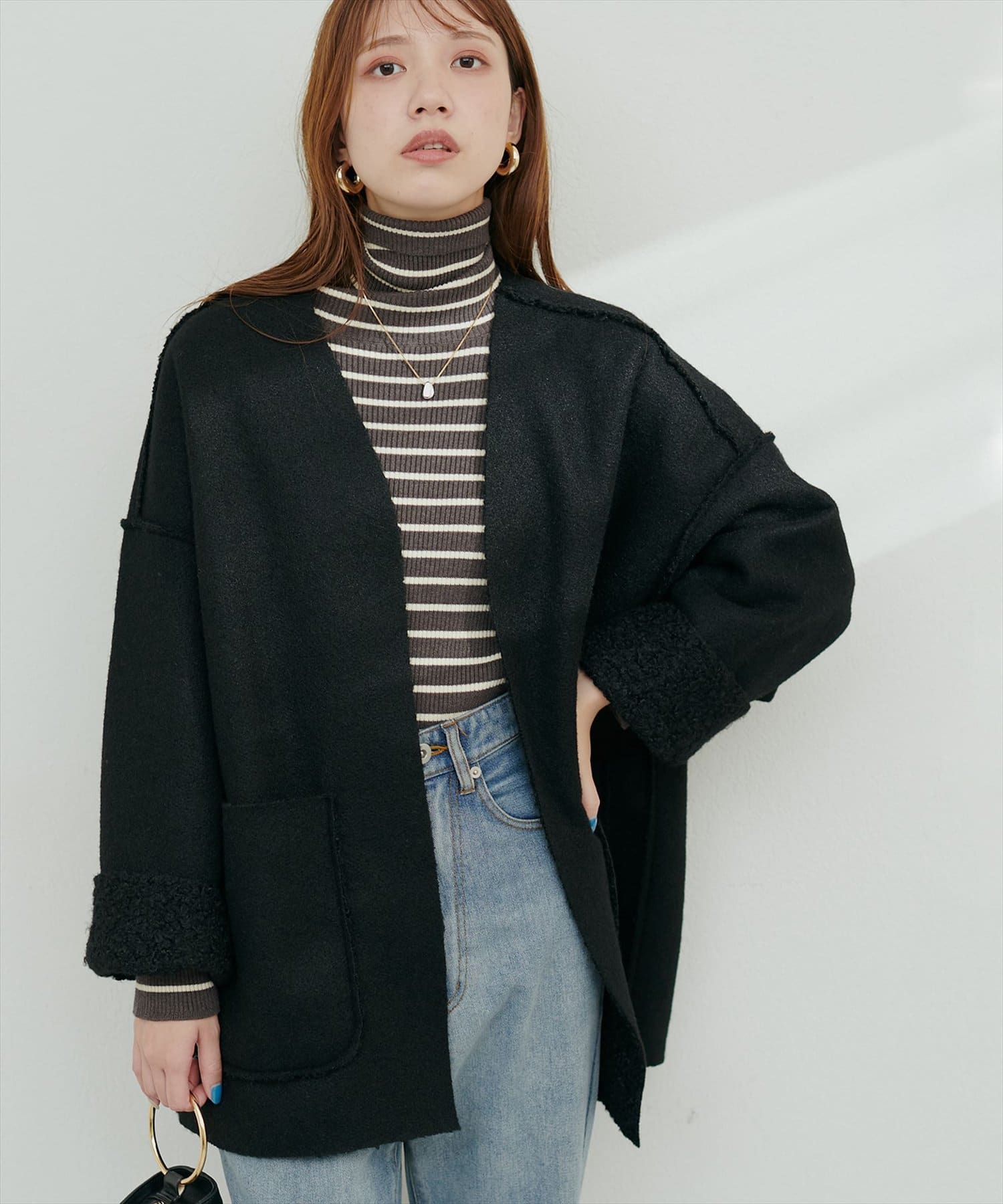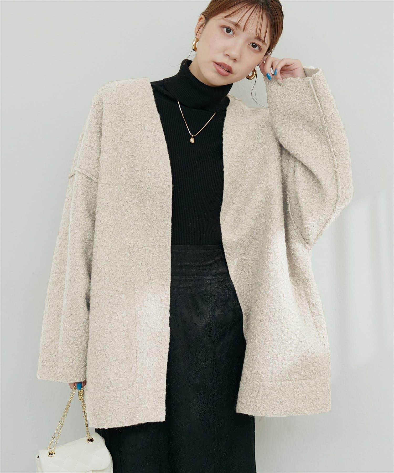 くるんとカールした表情豊かなフェイクリングウールのトッパーカーディガン。