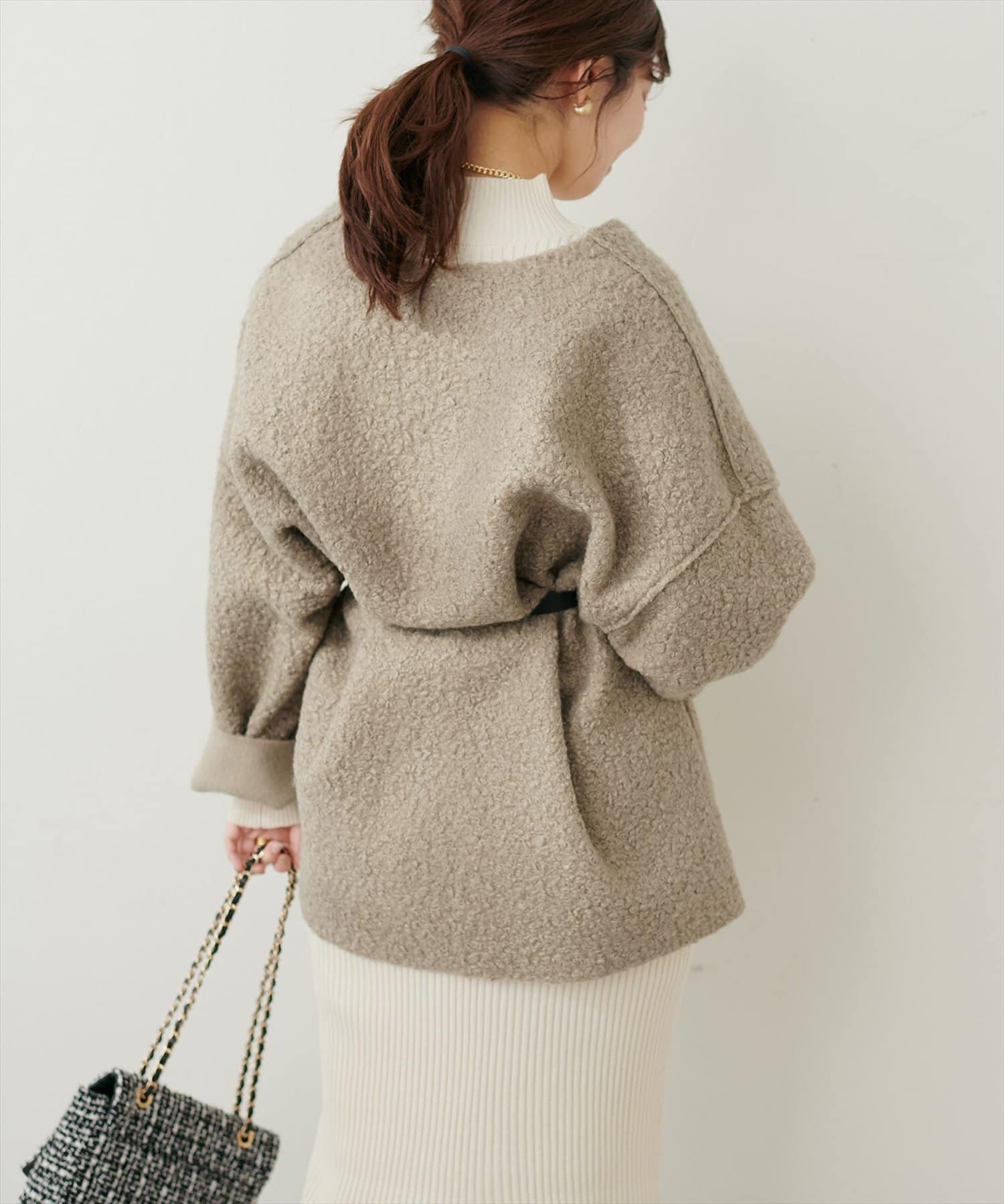 ルーズに羽織り、少し背中側に落として着ると抜け感が出てこなれたスタイルに。