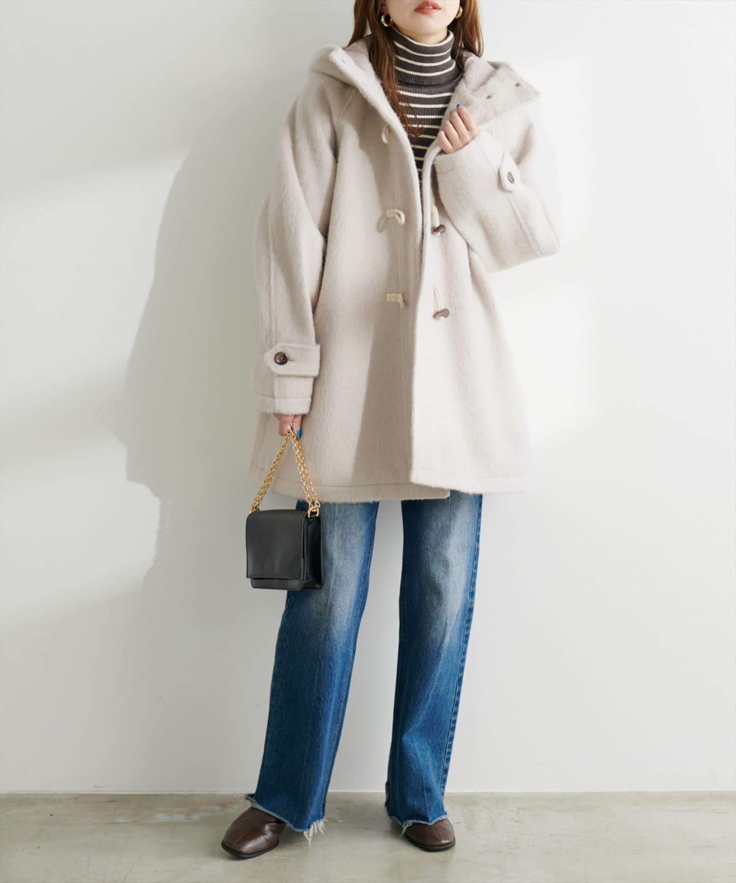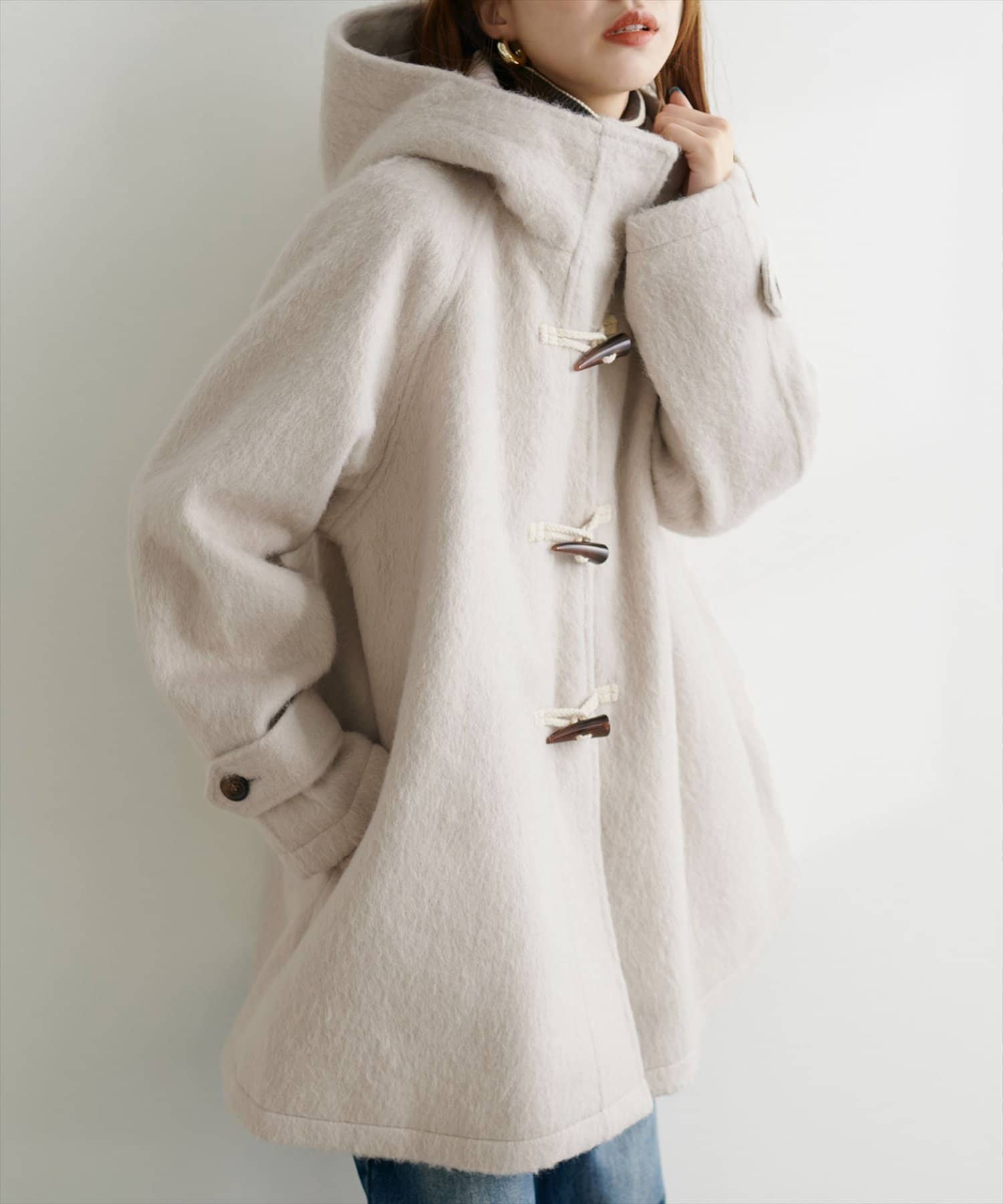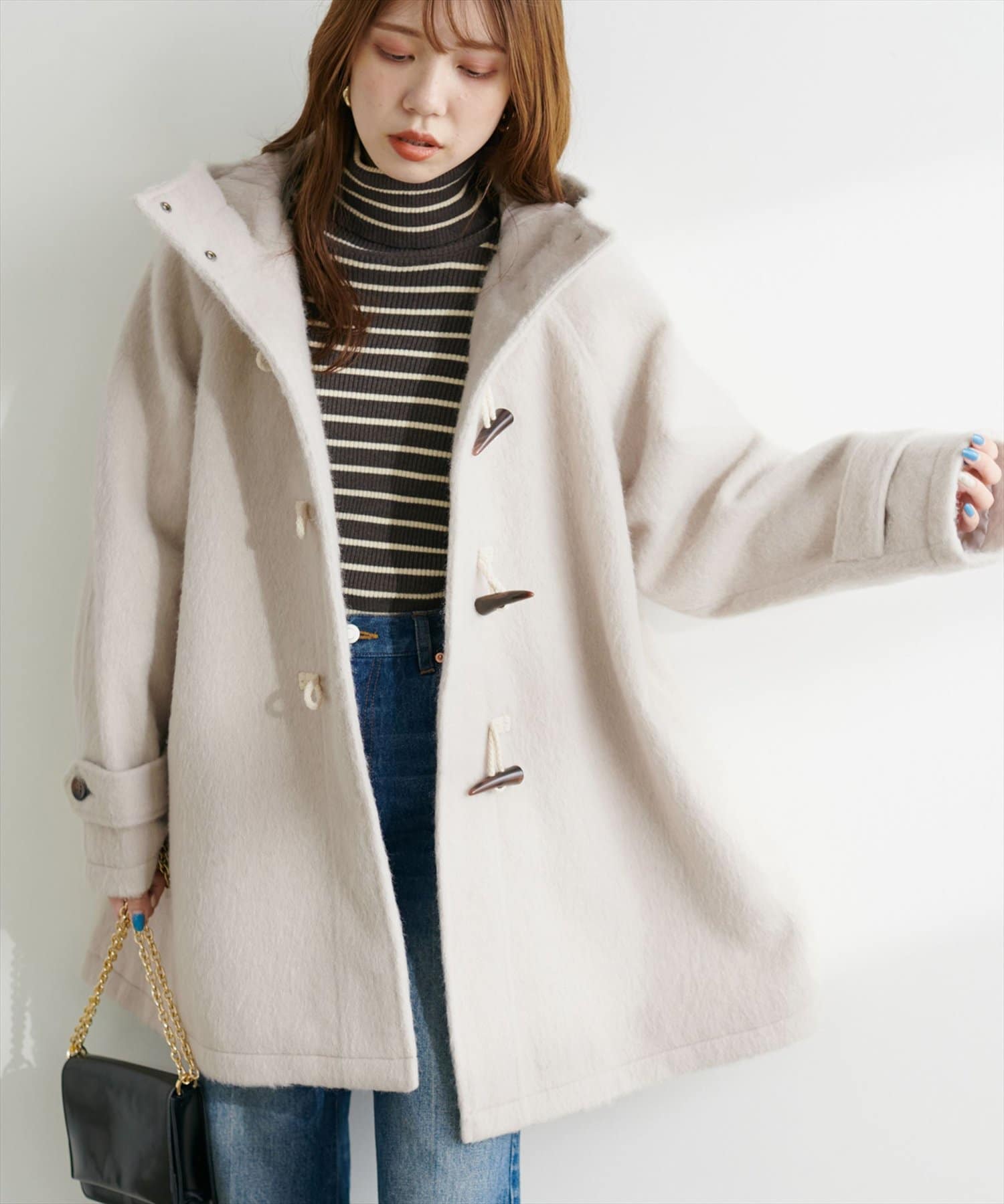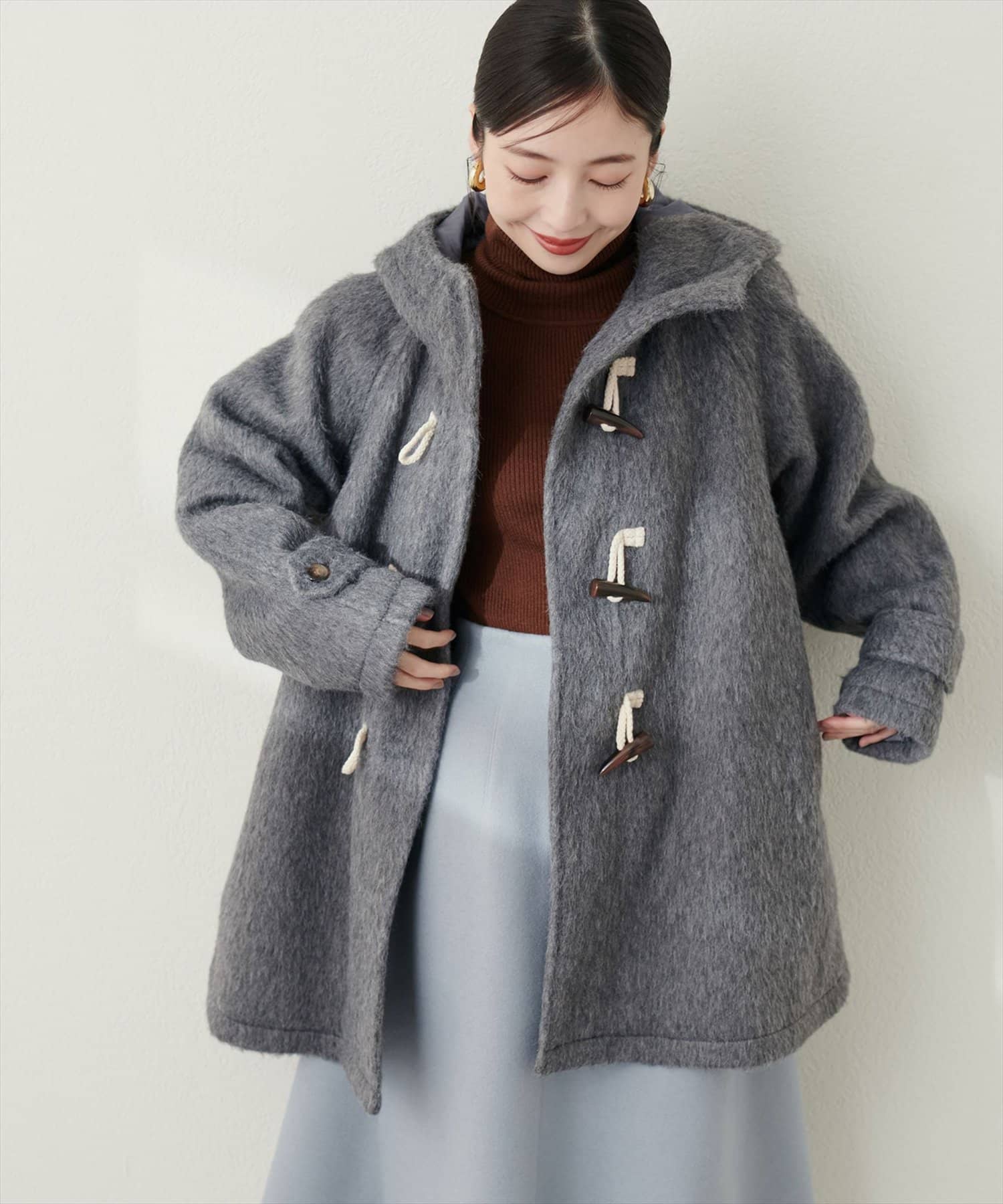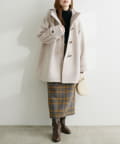 クラシカルな雰囲気が漂うダッフルコートをゆったりとしたサイジングで仕上げ、トレンド感をアップさせた1着。