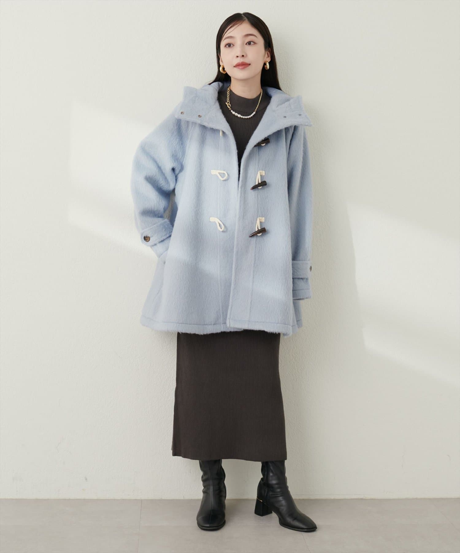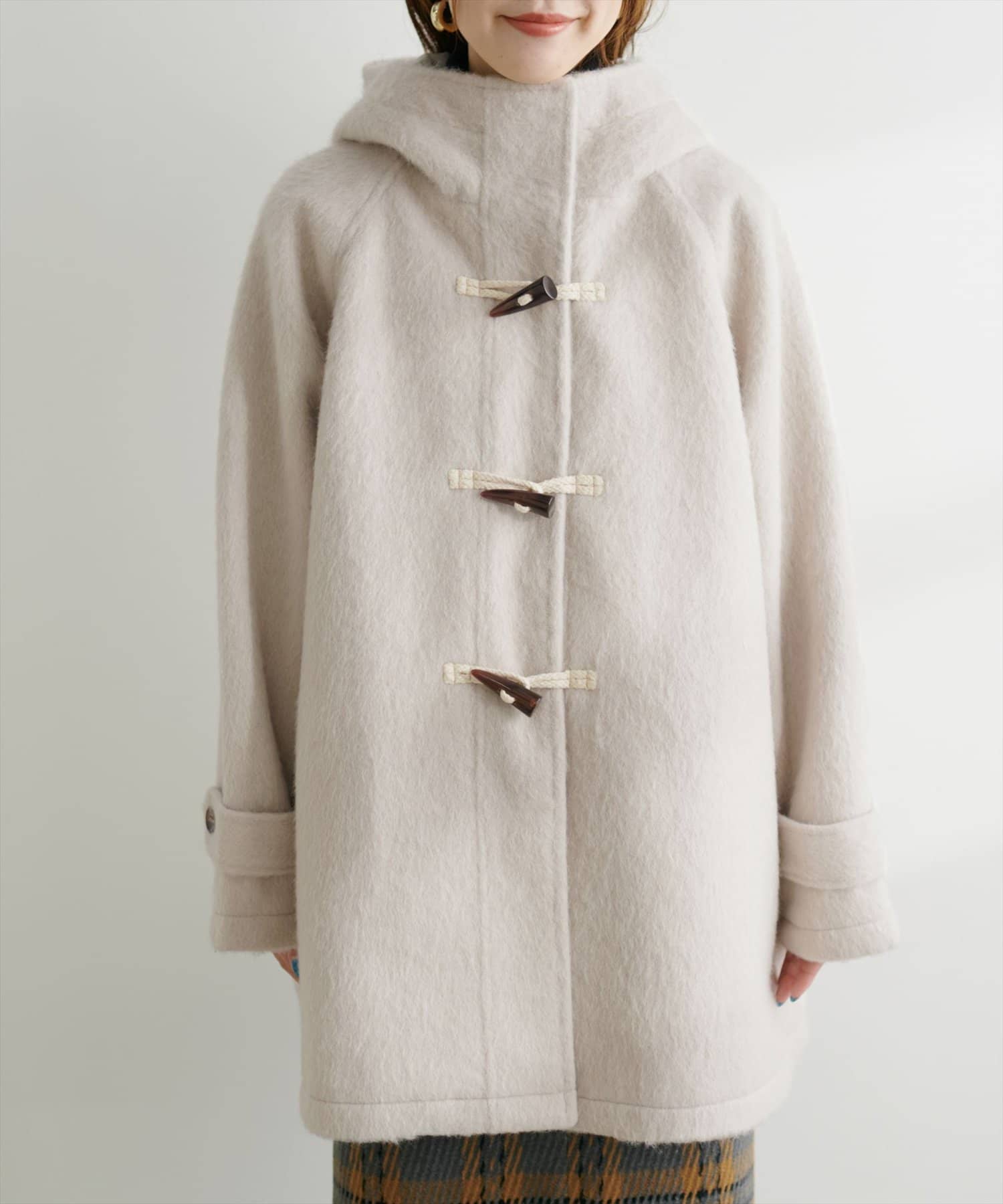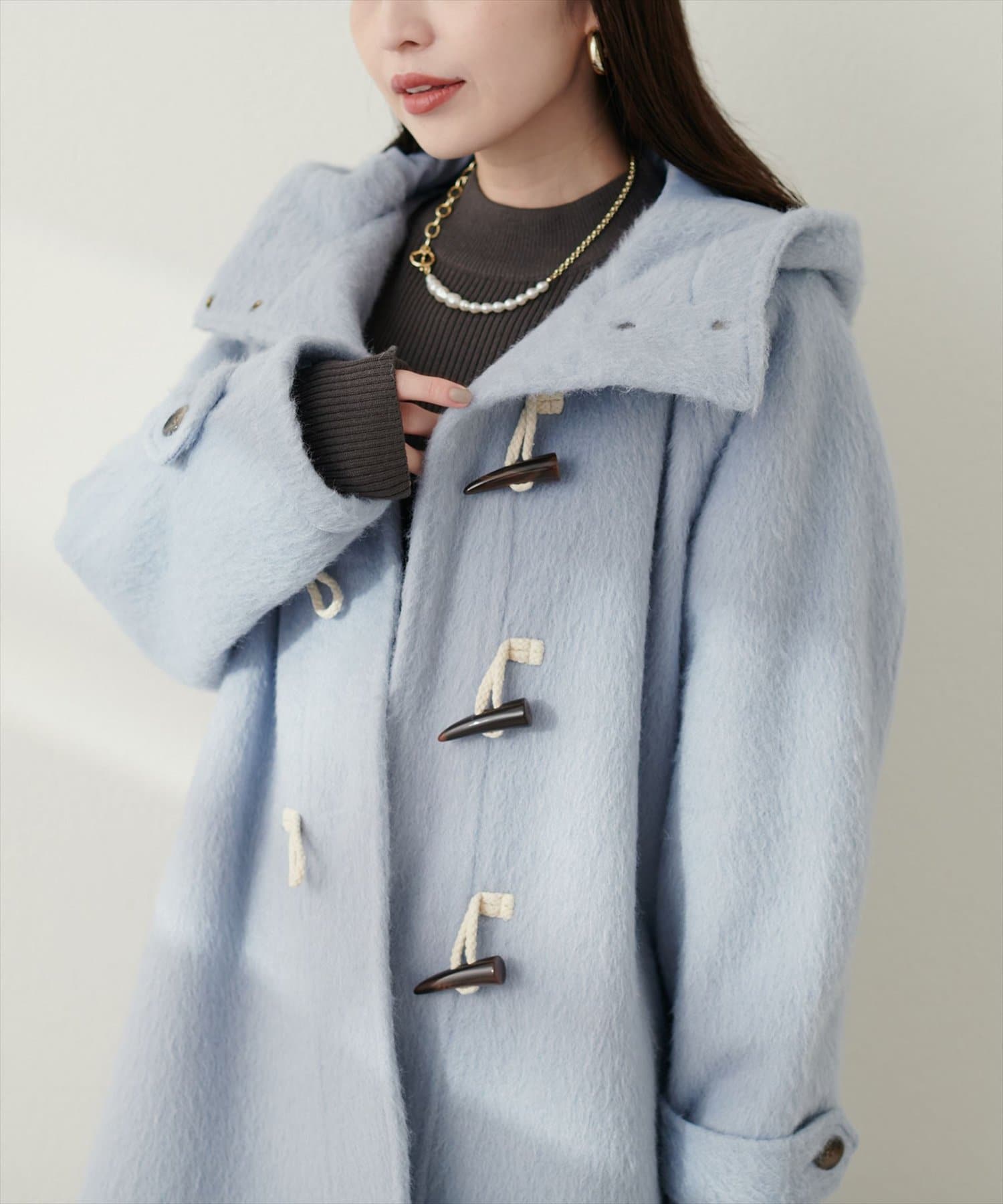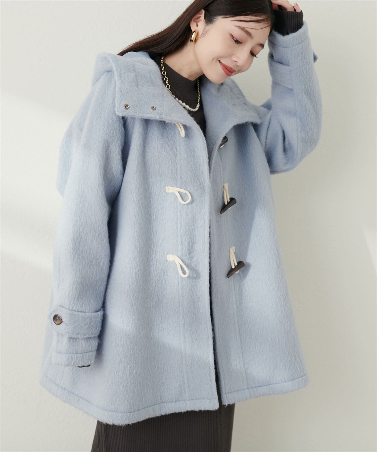 トレンドに左右されずスタイリングを選ばない定番のダッフルコートに、今季注目のシャギー素材を掛け合わせた主役級アウター。