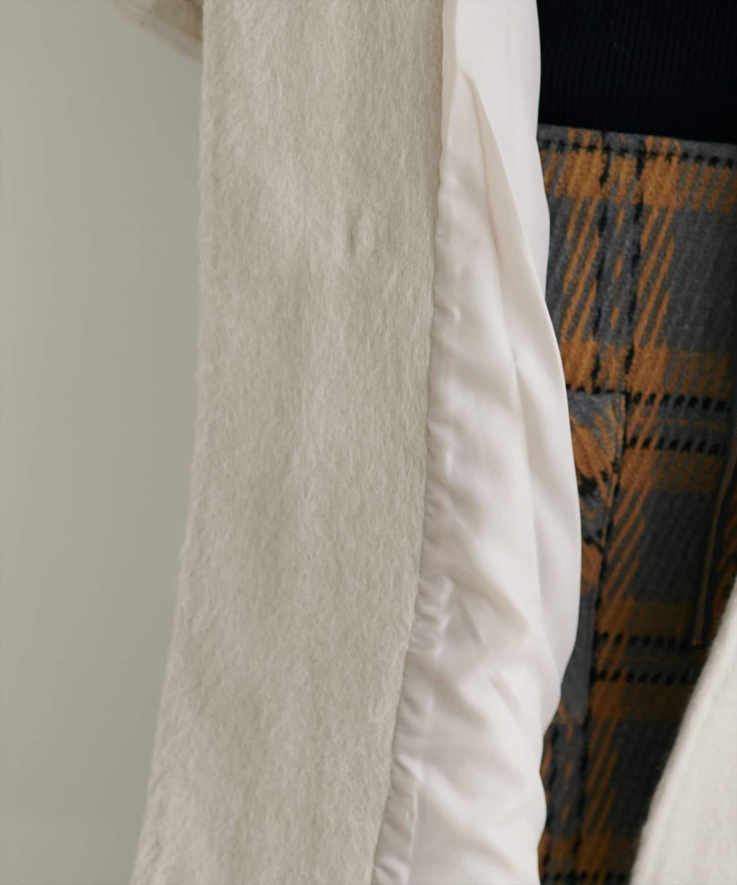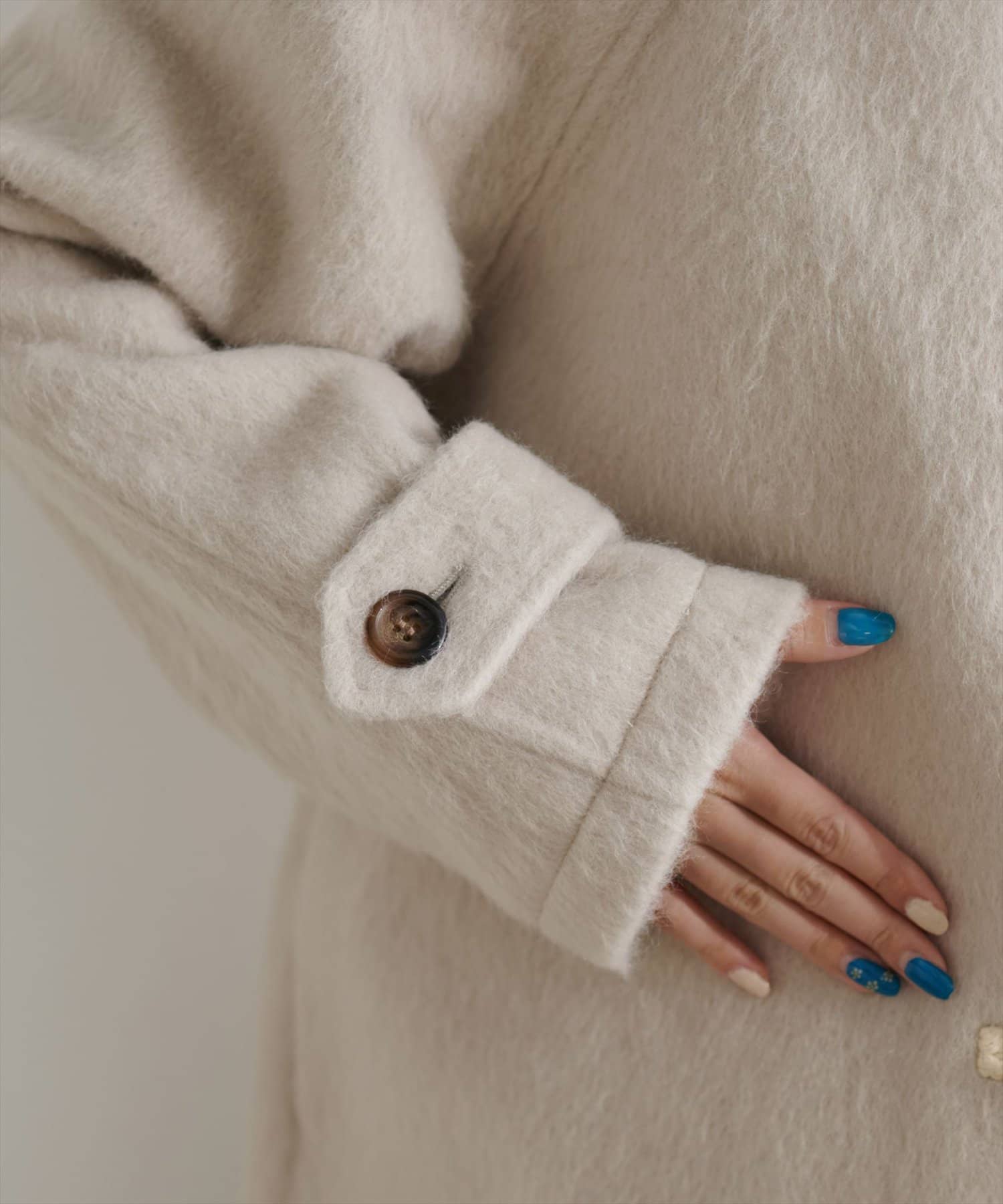 毛足があり柔らかな質感のシャギー素材を使用し、重いイメージになりがちな冬のアウターを軽やかな印象に。