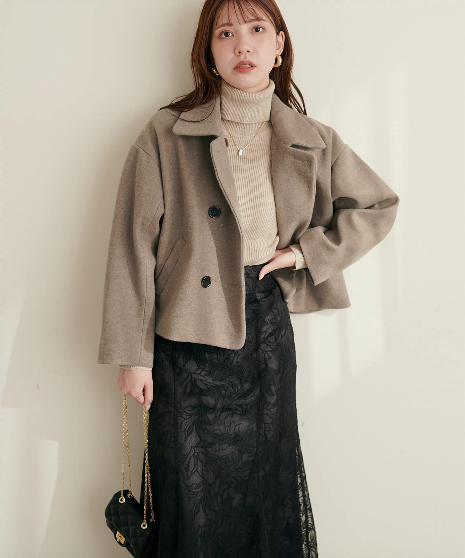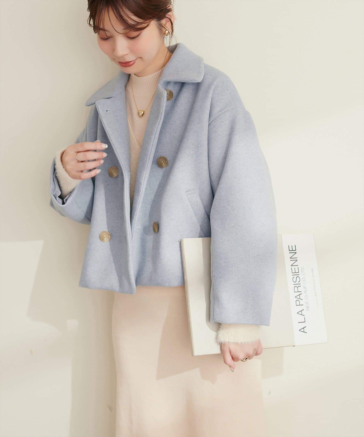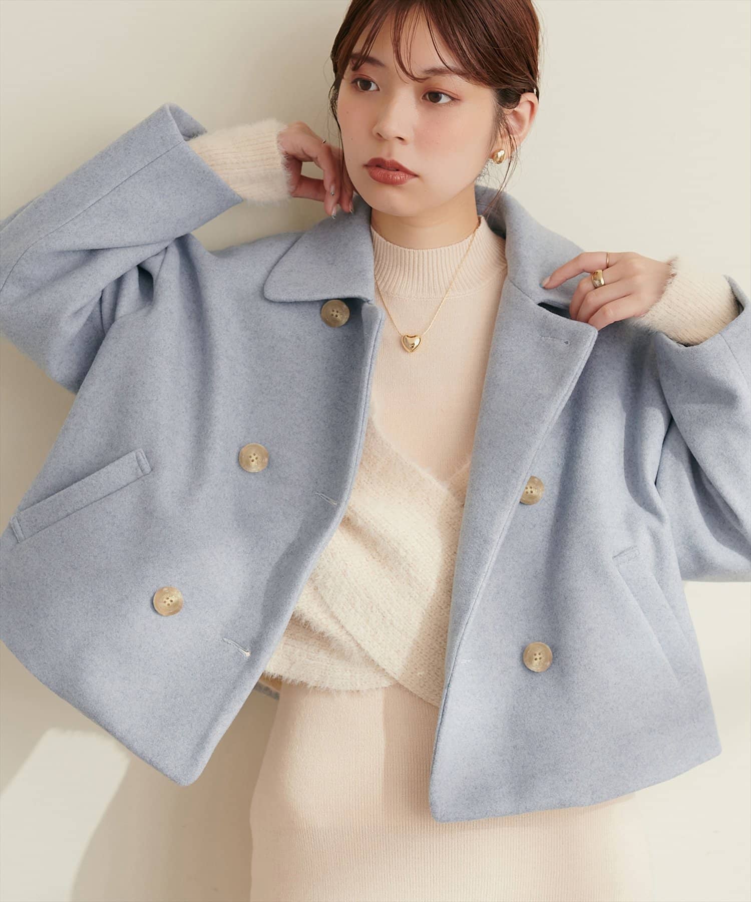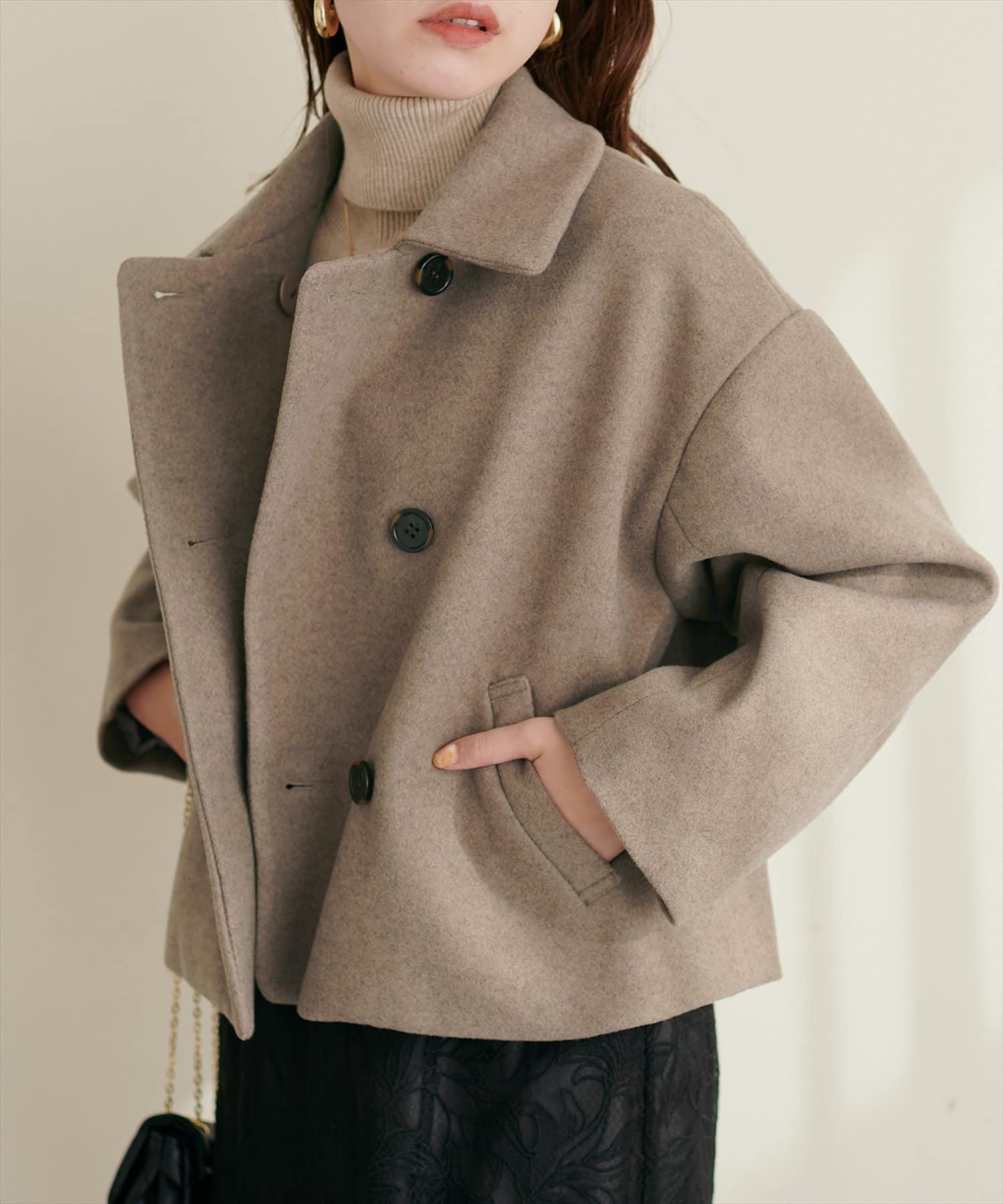 柔らかな印象に仕上がり着回しやすいダブルブレストのショートコート