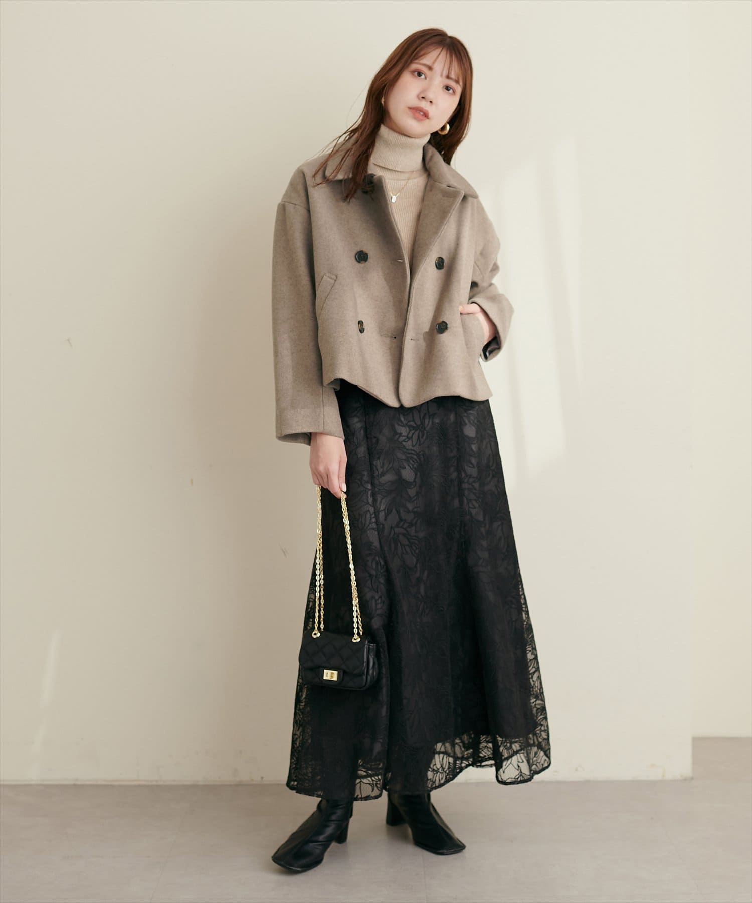 コーデの中で他のアイテムとも調和の取りやすい襟付きのショート丈コート。