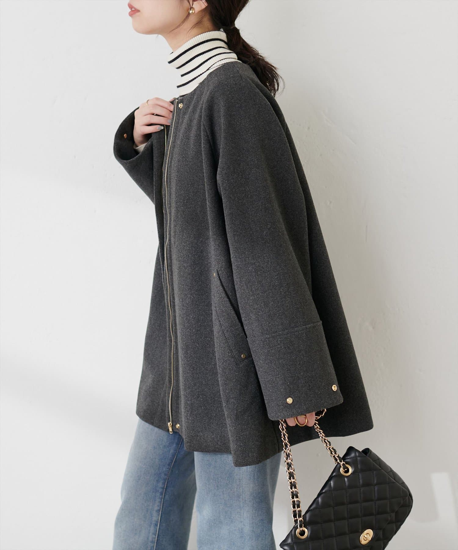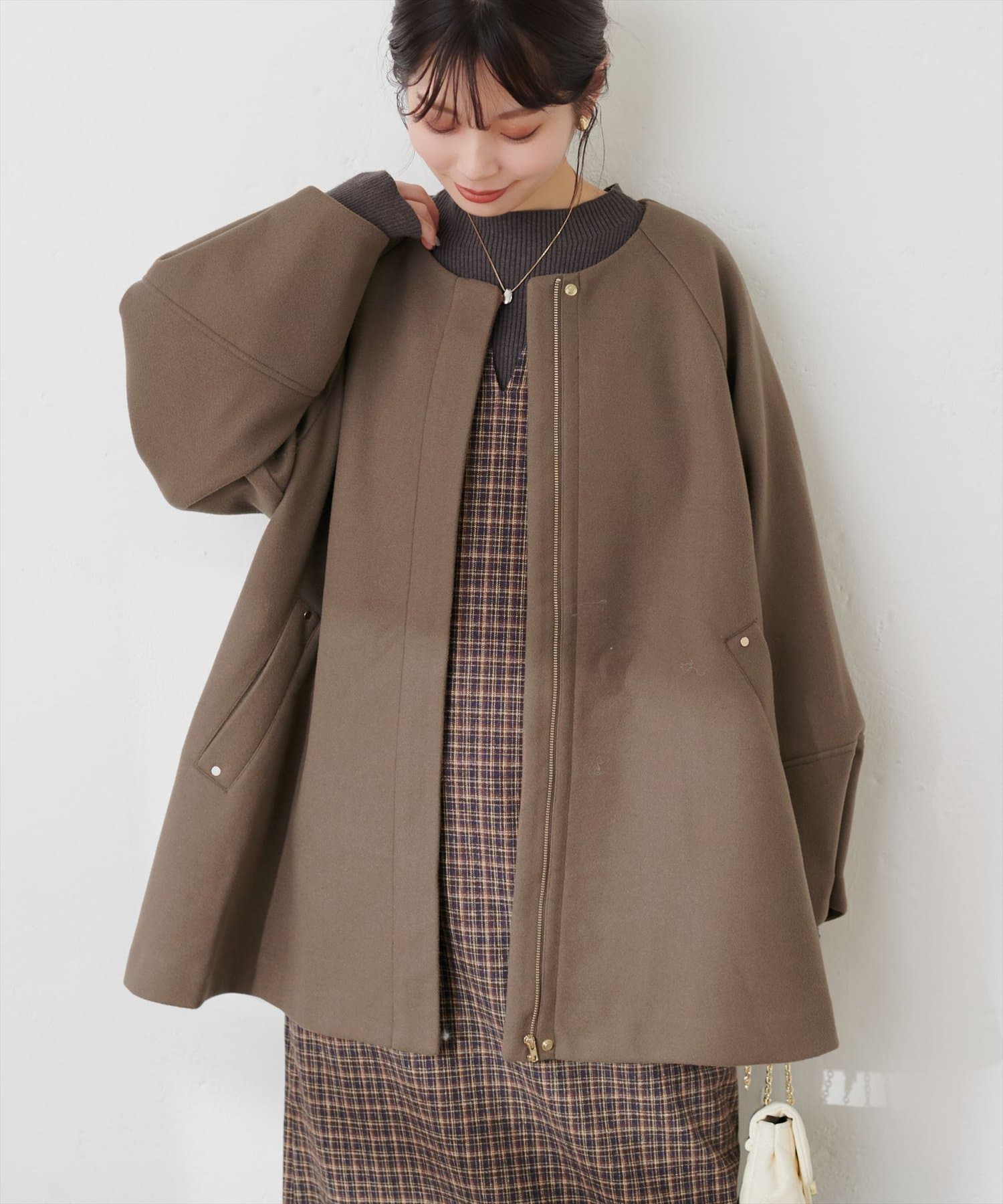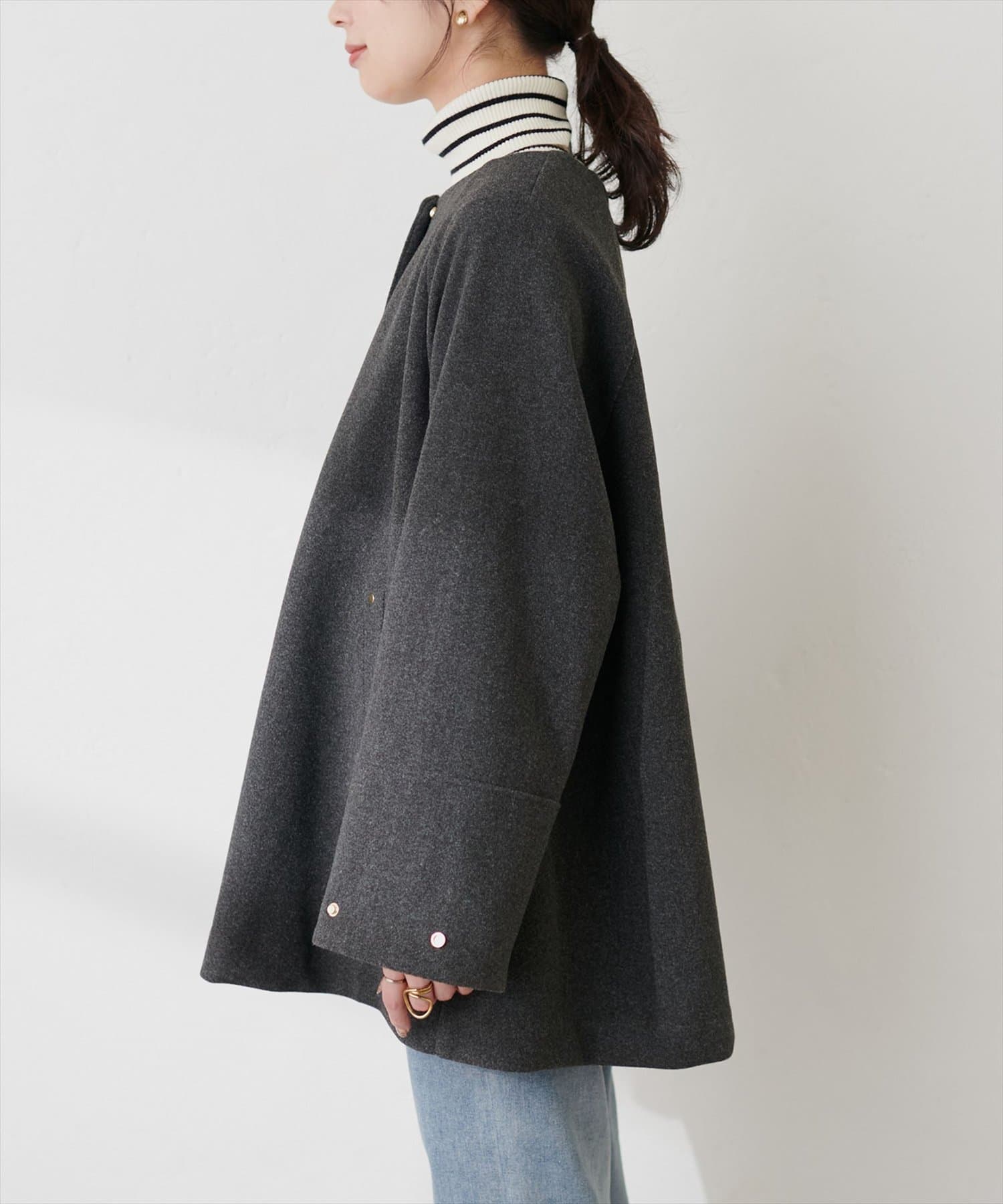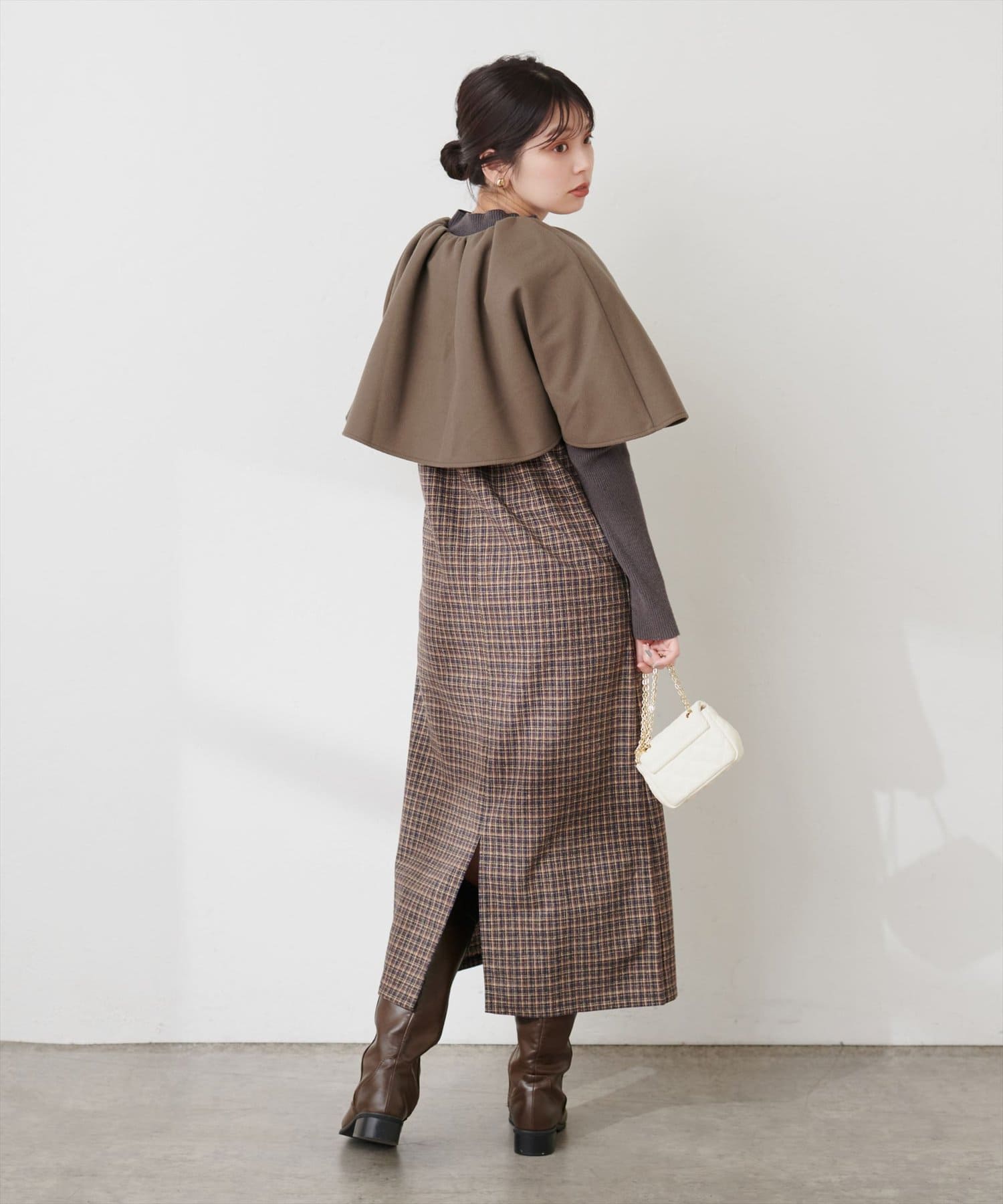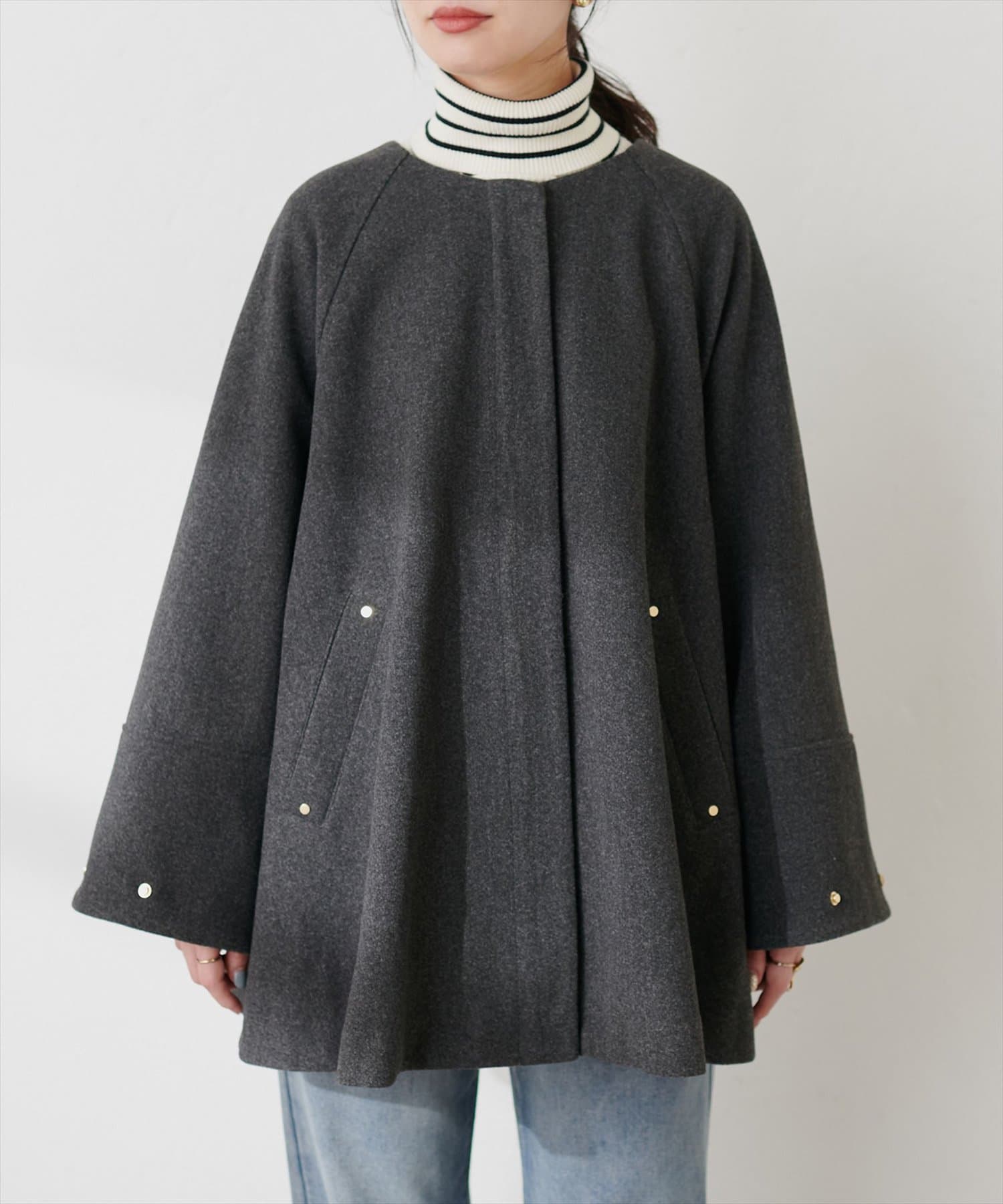 ケープのデザインがかわいく着て頂けて、身体の線も隠せるアウターです。