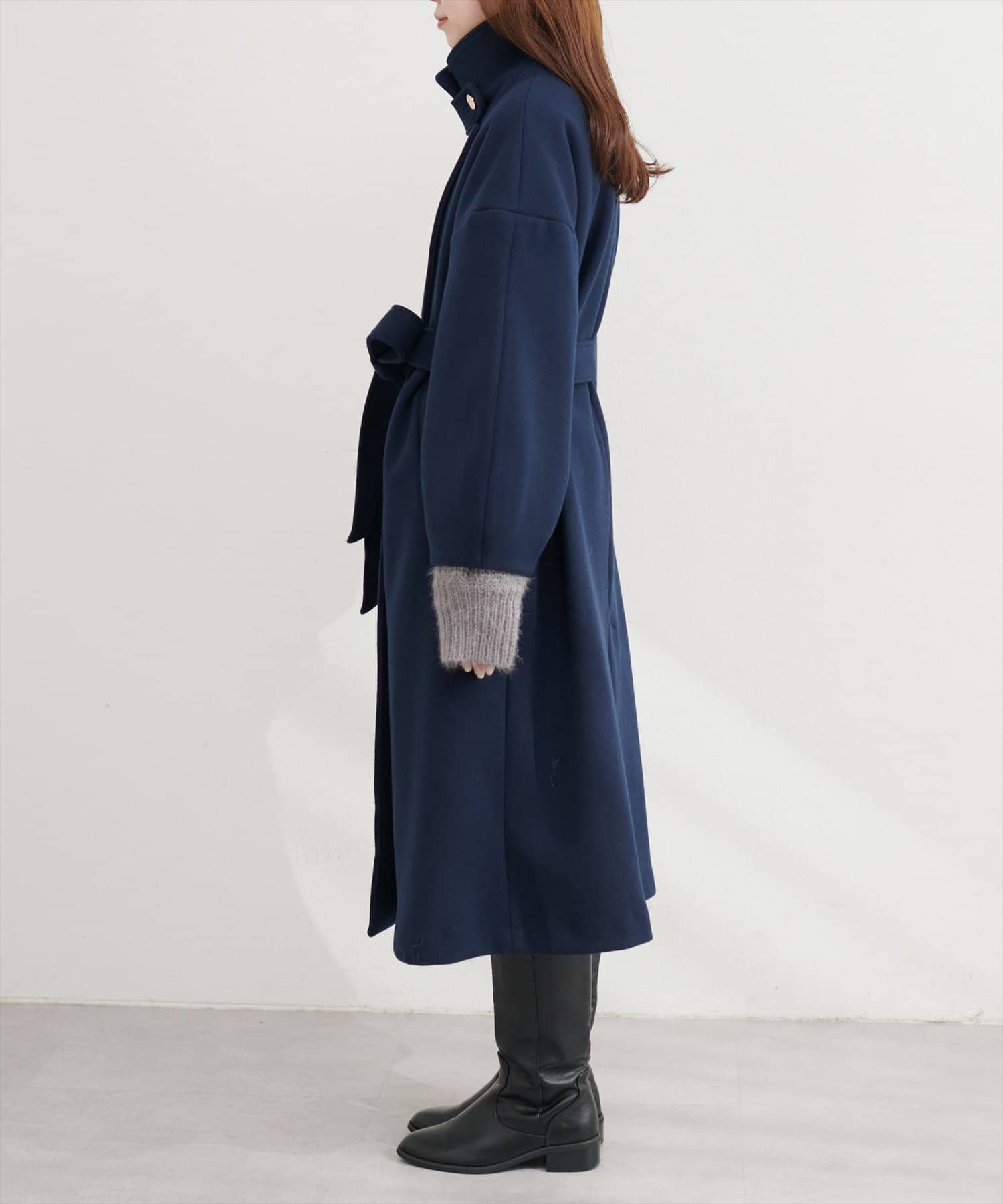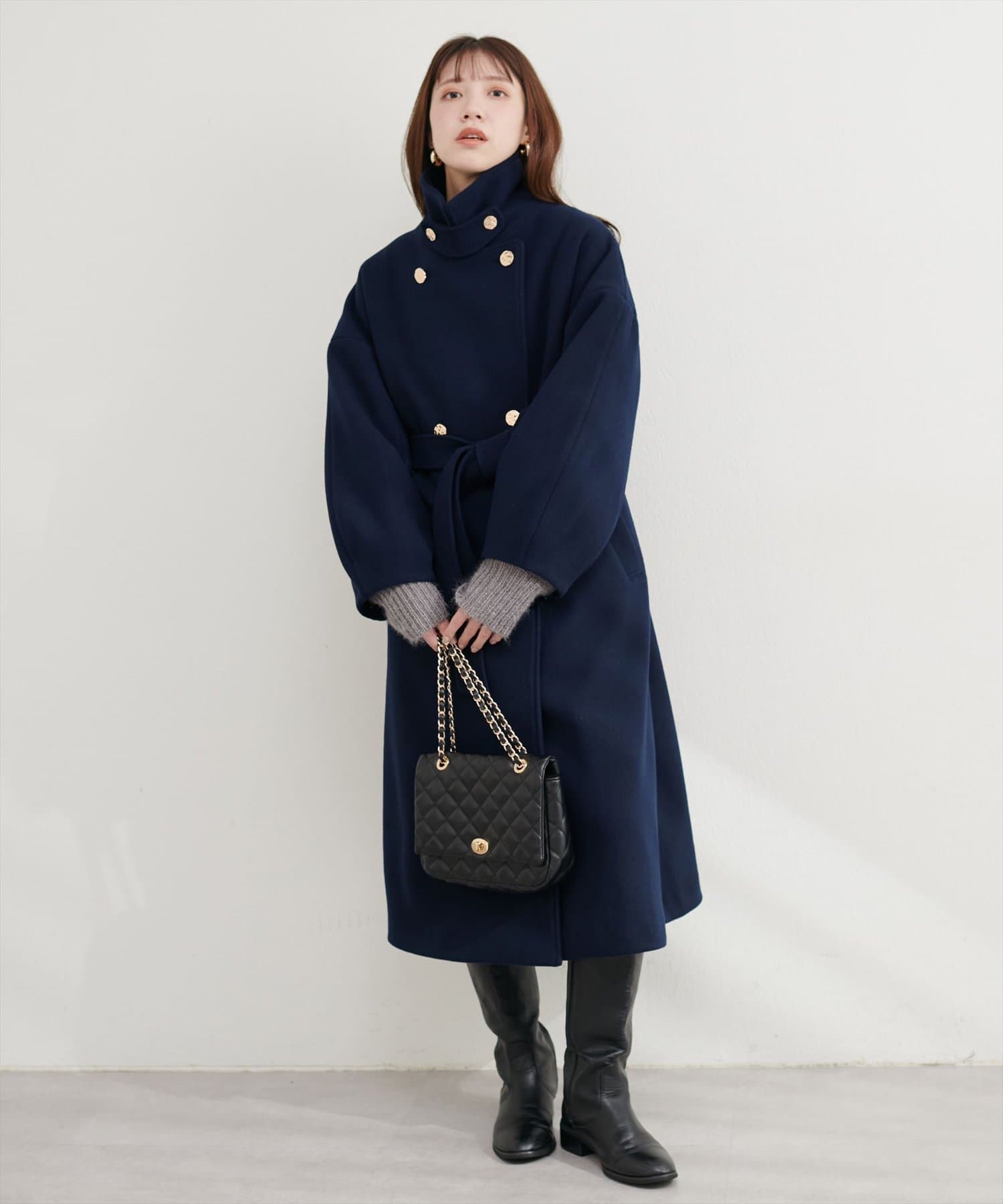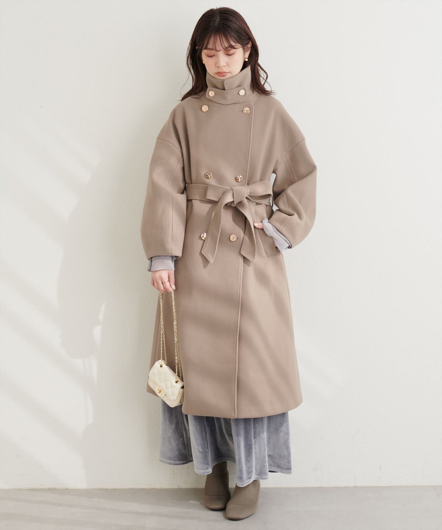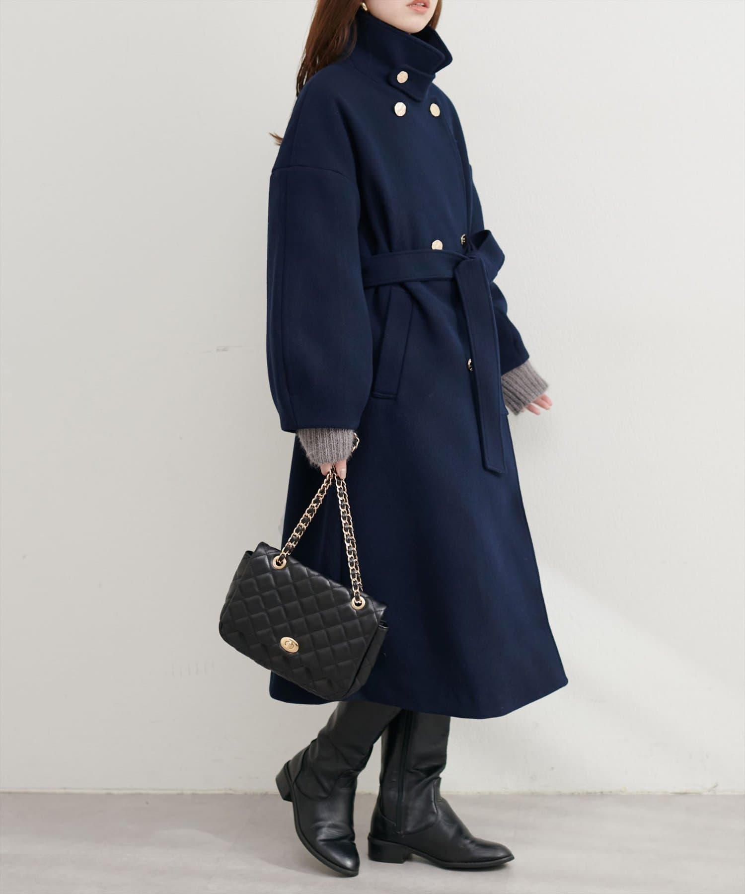 襟にフラップ付きでトレンド感のあるスタンドカラーのロングコート。
