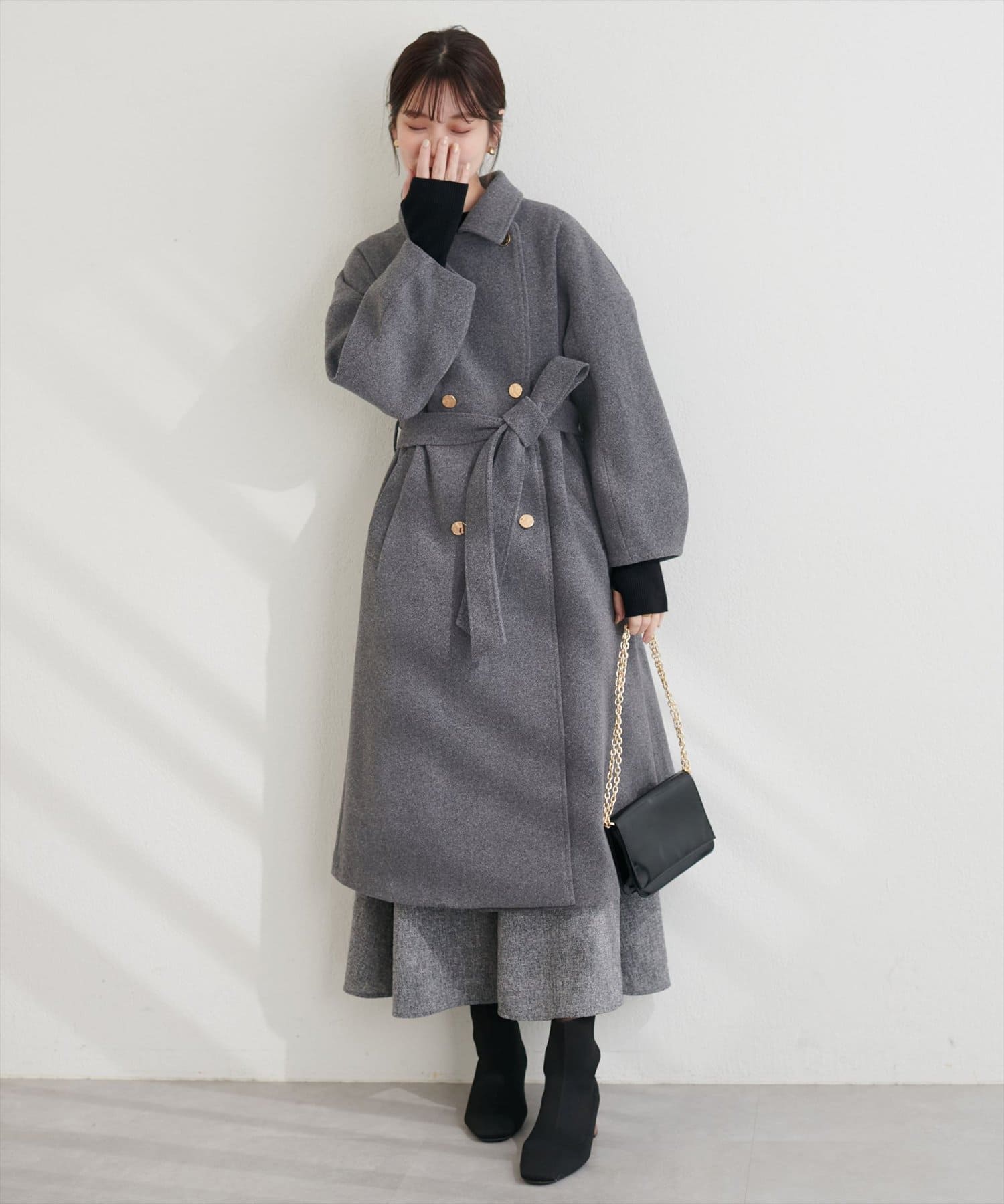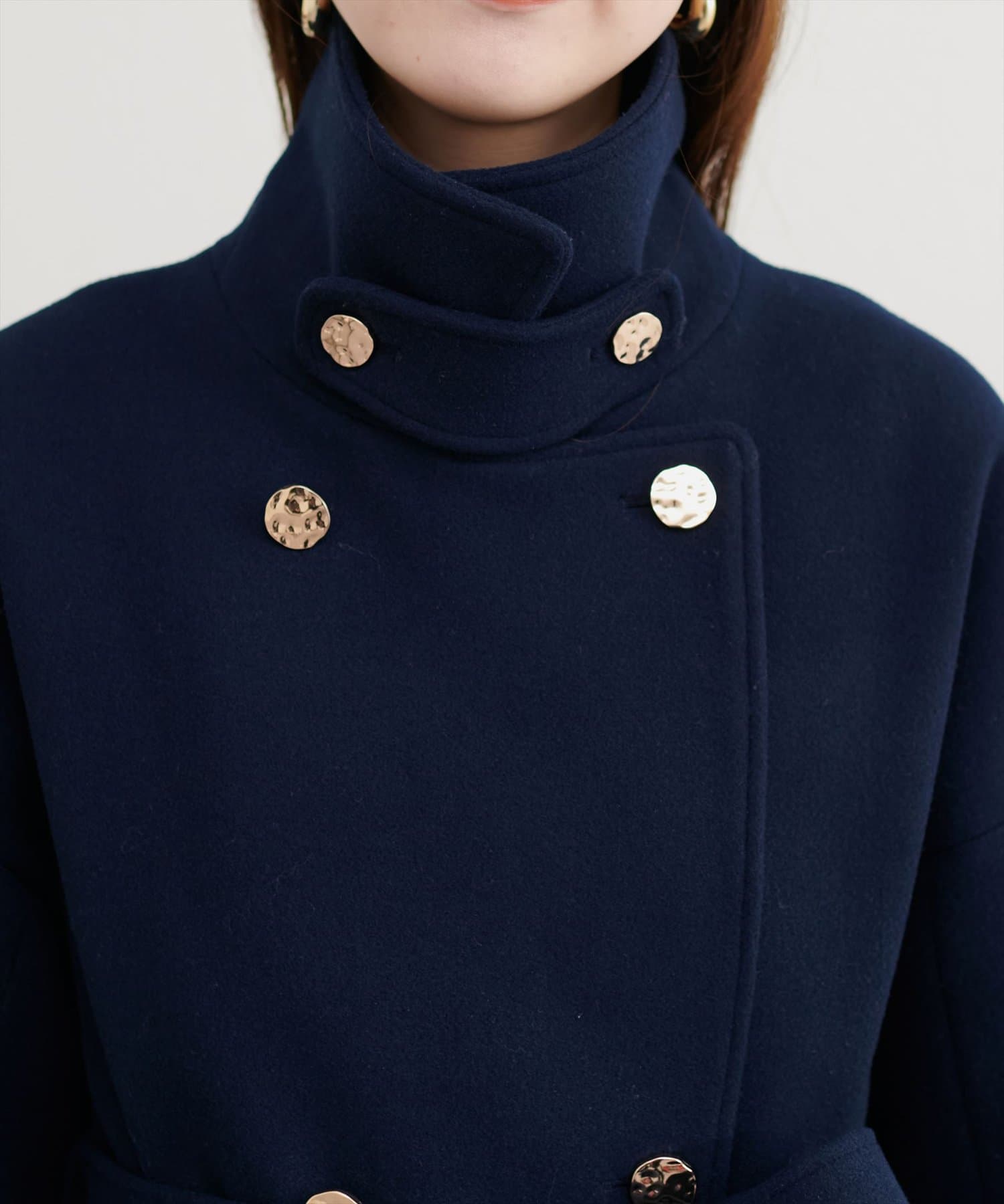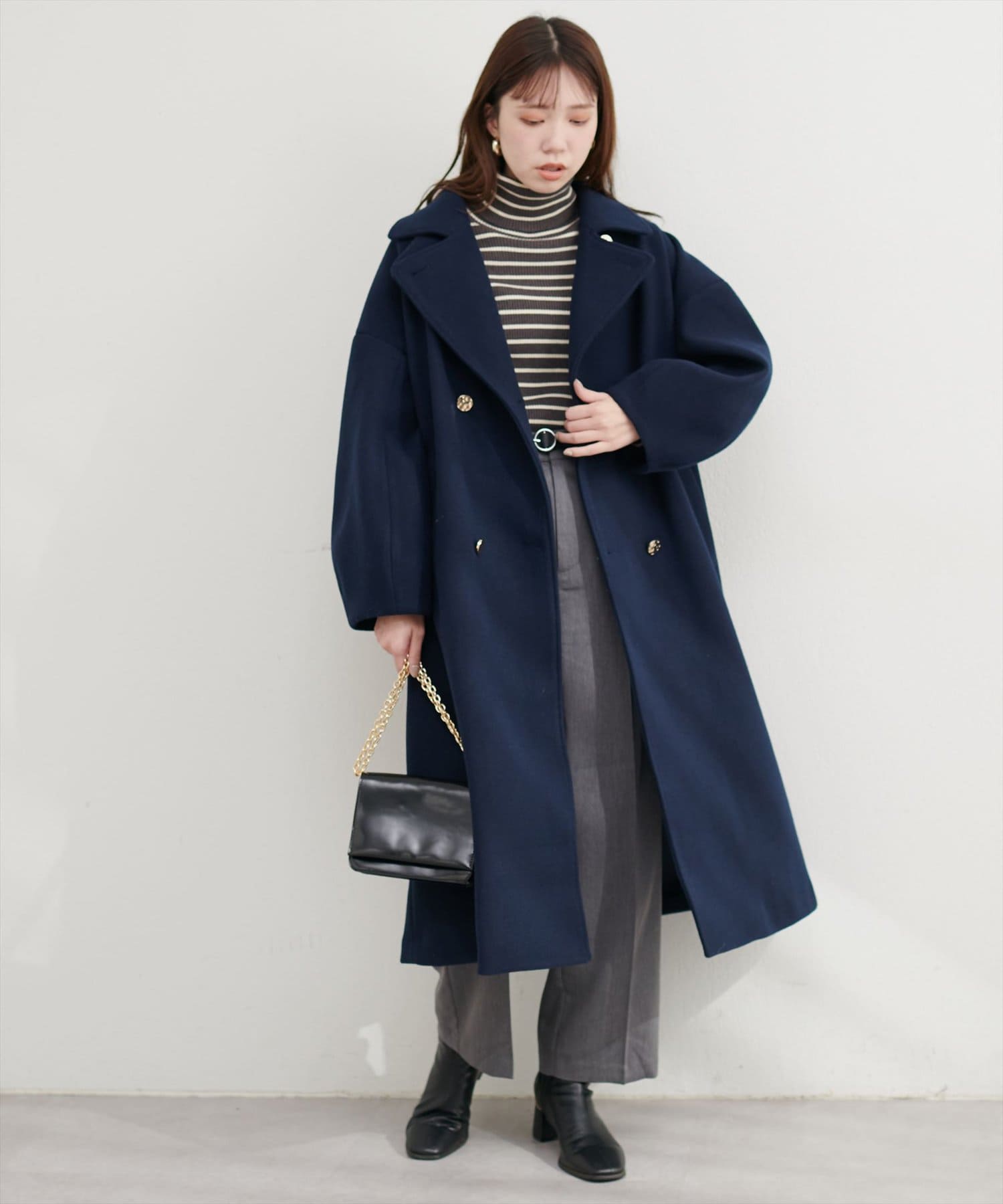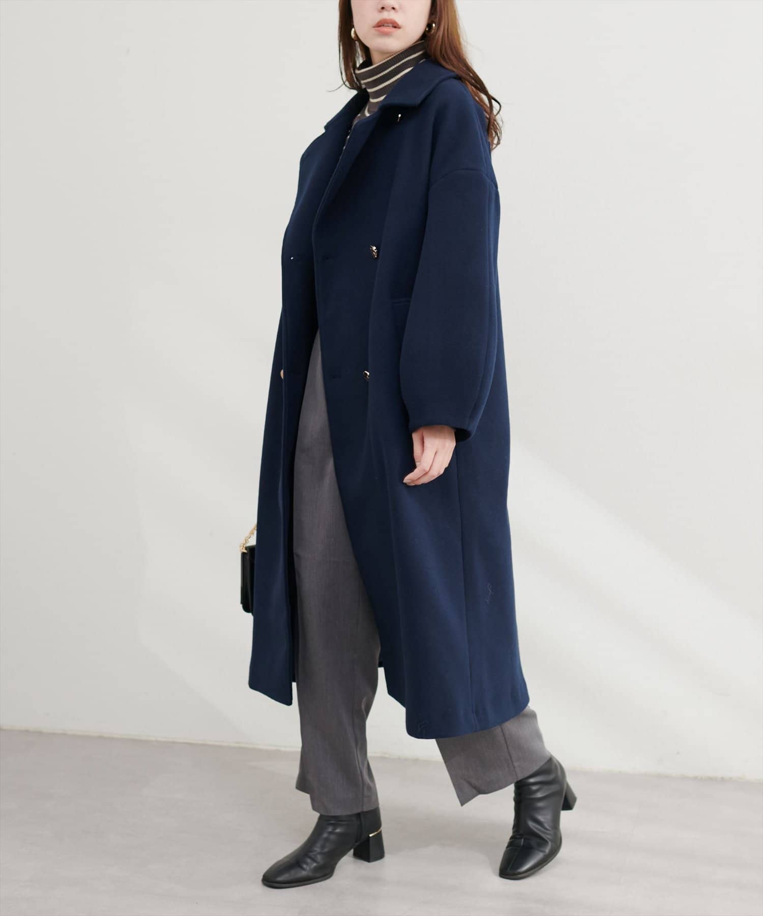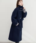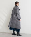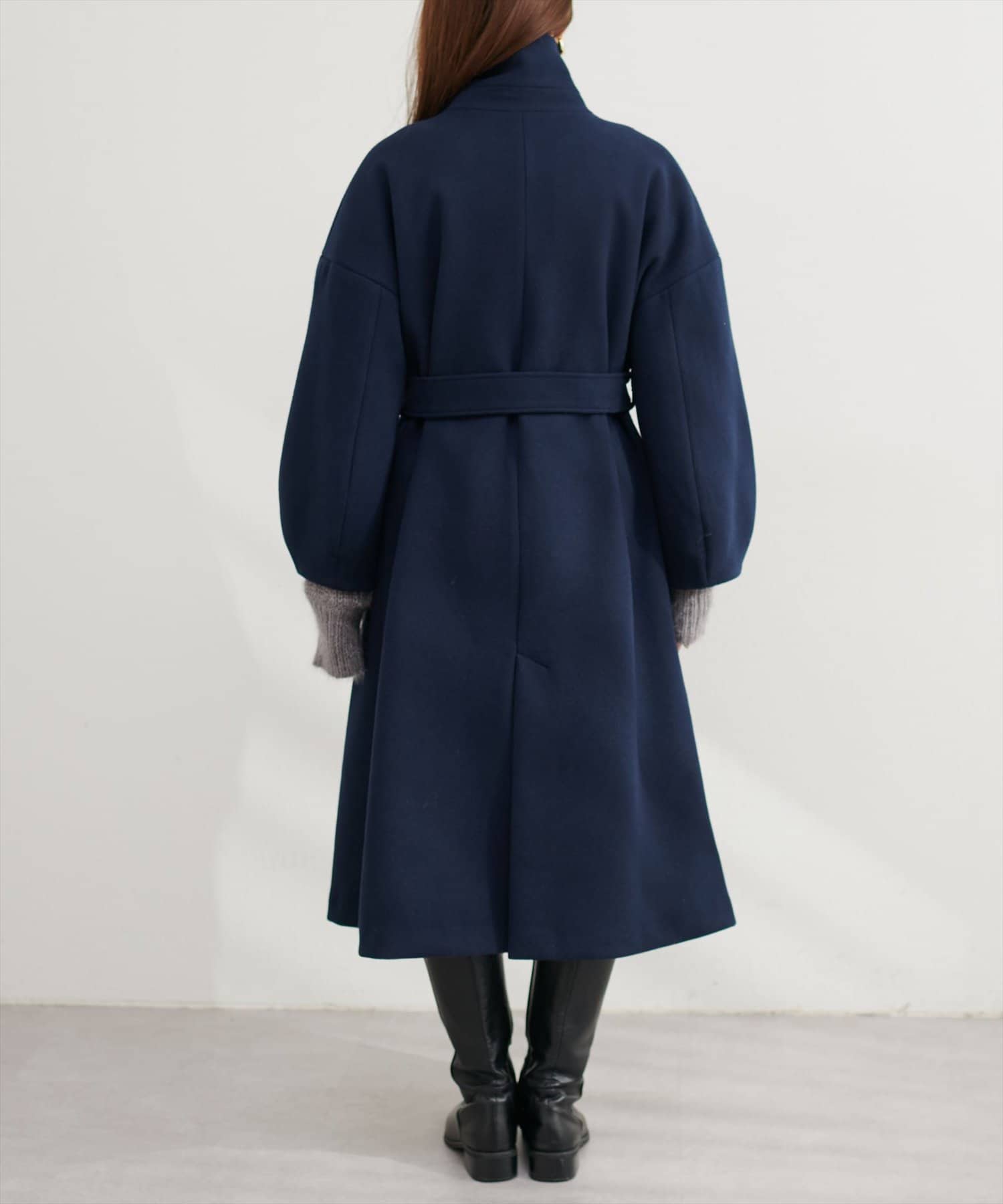 襟にフラップ付きでトレンド感のあるスタンドカラーのロングコート。