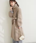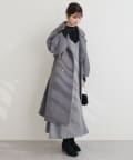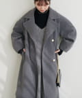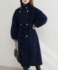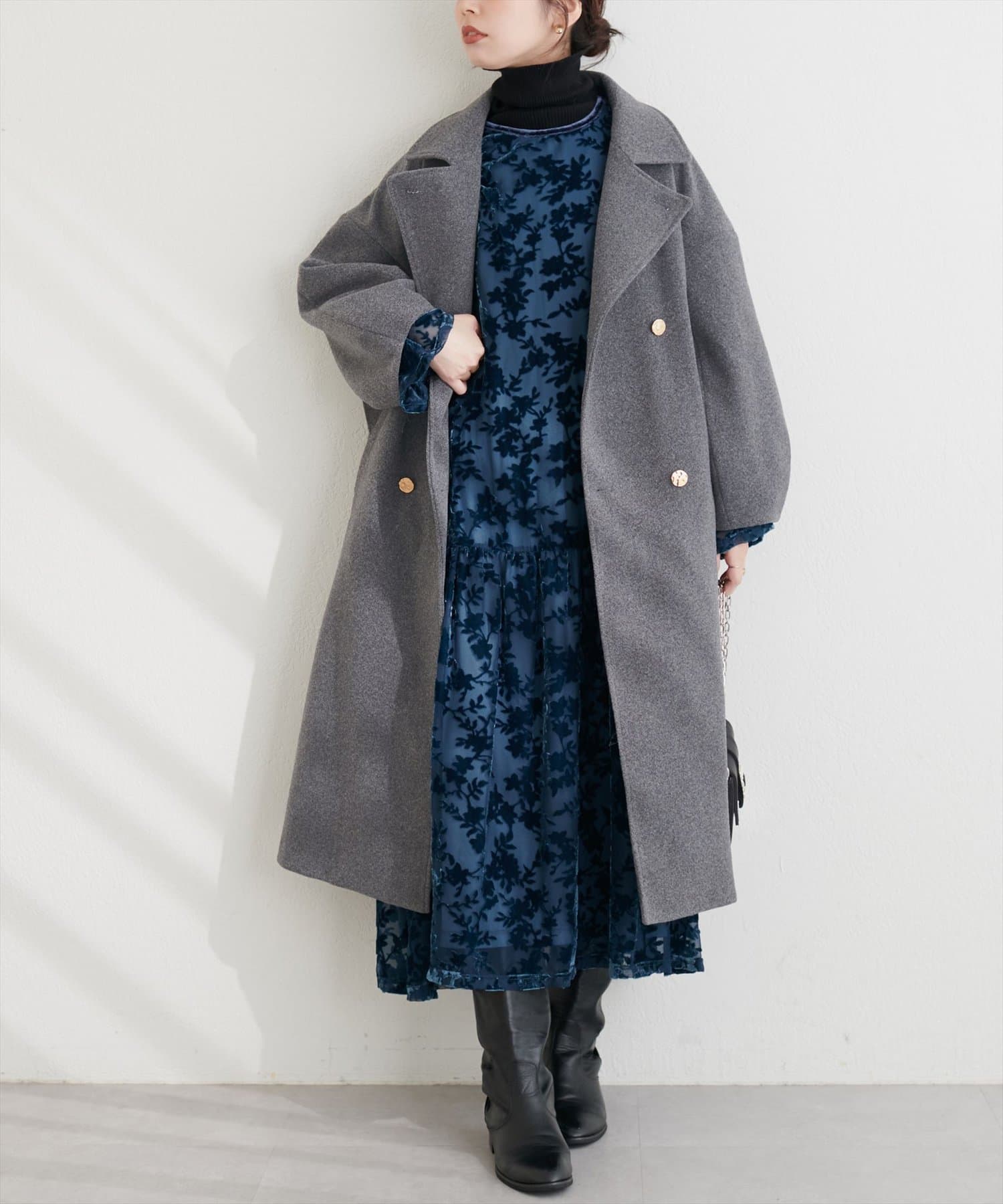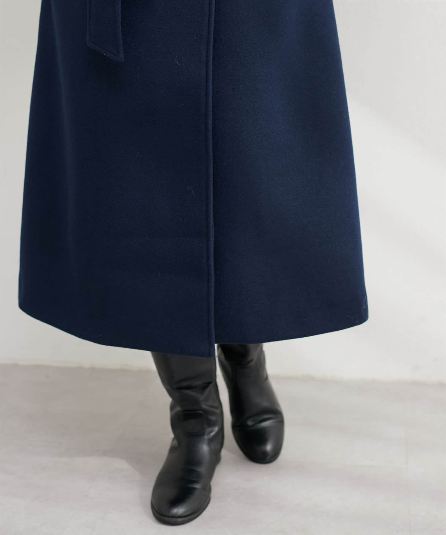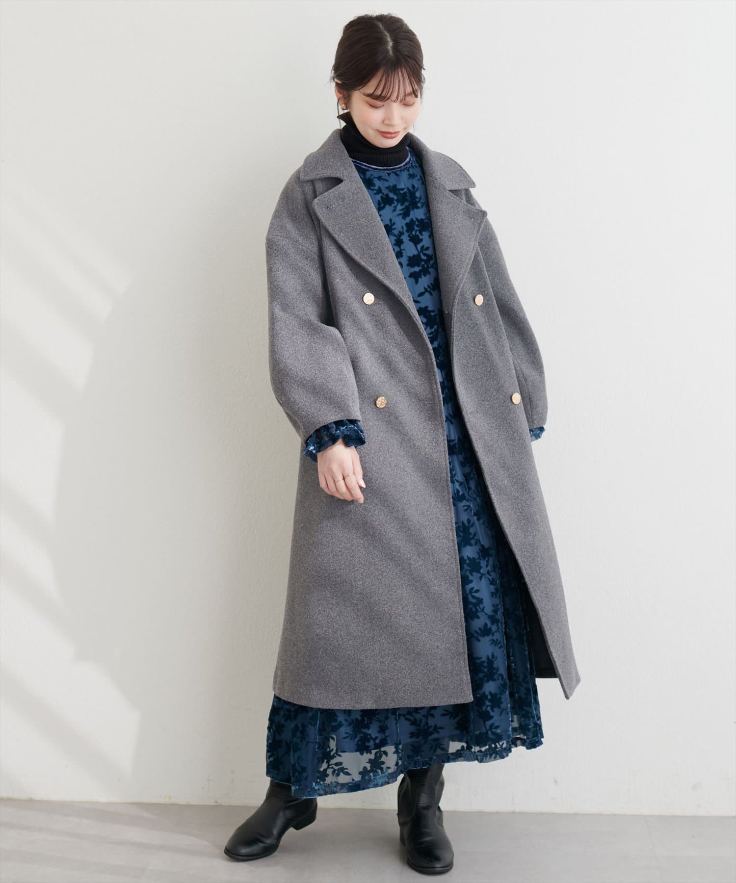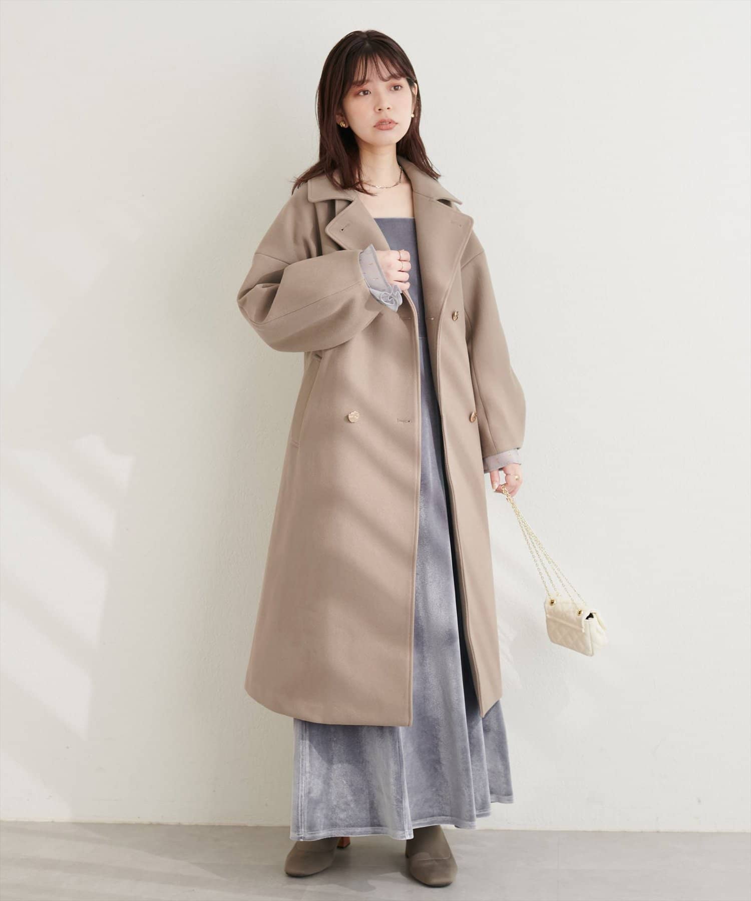 襟にフラップ付きでトレンド感のあるスタンドカラーのロングコート。