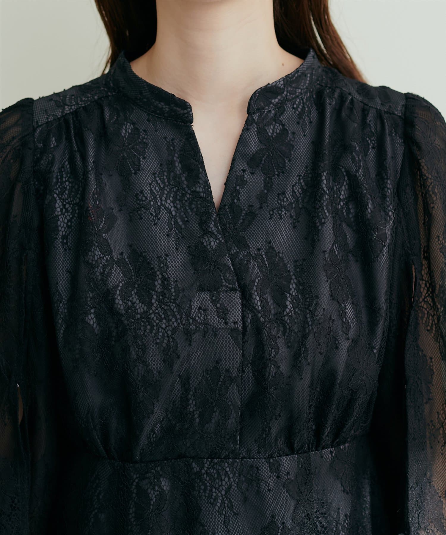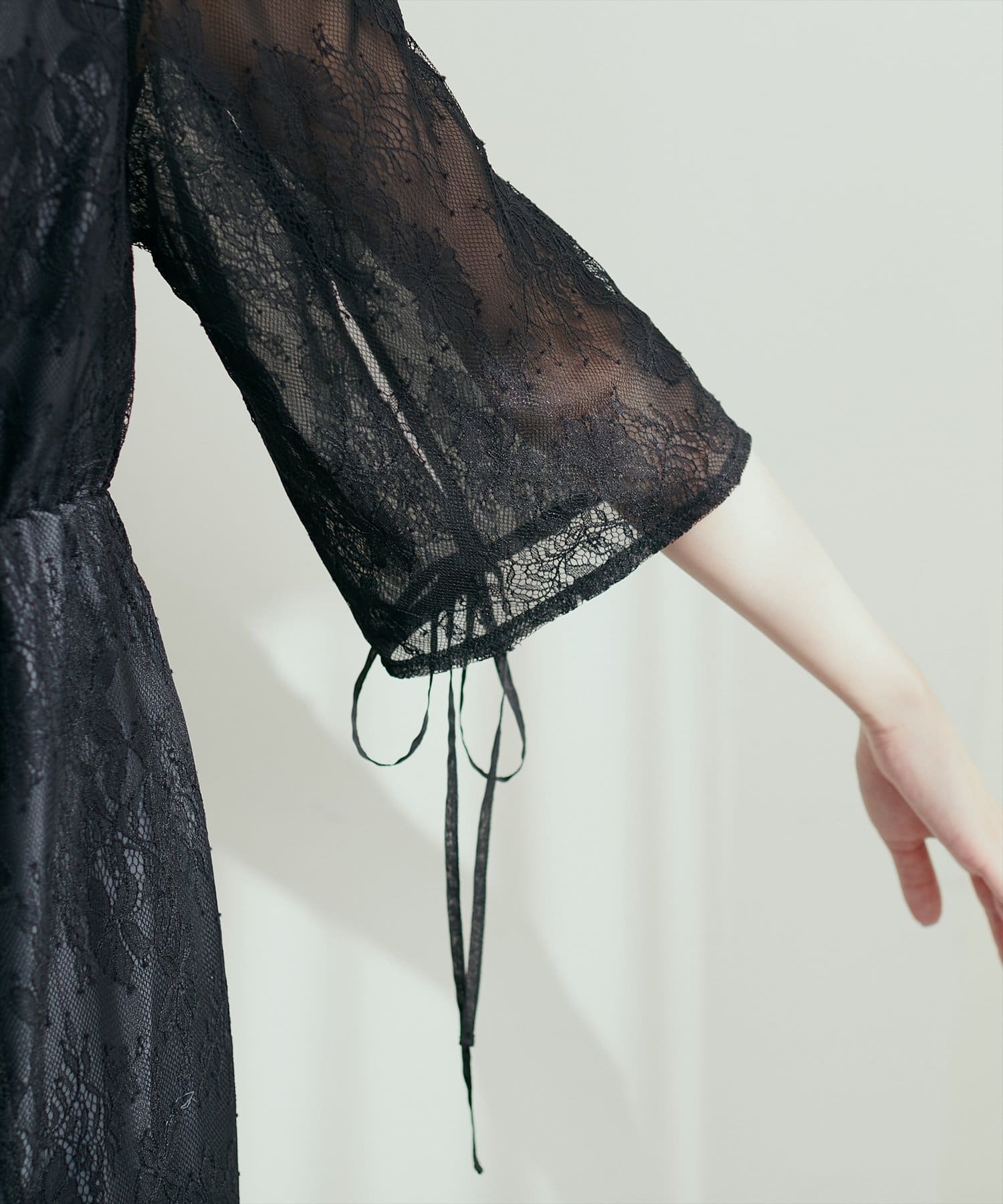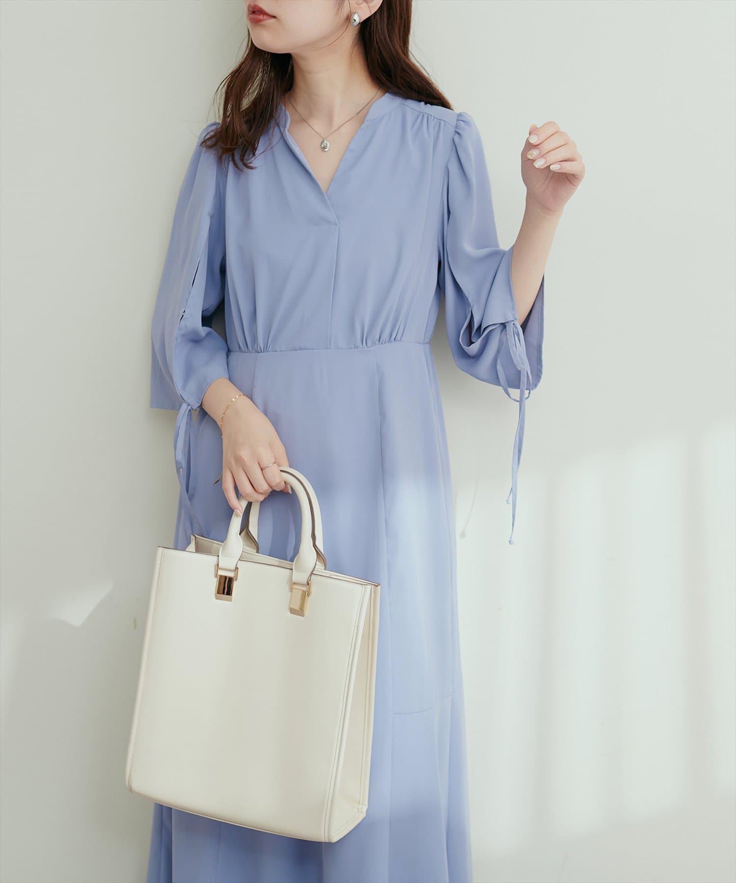 袖はスリットでも全部閉めても、リボン付きでもたのしめるデザイン。大人っぽくスリットで見せるのも、