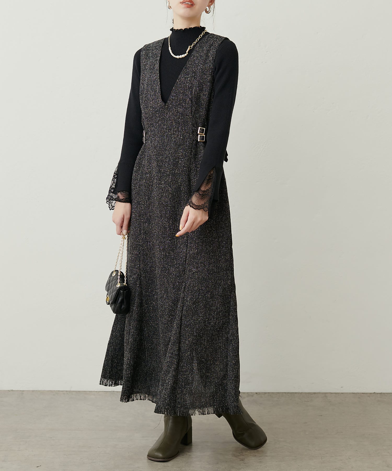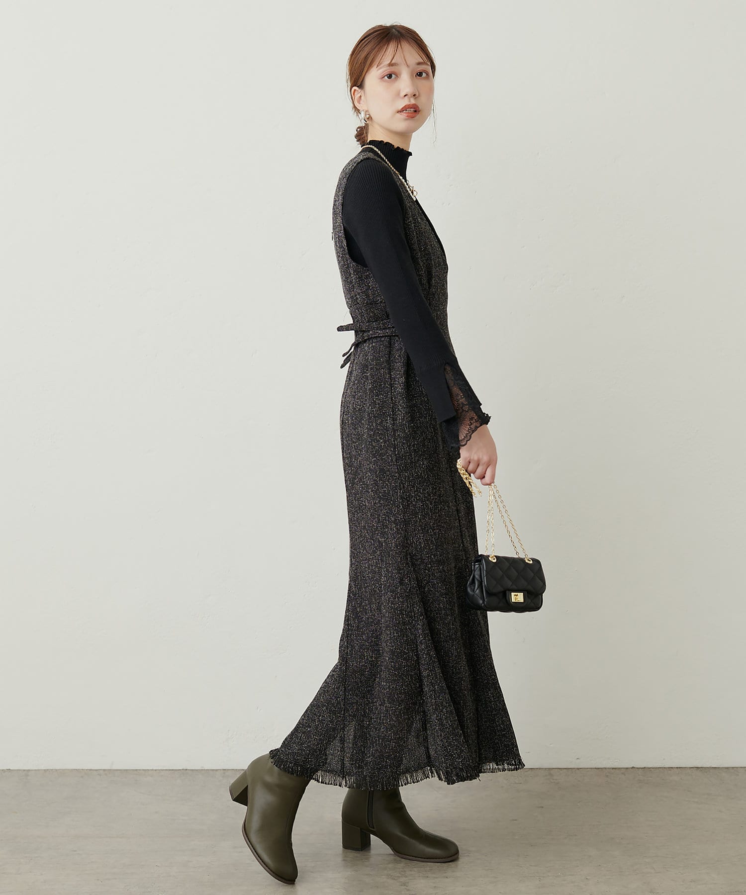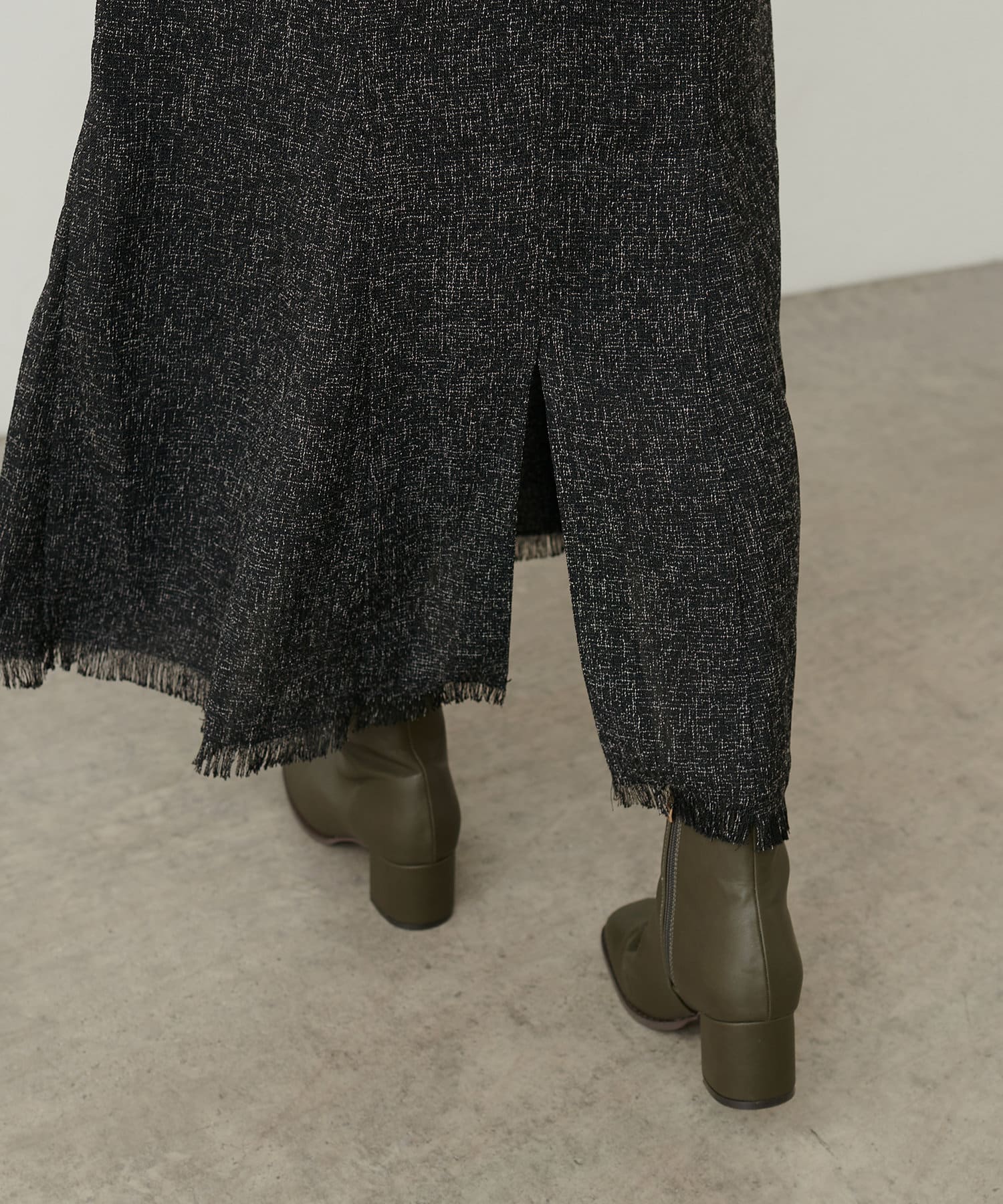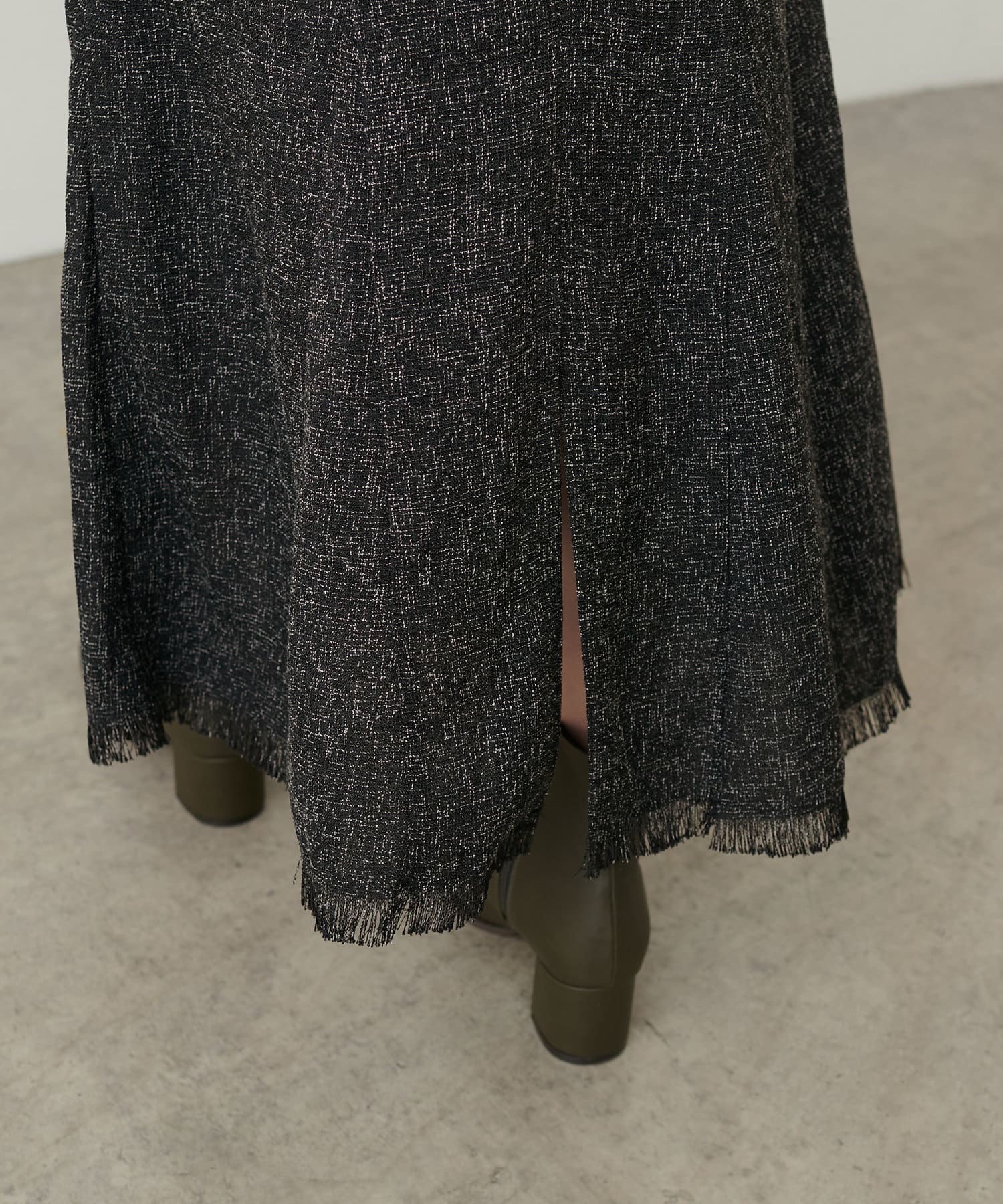 スカート部分は途中から動きの出るフレアになっていて、フリンジの付いた裾が動くたびに綺麗なドレープが生まれます。