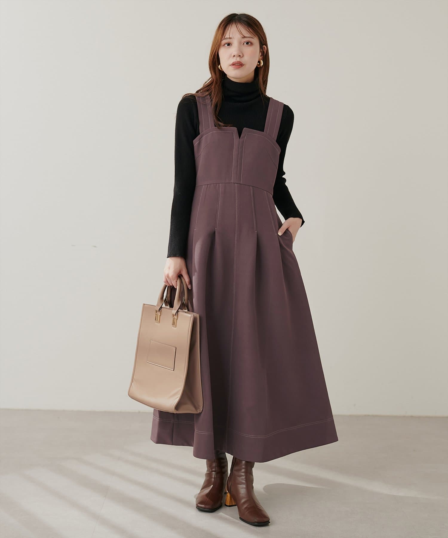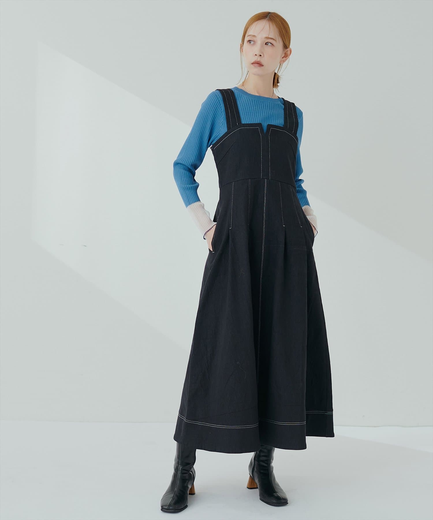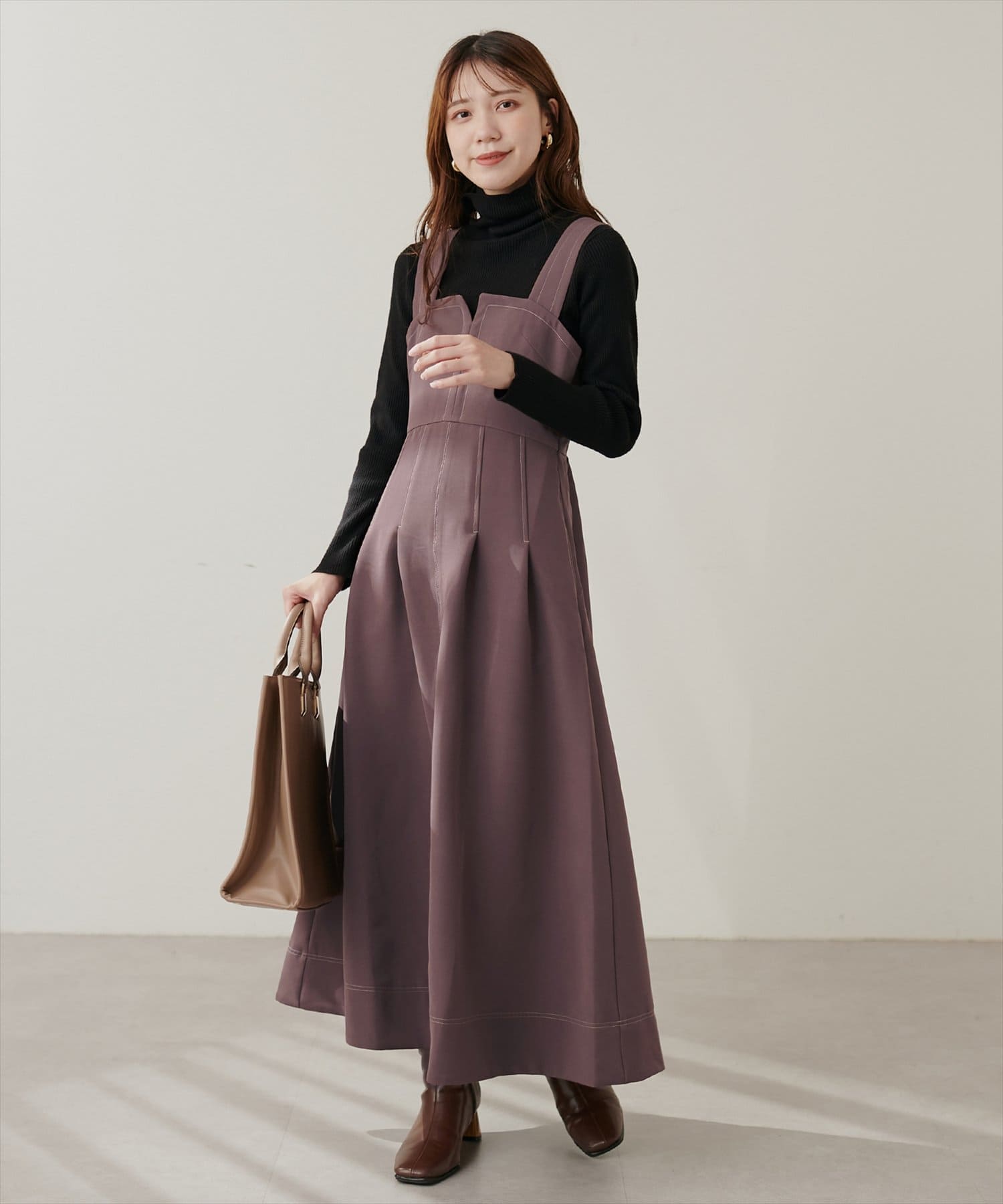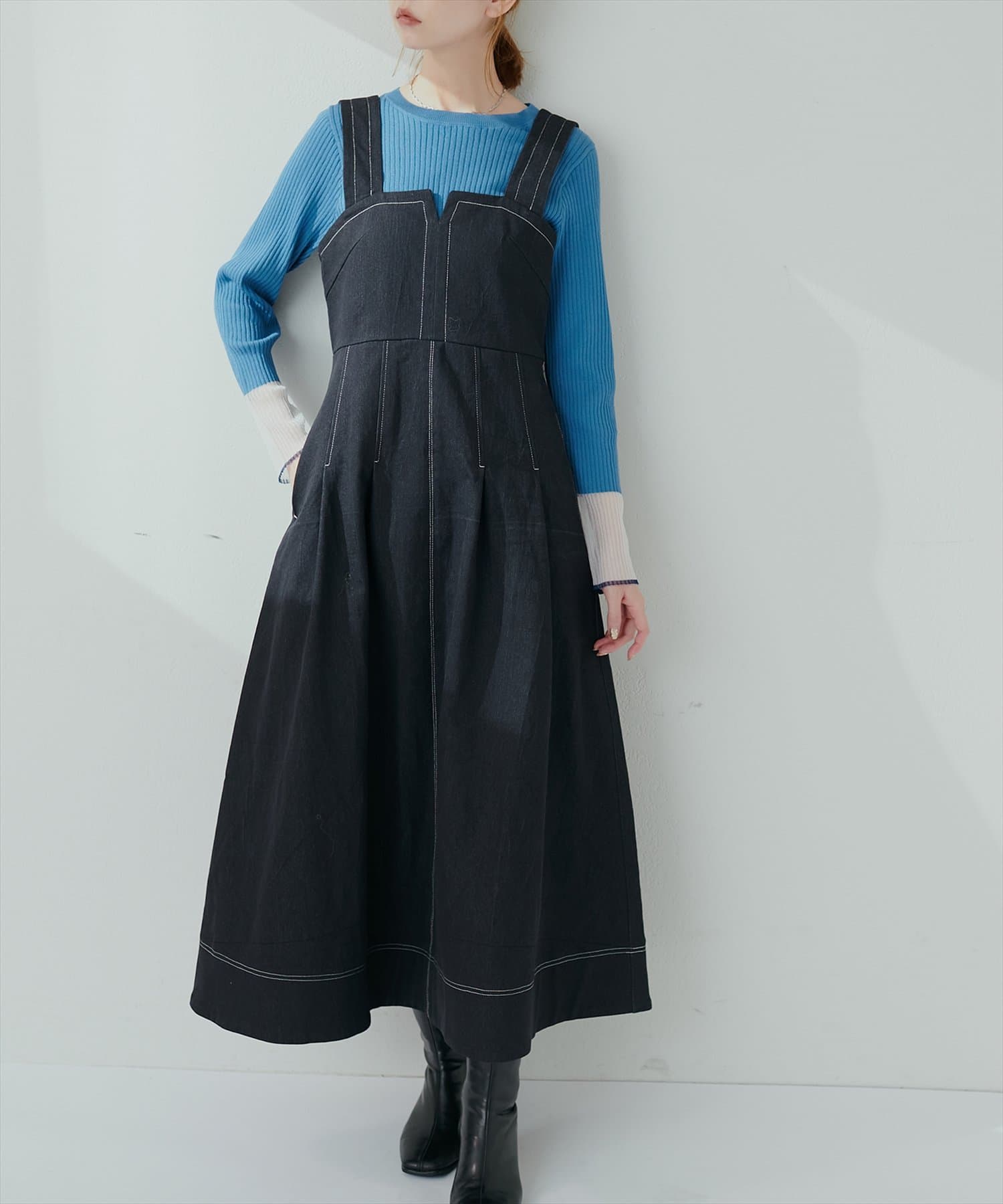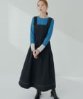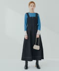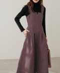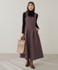 1枚でデザイン性があり主役級のジャンパースカートなので、インナーはシンプルなトップスを合わせるだけでコーデがきまります。